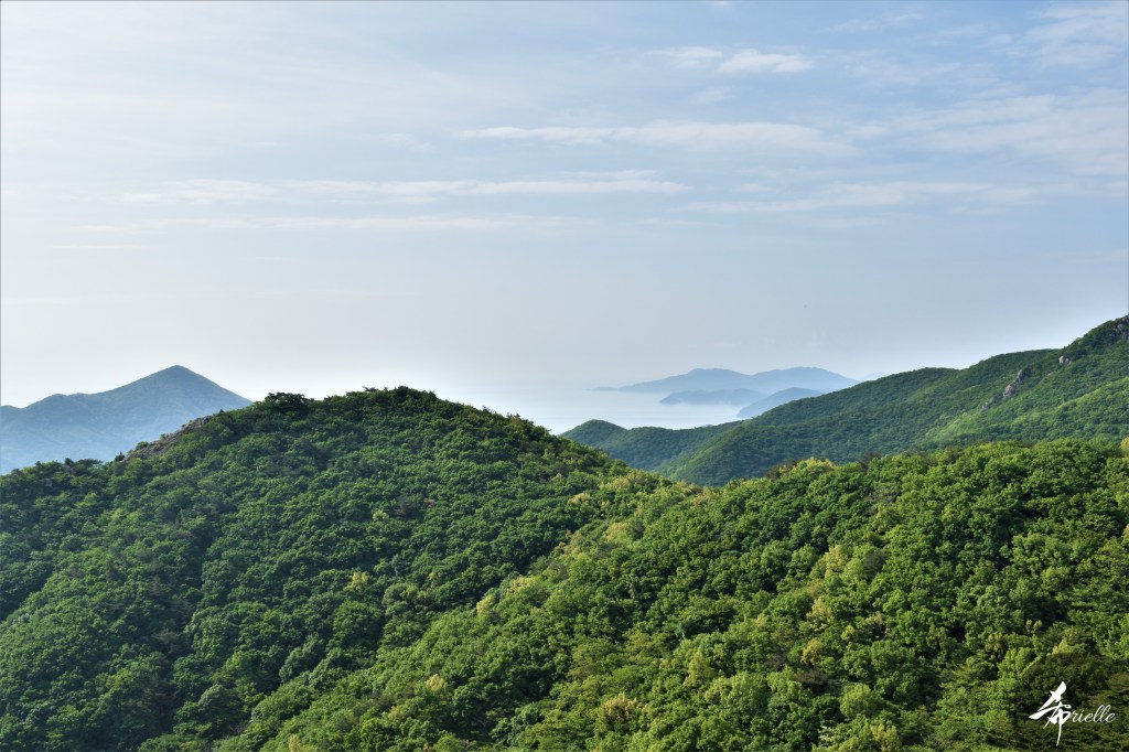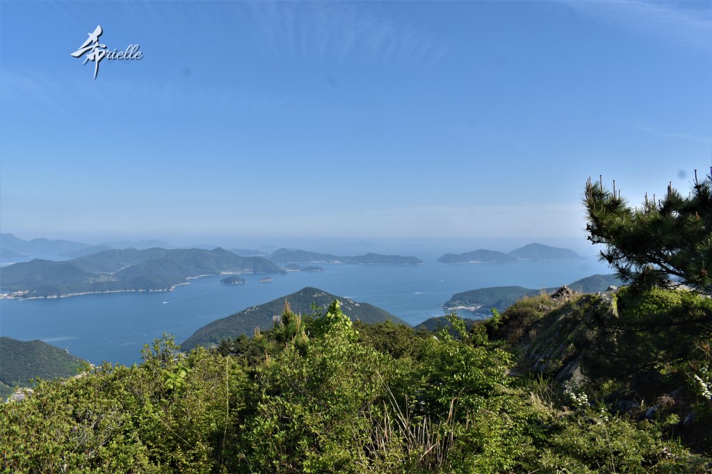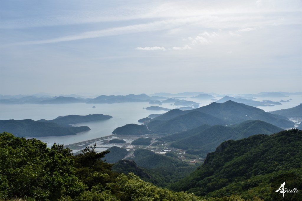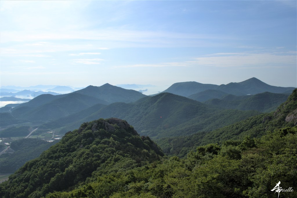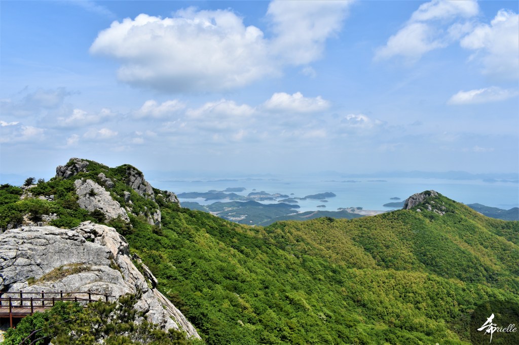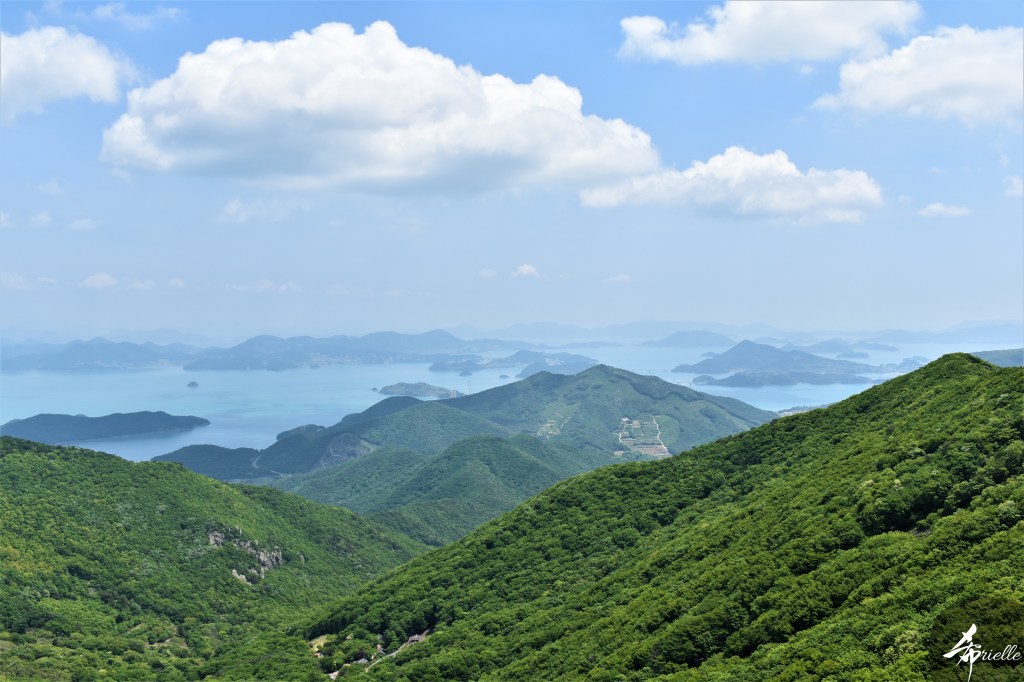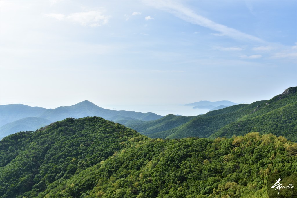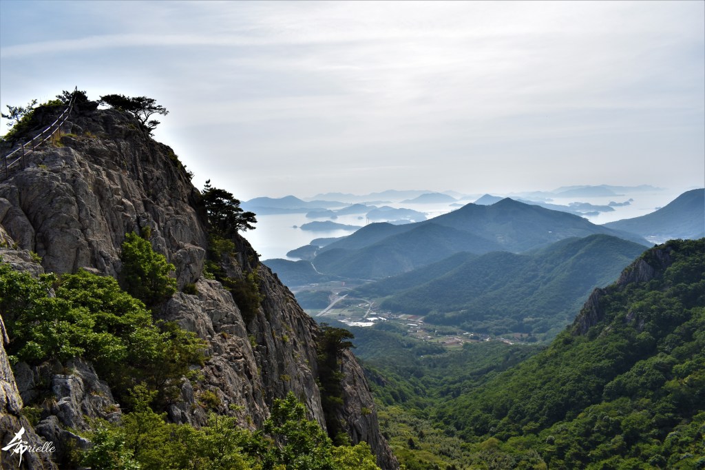Etant donné que je passe la plupart de mon temps libre soit à la montagne, soit au bord de l’océan, on me demande souvent lequel des deux je préfère. Et bien, honnêtement c’est très difficile à dire mais je crois que là où je me sens le mieux, c’est au sommet d’une montagne offrant une vue sur l’océan. Que ce soit après une randonnée à pieds ou en vélo, il n’y a rien que j’aime plus que le fait de pouvoir finir la journée dans l’eau. Ainsi, l’une des villes où j’aime le plus marcher en Corée, est Tongyeong. Cette ville portuaire, montagneuse est constituée de plusieurs îles accessibles par bateau. Ces trois dernières années, j’ai eu l’occasion de faire le tour de la plupart de ces îles : Bijin, Saryang, Maemul, Seomaemul, Yokji, Suu … Les articles viendront si j’arrive à me tenir à la résolution de publier « plus souvent ». Oui, j’avoue ce n’est pas très précis ni très exigeant comme résolution ! Bref, cette année, j’avais donc envie de rejoindre le sommet de la montagne à Tongyeong qui n’est pas sur une île et ne nécessite donc pas de promenade en bateau. Ainsi, fin avril, j’ai pris le bus jusque là-bas puis un taxi pour rejoindre l’un des temples situés au pied du Mont Mireuk et d’où commence un sentier de randonnée. Encore une fois, il faisait tellement beau que la vue était superbe, en tons de bleu sur bleu. J’étais partie seule donc j’ai pris le temps de prendre toutes les photos que je voulais et profiter de la vue au sommet. Ce jour-là je n’ai pas croisé beaucoup d’autres marcheurs et je crois même que c’est le sentier le plus propre sur lequel j’ai jamais marché. Au sommet, comme le veut la tradition, le peu de personnes présentes, faisaient des photos avec la pierre indiquant le nom et l’altitude du pic. J’avais prévu mon trépied pour en prendre une aussi mais un promeneur venu avec un groupe, qui venait de faire plus d’une quinzaine de photos de ses amis, m’a dit qu’il était photographe et a insisté pour prendre la mienne. Je l’ai donc laissé faire et le résultat était plutôt convaincant. C’est agréable de discuter avec les gens en montagne parce qu’en général, ils sont souriants et sympathiques. Il faut dire qu’il est difficile de ne pas être de bonne humeur, face à la beauté des paysages ! Pour ceux qui le souhaitent, une ligne de cabines téléfériques fait aussi l’aller-retour du port au sommet. Pour ma part, j’ai particulièrement apprécié, une oeuvre d’art installée sur un belvédère offrant une vue vers l’est et sur l’île de Geoje. Il s’agissait d’une sculpture en métal du profil d’une femme regardant au loin. Ce n’est pas la première oeuvre de ce genre que je croise dans la région mais à et endroit, je ne m’y attendais vraiment pas et je l’ai trouvée absolument magnifique !