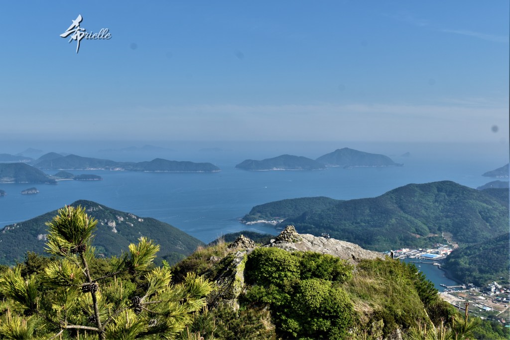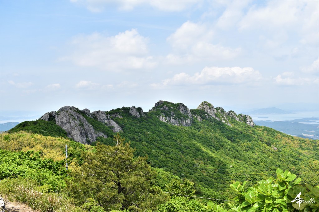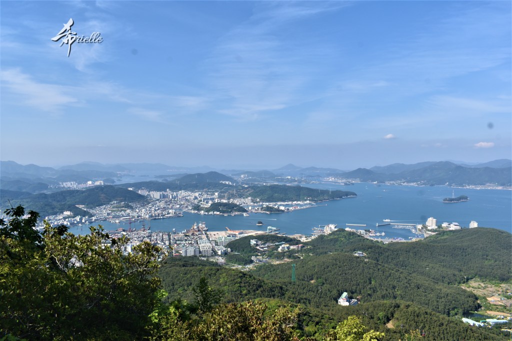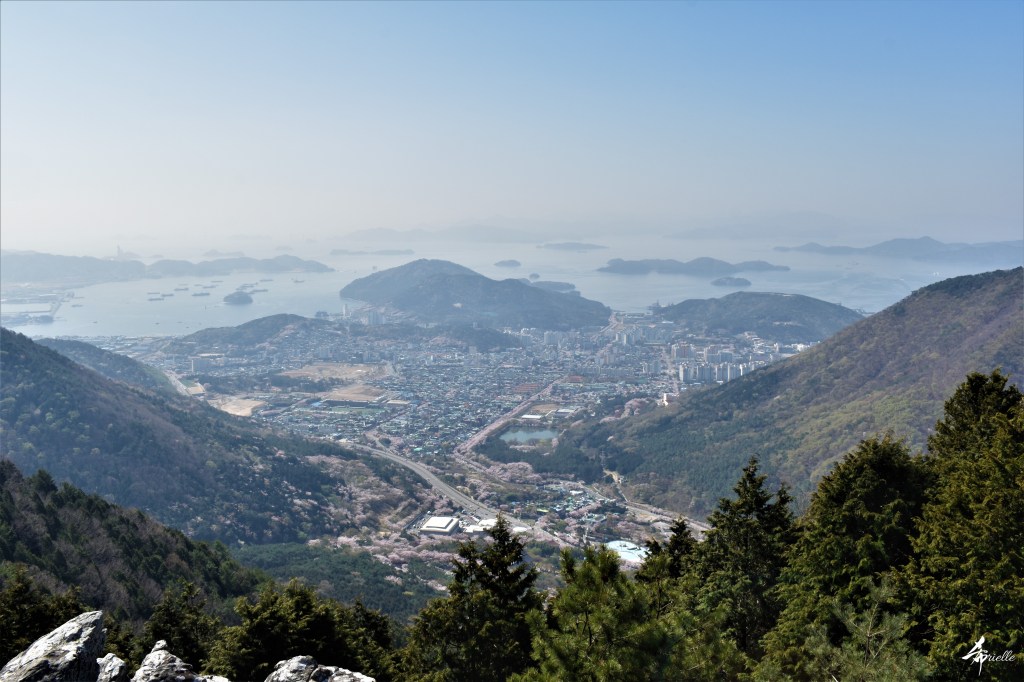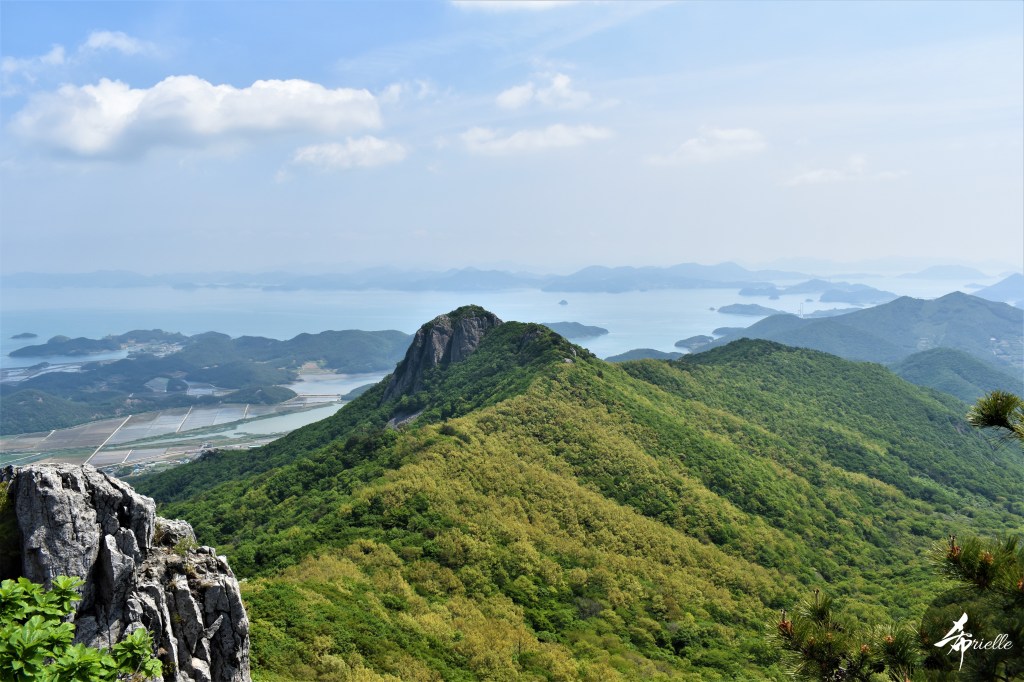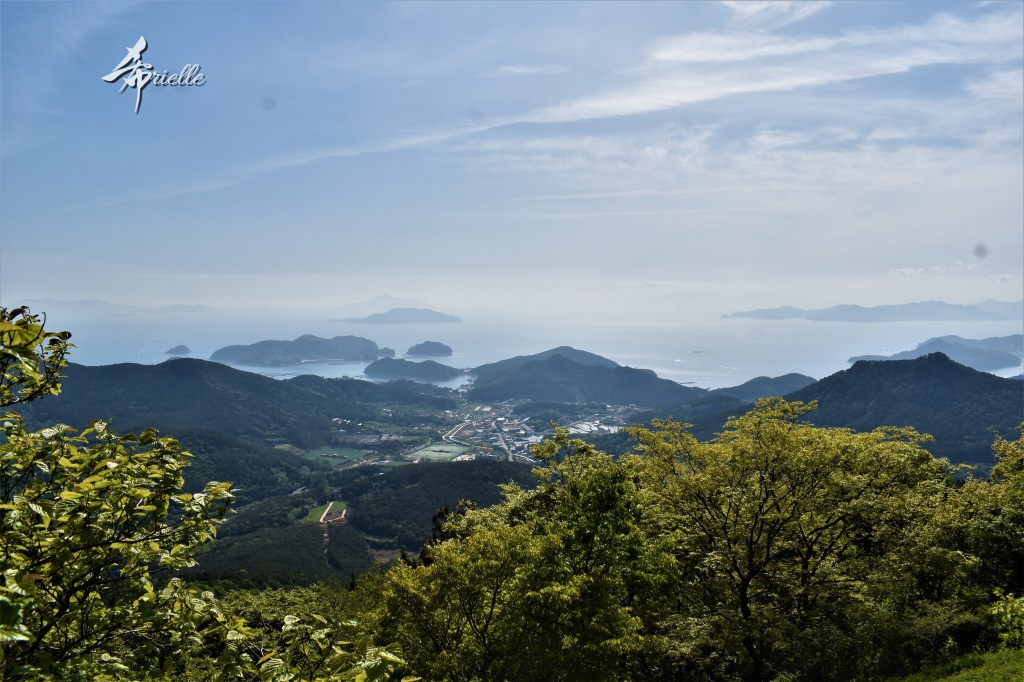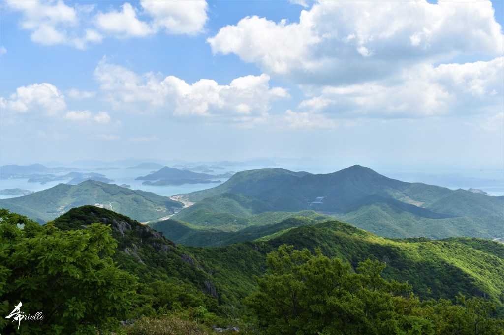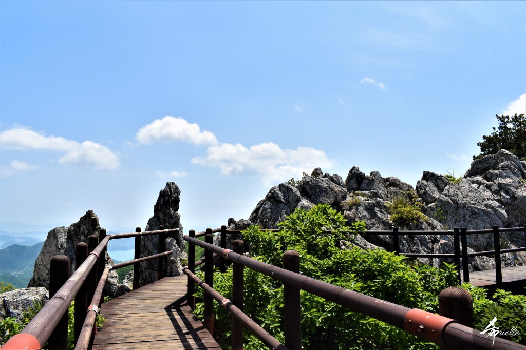 Etant donné que je passe la plupart de mon temps libre soit à la montagne, soit au bord de l’océan, on me demande souvent lequel des deux je préfère. Et bien, honnêtement c’est très difficile à dire mais je crois que là où je me sens le mieux, c’est au sommet d’une montagne offrant une vue sur l’océan. Que ce soit après une randonnée à pieds ou en vélo, il n’y a rien que j’aime plus que le fait de pouvoir finir la journée dans l’eau. Ainsi, l’une des villes où j’aime le plus marcher en Corée, est Tongyeong. Cette ville portuaire, montagneuse est constituée de plusieurs îles accessibles par bateau. Ces trois dernières années, j’ai eu l’occasion de faire le tour de la plupart de ces îles : Bijin, Saryang, Maemul, Seomaemul, Yokji, Suu … Les articles viendront si j’arrive à me tenir à la résolution de publier « plus souvent ». Oui, j’avoue ce n’est pas très précis ni très exigeant comme résolution ! Bref, cette année, j’avais donc envie de rejoindre le sommet de la montagne à Tongyeong qui n’est pas sur une île et ne nécessite donc pas de promenade en bateau. Ainsi, fin avril, j’ai pris le bus jusque là-bas puis un taxi pour rejoindre l’un des temples situés au pied du Mont Mireuk et d’où commence un sentier de randonnée. Encore une fois, il faisait tellement beau que la vue était superbe, en tons de bleu sur bleu. J’étais partie seule donc j’ai pris le temps de prendre toutes les photos que je voulais et profiter de la vue au sommet. Ce jour-là je n’ai pas croisé beaucoup d’autres marcheurs et je crois même que c’est le sentier le plus propre sur lequel j’ai jamais marché. Au sommet, comme le veut la tradition, le peu de personnes présentes, faisaient des photos avec la pierre indiquant le nom et l’altitude du pic. J’avais prévu mon trépied pour en prendre une aussi mais un promeneur venu avec un groupe, qui venait de faire plus d’une quinzaine de photos de ses amis, m’a dit qu’il était photographe et a insisté pour prendre la mienne. Je l’ai donc laissé faire et le résultat était plutôt convaincant. C’est agréable de discuter avec les gens en montagne parce qu’en général, ils sont souriants et sympathiques. Il faut dire qu’il est difficile de ne pas être de bonne humeur, face à la beauté des paysages ! Pour ceux qui le souhaitent, une ligne de cabines téléfériques fait aussi l’aller-retour du port au sommet. Pour ma part, j’ai particulièrement apprécié, une oeuvre d’art installée sur un belvédère offrant une vue vers l’est et sur l’île de Geoje. Il s’agissait d’une sculpture en métal du profil d’une femme regardant au loin. Ce n’est pas la première oeuvre de ce genre que je croise dans la région mais à et endroit, je ne m’y attendais vraiment pas et je l’ai trouvée absolument magnifique !