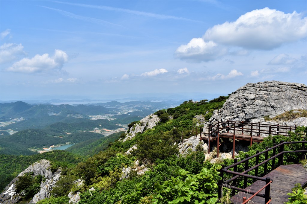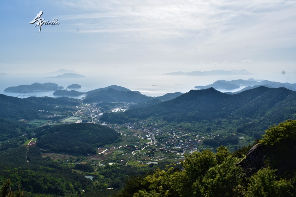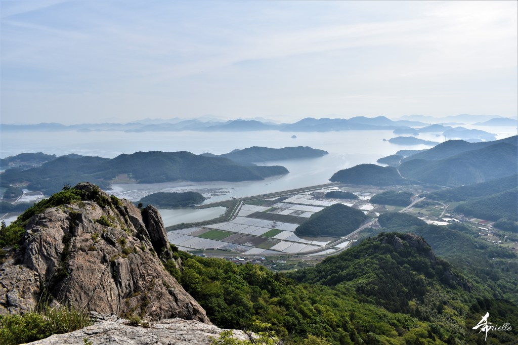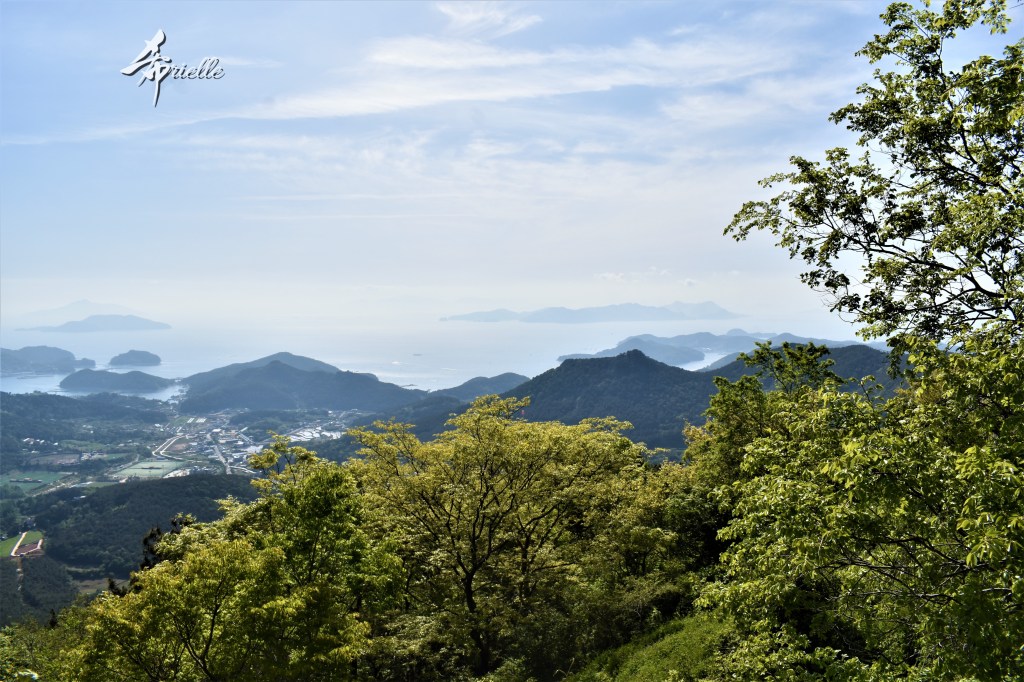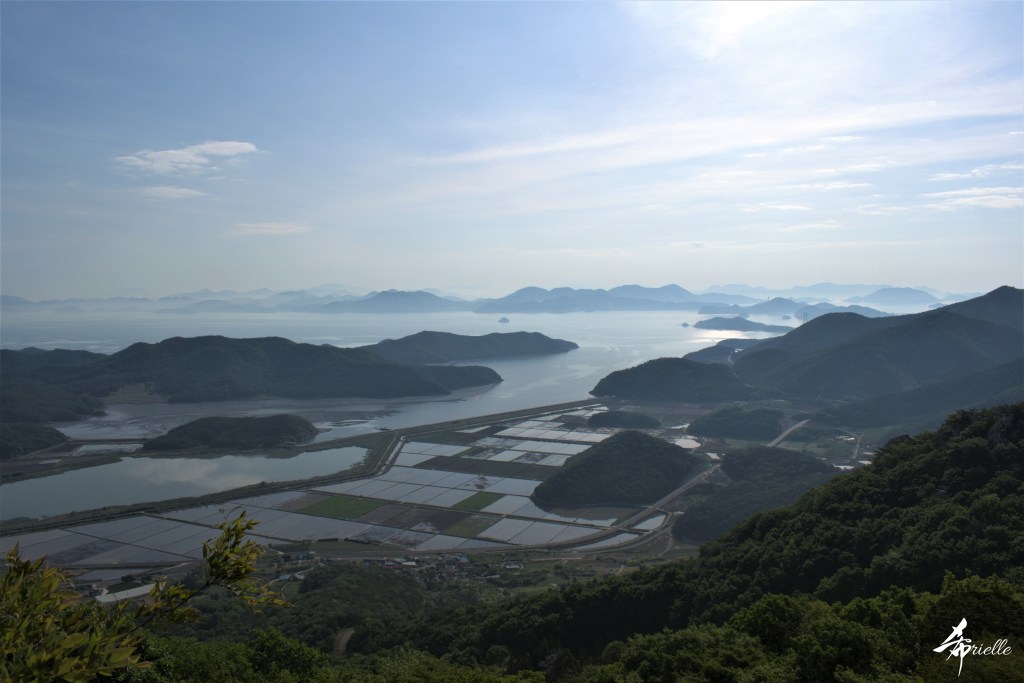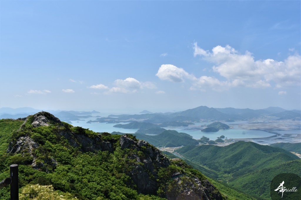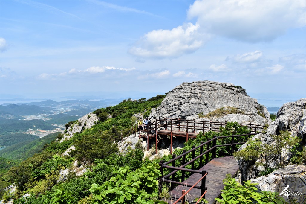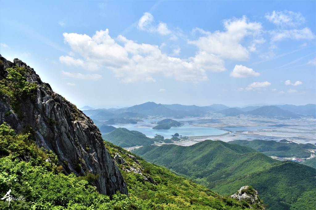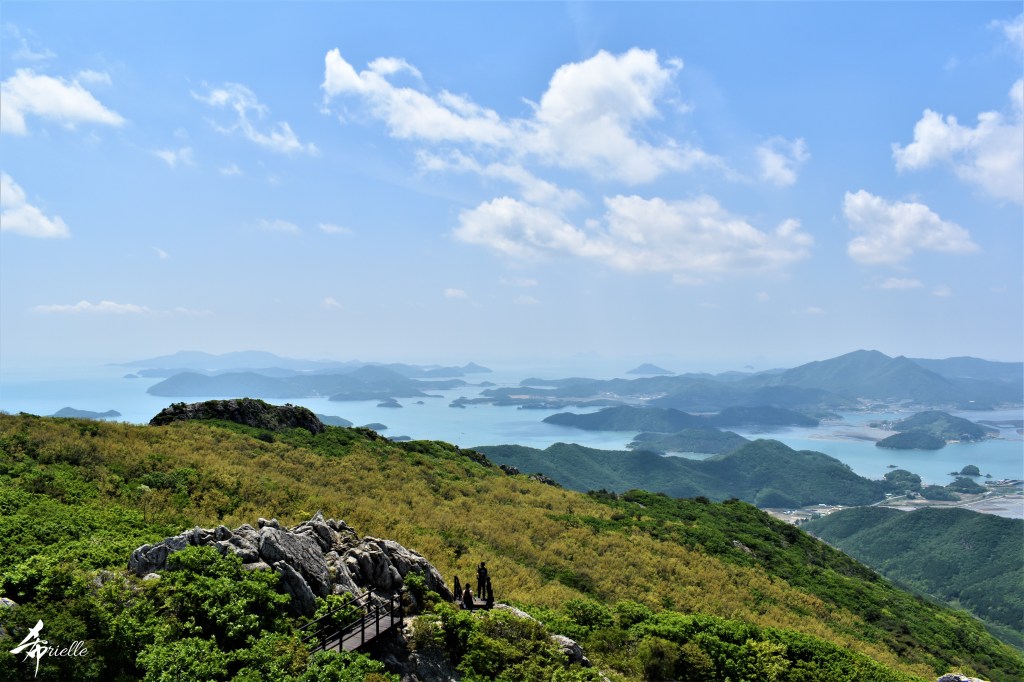 Etant donné que je passe la plupart de mon temps libre soit à la montagne, soit au bord de l’océan, on me demande souvent lequel des deux je préfère. Et bien, honnêtement c’est très difficile à dire mais je crois que là où je me sens le mieux, c’est au sommet d’une montagne offrant une vue sur l’océan. Que ce soit après une randonnée à pieds ou en vélo, il n’y a rien que j’aime plus que le fait de pouvoir finir la journée dans l’eau. Ainsi, l’une des villes où j’aime le plus marcher en Corée, est Tongyeong. Cette ville portuaire, montagneuse est constituée de plusieurs îles accessibles par bateau. Ces trois dernières années, j’ai eu l’occasion de faire le tour de la plupart de ces îles : Bijin, Saryang, Maemul, Seomaemul, Yokji, Suu … Les articles viendront si j’arrive à me tenir à la résolution de publier « plus souvent ». Oui, j’avoue ce n’est pas très précis ni très exigeant comme résolution ! Bref, cette année, j’avais donc envie de rejoindre le sommet de la montagne à Tongyeong qui n’est pas sur une île et ne nécessite donc pas de promenade en bateau. Ainsi, fin avril, j’ai pris le bus jusque là-bas puis un taxi pour rejoindre l’un des temples situés au pied du Mont Mireuk et d’où commence un sentier de randonnée. Encore une fois, il faisait tellement beau que la vue était superbe, en tons de bleu sur bleu. J’étais partie seule donc j’ai pris le temps de prendre toutes les photos que je voulais et profiter de la vue au sommet. Ce jour-là je n’ai pas croisé beaucoup d’autres marcheurs et je crois même que c’est le sentier le plus propre sur lequel j’ai jamais marché. Au sommet, comme le veut la tradition, le peu de personnes présentes, faisaient des photos avec la pierre indiquant le nom et l’altitude du pic. J’avais prévu mon trépied pour en prendre une aussi mais un promeneur venu avec un groupe, qui venait de faire plus d’une quinzaine de photos de ses amis, m’a dit qu’il était photographe et a insisté pour prendre la mienne. Je l’ai donc laissé faire et le résultat était plutôt convaincant. C’est agréable de discuter avec les gens en montagne parce qu’en général, ils sont souriants et sympathiques. Il faut dire qu’il est difficile de ne pas être de bonne humeur, face à la beauté des paysages ! Pour ceux qui le souhaitent, une ligne de cabines téléfériques fait aussi l’aller-retour du port au sommet. Pour ma part, j’ai particulièrement apprécié, une oeuvre d’art installée sur un belvédère offrant une vue vers l’est et sur l’île de Geoje. Il s’agissait d’une sculpture en métal du profil d’une femme regardant au loin. Ce n’est pas la première oeuvre de ce genre que je croise dans la région mais à et endroit, je ne m’y attendais vraiment pas et je l’ai trouvée absolument magnifique !