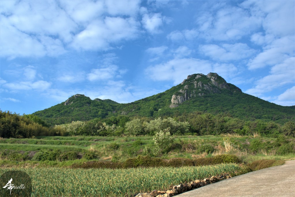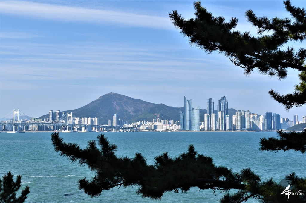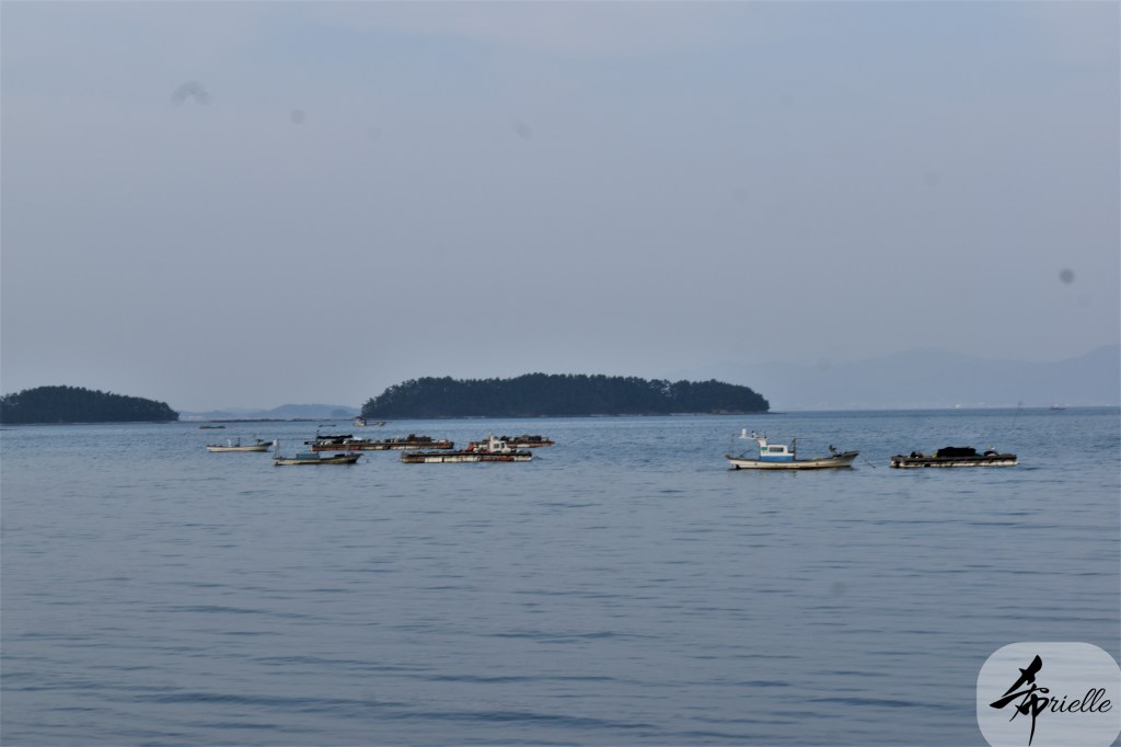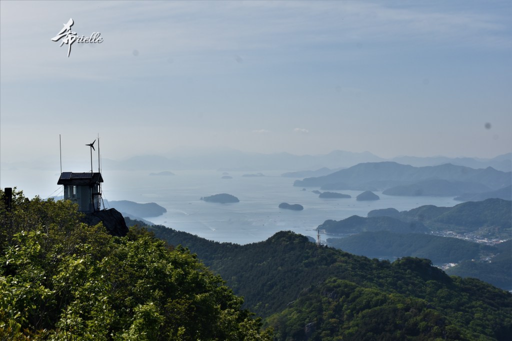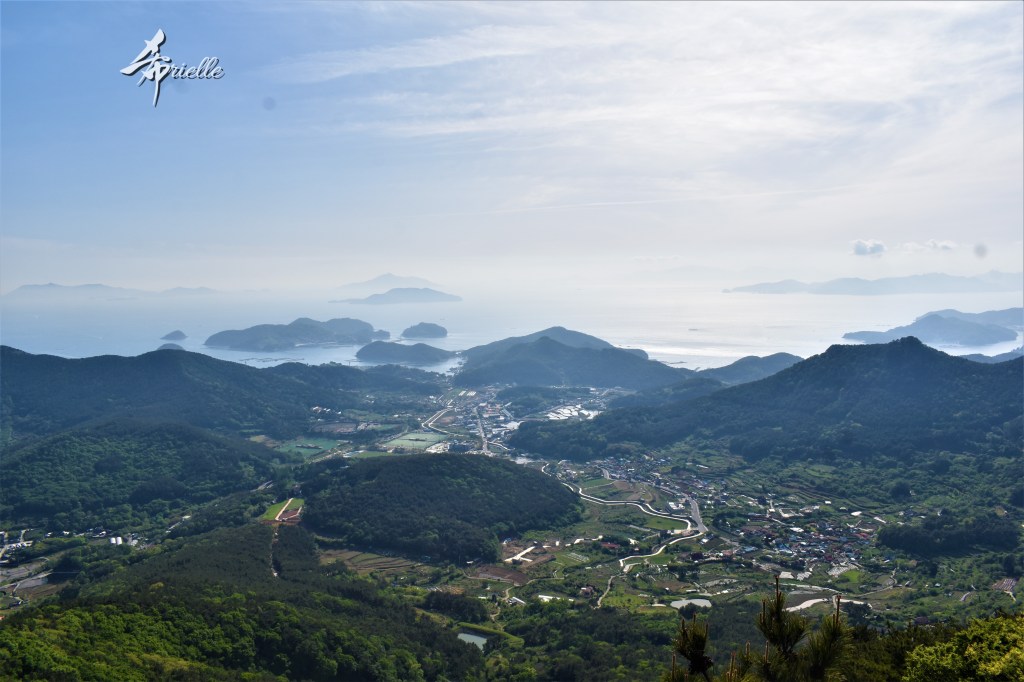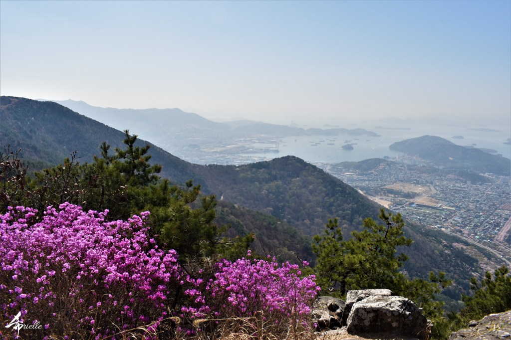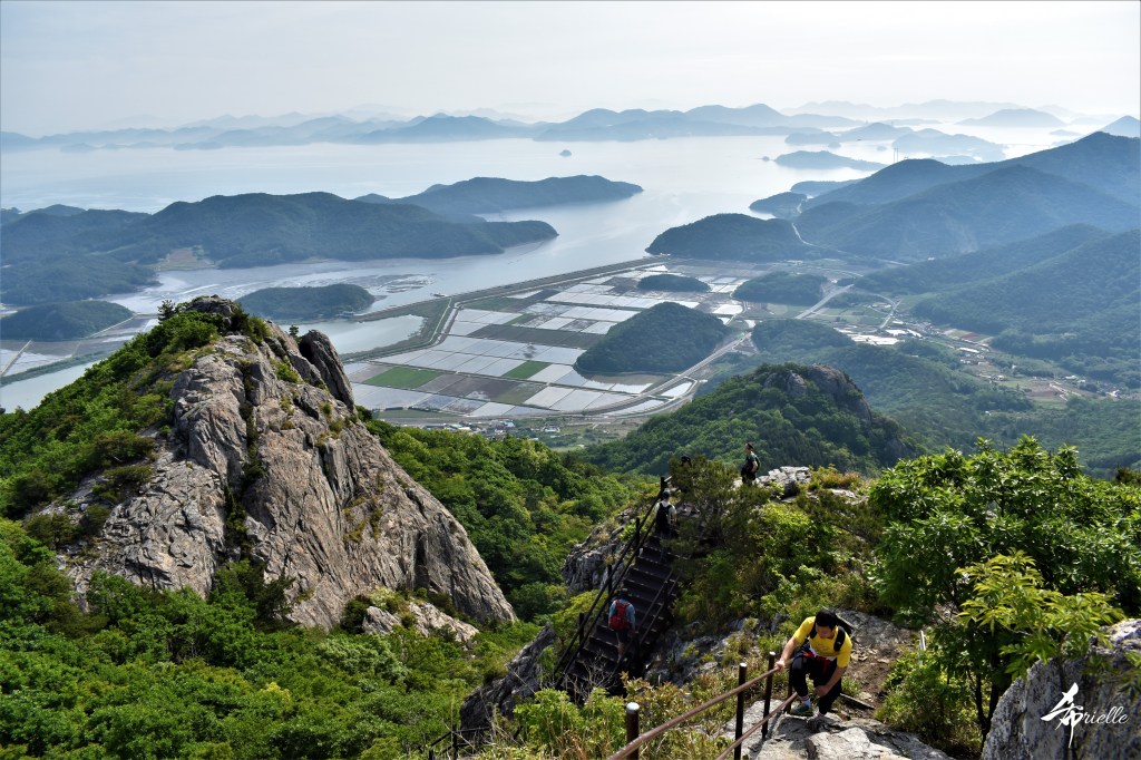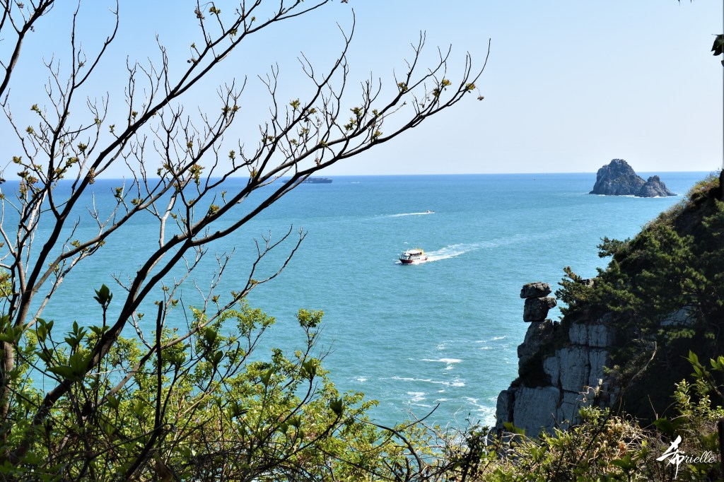Etant donné que je passe la plupart de mon temps libre soit à la montagne, soit au bord de l’océan, on me demande souvent lequel des deux je préfère. Et bien, honnêtement c’est très difficile à dire mais je crois que là où je me sens le mieux, c’est au sommet d’une montagne offrant une vue sur l’océan. Que ce soit après une randonnée à pieds ou en vélo, il n’y a rien que j’aime plus que le fait de pouvoir finir la journée dans l’eau. Ainsi, l’une des villes où j’aime le plus marcher en Corée, est Tongyeong. Cette ville portuaire, montagneuse est constituée de plusieurs îles accessibles par bateau. Ces trois dernières années, j’ai eu l’occasion de faire le tour de la plupart de ces îles : Bijin, Saryang, Maemul, Seomaemul, Yokji, Suu … Les articles viendront si j’arrive à me tenir à la résolution de publier « plus souvent ». Oui, j’avoue ce n’est pas très précis ni très exigeant comme résolution ! Bref, cette année, j’avais donc envie de rejoindre le sommet de la montagne à Tongyeong qui n’est pas sur une île et ne nécessite donc pas de promenade en bateau. Ainsi, fin avril, j’ai pris le bus jusque là-bas puis un taxi pour rejoindre l’un des temples situés au pied du Mont Mireuk et d’où commence un sentier de randonnée. Encore une fois, il faisait tellement beau que la vue était superbe, en tons de bleu sur bleu. J’étais partie seule donc j’ai pris le temps de prendre toutes les photos que je voulais et profiter de la vue au sommet. Ce jour-là je n’ai pas croisé beaucoup d’autres marcheurs et je crois même que c’est le sentier le plus propre sur lequel j’ai jamais marché. Au sommet, comme le veut la tradition, le peu de personnes présentes, faisaient des photos avec la pierre indiquant le nom et l’altitude du pic. J’avais prévu mon trépied pour en prendre une aussi mais un promeneur venu avec un groupe, qui venait de faire plus d’une quinzaine de photos de ses amis, m’a dit qu’il était photographe et a insisté pour prendre la mienne. Je l’ai donc laissé faire et le résultat était plutôt convaincant. C’est agréable de discuter avec les gens en montagne parce qu’en général, ils sont souriants et sympathiques. Il faut dire qu’il est difficile de ne pas être de bonne humeur, face à la beauté des paysages ! Pour ceux qui le souhaitent, une ligne de cabines téléfériques fait aussi l’aller-retour du port au sommet. Pour ma part, j’ai particulièrement apprécié, une oeuvre d’art installée sur un belvédère offrant une vue vers l’est et sur l’île de Geoje. Il s’agissait d’une sculpture en métal du profil d’une femme regardant au loin. Ce n’est pas la première oeuvre de ce genre que je croise dans la région mais à et endroit, je ne m’y attendais vraiment pas et je l’ai trouvée absolument magnifique !