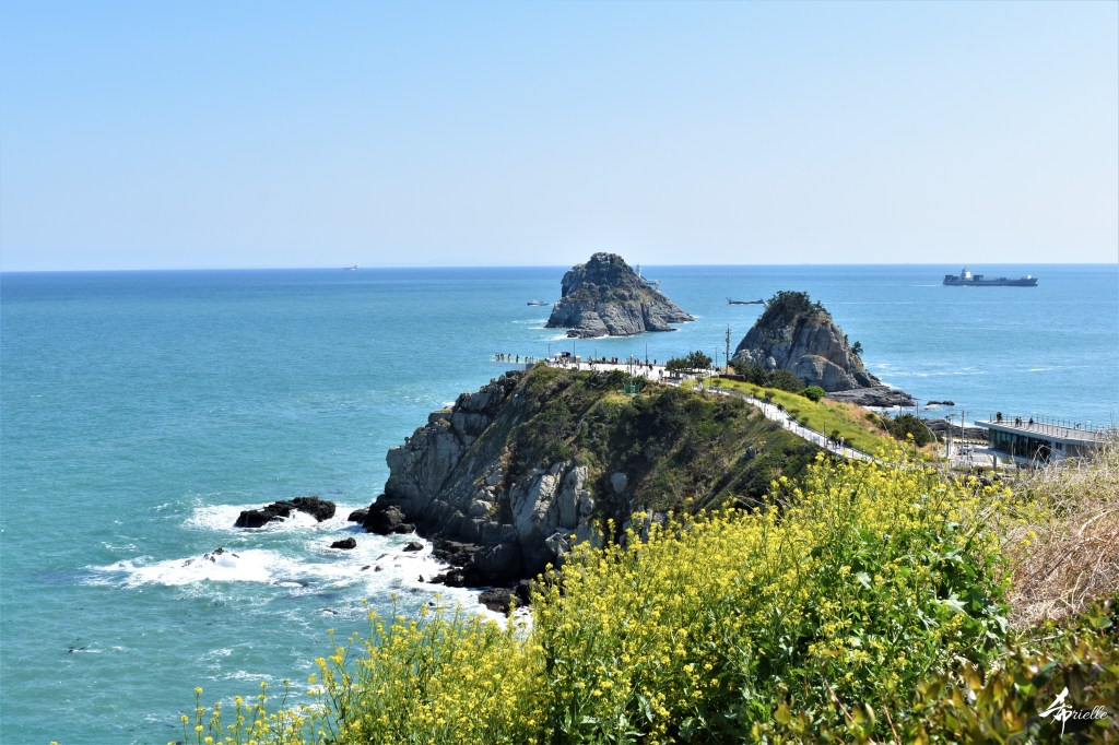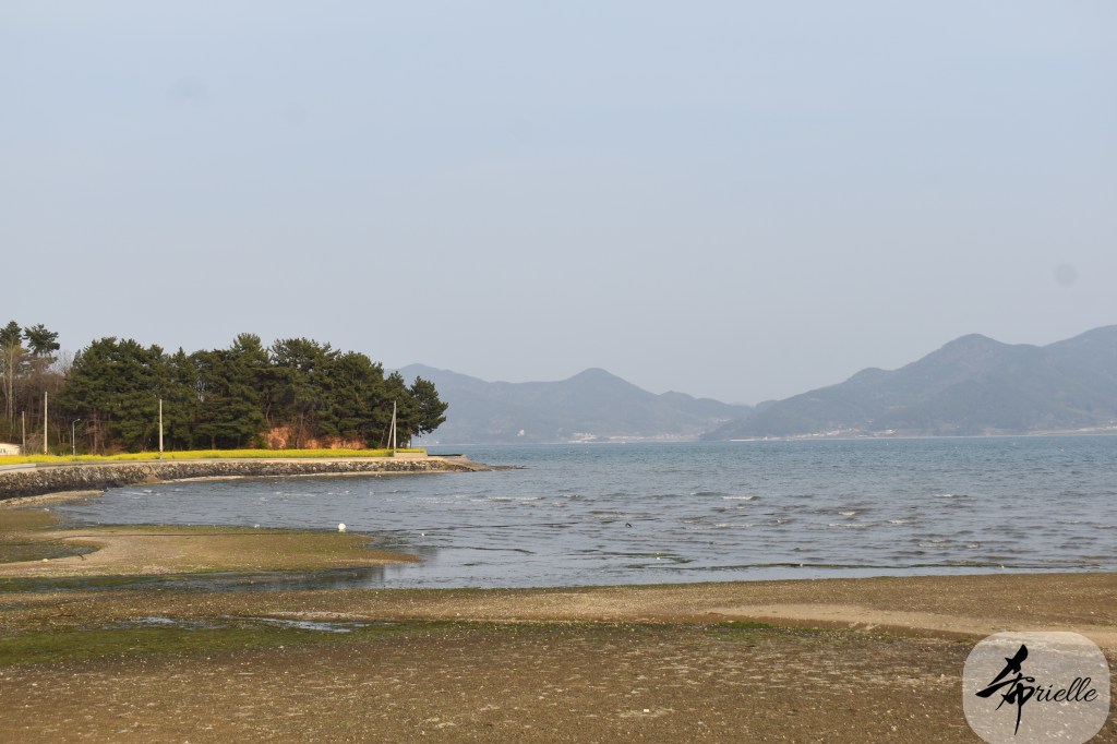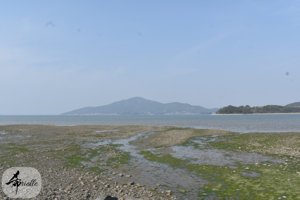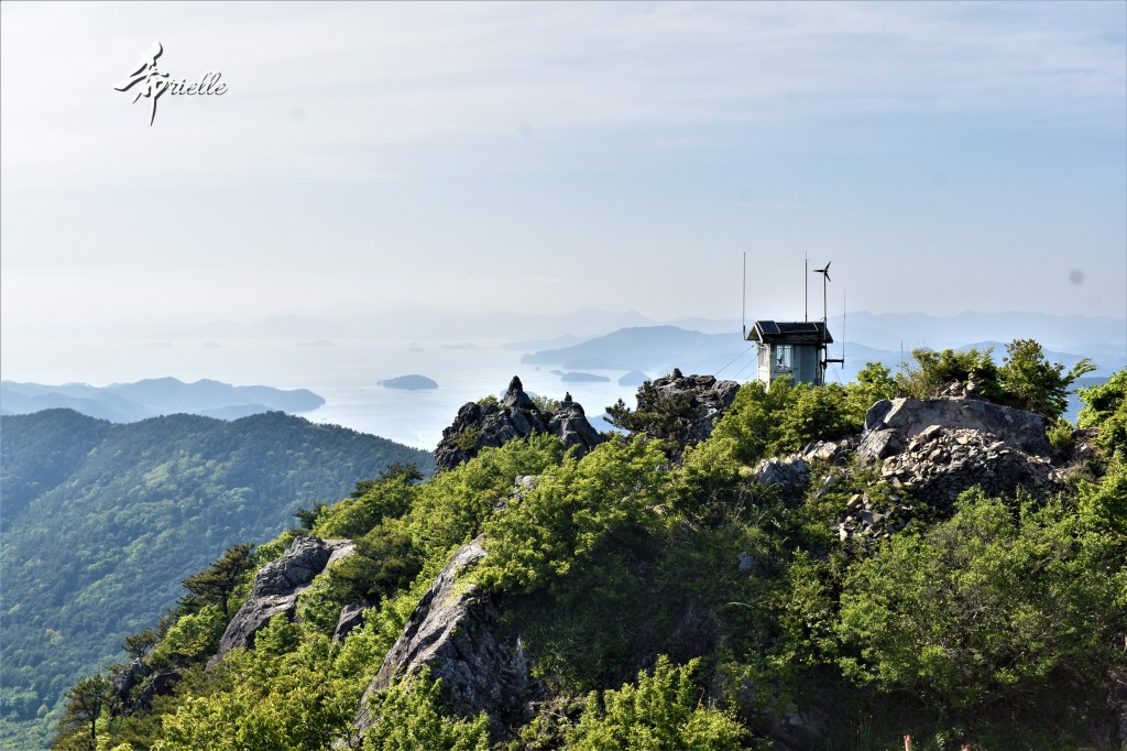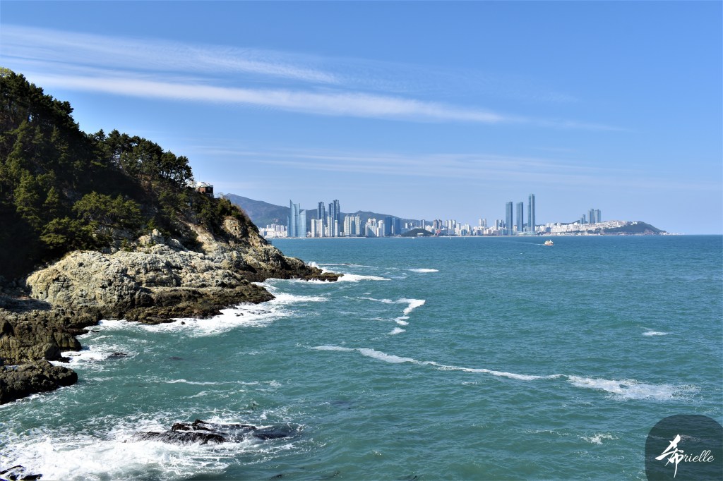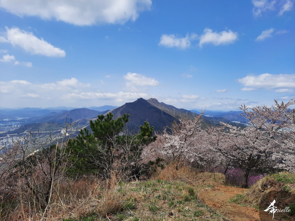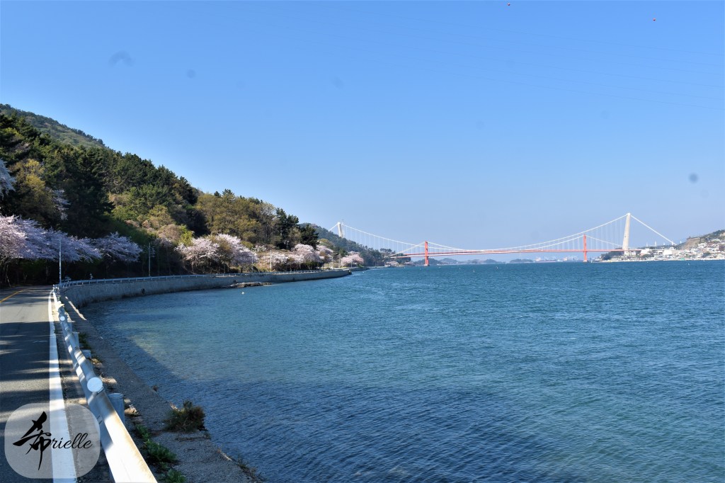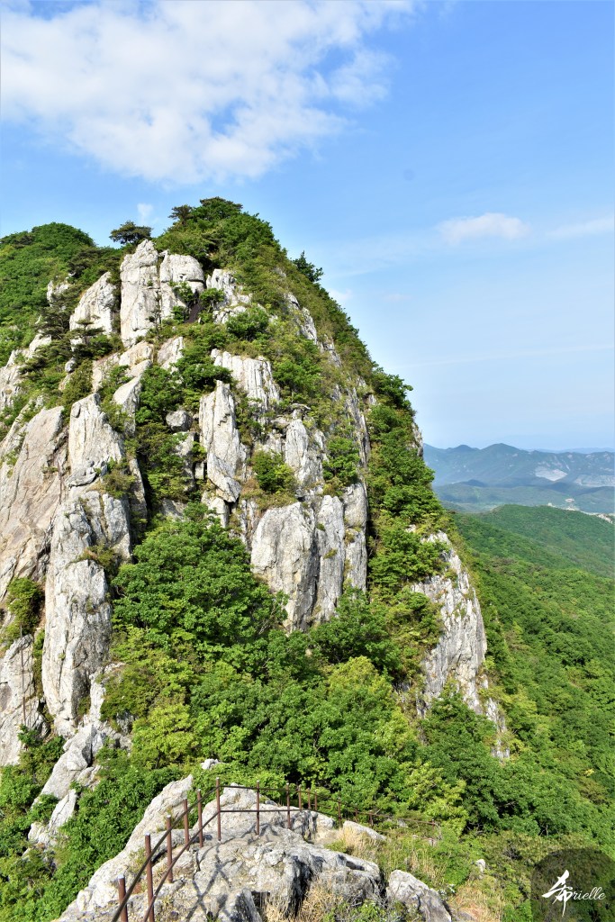 Etant donné que je passe la plupart de mon temps libre soit à la montagne, soit au bord de l’océan, on me demande souvent lequel des deux je préfère. Et bien, honnêtement c’est très difficile à dire mais je crois que là où je me sens le mieux, c’est au sommet d’une montagne offrant une vue sur l’océan. Que ce soit après une randonnée à pieds ou en vélo, il n’y a rien que j’aime plus que le fait de pouvoir finir la journée dans l’eau. Ainsi, l’une des villes où j’aime le plus marcher en Corée, est Tongyeong. Cette ville portuaire, montagneuse est constituée de plusieurs îles accessibles par bateau. Ces trois dernières années, j’ai eu l’occasion de faire le tour de la plupart de ces îles : Bijin, Saryang, Maemul, Seomaemul, Yokji, Suu … Les articles viendront si j’arrive à me tenir à la résolution de publier « plus souvent ». Oui, j’avoue ce n’est pas très précis ni très exigeant comme résolution ! Bref, cette année, j’avais donc envie de rejoindre le sommet de la montagne à Tongyeong qui n’est pas sur une île et ne nécessite donc pas de promenade en bateau. Ainsi, fin avril, j’ai pris le bus jusque là-bas puis un taxi pour rejoindre l’un des temples situés au pied du Mont Mireuk et d’où commence un sentier de randonnée. Encore une fois, il faisait tellement beau que la vue était superbe, en tons de bleu sur bleu. J’étais partie seule donc j’ai pris le temps de prendre toutes les photos que je voulais et profiter de la vue au sommet. Ce jour-là je n’ai pas croisé beaucoup d’autres marcheurs et je crois même que c’est le sentier le plus propre sur lequel j’ai jamais marché. Au sommet, comme le veut la tradition, le peu de personnes présentes, faisaient des photos avec la pierre indiquant le nom et l’altitude du pic. J’avais prévu mon trépied pour en prendre une aussi mais un promeneur venu avec un groupe, qui venait de faire plus d’une quinzaine de photos de ses amis, m’a dit qu’il était photographe et a insisté pour prendre la mienne. Je l’ai donc laissé faire et le résultat était plutôt convaincant. C’est agréable de discuter avec les gens en montagne parce qu’en général, ils sont souriants et sympathiques. Il faut dire qu’il est difficile de ne pas être de bonne humeur, face à la beauté des paysages ! Pour ceux qui le souhaitent, une ligne de cabines téléfériques fait aussi l’aller-retour du port au sommet. Pour ma part, j’ai particulièrement apprécié, une oeuvre d’art installée sur un belvédère offrant une vue vers l’est et sur l’île de Geoje. Il s’agissait d’une sculpture en métal du profil d’une femme regardant au loin. Ce n’est pas la première oeuvre de ce genre que je croise dans la région mais à et endroit, je ne m’y attendais vraiment pas et je l’ai trouvée absolument magnifique !