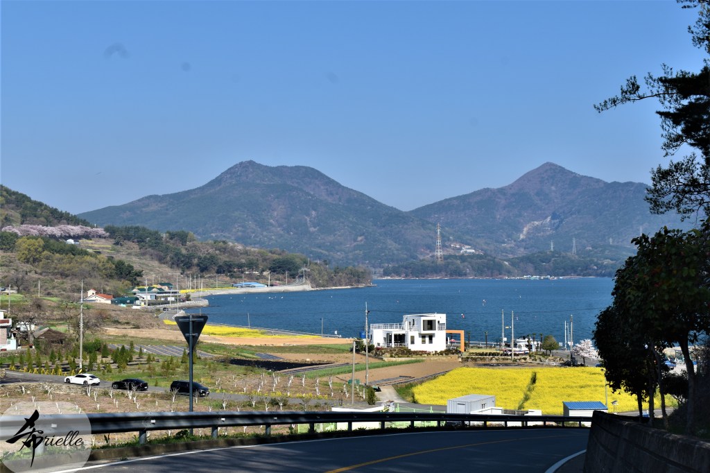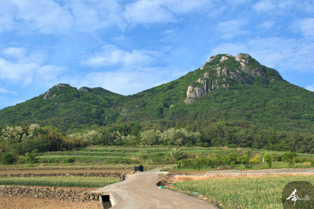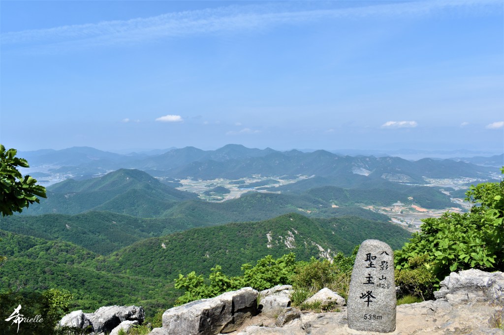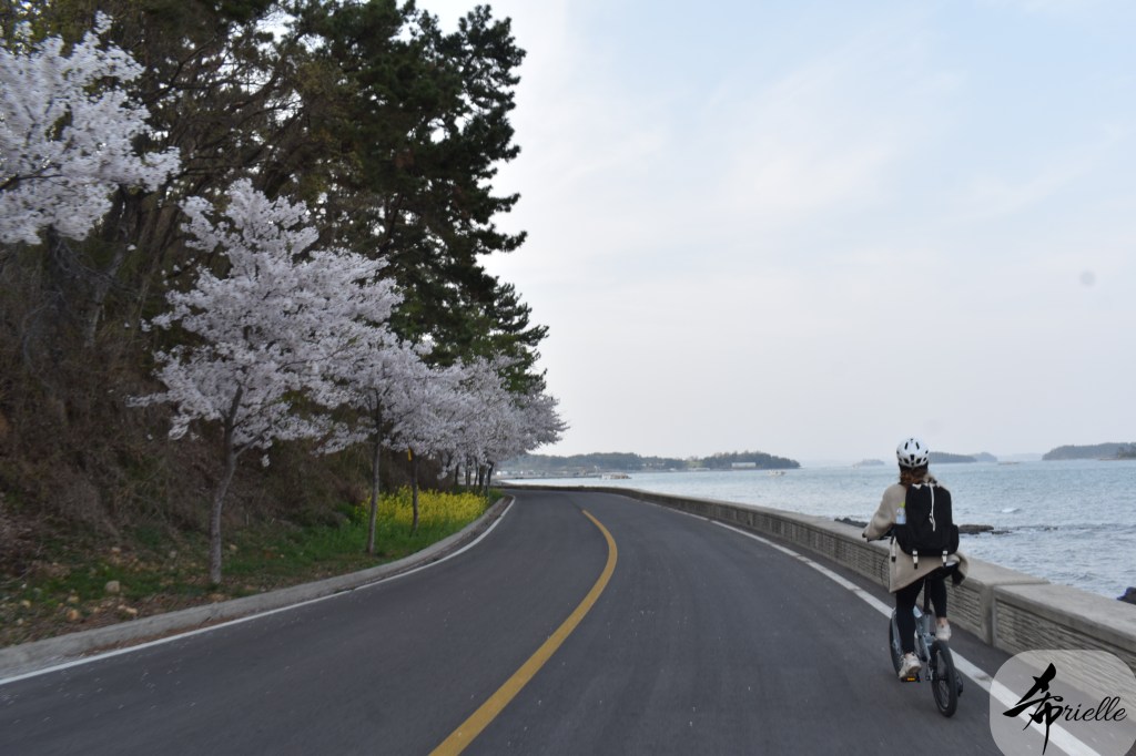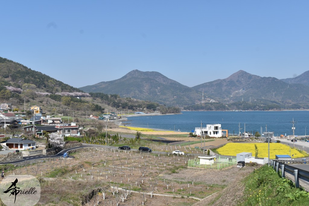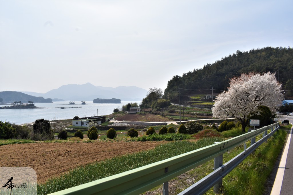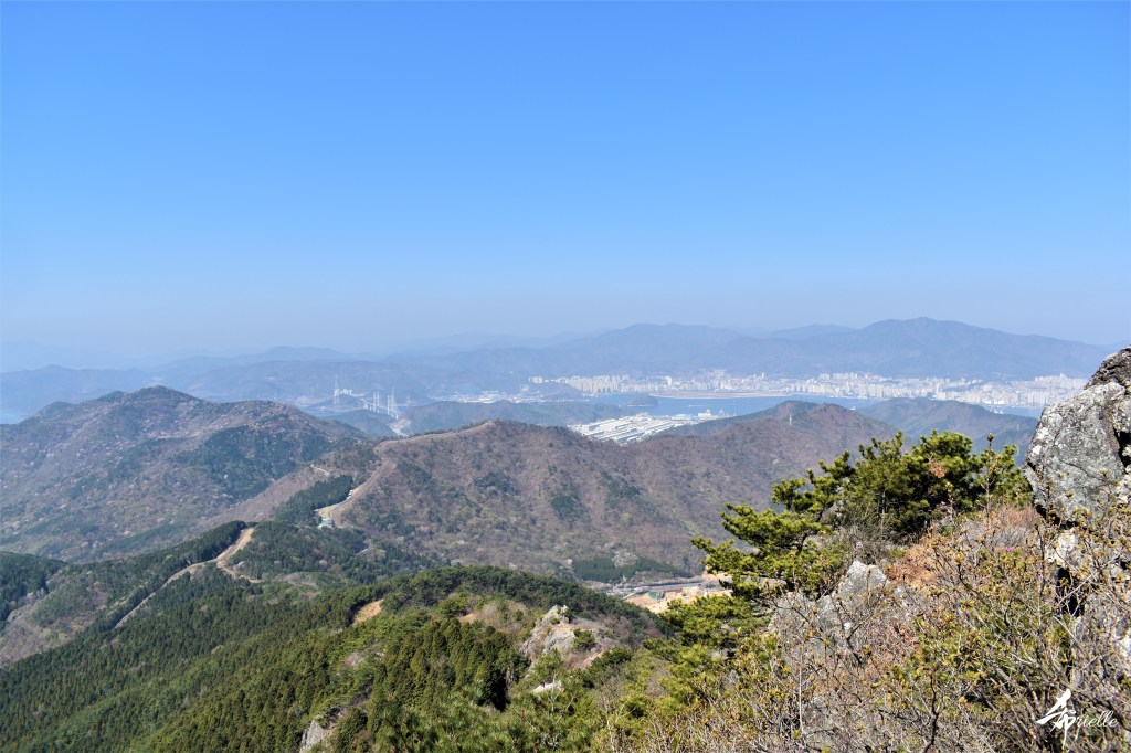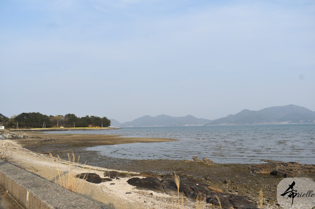 Etant donné que je passe la plupart de mon temps libre soit à la montagne, soit au bord de l’océan, on me demande souvent lequel des deux je préfère. Et bien, honnêtement c’est très difficile à dire mais je crois que là où je me sens le mieux, c’est au sommet d’une montagne offrant une vue sur l’océan. Que ce soit après une randonnée à pieds ou en vélo, il n’y a rien que j’aime plus que le fait de pouvoir finir la journée dans l’eau. Ainsi, l’une des villes où j’aime le plus marcher en Corée, est Tongyeong. Cette ville portuaire, montagneuse est constituée de plusieurs îles accessibles par bateau. Ces trois dernières années, j’ai eu l’occasion de faire le tour de la plupart de ces îles : Bijin, Saryang, Maemul, Seomaemul, Yokji, Suu … Les articles viendront si j’arrive à me tenir à la résolution de publier « plus souvent ». Oui, j’avoue ce n’est pas très précis ni très exigeant comme résolution ! Bref, cette année, j’avais donc envie de rejoindre le sommet de la montagne à Tongyeong qui n’est pas sur une île et ne nécessite donc pas de promenade en bateau. Ainsi, fin avril, j’ai pris le bus jusque là-bas puis un taxi pour rejoindre l’un des temples situés au pied du Mont Mireuk et d’où commence un sentier de randonnée. Encore une fois, il faisait tellement beau que la vue était superbe, en tons de bleu sur bleu. J’étais partie seule donc j’ai pris le temps de prendre toutes les photos que je voulais et profiter de la vue au sommet. Ce jour-là je n’ai pas croisé beaucoup d’autres marcheurs et je crois même que c’est le sentier le plus propre sur lequel j’ai jamais marché. Au sommet, comme le veut la tradition, le peu de personnes présentes, faisaient des photos avec la pierre indiquant le nom et l’altitude du pic. J’avais prévu mon trépied pour en prendre une aussi mais un promeneur venu avec un groupe, qui venait de faire plus d’une quinzaine de photos de ses amis, m’a dit qu’il était photographe et a insisté pour prendre la mienne. Je l’ai donc laissé faire et le résultat était plutôt convaincant. C’est agréable de discuter avec les gens en montagne parce qu’en général, ils sont souriants et sympathiques. Il faut dire qu’il est difficile de ne pas être de bonne humeur, face à la beauté des paysages ! Pour ceux qui le souhaitent, une ligne de cabines téléfériques fait aussi l’aller-retour du port au sommet. Pour ma part, j’ai particulièrement apprécié, une oeuvre d’art installée sur un belvédère offrant une vue vers l’est et sur l’île de Geoje. Il s’agissait d’une sculpture en métal du profil d’une femme regardant au loin. Ce n’est pas la première oeuvre de ce genre que je croise dans la région mais à et endroit, je ne m’y attendais vraiment pas et je l’ai trouvée absolument magnifique !