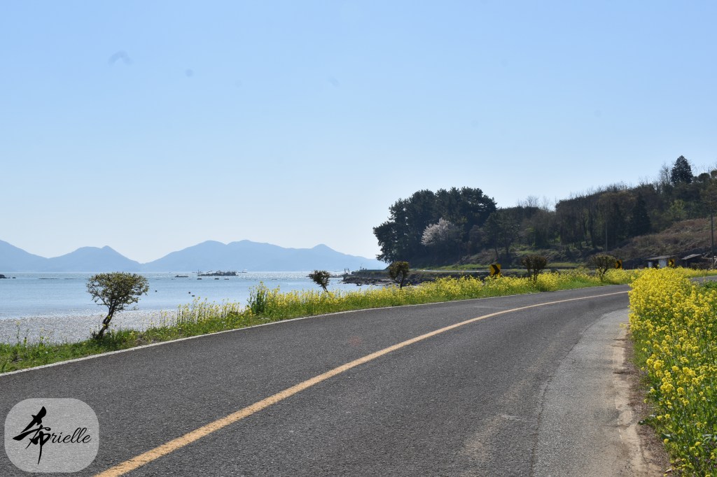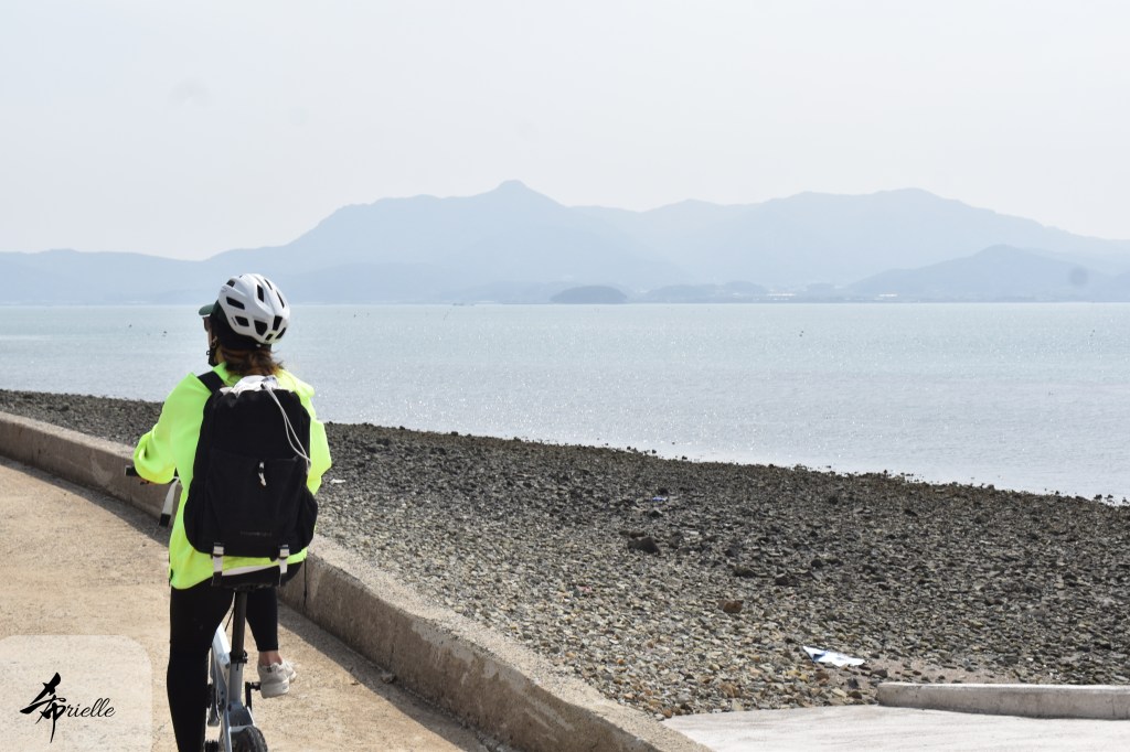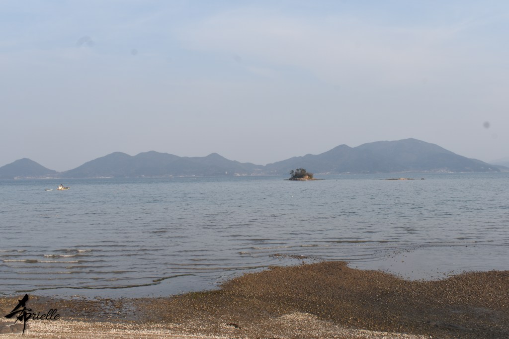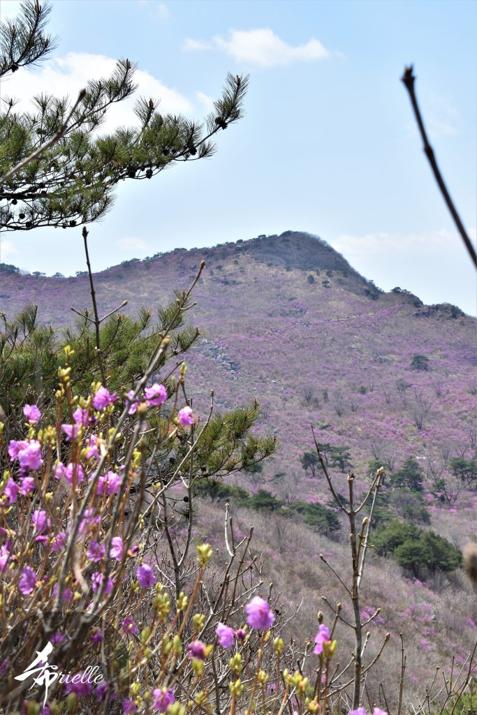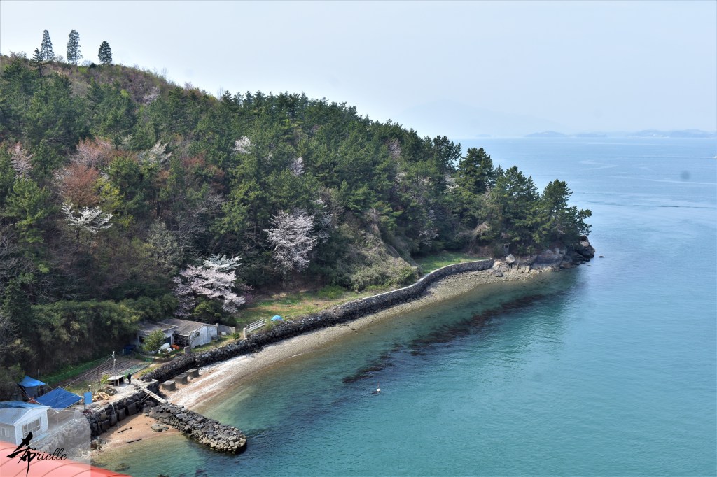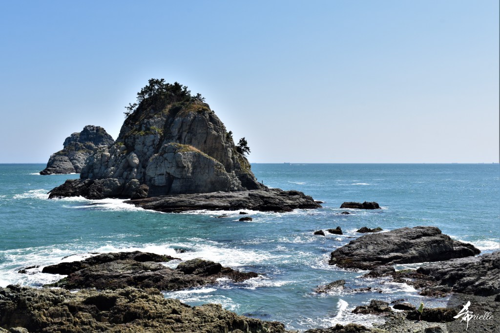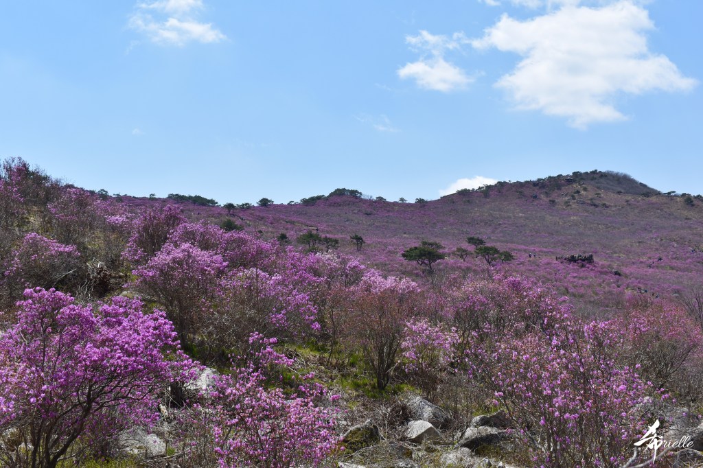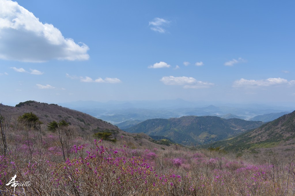 Etant donné que je passe la plupart de mon temps libre soit à la montagne, soit au bord de l’océan, on me demande souvent lequel des deux je préfère. Et bien, honnêtement c’est très difficile à dire mais je crois que là où je me sens le mieux, c’est au sommet d’une montagne offrant une vue sur l’océan. Que ce soit après une randonnée à pieds ou en vélo, il n’y a rien que j’aime plus que le fait de pouvoir finir la journée dans l’eau. Ainsi, l’une des villes où j’aime le plus marcher en Corée, est Tongyeong. Cette ville portuaire, montagneuse est constituée de plusieurs îles accessibles par bateau. Ces trois dernières années, j’ai eu l’occasion de faire le tour de la plupart de ces îles : Bijin, Saryang, Maemul, Seomaemul, Yokji, Suu … Les articles viendront si j’arrive à me tenir à la résolution de publier « plus souvent ». Oui, j’avoue ce n’est pas très précis ni très exigeant comme résolution ! Bref, cette année, j’avais donc envie de rejoindre le sommet de la montagne à Tongyeong qui n’est pas sur une île et ne nécessite donc pas de promenade en bateau. Ainsi, fin avril, j’ai pris le bus jusque là-bas puis un taxi pour rejoindre l’un des temples situés au pied du Mont Mireuk et d’où commence un sentier de randonnée. Encore une fois, il faisait tellement beau que la vue était superbe, en tons de bleu sur bleu. J’étais partie seule donc j’ai pris le temps de prendre toutes les photos que je voulais et profiter de la vue au sommet. Ce jour-là je n’ai pas croisé beaucoup d’autres marcheurs et je crois même que c’est le sentier le plus propre sur lequel j’ai jamais marché. Au sommet, comme le veut la tradition, le peu de personnes présentes, faisaient des photos avec la pierre indiquant le nom et l’altitude du pic. J’avais prévu mon trépied pour en prendre une aussi mais un promeneur venu avec un groupe, qui venait de faire plus d’une quinzaine de photos de ses amis, m’a dit qu’il était photographe et a insisté pour prendre la mienne. Je l’ai donc laissé faire et le résultat était plutôt convaincant. C’est agréable de discuter avec les gens en montagne parce qu’en général, ils sont souriants et sympathiques. Il faut dire qu’il est difficile de ne pas être de bonne humeur, face à la beauté des paysages ! Pour ceux qui le souhaitent, une ligne de cabines téléfériques fait aussi l’aller-retour du port au sommet. Pour ma part, j’ai particulièrement apprécié, une oeuvre d’art installée sur un belvédère offrant une vue vers l’est et sur l’île de Geoje. Il s’agissait d’une sculpture en métal du profil d’une femme regardant au loin. Ce n’est pas la première oeuvre de ce genre que je croise dans la région mais à et endroit, je ne m’y attendais vraiment pas et je l’ai trouvée absolument magnifique !