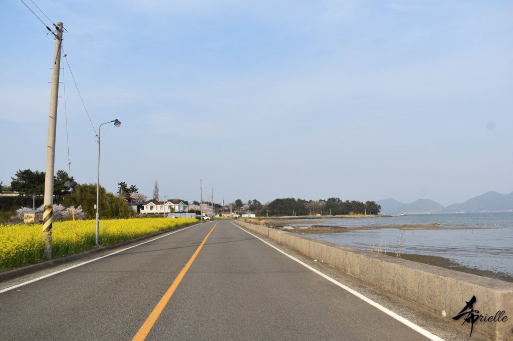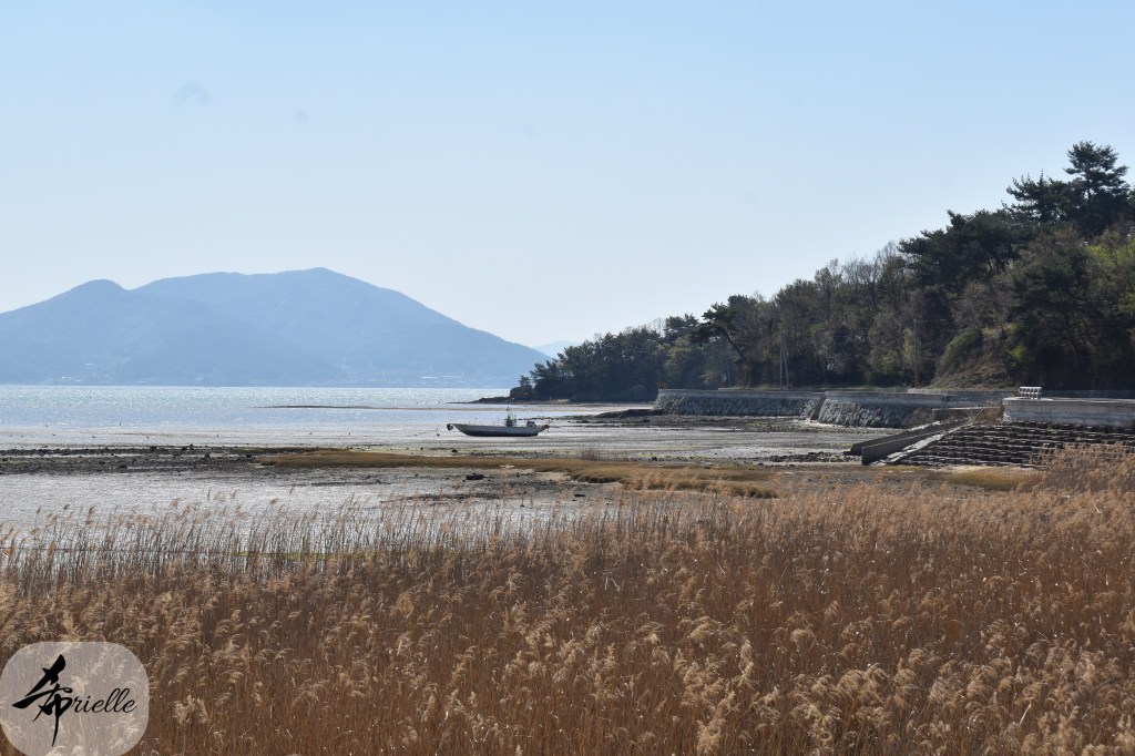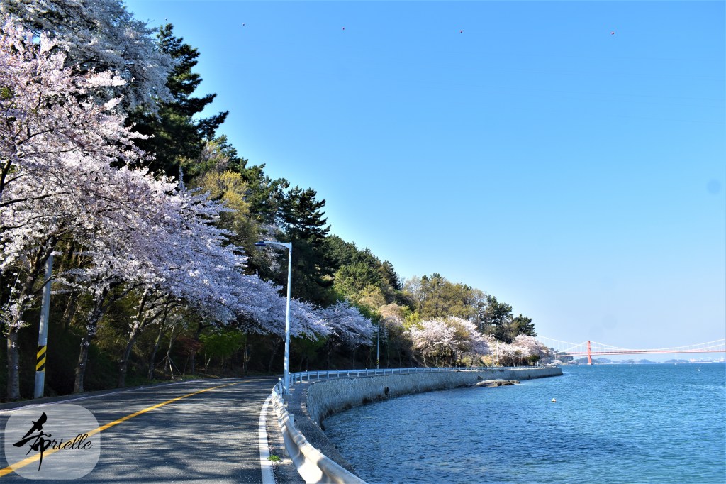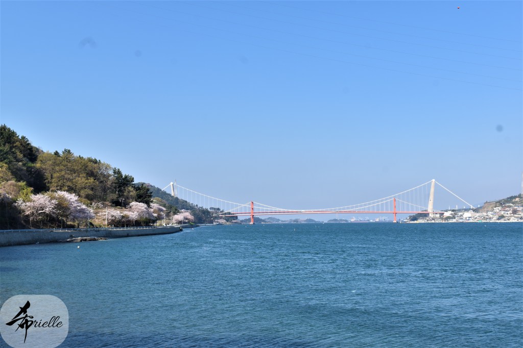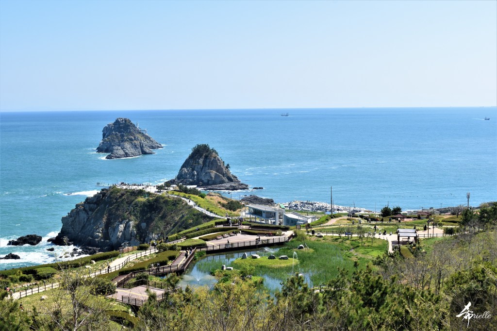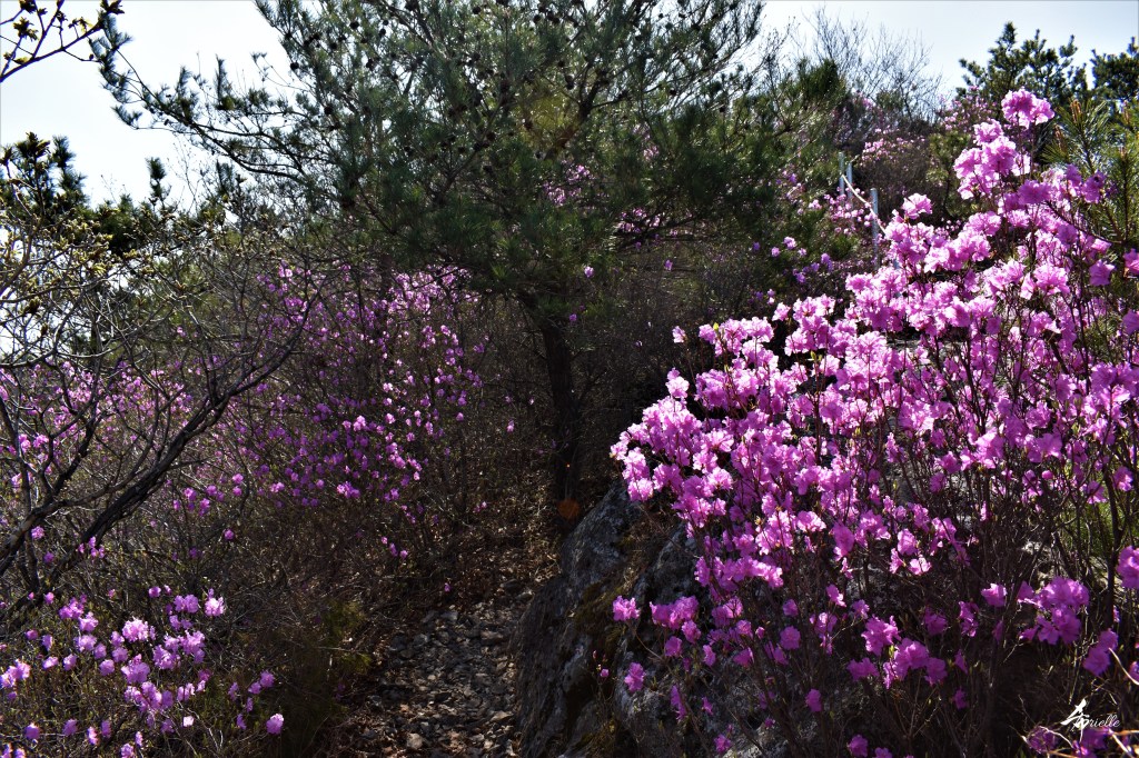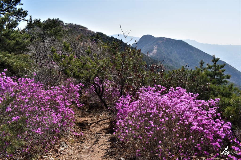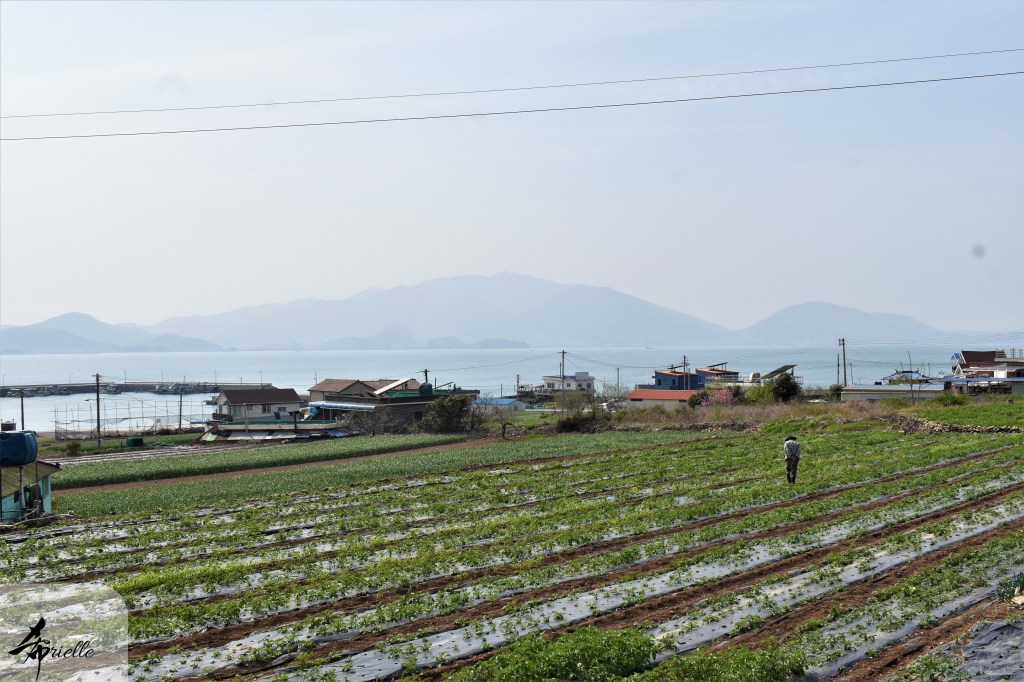 Etant donné que je passe la plupart de mon temps libre soit à la montagne, soit au bord de l’océan, on me demande souvent lequel des deux je préfère. Et bien, honnêtement c’est très difficile à dire mais je crois que là où je me sens le mieux, c’est au sommet d’une montagne offrant une vue sur l’océan. Que ce soit après une randonnée à pieds ou en vélo, il n’y a rien que j’aime plus que le fait de pouvoir finir la journée dans l’eau. Ainsi, l’une des villes où j’aime le plus marcher en Corée, est Tongyeong. Cette ville portuaire, montagneuse est constituée de plusieurs îles accessibles par bateau. Ces trois dernières années, j’ai eu l’occasion de faire le tour de la plupart de ces îles : Bijin, Saryang, Maemul, Seomaemul, Yokji, Suu … Les articles viendront si j’arrive à me tenir à la résolution de publier « plus souvent ». Oui, j’avoue ce n’est pas très précis ni très exigeant comme résolution ! Bref, cette année, j’avais donc envie de rejoindre le sommet de la montagne à Tongyeong qui n’est pas sur une île et ne nécessite donc pas de promenade en bateau. Ainsi, fin avril, j’ai pris le bus jusque là-bas puis un taxi pour rejoindre l’un des temples situés au pied du Mont Mireuk et d’où commence un sentier de randonnée. Encore une fois, il faisait tellement beau que la vue était superbe, en tons de bleu sur bleu. J’étais partie seule donc j’ai pris le temps de prendre toutes les photos que je voulais et profiter de la vue au sommet. Ce jour-là je n’ai pas croisé beaucoup d’autres marcheurs et je crois même que c’est le sentier le plus propre sur lequel j’ai jamais marché. Au sommet, comme le veut la tradition, le peu de personnes présentes, faisaient des photos avec la pierre indiquant le nom et l’altitude du pic. J’avais prévu mon trépied pour en prendre une aussi mais un promeneur venu avec un groupe, qui venait de faire plus d’une quinzaine de photos de ses amis, m’a dit qu’il était photographe et a insisté pour prendre la mienne. Je l’ai donc laissé faire et le résultat était plutôt convaincant. C’est agréable de discuter avec les gens en montagne parce qu’en général, ils sont souriants et sympathiques. Il faut dire qu’il est difficile de ne pas être de bonne humeur, face à la beauté des paysages ! Pour ceux qui le souhaitent, une ligne de cabines téléfériques fait aussi l’aller-retour du port au sommet. Pour ma part, j’ai particulièrement apprécié, une oeuvre d’art installée sur un belvédère offrant une vue vers l’est et sur l’île de Geoje. Il s’agissait d’une sculpture en métal du profil d’une femme regardant au loin. Ce n’est pas la première oeuvre de ce genre que je croise dans la région mais à et endroit, je ne m’y attendais vraiment pas et je l’ai trouvée absolument magnifique !