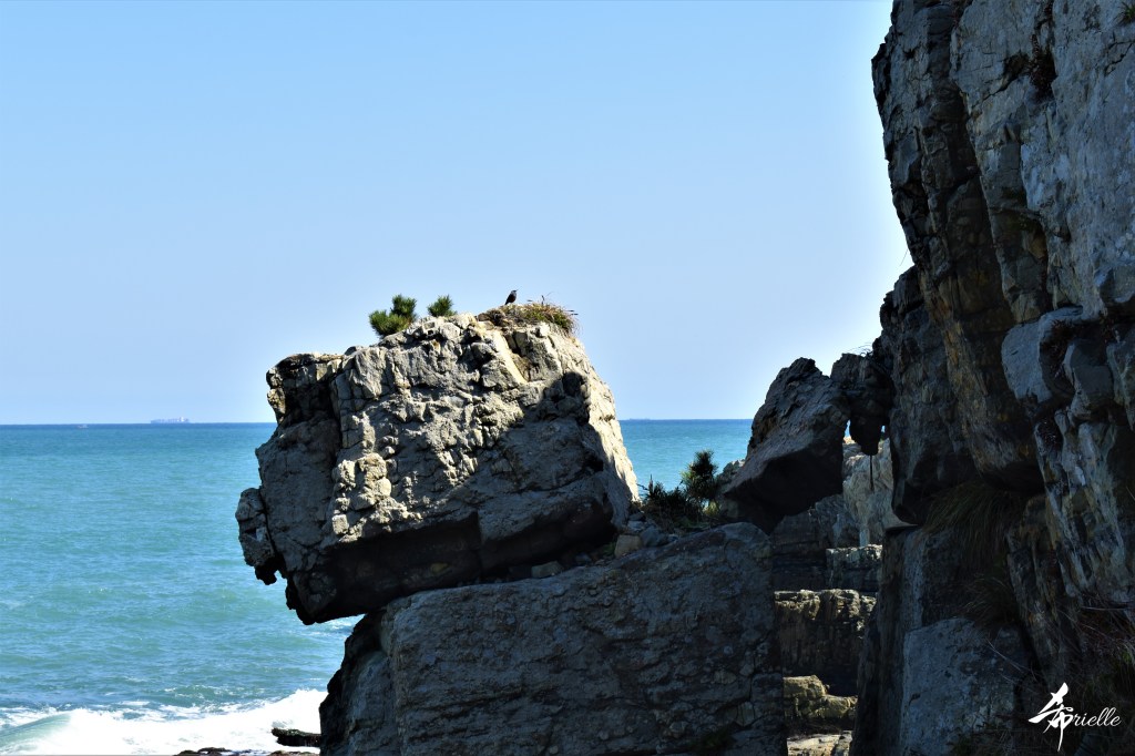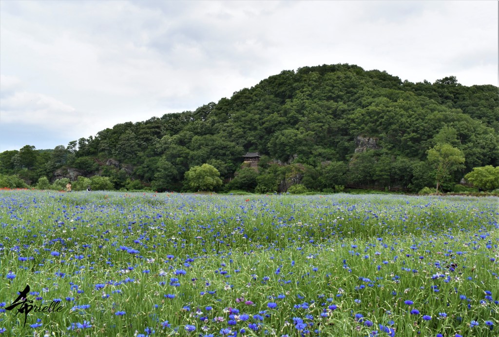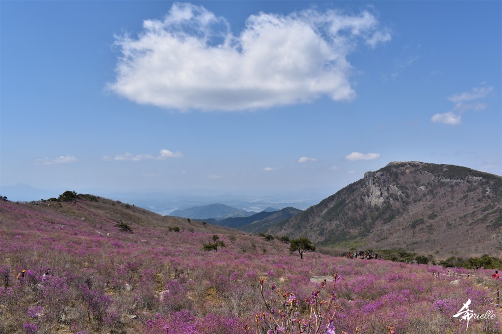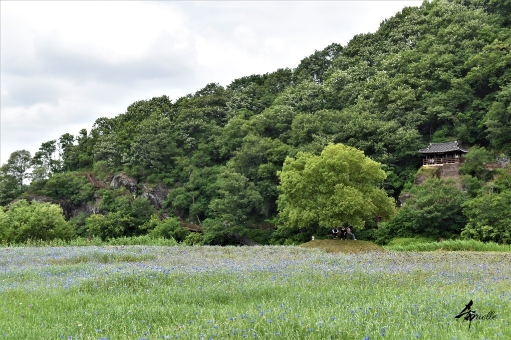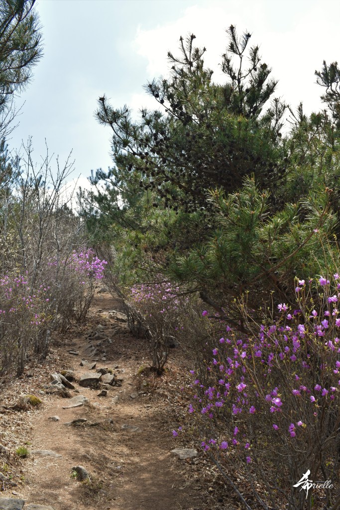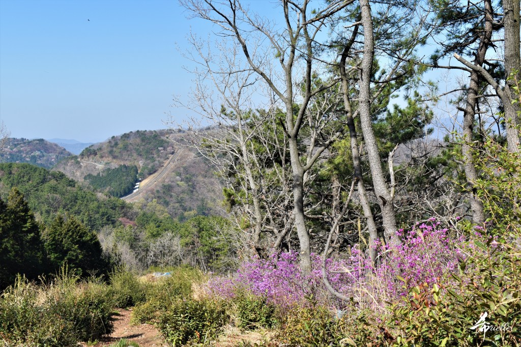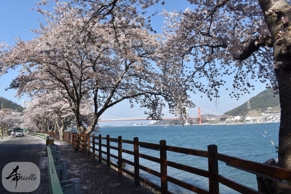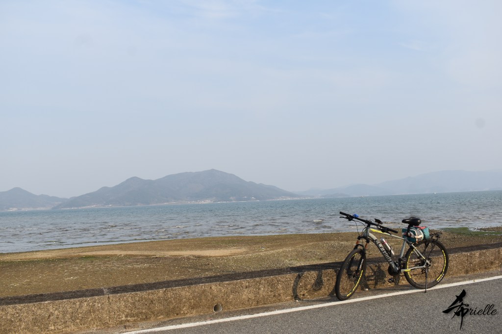 Etant donné que je passe la plupart de mon temps libre soit à la montagne, soit au bord de l’océan, on me demande souvent lequel des deux je préfère. Et bien, honnêtement c’est très difficile à dire mais je crois que là où je me sens le mieux, c’est au sommet d’une montagne offrant une vue sur l’océan. Que ce soit après une randonnée à pieds ou en vélo, il n’y a rien que j’aime plus que le fait de pouvoir finir la journée dans l’eau. Ainsi, l’une des villes où j’aime le plus marcher en Corée, est Tongyeong. Cette ville portuaire, montagneuse est constituée de plusieurs îles accessibles par bateau. Ces trois dernières années, j’ai eu l’occasion de faire le tour de la plupart de ces îles : Bijin, Saryang, Maemul, Seomaemul, Yokji, Suu … Les articles viendront si j’arrive à me tenir à la résolution de publier « plus souvent ». Oui, j’avoue ce n’est pas très précis ni très exigeant comme résolution ! Bref, cette année, j’avais donc envie de rejoindre le sommet de la montagne à Tongyeong qui n’est pas sur une île et ne nécessite donc pas de promenade en bateau. Ainsi, fin avril, j’ai pris le bus jusque là-bas puis un taxi pour rejoindre l’un des temples situés au pied du Mont Mireuk et d’où commence un sentier de randonnée. Encore une fois, il faisait tellement beau que la vue était superbe, en tons de bleu sur bleu. J’étais partie seule donc j’ai pris le temps de prendre toutes les photos que je voulais et profiter de la vue au sommet. Ce jour-là je n’ai pas croisé beaucoup d’autres marcheurs et je crois même que c’est le sentier le plus propre sur lequel j’ai jamais marché. Au sommet, comme le veut la tradition, le peu de personnes présentes, faisaient des photos avec la pierre indiquant le nom et l’altitude du pic. J’avais prévu mon trépied pour en prendre une aussi mais un promeneur venu avec un groupe, qui venait de faire plus d’une quinzaine de photos de ses amis, m’a dit qu’il était photographe et a insisté pour prendre la mienne. Je l’ai donc laissé faire et le résultat était plutôt convaincant. C’est agréable de discuter avec les gens en montagne parce qu’en général, ils sont souriants et sympathiques. Il faut dire qu’il est difficile de ne pas être de bonne humeur, face à la beauté des paysages ! Pour ceux qui le souhaitent, une ligne de cabines téléfériques fait aussi l’aller-retour du port au sommet. Pour ma part, j’ai particulièrement apprécié, une oeuvre d’art installée sur un belvédère offrant une vue vers l’est et sur l’île de Geoje. Il s’agissait d’une sculpture en métal du profil d’une femme regardant au loin. Ce n’est pas la première oeuvre de ce genre que je croise dans la région mais à et endroit, je ne m’y attendais vraiment pas et je l’ai trouvée absolument magnifique !