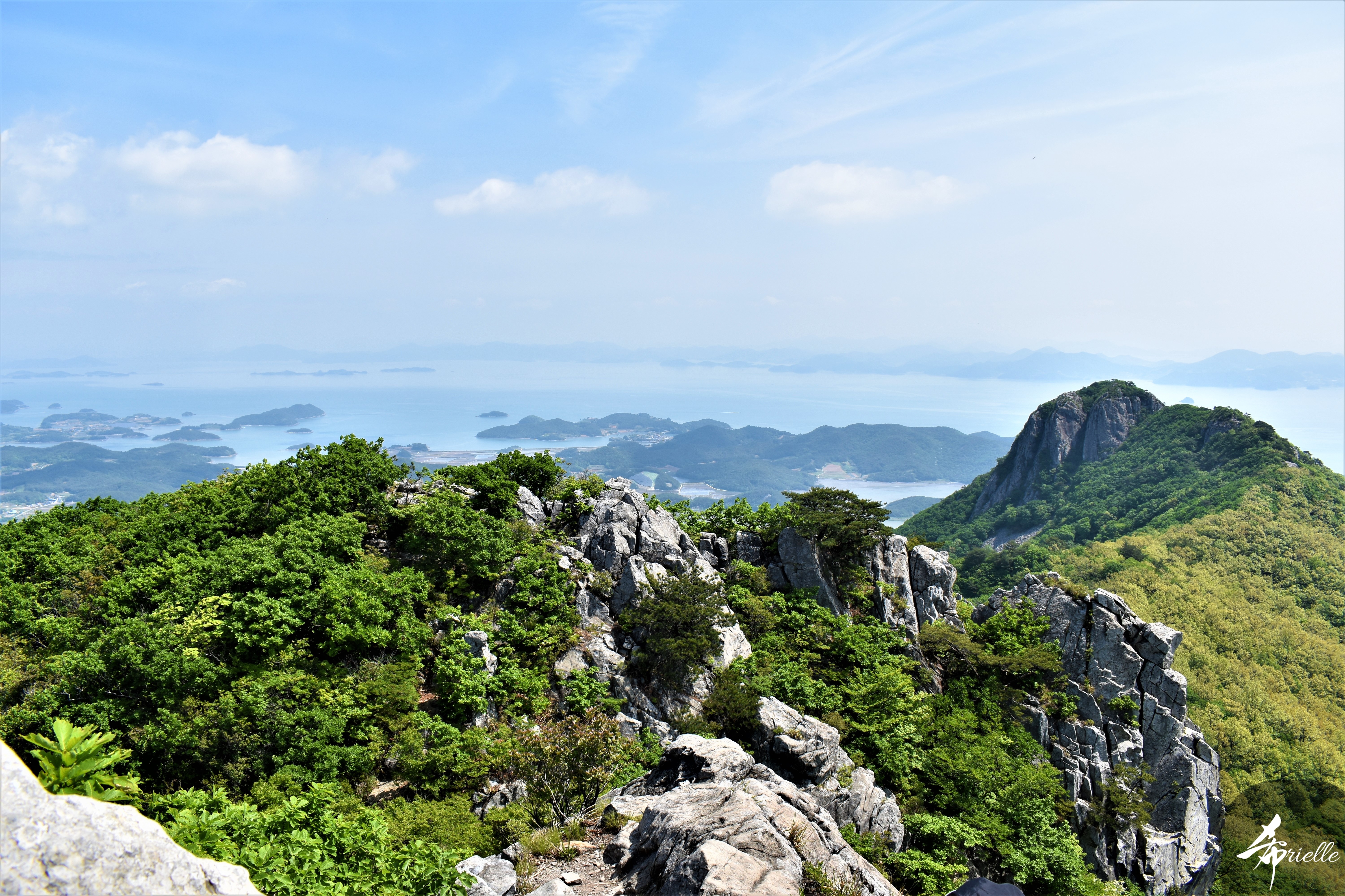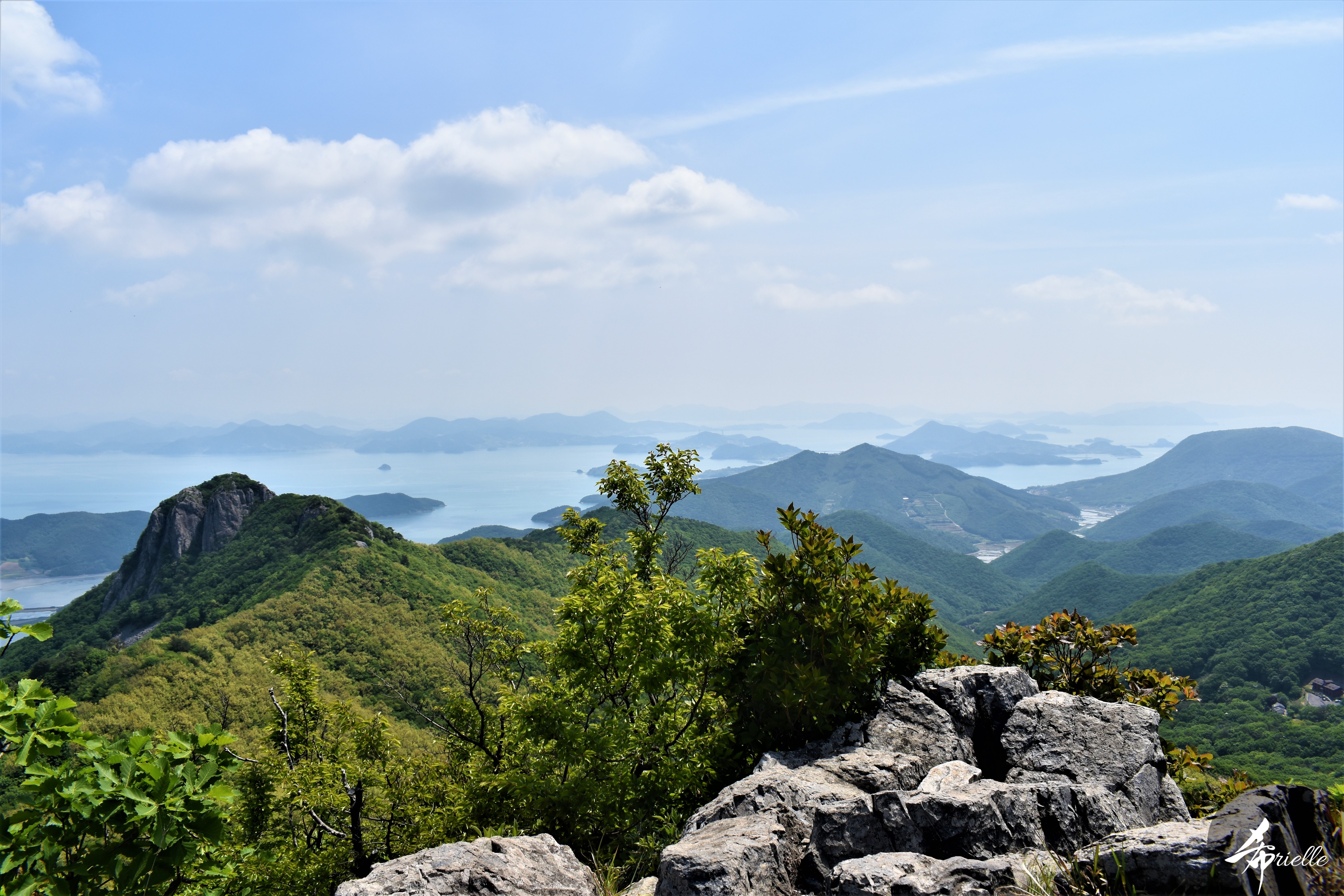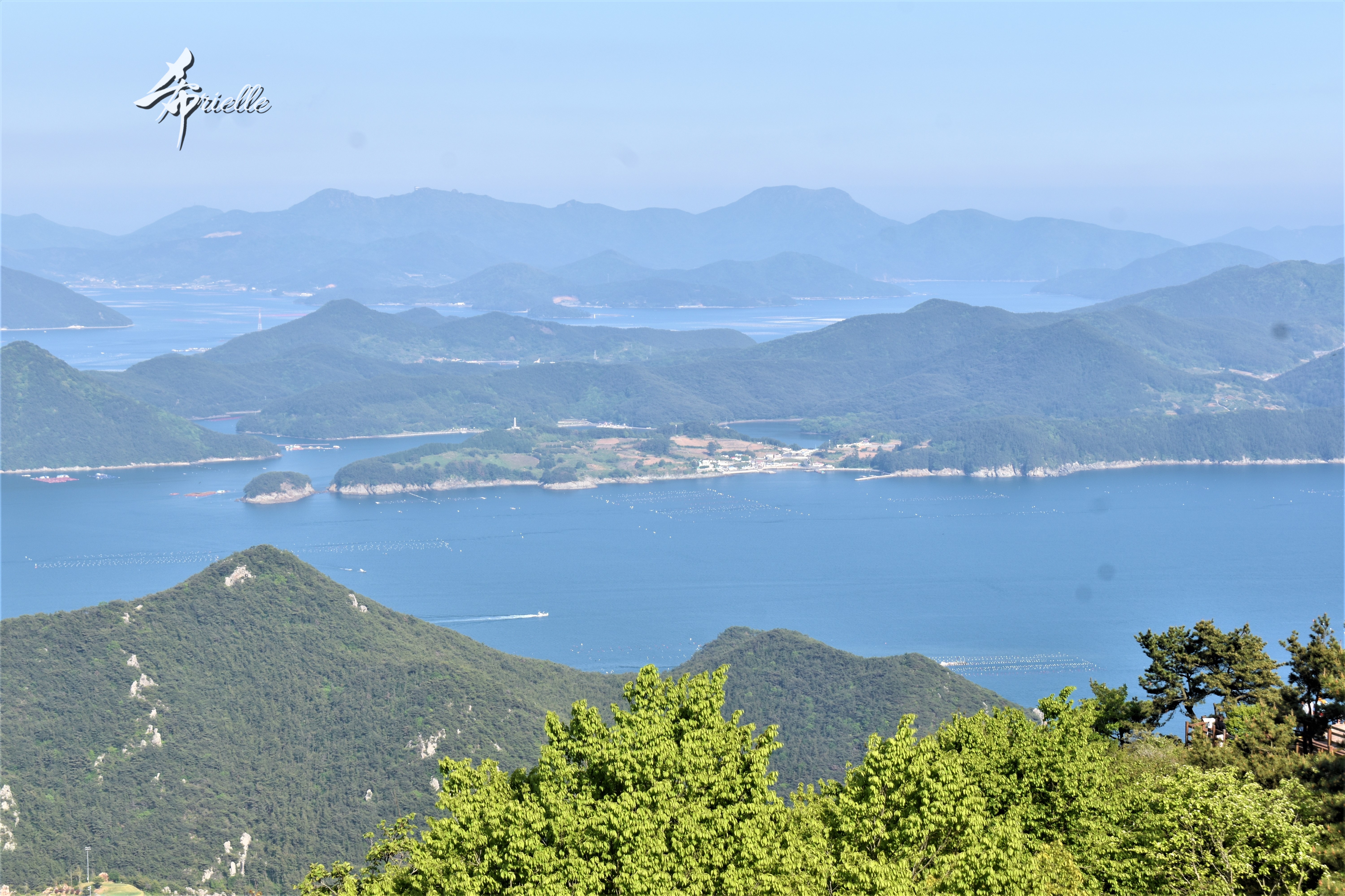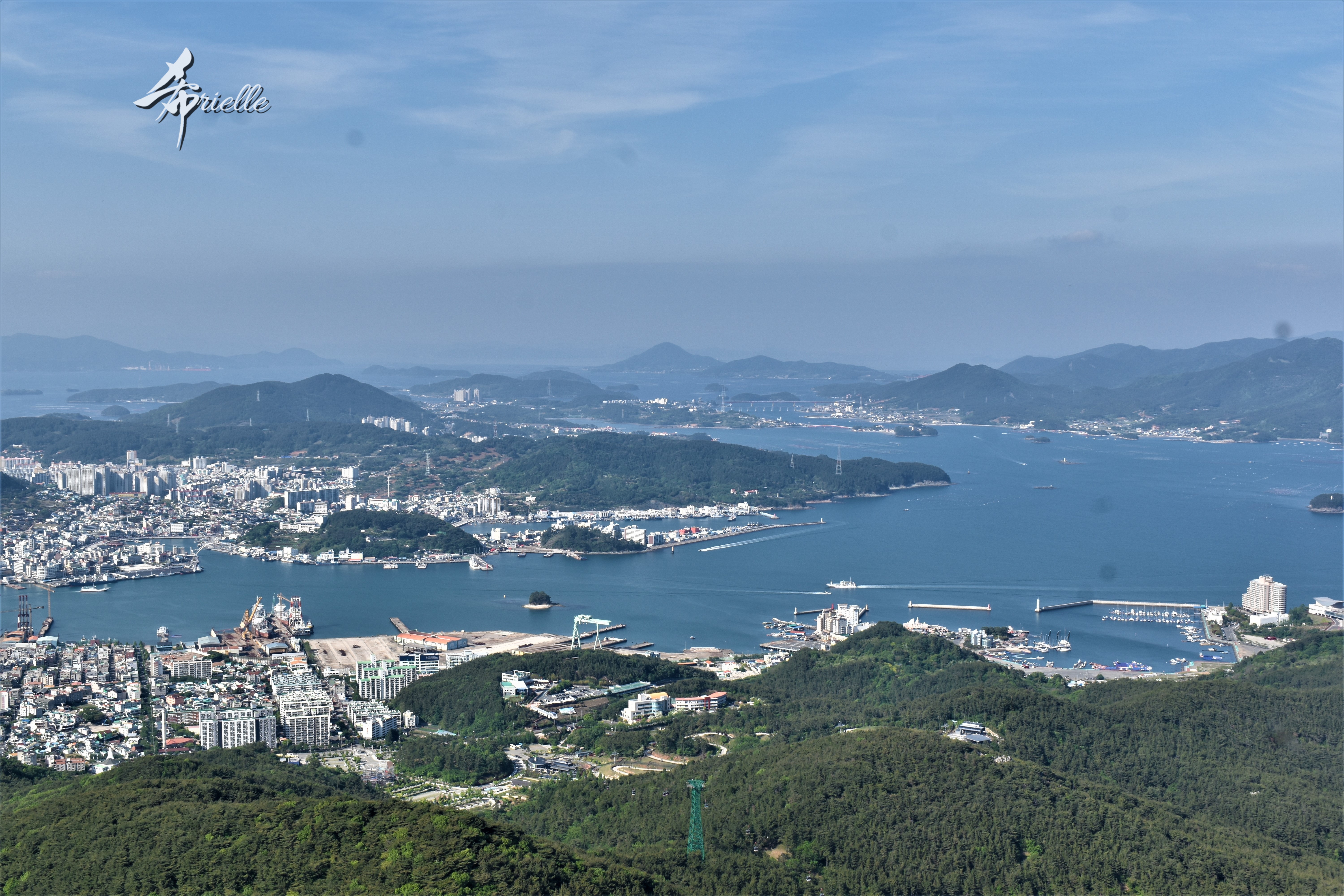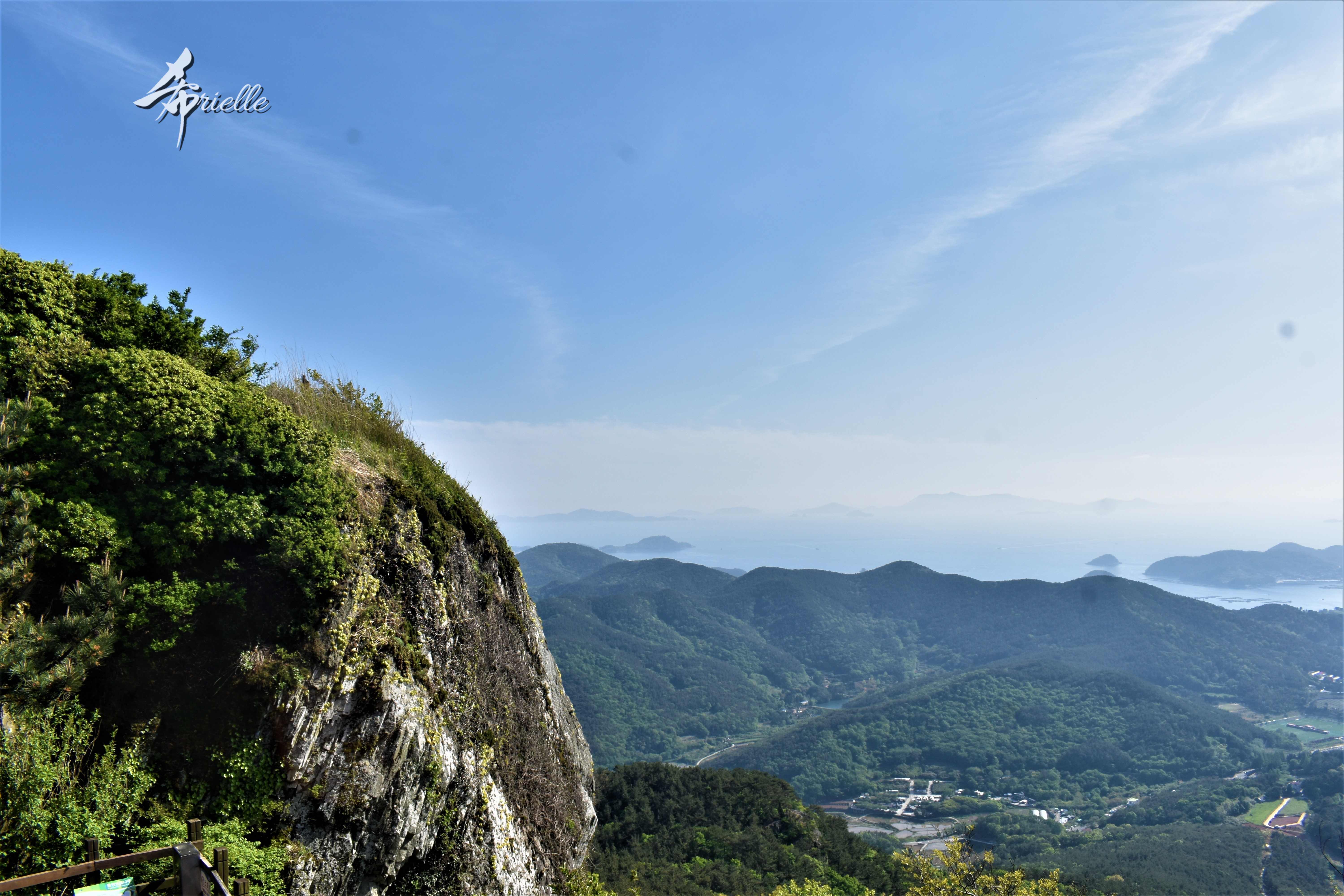 Etant donné que je passe la plupart de mon temps libre soit à la montagne, soit au bord de l’océan, on me demande souvent lequel des deux je préfère. Et bien, honnêtement c’est très difficile à dire mais je crois que là où je me sens le mieux, c’est au sommet d’une montagne offrant une vue sur l’océan. Que ce soit après une randonnée à pieds ou en vélo, il n’y a rien que j’aime plus que le fait de pouvoir finir la journée dans l’eau. Ainsi, l’une des villes où j’aime le plus marcher en Corée, est Tongyeong. Cette ville portuaire, montagneuse est constituée de plusieurs îles accessibles par bateau. Ces trois dernières années, j’ai eu l’occasion de faire le tour de la plupart de ces îles : Bijin, Saryang, Maemul, Seomaemul, Yokji, Suu … Les articles viendront si j’arrive à me tenir à la résolution de publier « plus souvent ». Oui, j’avoue ce n’est pas très précis ni très exigeant comme résolution ! Bref, cette année, j’avais donc envie de rejoindre le sommet de la montagne à Tongyeong qui n’est pas sur une île et ne nécessite donc pas de promenade en bateau. Ainsi, fin avril, j’ai pris le bus jusque là-bas puis un taxi pour rejoindre l’un des temples situés au pied du Mont Mireuk et d’où commence un sentier de randonnée. Encore une fois, il faisait tellement beau que la vue était superbe, en tons de bleu sur bleu. J’étais partie seule donc j’ai pris le temps de prendre toutes les photos que je voulais et profiter de la vue au sommet. Ce jour-là je n’ai pas croisé beaucoup d’autres marcheurs et je crois même que c’est le sentier le plus propre sur lequel j’ai jamais marché. Au sommet, comme le veut la tradition, le peu de personnes présentes, faisaient des photos avec la pierre indiquant le nom et l’altitude du pic. J’avais prévu mon trépied pour en prendre une aussi mais un promeneur venu avec un groupe, qui venait de faire plus d’une quinzaine de photos de ses amis, m’a dit qu’il était photographe et a insisté pour prendre la mienne. Je l’ai donc laissé faire et le résultat était plutôt convaincant. C’est agréable de discuter avec les gens en montagne parce qu’en général, ils sont souriants et sympathiques. Il faut dire qu’il est difficile de ne pas être de bonne humeur, face à la beauté des paysages ! Pour ceux qui le souhaitent, une ligne de cabines téléfériques fait aussi l’aller-retour du port au sommet. Pour ma part, j’ai particulièrement apprécié, une oeuvre d’art installée sur un belvédère offrant une vue vers l’est et sur l’île de Geoje. Il s’agissait d’une sculpture en métal du profil d’une femme regardant au loin. Ce n’est pas la première oeuvre de ce genre que je croise dans la région mais à et endroit, je ne m’y attendais vraiment pas et je l’ai trouvée absolument magnifique !