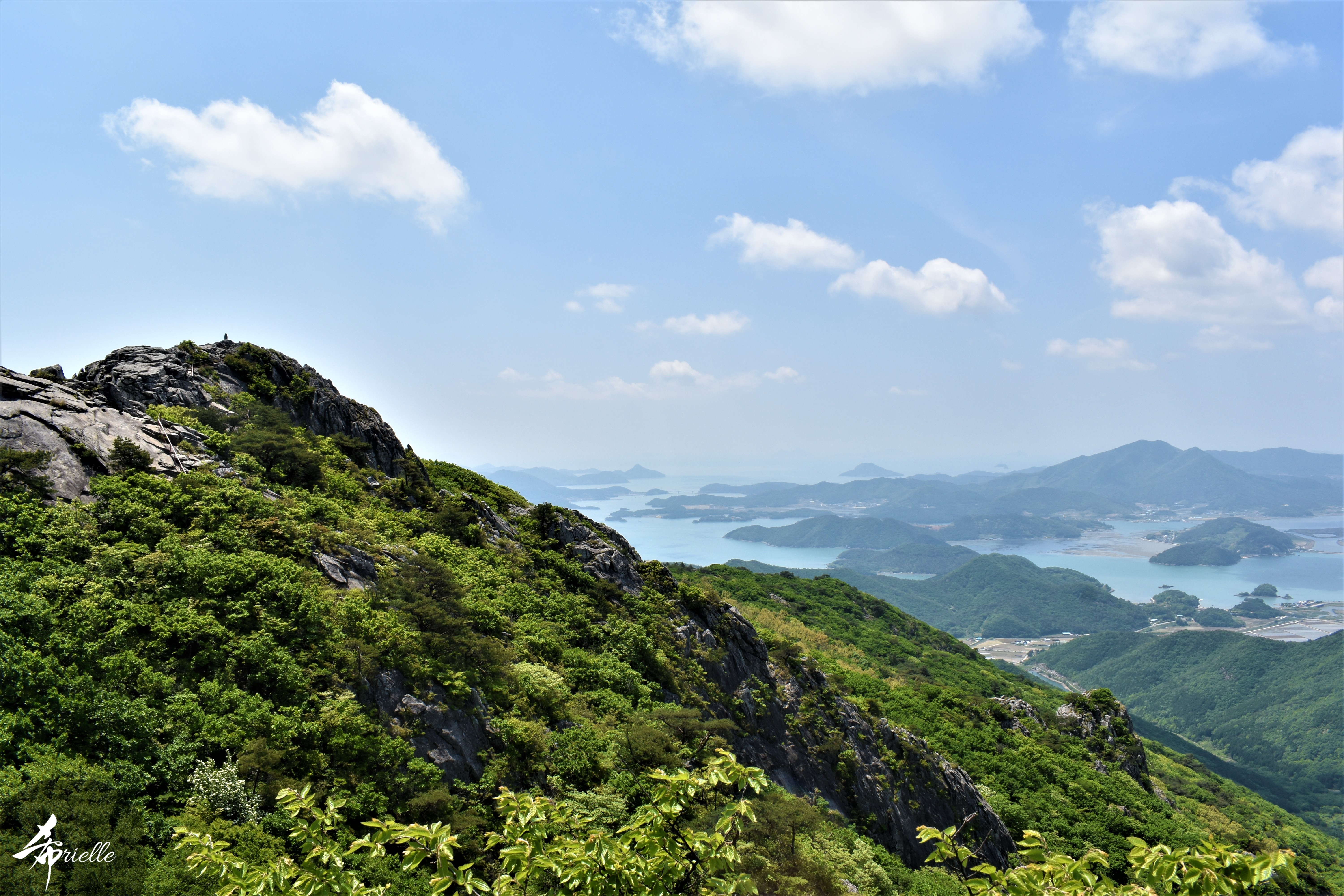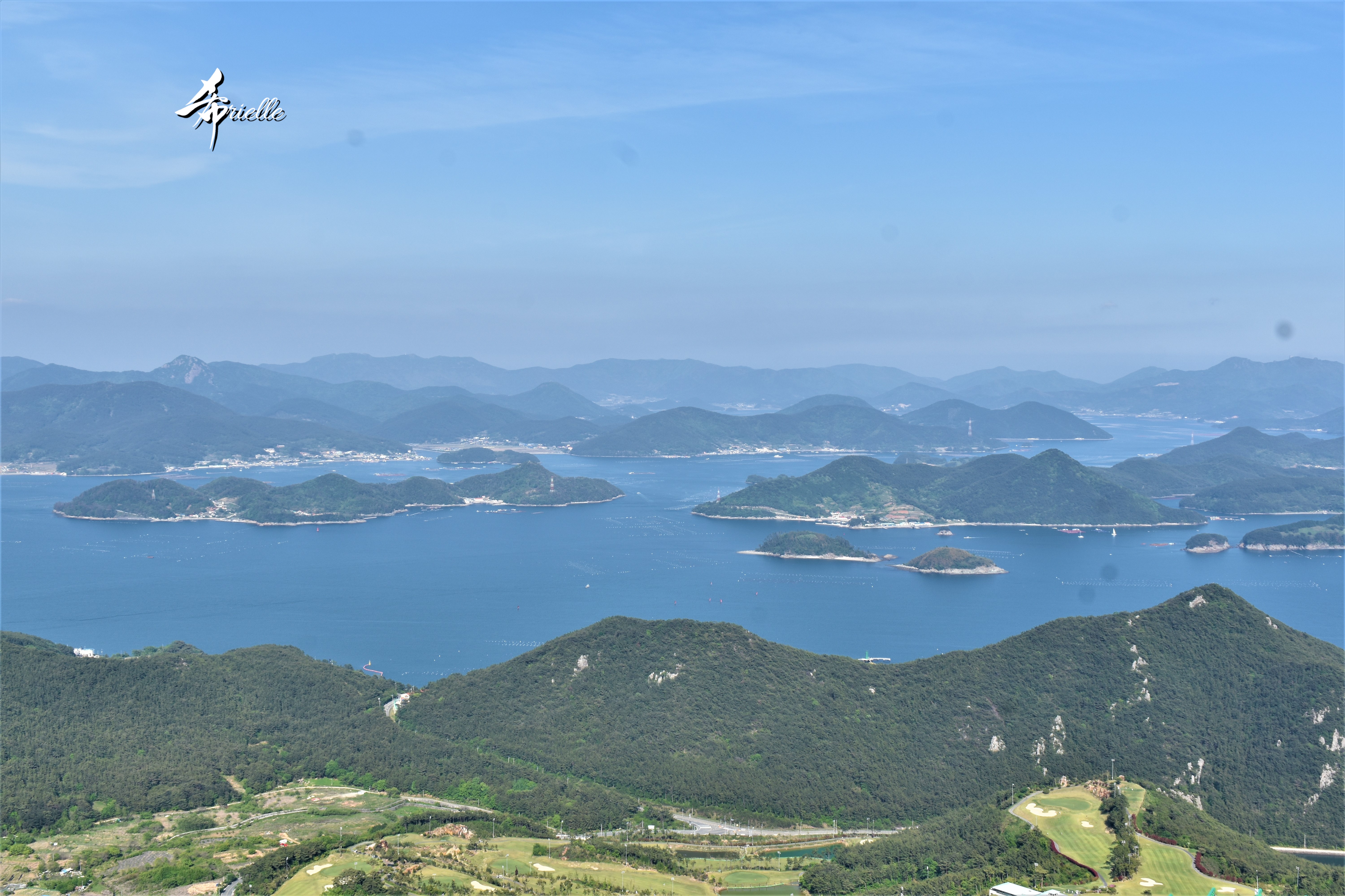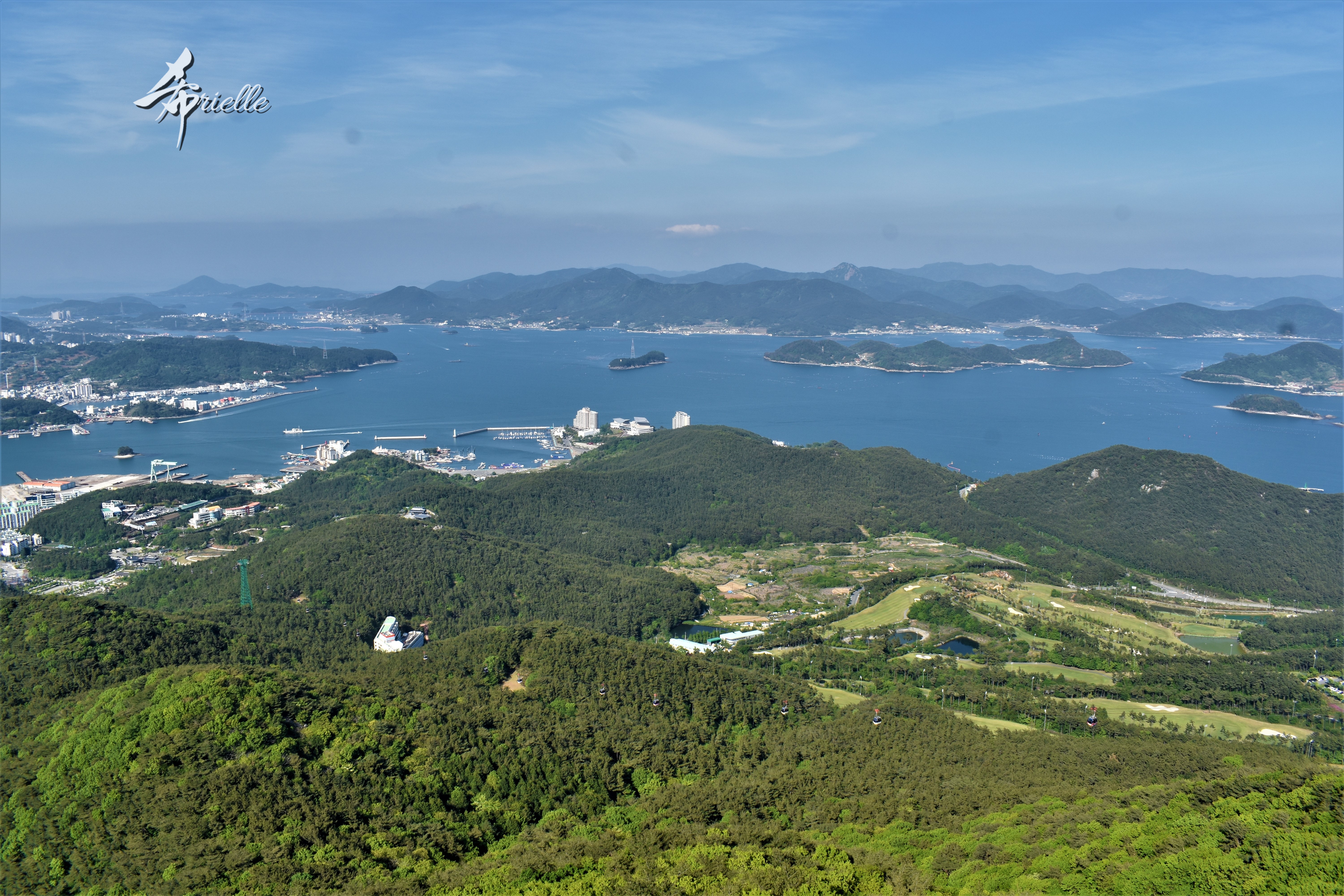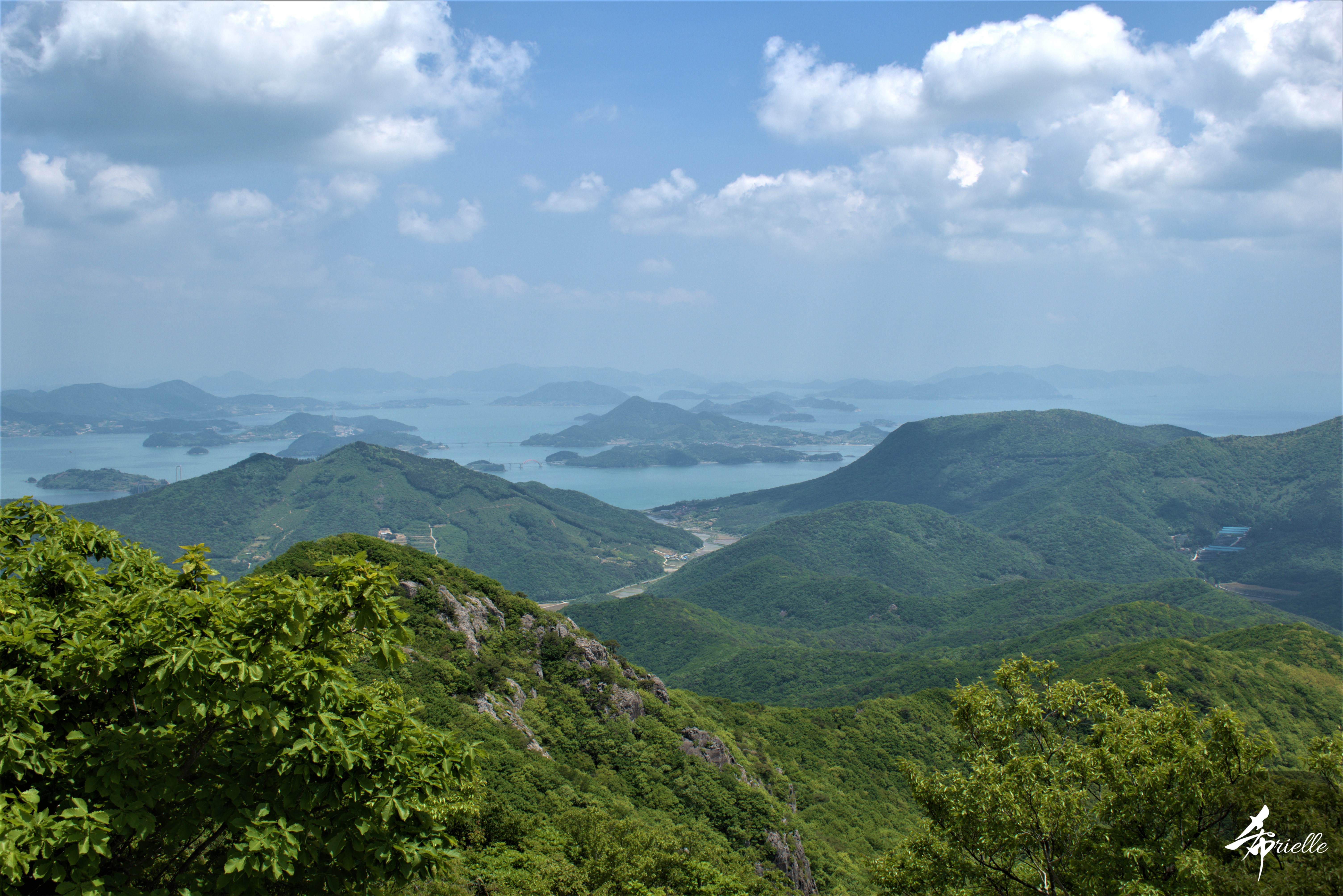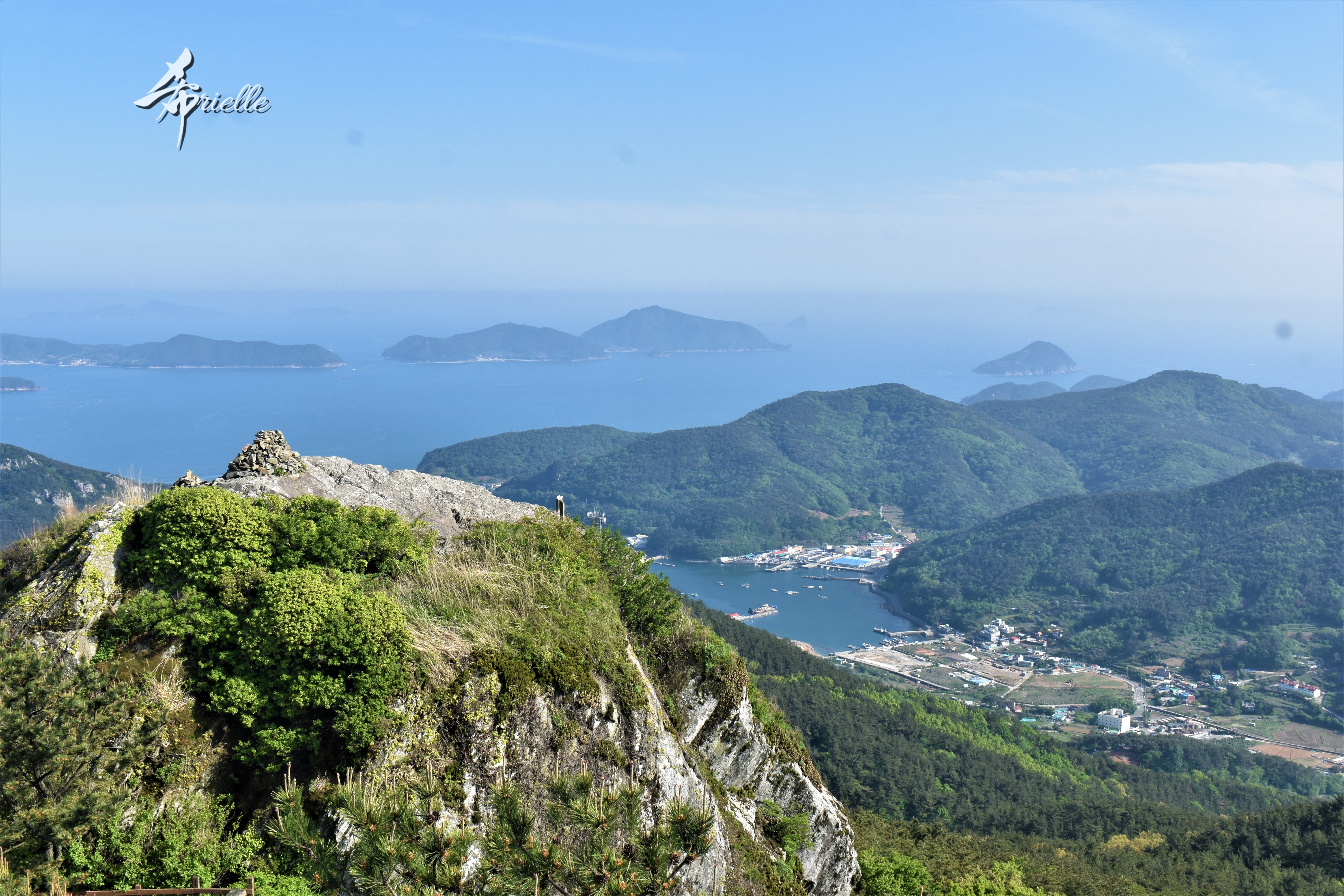 Etant donné que je passe la plupart de mon temps libre soit à la montagne, soit au bord de l’océan, on me demande souvent lequel des deux je préfère. Et bien, honnêtement c’est très difficile à dire mais je crois que là où je me sens le mieux, c’est au sommet d’une montagne offrant une vue sur l’océan. Que ce soit après une randonnée à pieds ou en vélo, il n’y a rien que j’aime plus que le fait de pouvoir finir la journée dans l’eau. Ainsi, l’une des villes où j’aime le plus marcher en Corée, est Tongyeong. Cette ville portuaire, montagneuse est constituée de plusieurs îles accessibles par bateau. Ces trois dernières années, j’ai eu l’occasion de faire le tour de la plupart de ces îles : Bijin, Saryang, Maemul, Seomaemul, Yokji, Suu … Les articles viendront si j’arrive à me tenir à la résolution de publier « plus souvent ». Oui, j’avoue ce n’est pas très précis ni très exigeant comme résolution ! Bref, cette année, j’avais donc envie de rejoindre le sommet de la montagne à Tongyeong qui n’est pas sur une île et ne nécessite donc pas de promenade en bateau. Ainsi, fin avril, j’ai pris le bus jusque là-bas puis un taxi pour rejoindre l’un des temples situés au pied du Mont Mireuk et d’où commence un sentier de randonnée. Encore une fois, il faisait tellement beau que la vue était superbe, en tons de bleu sur bleu. J’étais partie seule donc j’ai pris le temps de prendre toutes les photos que je voulais et profiter de la vue au sommet. Ce jour-là je n’ai pas croisé beaucoup d’autres marcheurs et je crois même que c’est le sentier le plus propre sur lequel j’ai jamais marché. Au sommet, comme le veut la tradition, le peu de personnes présentes, faisaient des photos avec la pierre indiquant le nom et l’altitude du pic. J’avais prévu mon trépied pour en prendre une aussi mais un promeneur venu avec un groupe, qui venait de faire plus d’une quinzaine de photos de ses amis, m’a dit qu’il était photographe et a insisté pour prendre la mienne. Je l’ai donc laissé faire et le résultat était plutôt convaincant. C’est agréable de discuter avec les gens en montagne parce qu’en général, ils sont souriants et sympathiques. Il faut dire qu’il est difficile de ne pas être de bonne humeur, face à la beauté des paysages ! Pour ceux qui le souhaitent, une ligne de cabines téléfériques fait aussi l’aller-retour du port au sommet. Pour ma part, j’ai particulièrement apprécié, une oeuvre d’art installée sur un belvédère offrant une vue vers l’est et sur l’île de Geoje. Il s’agissait d’une sculpture en métal du profil d’une femme regardant au loin. Ce n’est pas la première oeuvre de ce genre que je croise dans la région mais à et endroit, je ne m’y attendais vraiment pas et je l’ai trouvée absolument magnifique !