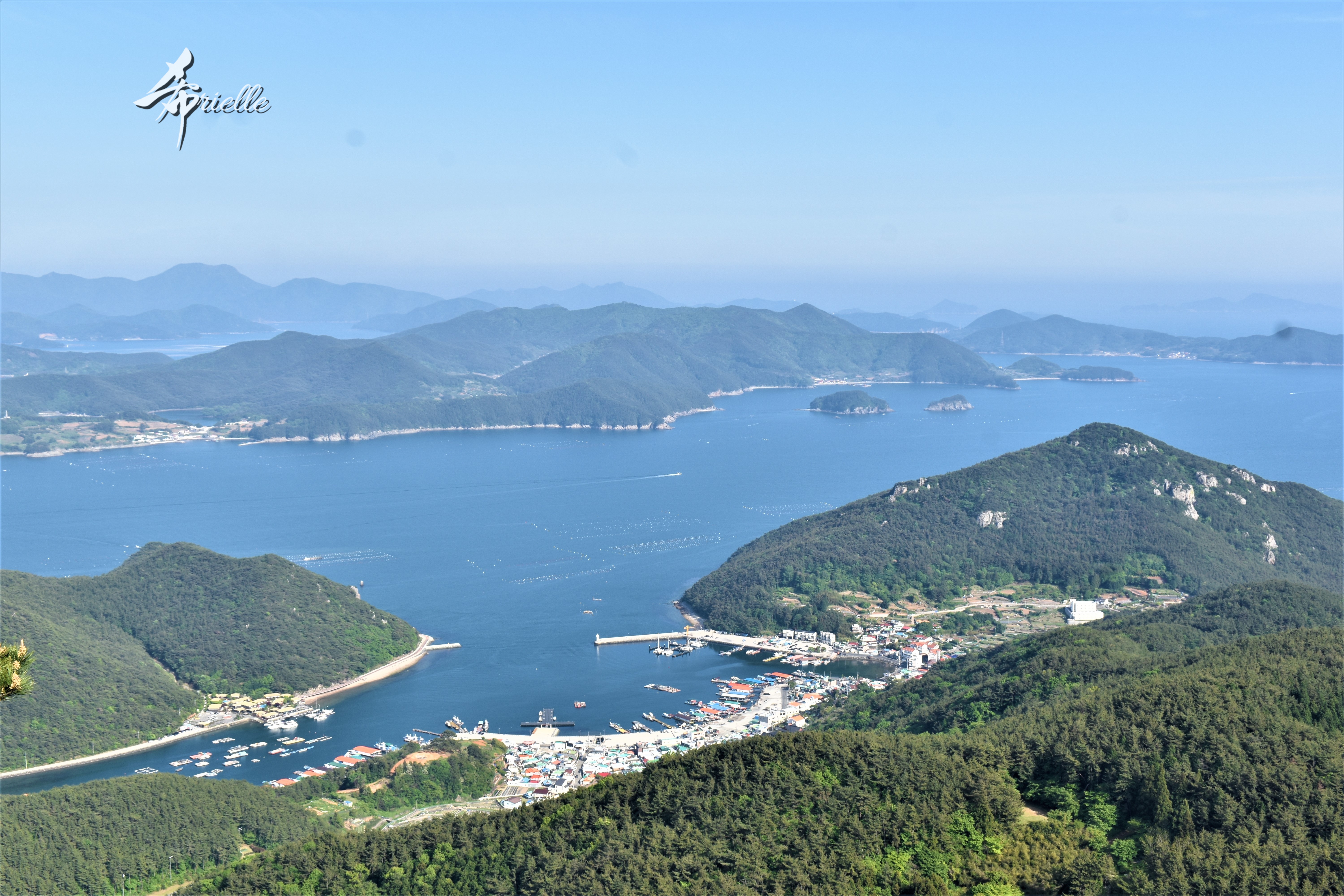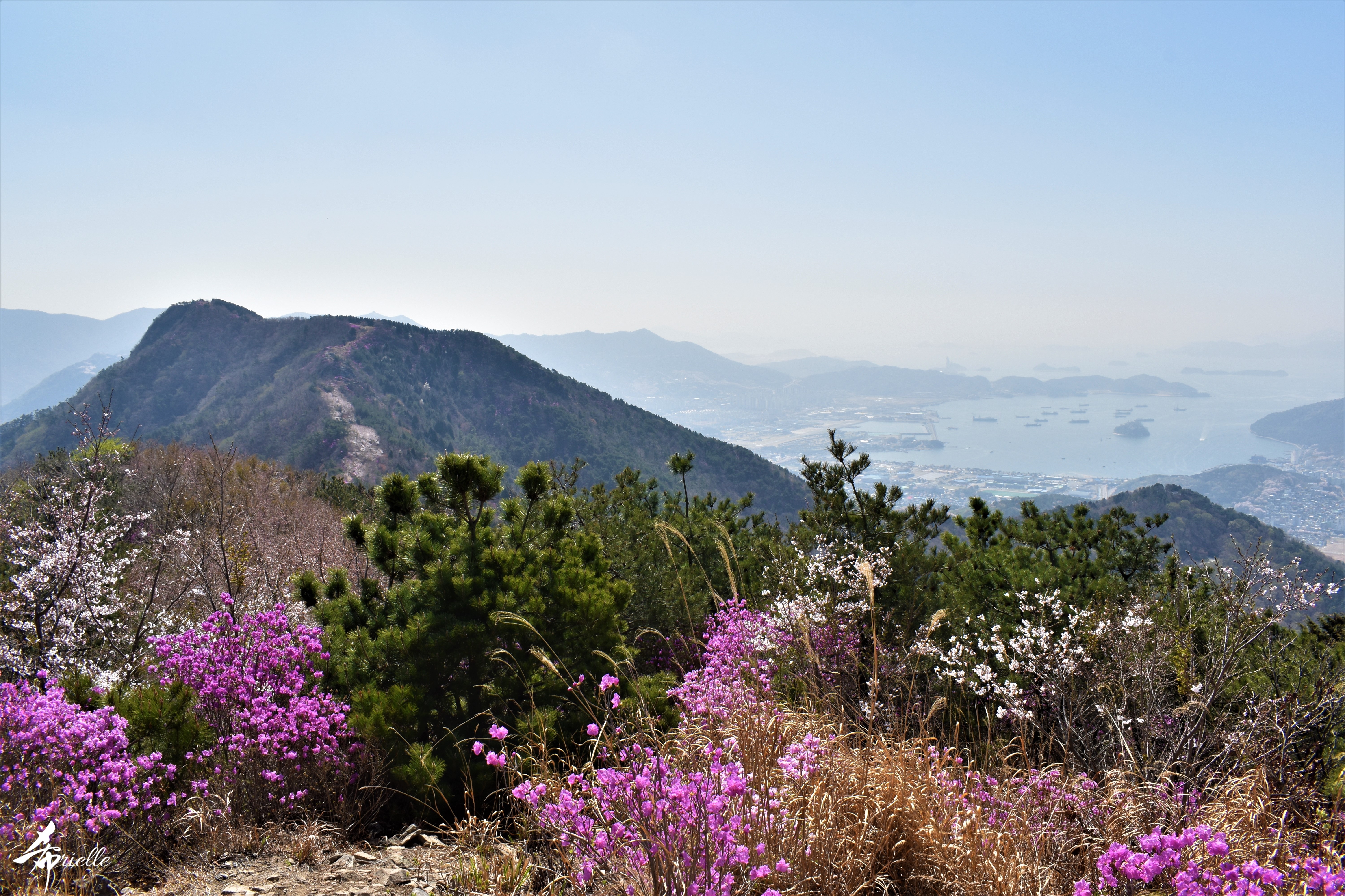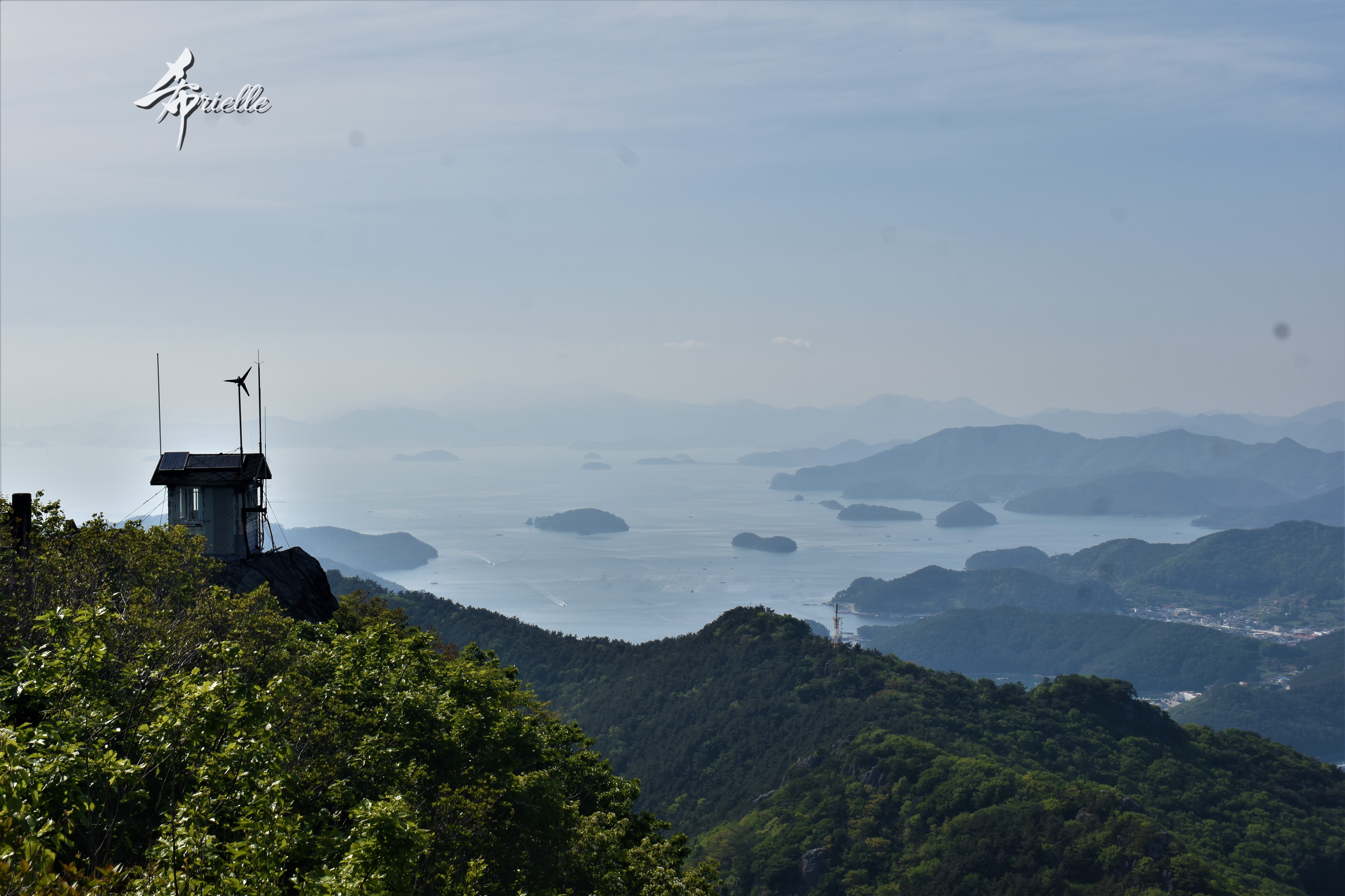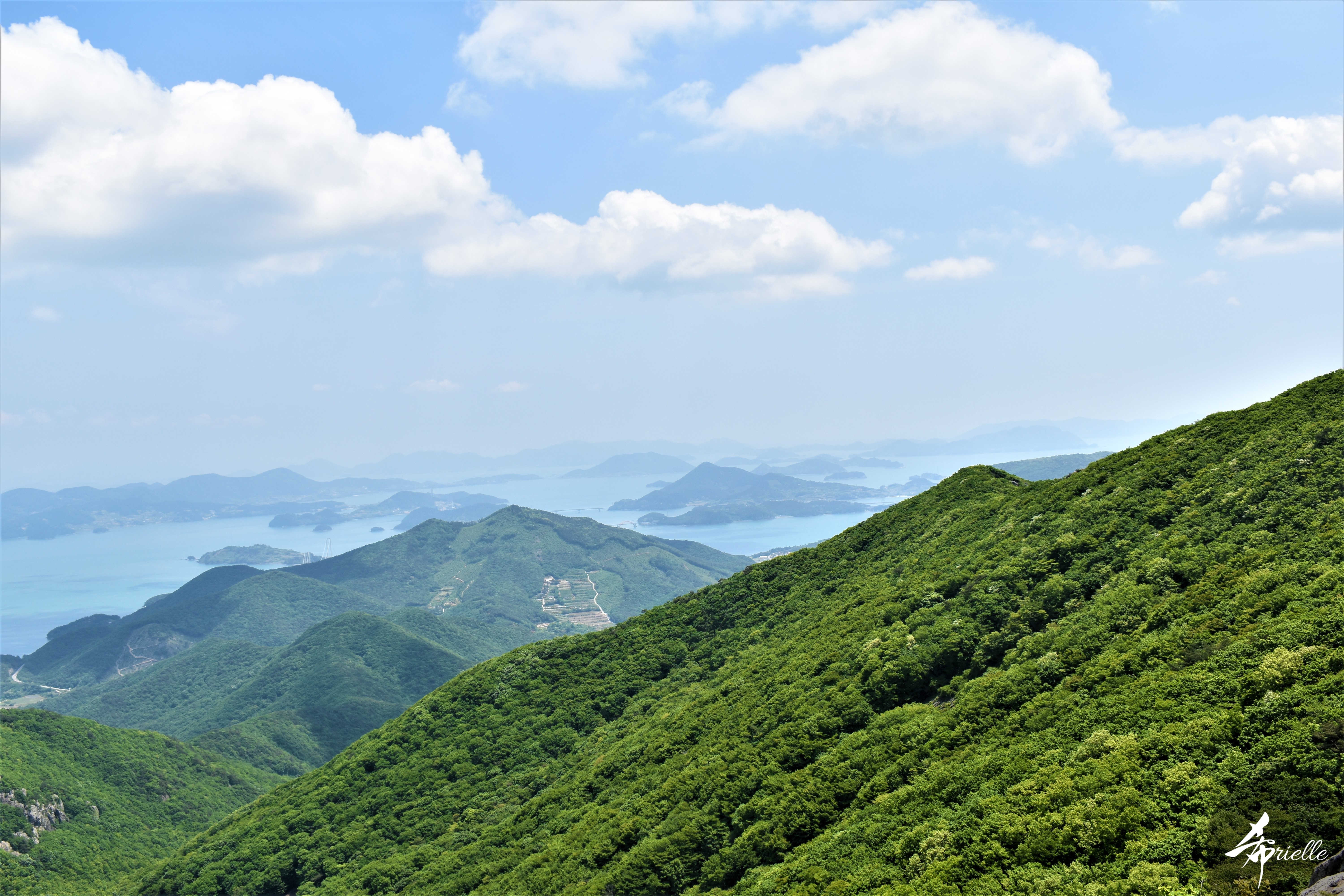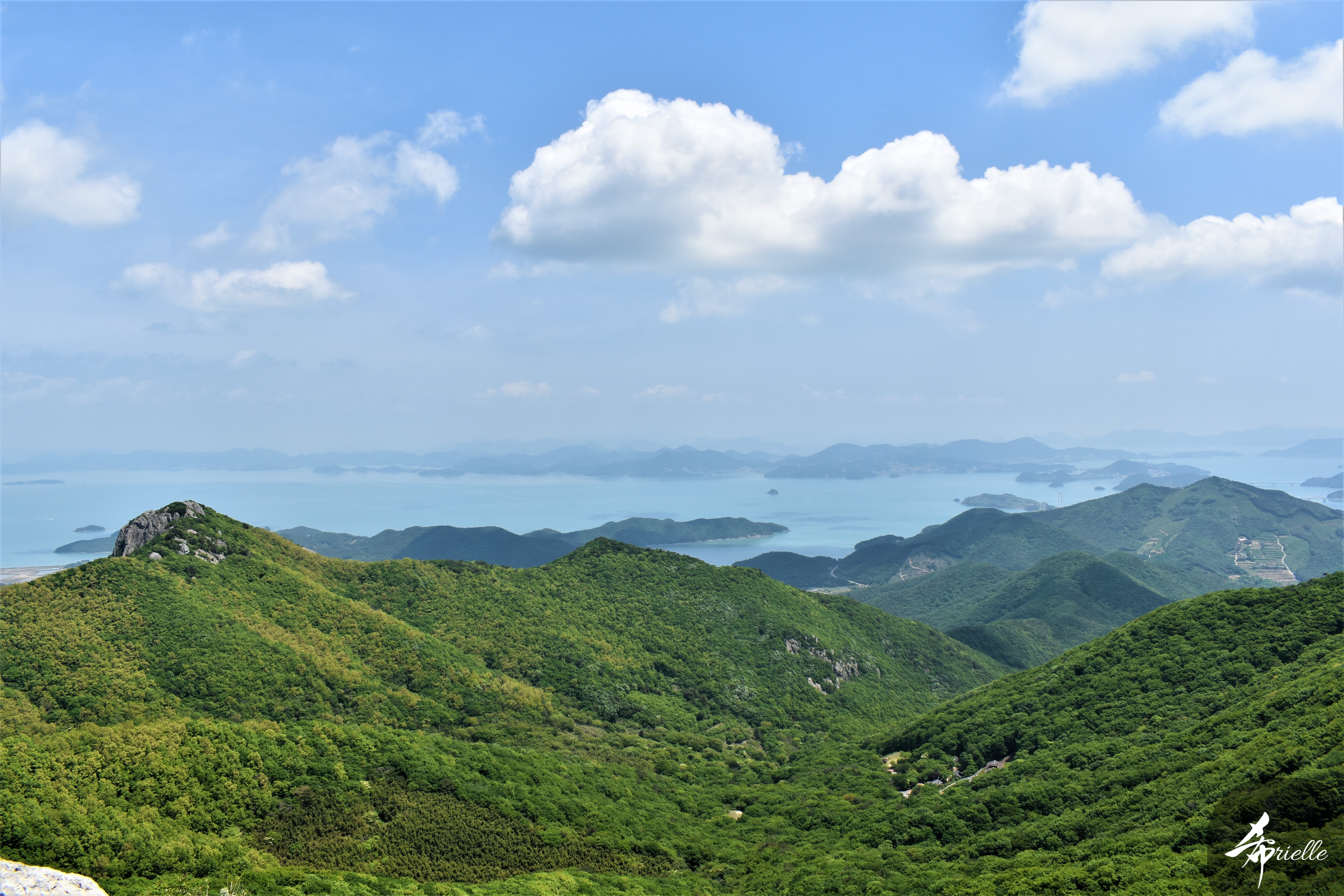 Etant donné que je passe la plupart de mon temps libre soit à la montagne, soit au bord de l’océan, on me demande souvent lequel des deux je préfère. Et bien, honnêtement c’est très difficile à dire mais je crois que là où je me sens le mieux, c’est au sommet d’une montagne offrant une vue sur l’océan. Que ce soit après une randonnée à pieds ou en vélo, il n’y a rien que j’aime plus que le fait de pouvoir finir la journée dans l’eau. Ainsi, l’une des villes où j’aime le plus marcher en Corée, est Tongyeong. Cette ville portuaire, montagneuse est constituée de plusieurs îles accessibles par bateau. Ces trois dernières années, j’ai eu l’occasion de faire le tour de la plupart de ces îles : Bijin, Saryang, Maemul, Seomaemul, Yokji, Suu … Les articles viendront si j’arrive à me tenir à la résolution de publier « plus souvent ». Oui, j’avoue ce n’est pas très précis ni très exigeant comme résolution ! Bref, cette année, j’avais donc envie de rejoindre le sommet de la montagne à Tongyeong qui n’est pas sur une île et ne nécessite donc pas de promenade en bateau. Ainsi, fin avril, j’ai pris le bus jusque là-bas puis un taxi pour rejoindre l’un des temples situés au pied du Mont Mireuk et d’où commence un sentier de randonnée. Encore une fois, il faisait tellement beau que la vue était superbe, en tons de bleu sur bleu. J’étais partie seule donc j’ai pris le temps de prendre toutes les photos que je voulais et profiter de la vue au sommet. Ce jour-là je n’ai pas croisé beaucoup d’autres marcheurs et je crois même que c’est le sentier le plus propre sur lequel j’ai jamais marché. Au sommet, comme le veut la tradition, le peu de personnes présentes, faisaient des photos avec la pierre indiquant le nom et l’altitude du pic. J’avais prévu mon trépied pour en prendre une aussi mais un promeneur venu avec un groupe, qui venait de faire plus d’une quinzaine de photos de ses amis, m’a dit qu’il était photographe et a insisté pour prendre la mienne. Je l’ai donc laissé faire et le résultat était plutôt convaincant. C’est agréable de discuter avec les gens en montagne parce qu’en général, ils sont souriants et sympathiques. Il faut dire qu’il est difficile de ne pas être de bonne humeur, face à la beauté des paysages ! Pour ceux qui le souhaitent, une ligne de cabines téléfériques fait aussi l’aller-retour du port au sommet. Pour ma part, j’ai particulièrement apprécié, une oeuvre d’art installée sur un belvédère offrant une vue vers l’est et sur l’île de Geoje. Il s’agissait d’une sculpture en métal du profil d’une femme regardant au loin. Ce n’est pas la première oeuvre de ce genre que je croise dans la région mais à et endroit, je ne m’y attendais vraiment pas et je l’ai trouvée absolument magnifique !