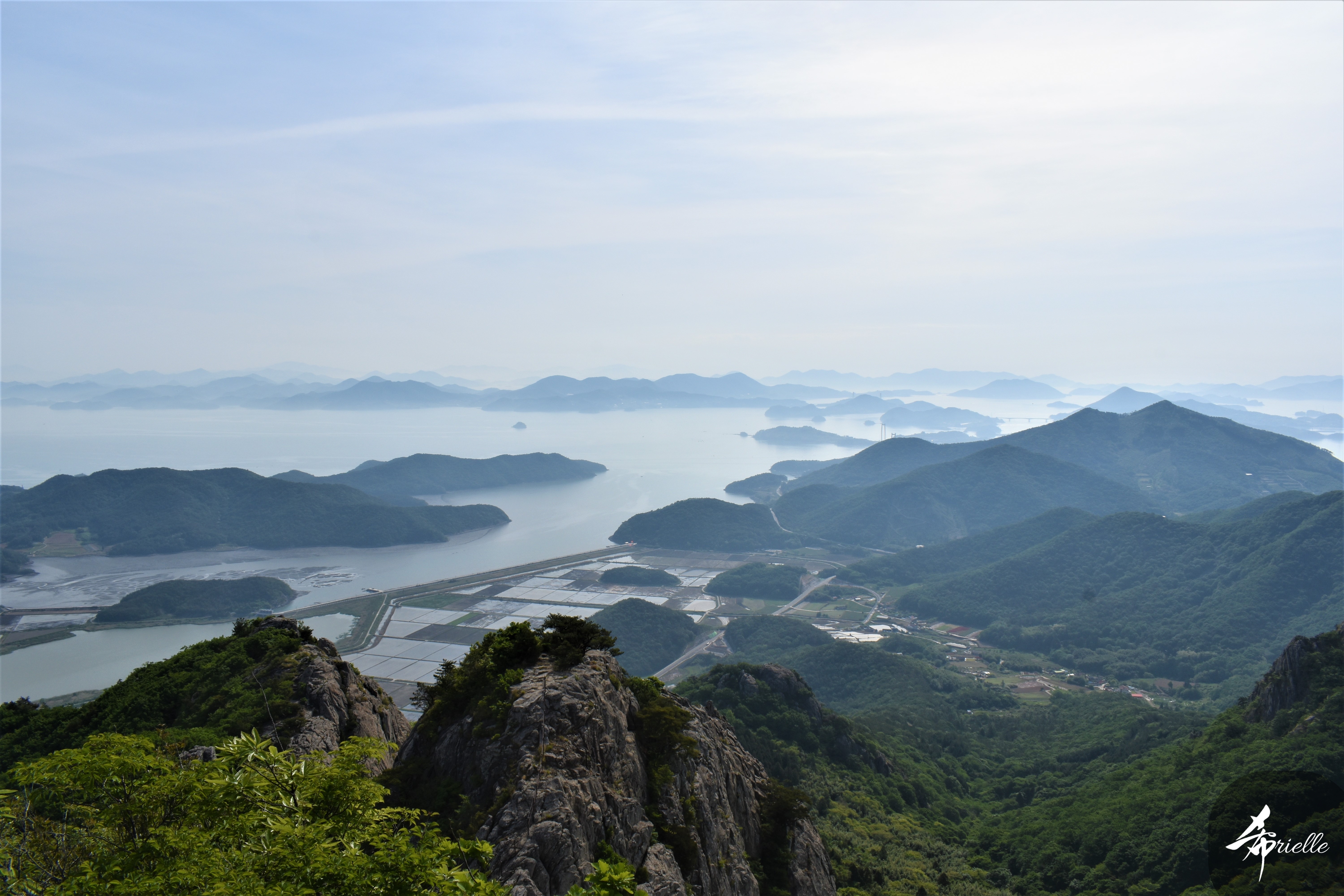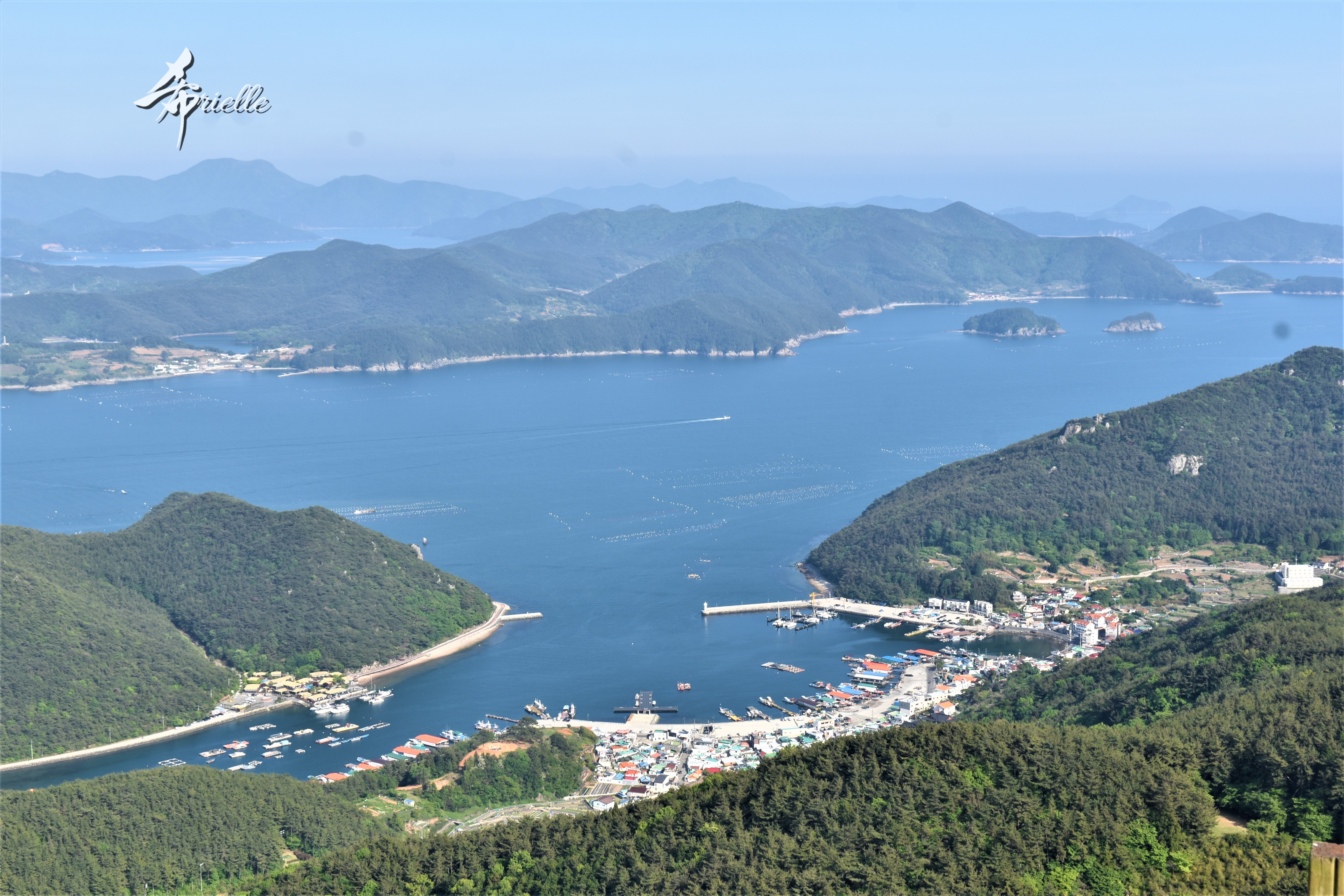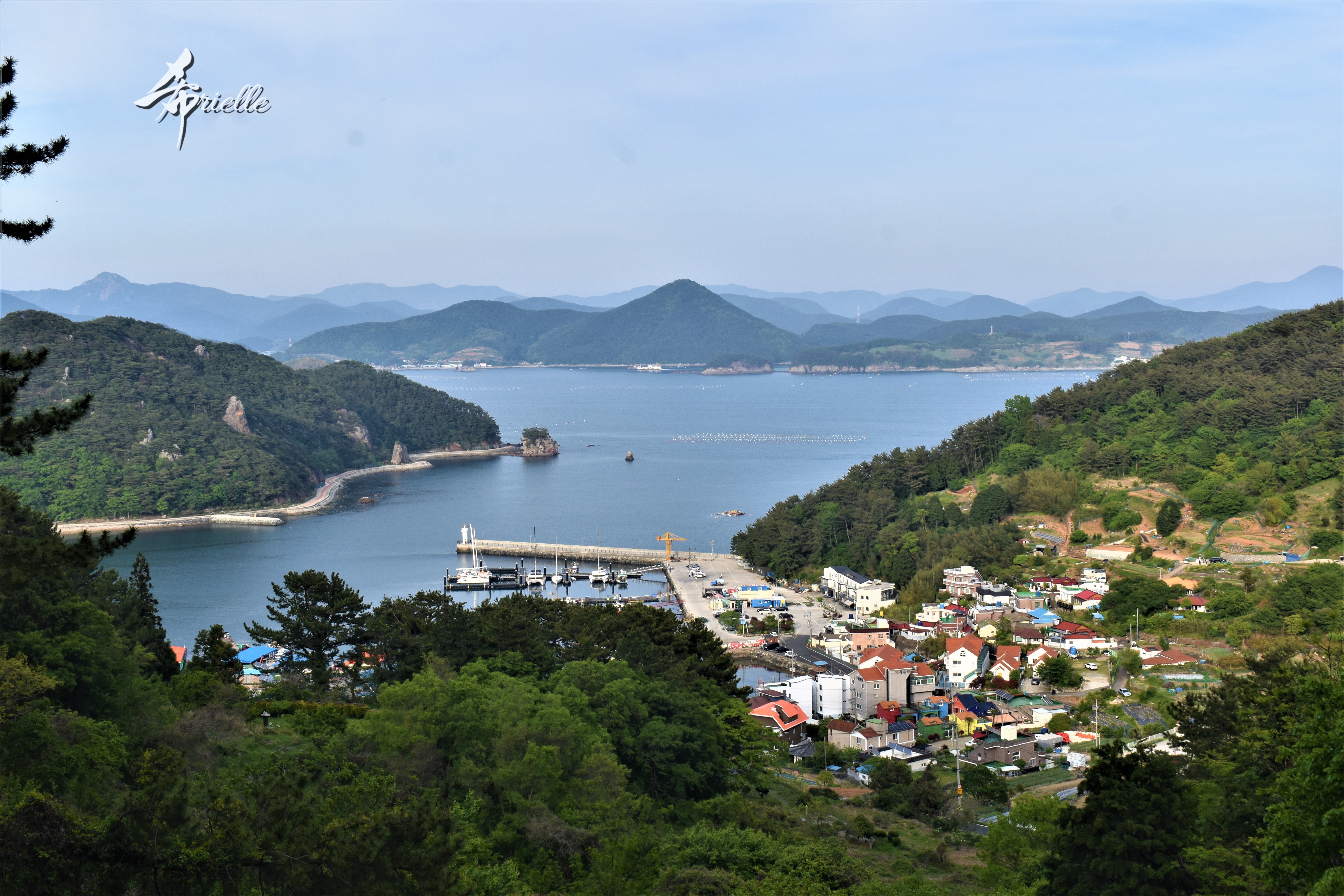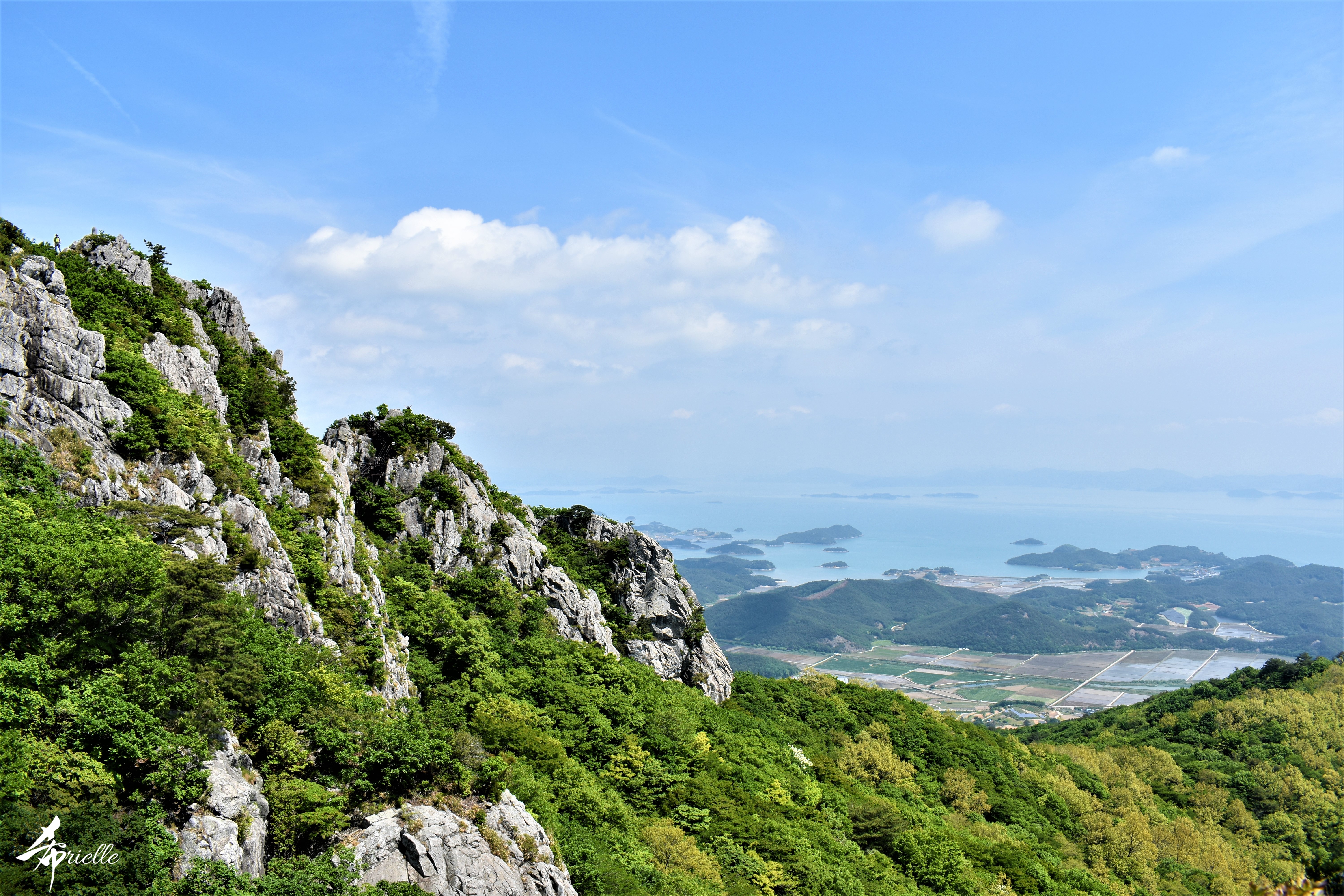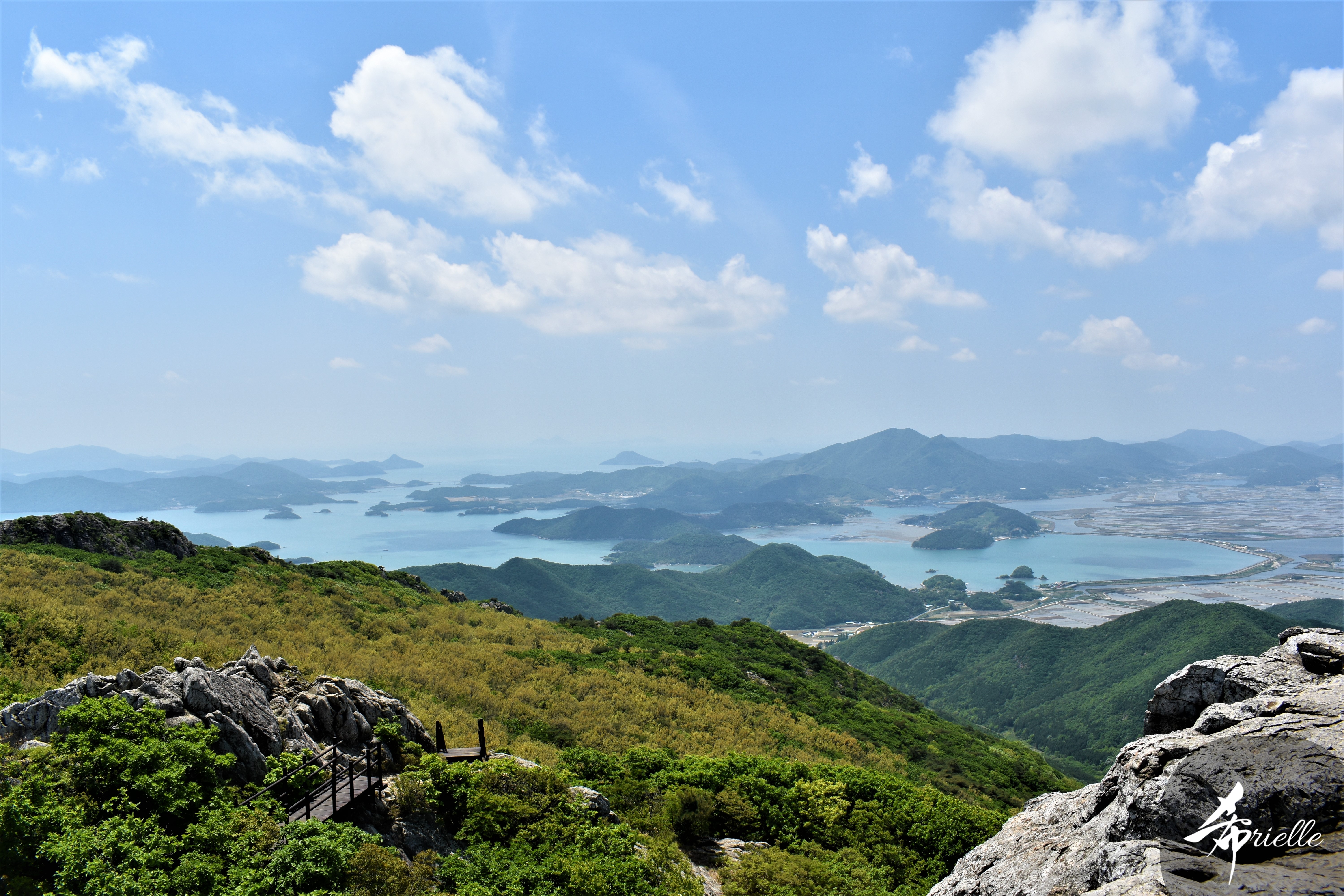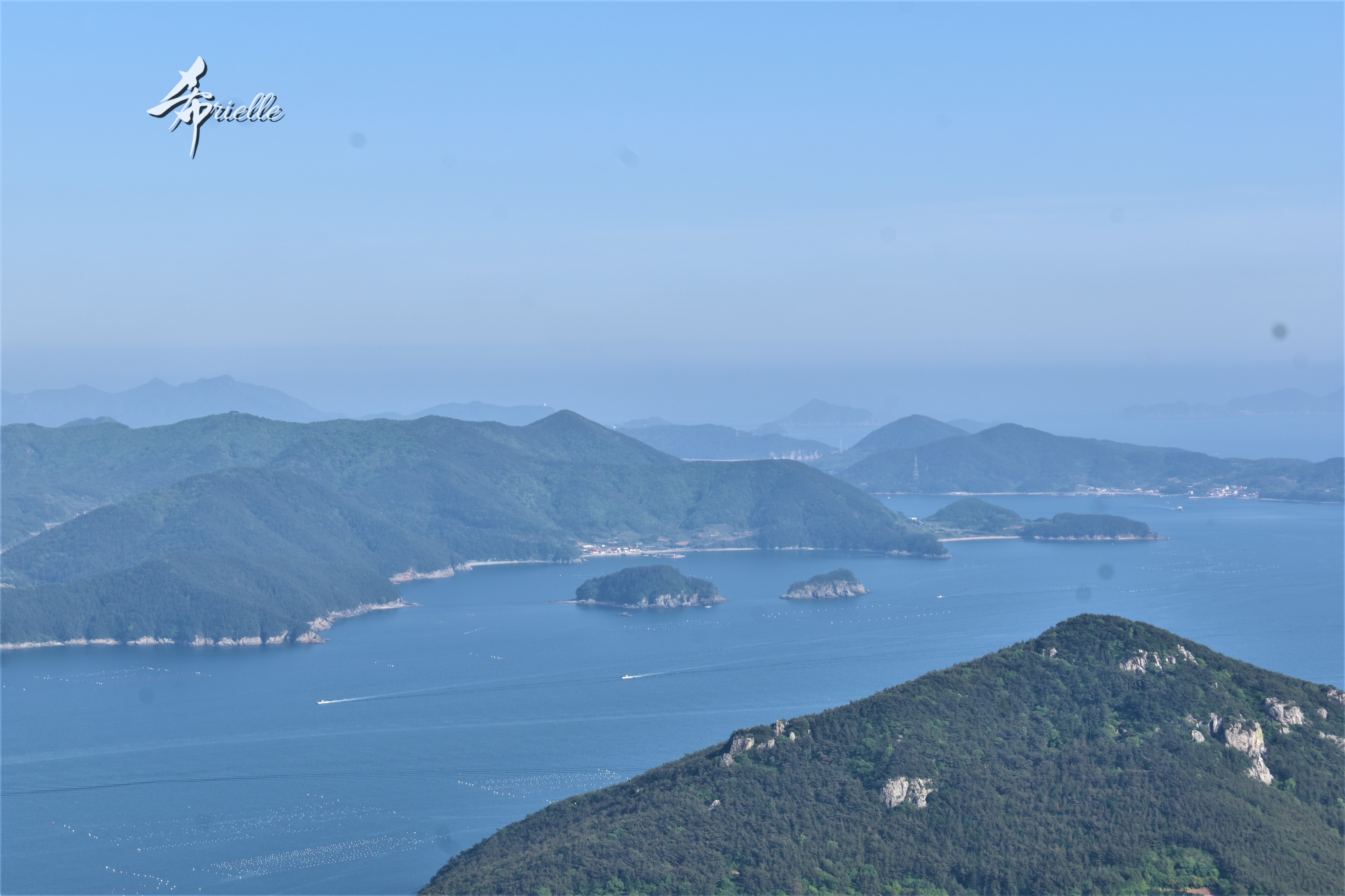 Etant donné que je passe la plupart de mon temps libre soit à la montagne, soit au bord de l’océan, on me demande souvent lequel des deux je préfère. Et bien, honnêtement c’est très difficile à dire mais je crois que là où je me sens le mieux, c’est au sommet d’une montagne offrant une vue sur l’océan. Que ce soit après une randonnée à pieds ou en vélo, il n’y a rien que j’aime plus que le fait de pouvoir finir la journée dans l’eau. Ainsi, l’une des villes où j’aime le plus marcher en Corée, est Tongyeong. Cette ville portuaire, montagneuse est constituée de plusieurs îles accessibles par bateau. Ces trois dernières années, j’ai eu l’occasion de faire le tour de la plupart de ces îles : Bijin, Saryang, Maemul, Seomaemul, Yokji, Suu … Les articles viendront si j’arrive à me tenir à la résolution de publier « plus souvent ». Oui, j’avoue ce n’est pas très précis ni très exigeant comme résolution ! Bref, cette année, j’avais donc envie de rejoindre le sommet de la montagne à Tongyeong qui n’est pas sur une île et ne nécessite donc pas de promenade en bateau. Ainsi, fin avril, j’ai pris le bus jusque là-bas puis un taxi pour rejoindre l’un des temples situés au pied du Mont Mireuk et d’où commence un sentier de randonnée. Encore une fois, il faisait tellement beau que la vue était superbe, en tons de bleu sur bleu. J’étais partie seule donc j’ai pris le temps de prendre toutes les photos que je voulais et profiter de la vue au sommet. Ce jour-là je n’ai pas croisé beaucoup d’autres marcheurs et je crois même que c’est le sentier le plus propre sur lequel j’ai jamais marché. Au sommet, comme le veut la tradition, le peu de personnes présentes, faisaient des photos avec la pierre indiquant le nom et l’altitude du pic. J’avais prévu mon trépied pour en prendre une aussi mais un promeneur venu avec un groupe, qui venait de faire plus d’une quinzaine de photos de ses amis, m’a dit qu’il était photographe et a insisté pour prendre la mienne. Je l’ai donc laissé faire et le résultat était plutôt convaincant. C’est agréable de discuter avec les gens en montagne parce qu’en général, ils sont souriants et sympathiques. Il faut dire qu’il est difficile de ne pas être de bonne humeur, face à la beauté des paysages ! Pour ceux qui le souhaitent, une ligne de cabines téléfériques fait aussi l’aller-retour du port au sommet. Pour ma part, j’ai particulièrement apprécié, une oeuvre d’art installée sur un belvédère offrant une vue vers l’est et sur l’île de Geoje. Il s’agissait d’une sculpture en métal du profil d’une femme regardant au loin. Ce n’est pas la première oeuvre de ce genre que je croise dans la région mais à et endroit, je ne m’y attendais vraiment pas et je l’ai trouvée absolument magnifique !