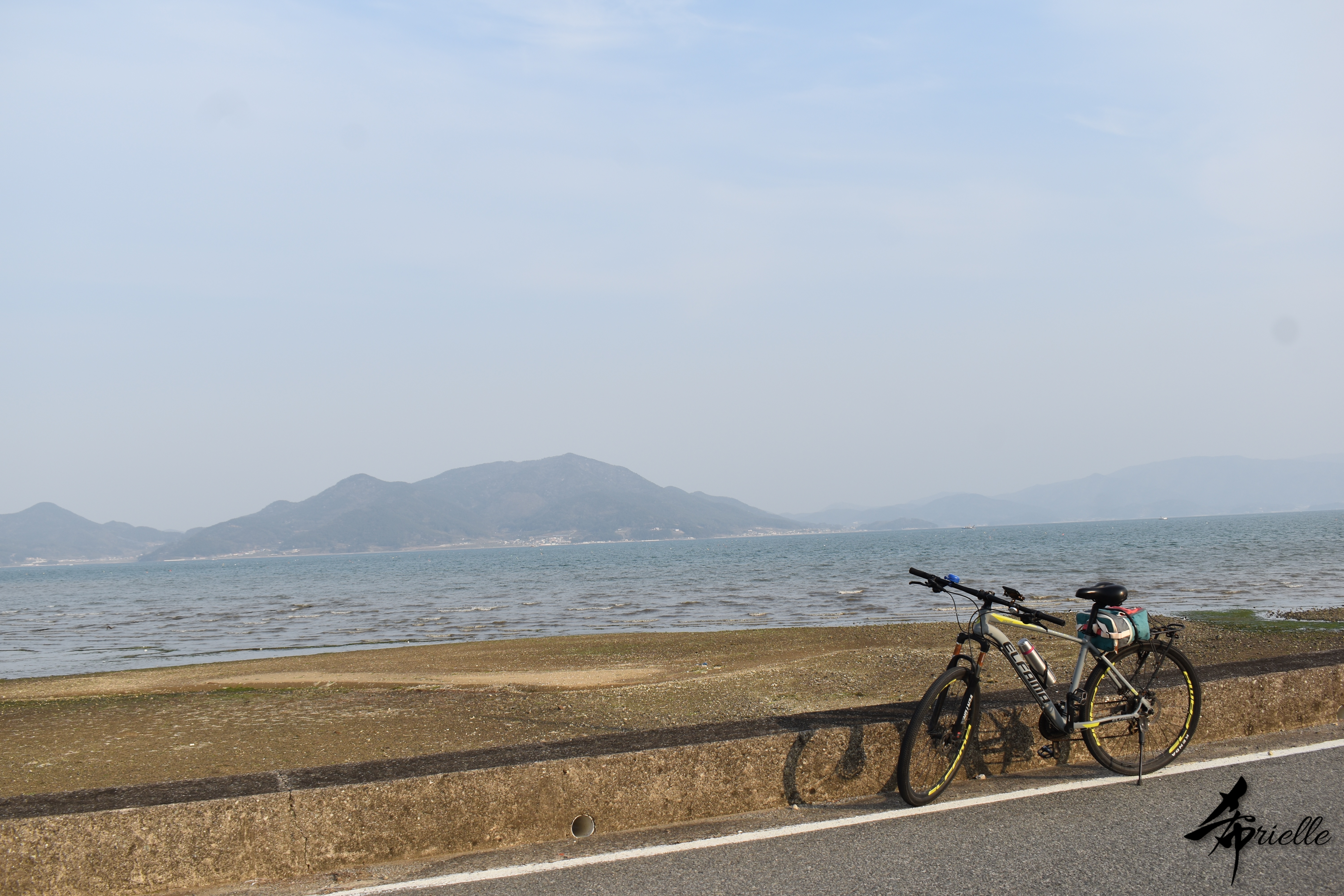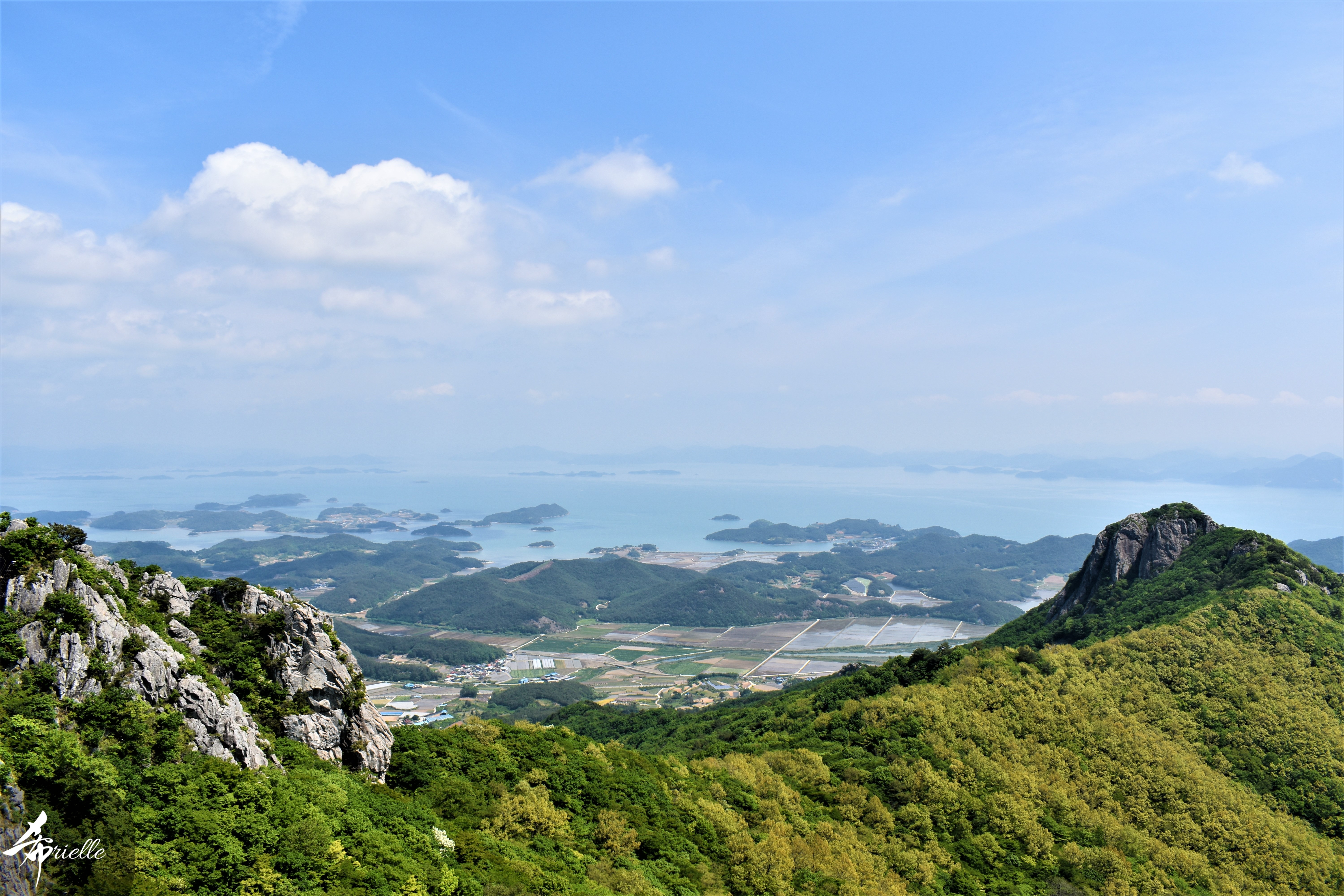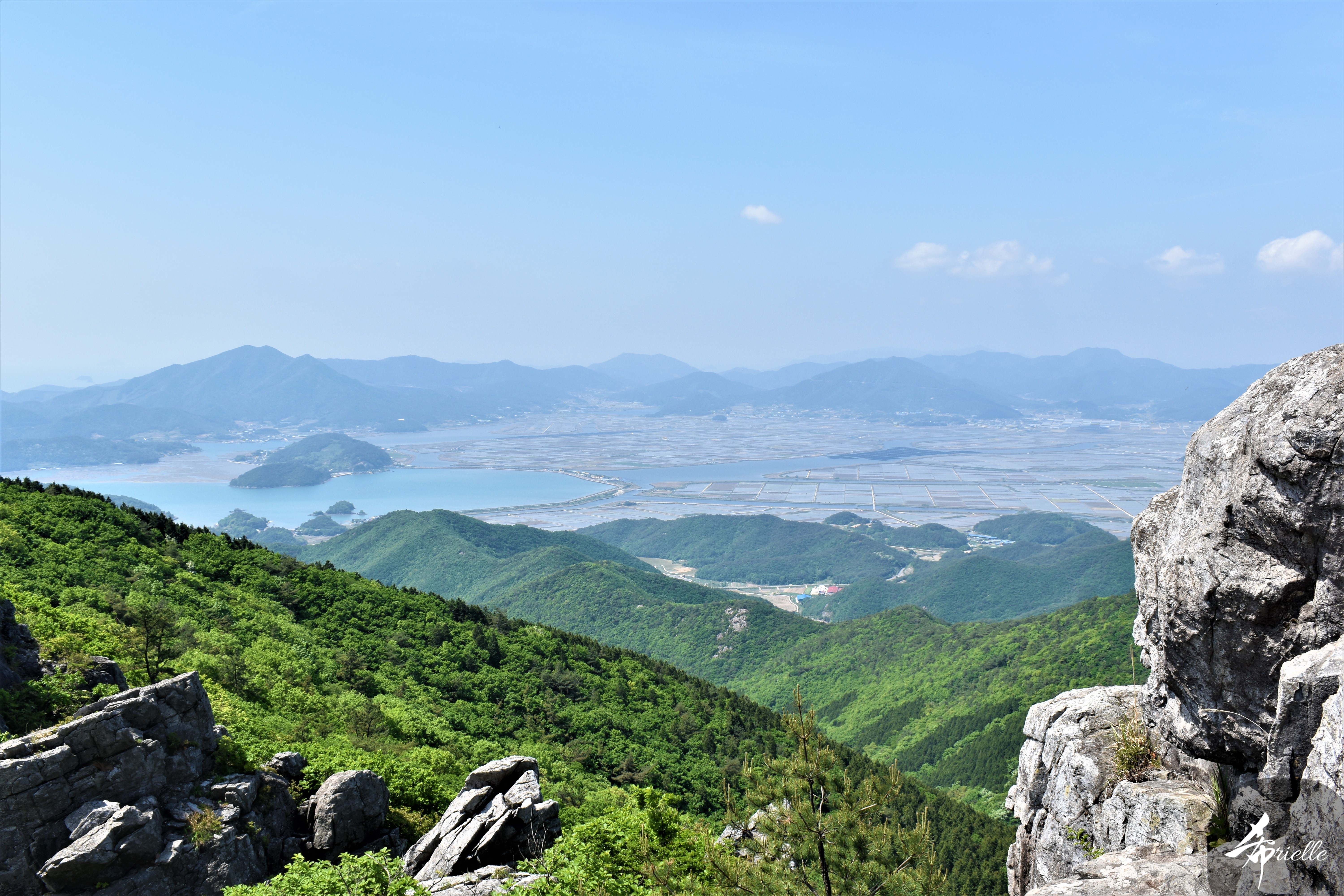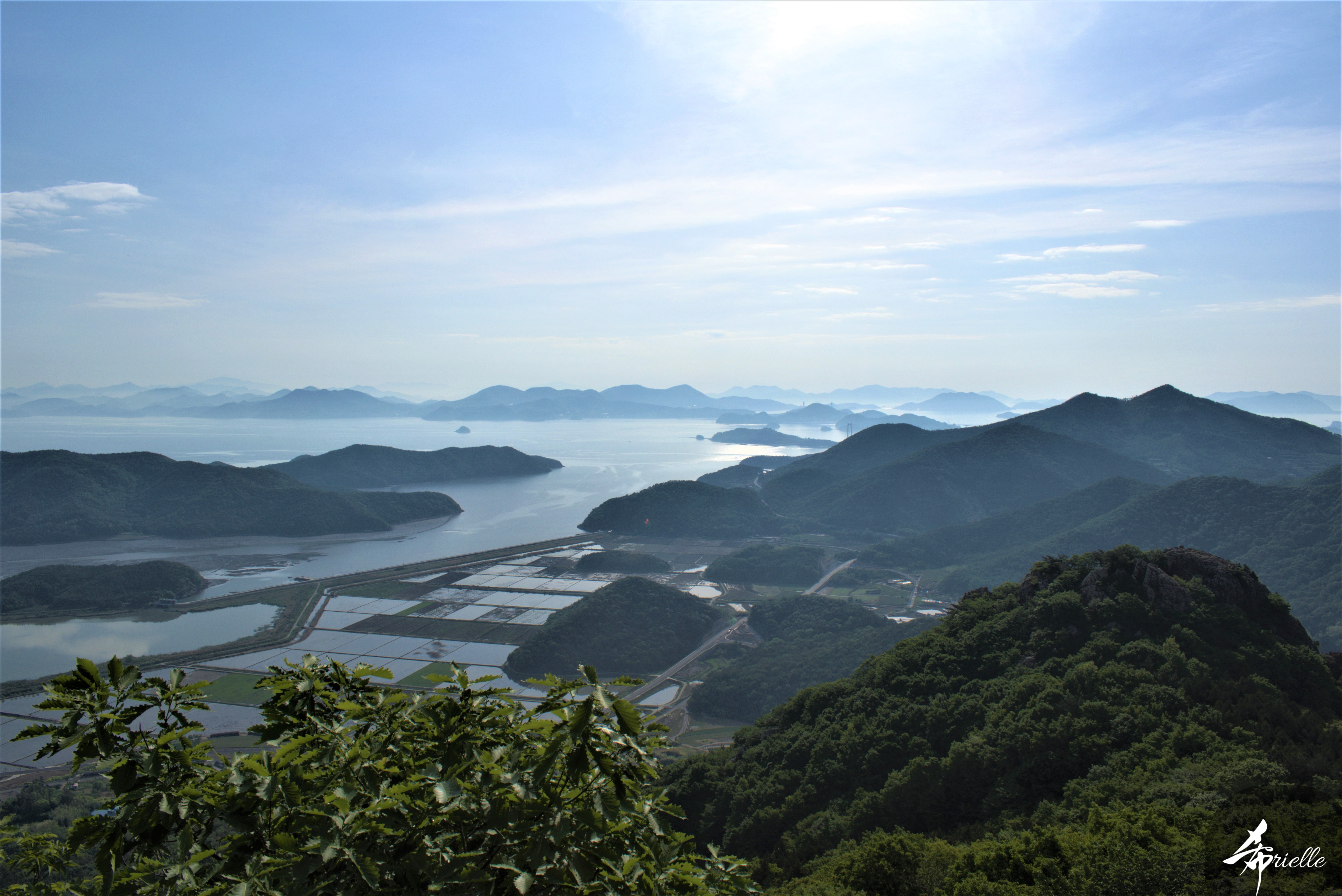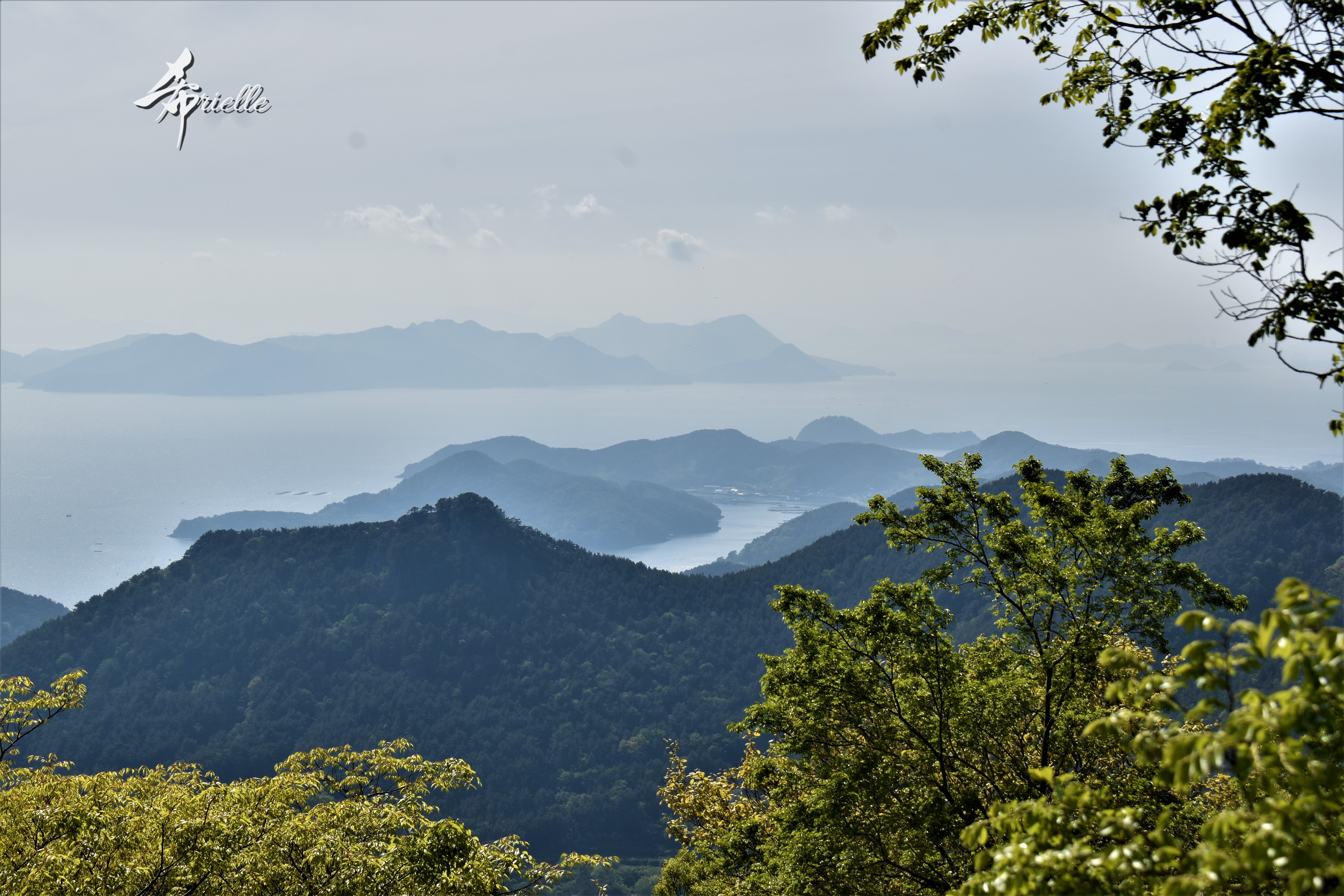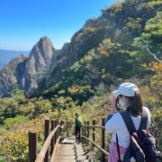 Etant donné que je passe la plupart de mon temps libre soit à la montagne, soit au bord de l’océan, on me demande souvent lequel des deux je préfère. Et bien, honnêtement c’est très difficile à dire mais je crois que là où je me sens le mieux, c’est au sommet d’une montagne offrant une vue sur l’océan. Que ce soit après une randonnée à pieds ou en vélo, il n’y a rien que j’aime plus que le fait de pouvoir finir la journée dans l’eau. Ainsi, l’une des villes où j’aime le plus marcher en Corée, est Tongyeong. Cette ville portuaire, montagneuse est constituée de plusieurs îles accessibles par bateau. Ces trois dernières années, j’ai eu l’occasion de faire le tour de la plupart de ces îles : Bijin, Saryang, Maemul, Seomaemul, Yokji, Suu … Les articles viendront si j’arrive à me tenir à la résolution de publier « plus souvent ». Oui, j’avoue ce n’est pas très précis ni très exigeant comme résolution ! Bref, cette année, j’avais donc envie de rejoindre le sommet de la montagne à Tongyeong qui n’est pas sur une île et ne nécessite donc pas de promenade en bateau. Ainsi, fin avril, j’ai pris le bus jusque là-bas puis un taxi pour rejoindre l’un des temples situés au pied du Mont Mireuk et d’où commence un sentier de randonnée. Encore une fois, il faisait tellement beau que la vue était superbe, en tons de bleu sur bleu. J’étais partie seule donc j’ai pris le temps de prendre toutes les photos que je voulais et profiter de la vue au sommet. Ce jour-là je n’ai pas croisé beaucoup d’autres marcheurs et je crois même que c’est le sentier le plus propre sur lequel j’ai jamais marché. Au sommet, comme le veut la tradition, le peu de personnes présentes, faisaient des photos avec la pierre indiquant le nom et l’altitude du pic. J’avais prévu mon trépied pour en prendre une aussi mais un promeneur venu avec un groupe, qui venait de faire plus d’une quinzaine de photos de ses amis, m’a dit qu’il était photographe et a insisté pour prendre la mienne. Je l’ai donc laissé faire et le résultat était plutôt convaincant. C’est agréable de discuter avec les gens en montagne parce qu’en général, ils sont souriants et sympathiques. Il faut dire qu’il est difficile de ne pas être de bonne humeur, face à la beauté des paysages ! Pour ceux qui le souhaitent, une ligne de cabines téléfériques fait aussi l’aller-retour du port au sommet. Pour ma part, j’ai particulièrement apprécié, une oeuvre d’art installée sur un belvédère offrant une vue vers l’est et sur l’île de Geoje. Il s’agissait d’une sculpture en métal du profil d’une femme regardant au loin. Ce n’est pas la première oeuvre de ce genre que je croise dans la région mais à et endroit, je ne m’y attendais vraiment pas et je l’ai trouvée absolument magnifique !