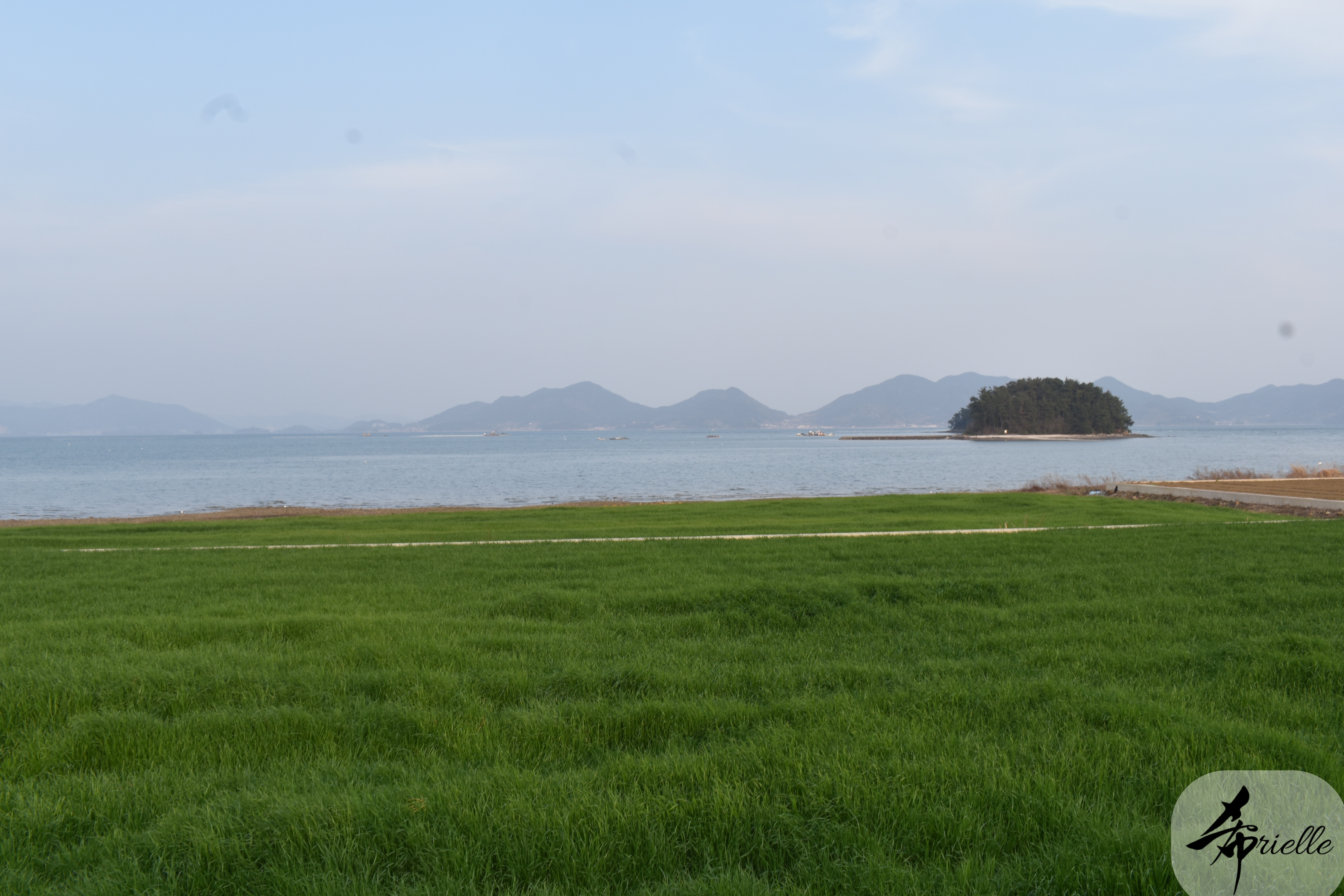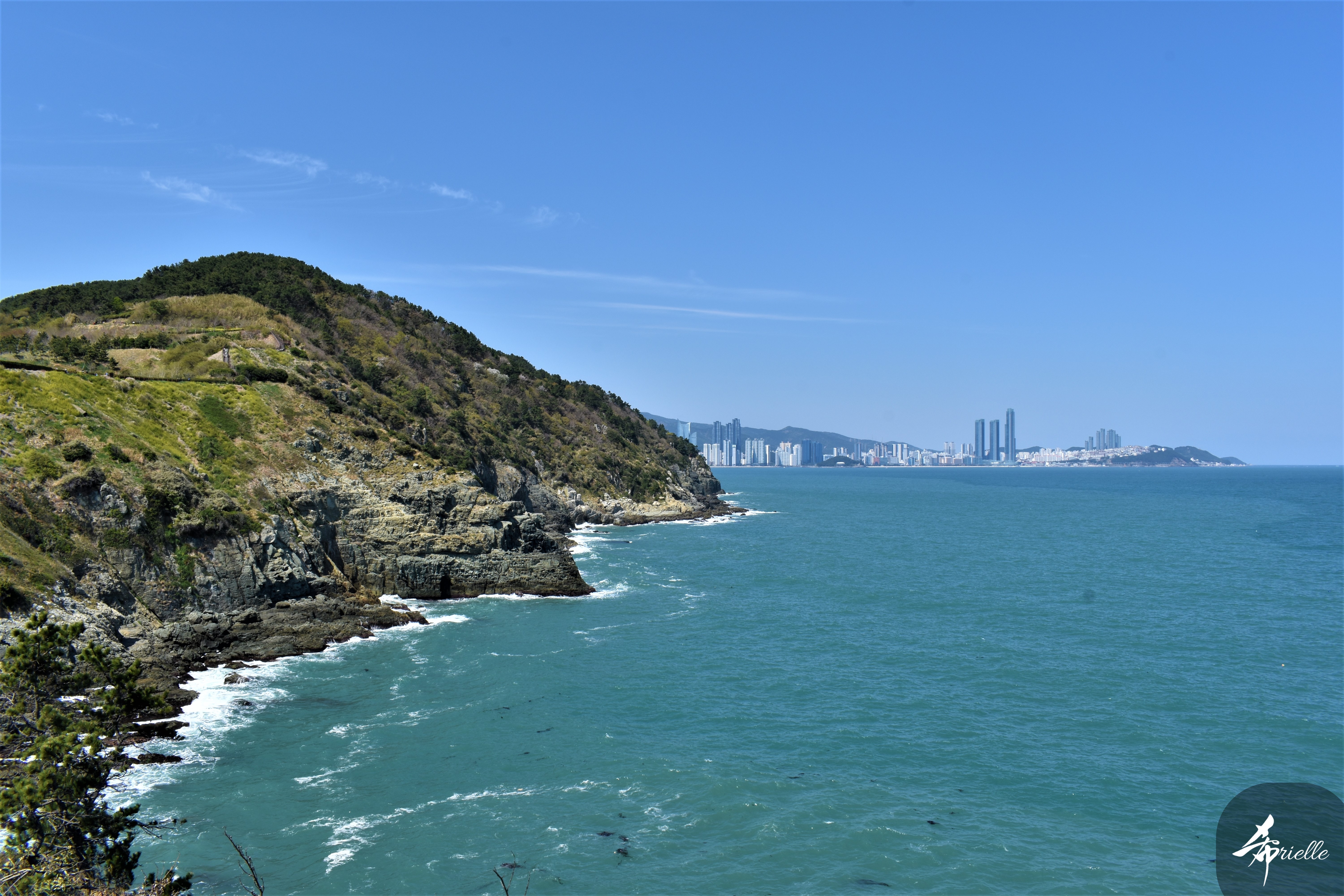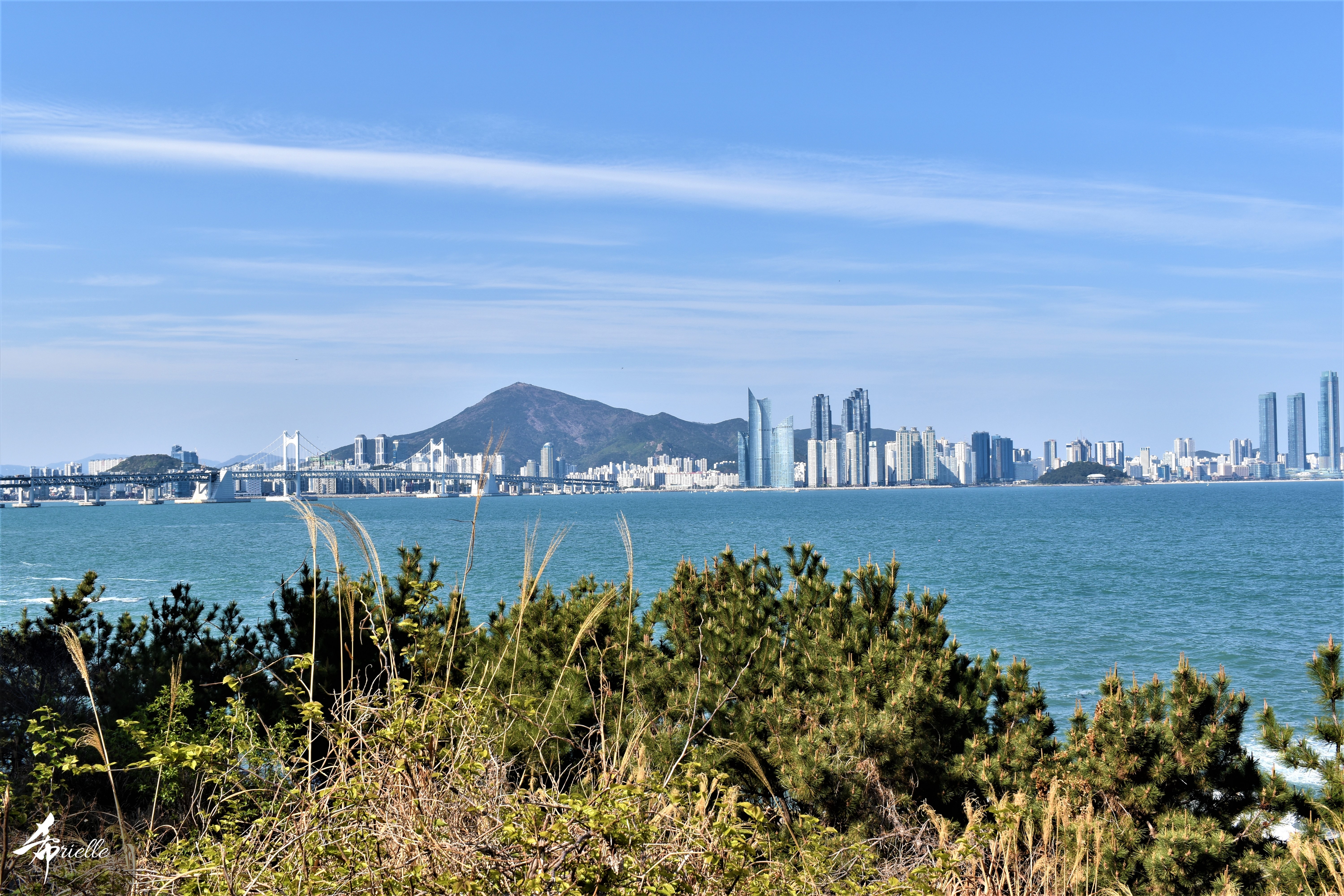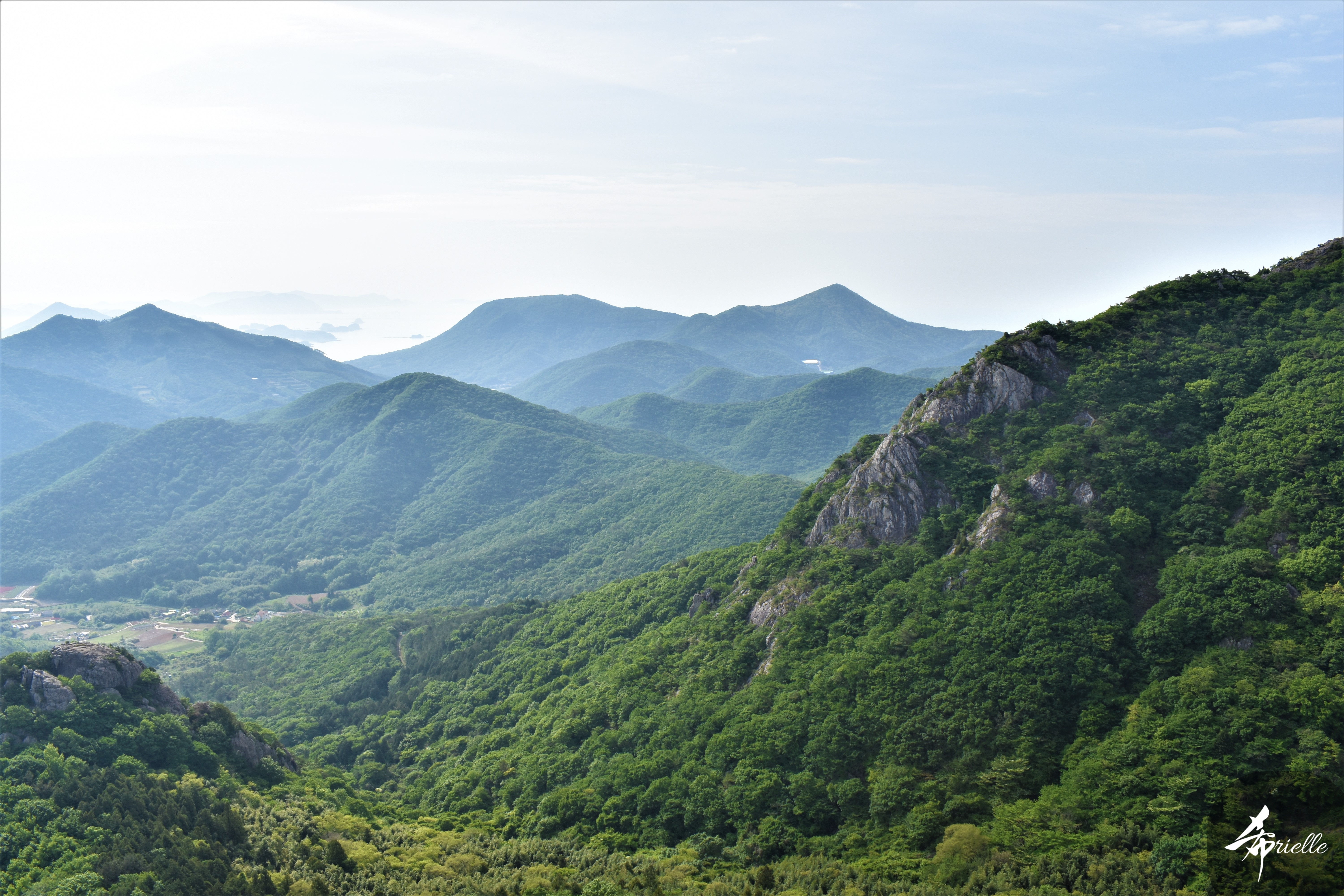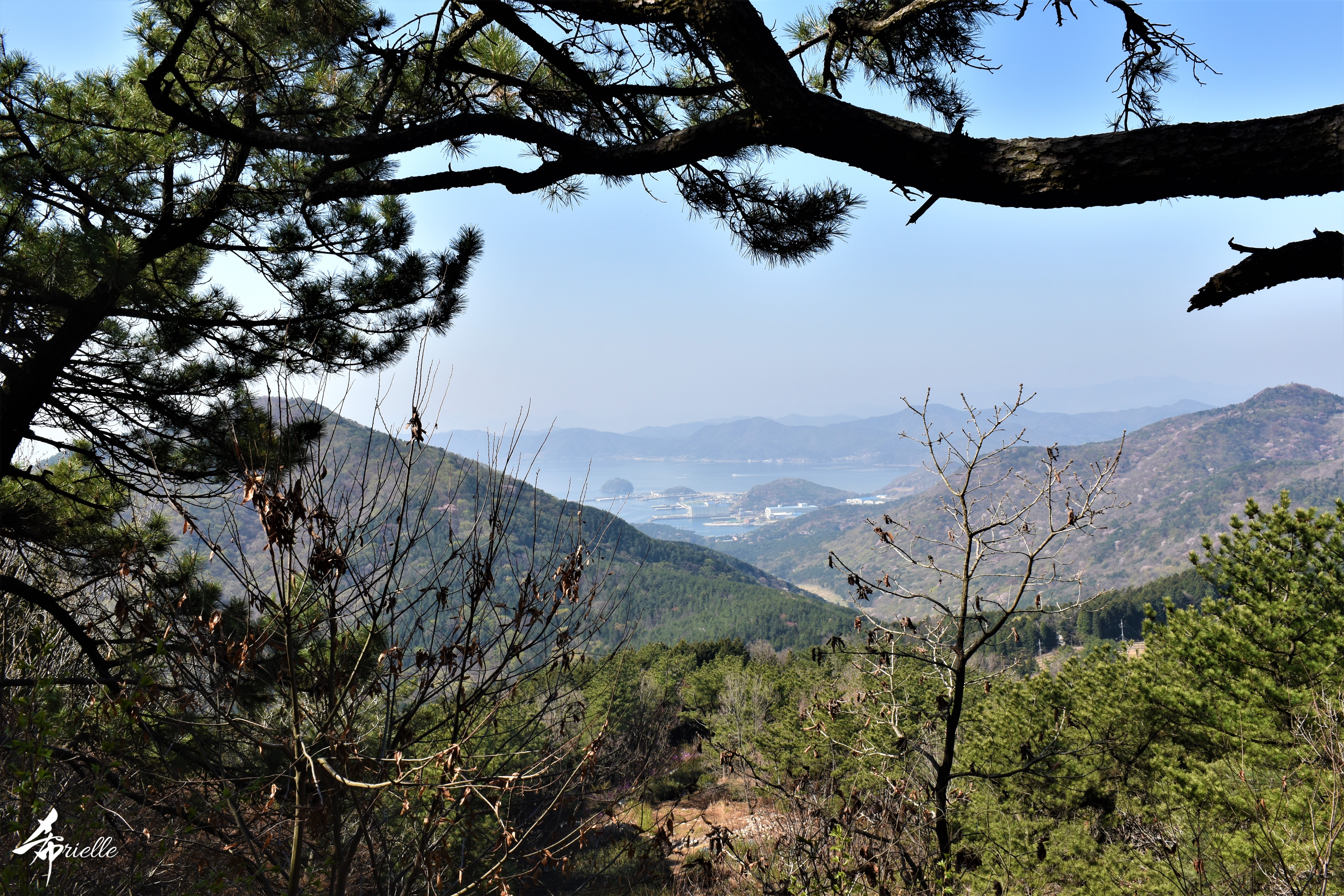 Etant donné que je passe la plupart de mon temps libre soit à la montagne, soit au bord de l’océan, on me demande souvent lequel des deux je préfère. Et bien, honnêtement c’est très difficile à dire mais je crois que là où je me sens le mieux, c’est au sommet d’une montagne offrant une vue sur l’océan. Que ce soit après une randonnée à pieds ou en vélo, il n’y a rien que j’aime plus que le fait de pouvoir finir la journée dans l’eau. Ainsi, l’une des villes où j’aime le plus marcher en Corée, est Tongyeong. Cette ville portuaire, montagneuse est constituée de plusieurs îles accessibles par bateau. Ces trois dernières années, j’ai eu l’occasion de faire le tour de la plupart de ces îles : Bijin, Saryang, Maemul, Seomaemul, Yokji, Suu … Les articles viendront si j’arrive à me tenir à la résolution de publier « plus souvent ». Oui, j’avoue ce n’est pas très précis ni très exigeant comme résolution ! Bref, cette année, j’avais donc envie de rejoindre le sommet de la montagne à Tongyeong qui n’est pas sur une île et ne nécessite donc pas de promenade en bateau. Ainsi, fin avril, j’ai pris le bus jusque là-bas puis un taxi pour rejoindre l’un des temples situés au pied du Mont Mireuk et d’où commence un sentier de randonnée. Encore une fois, il faisait tellement beau que la vue était superbe, en tons de bleu sur bleu. J’étais partie seule donc j’ai pris le temps de prendre toutes les photos que je voulais et profiter de la vue au sommet. Ce jour-là je n’ai pas croisé beaucoup d’autres marcheurs et je crois même que c’est le sentier le plus propre sur lequel j’ai jamais marché. Au sommet, comme le veut la tradition, le peu de personnes présentes, faisaient des photos avec la pierre indiquant le nom et l’altitude du pic. J’avais prévu mon trépied pour en prendre une aussi mais un promeneur venu avec un groupe, qui venait de faire plus d’une quinzaine de photos de ses amis, m’a dit qu’il était photographe et a insisté pour prendre la mienne. Je l’ai donc laissé faire et le résultat était plutôt convaincant. C’est agréable de discuter avec les gens en montagne parce qu’en général, ils sont souriants et sympathiques. Il faut dire qu’il est difficile de ne pas être de bonne humeur, face à la beauté des paysages ! Pour ceux qui le souhaitent, une ligne de cabines téléfériques fait aussi l’aller-retour du port au sommet. Pour ma part, j’ai particulièrement apprécié, une oeuvre d’art installée sur un belvédère offrant une vue vers l’est et sur l’île de Geoje. Il s’agissait d’une sculpture en métal du profil d’une femme regardant au loin. Ce n’est pas la première oeuvre de ce genre que je croise dans la région mais à et endroit, je ne m’y attendais vraiment pas et je l’ai trouvée absolument magnifique !