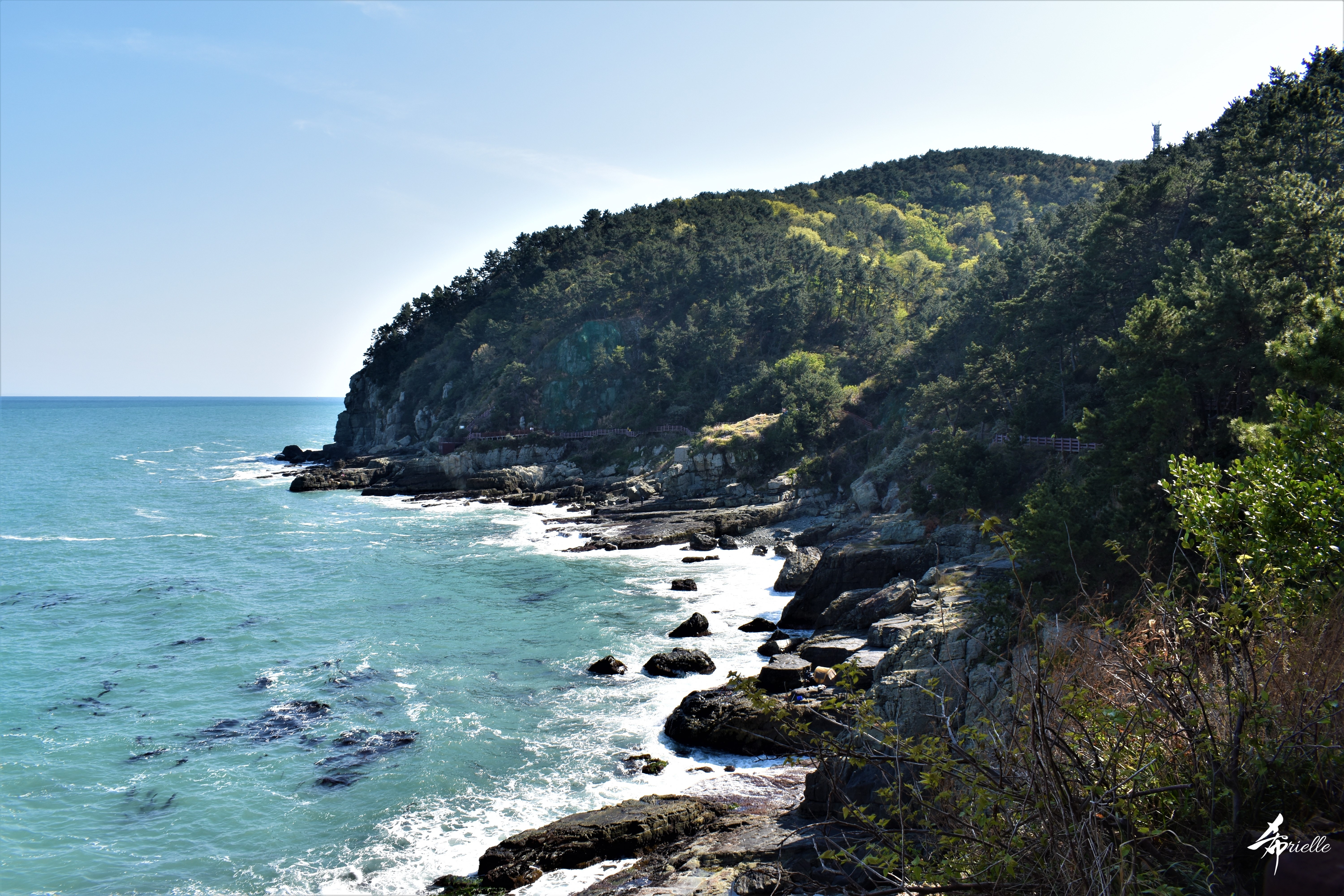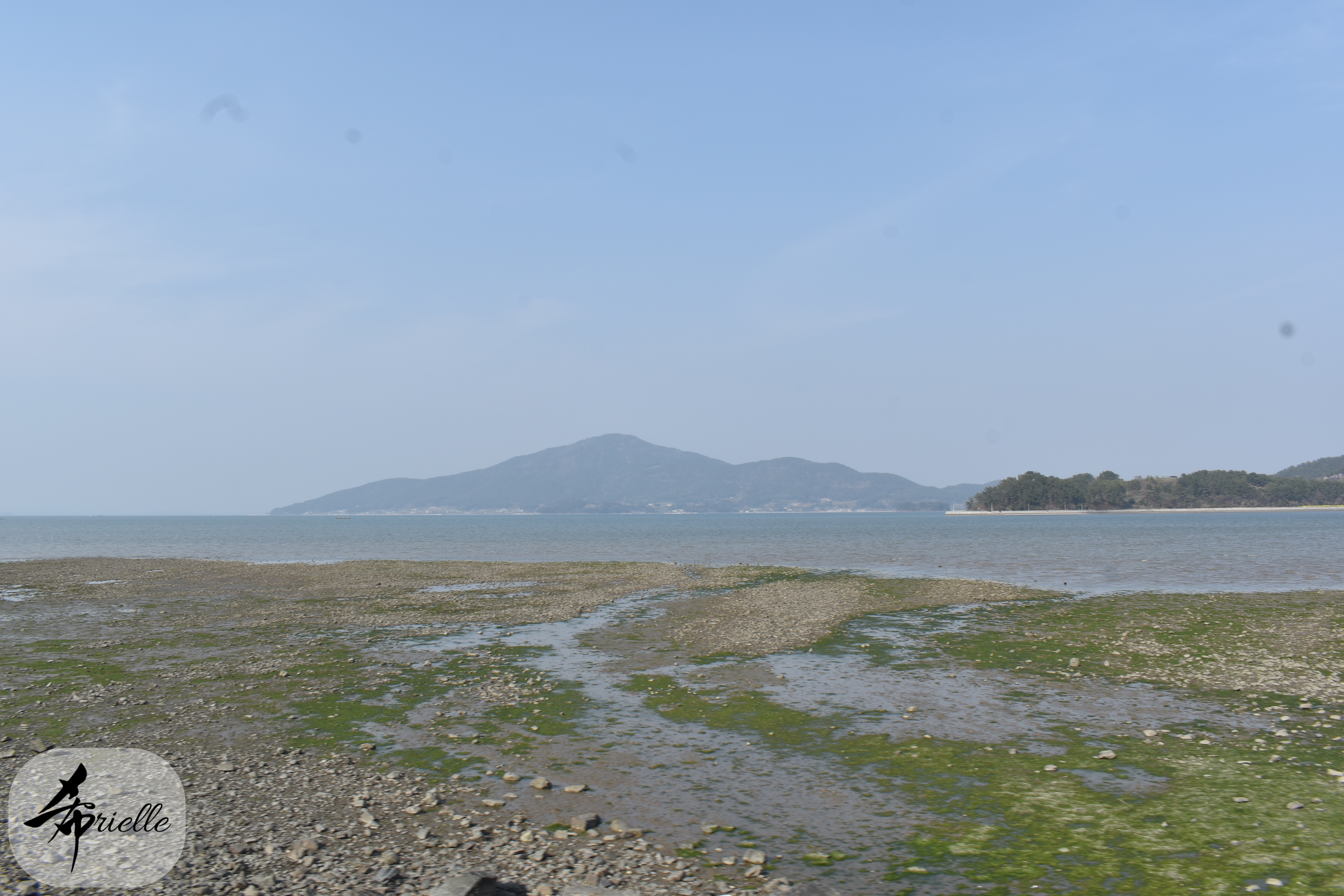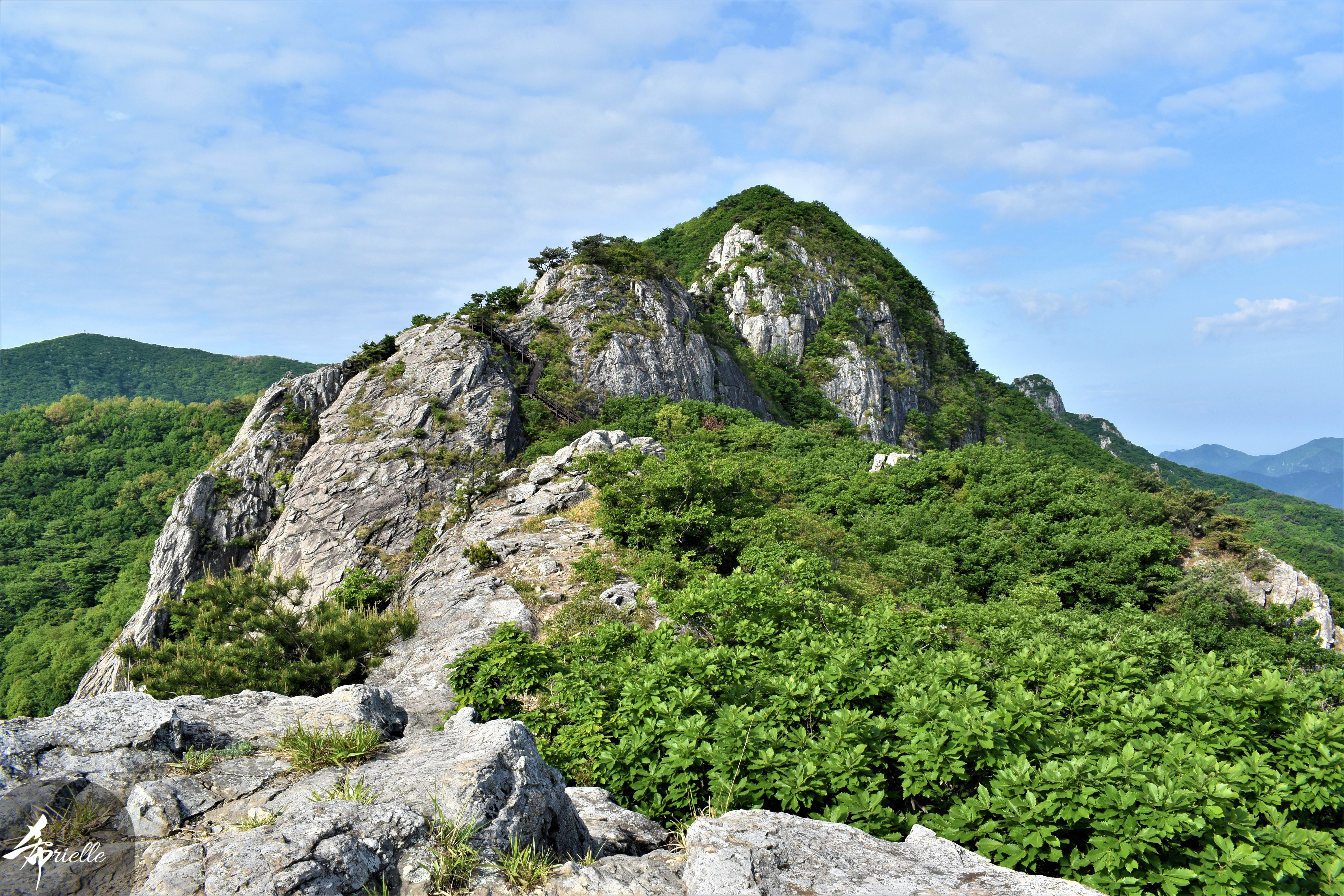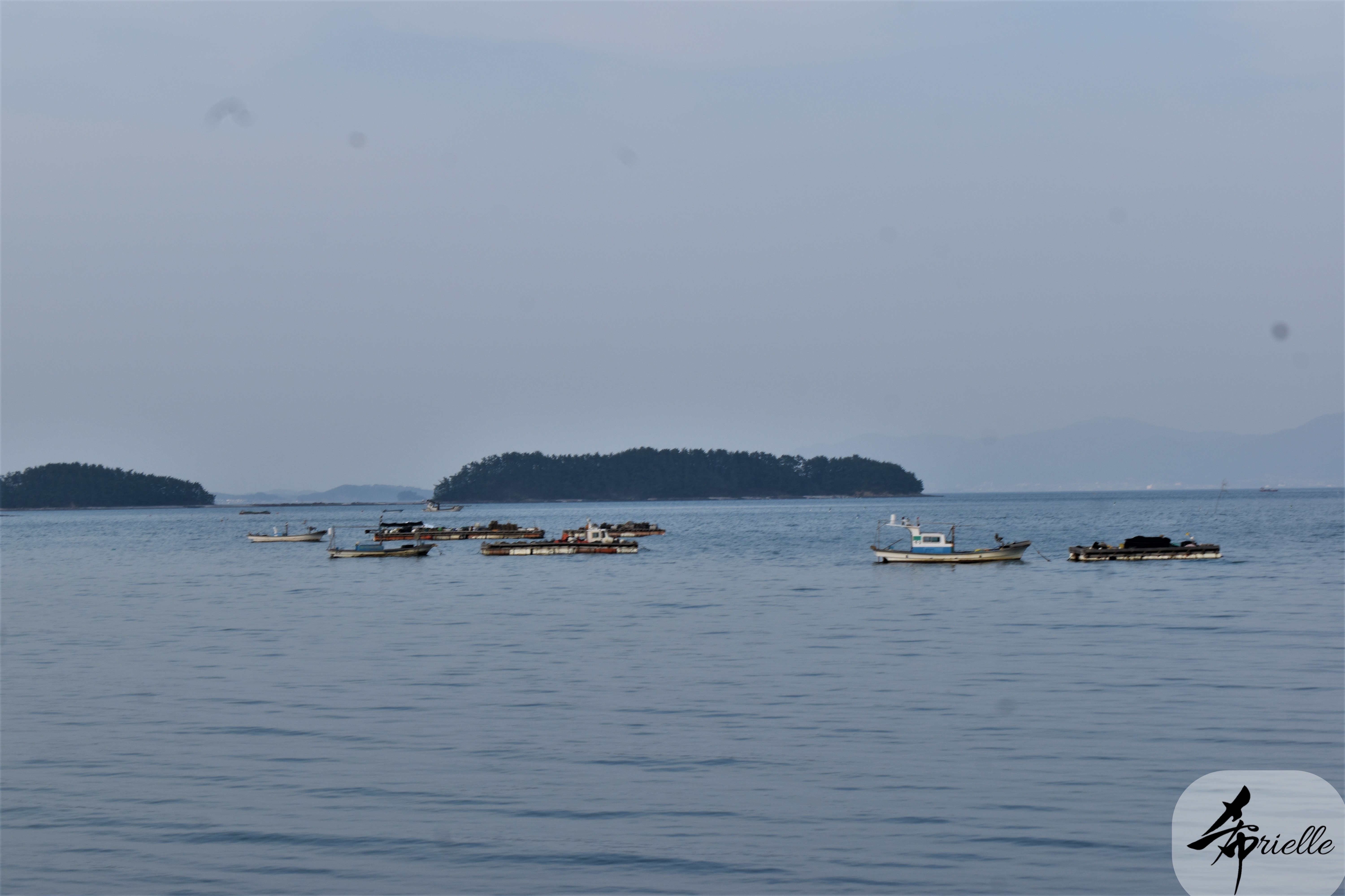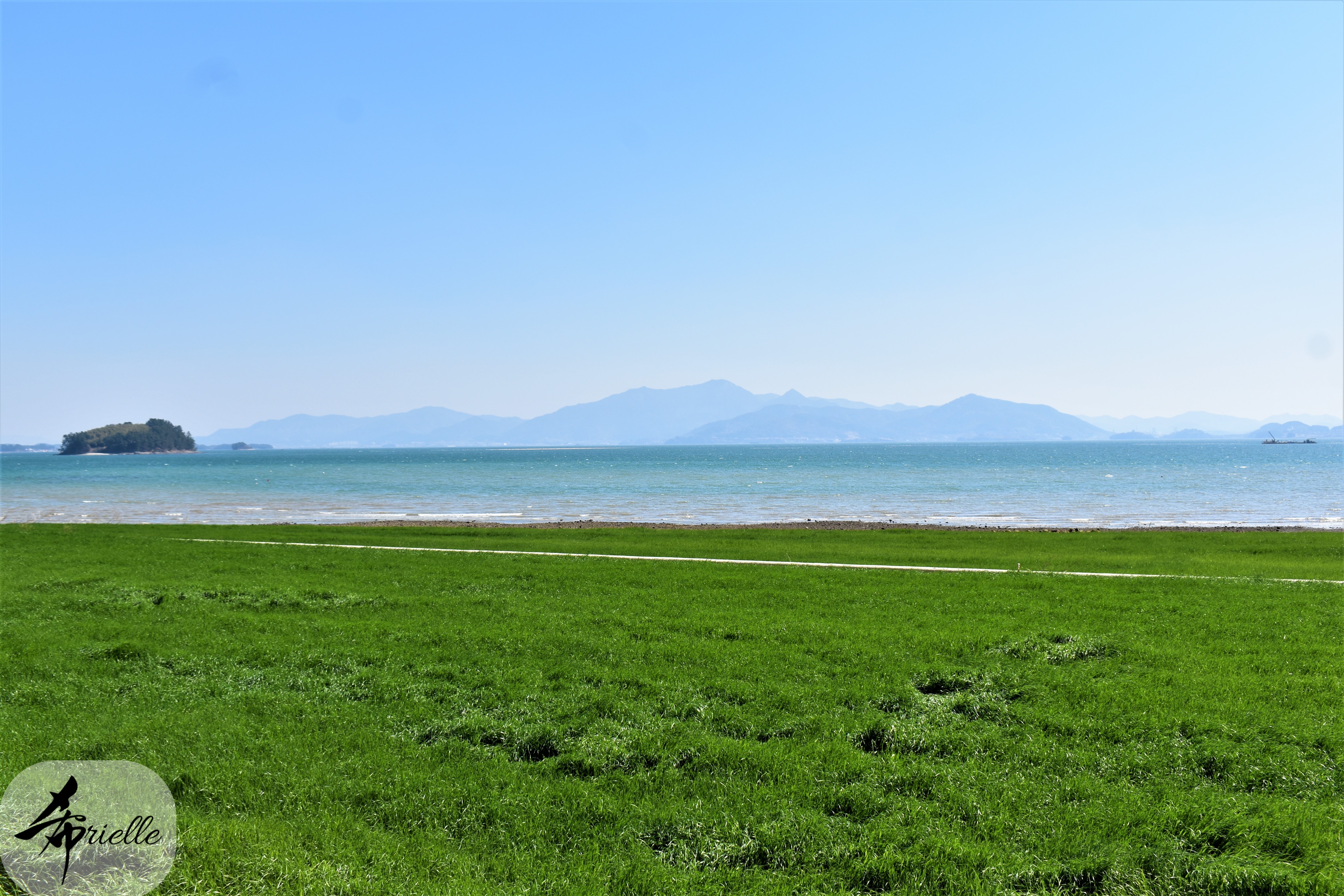 Etant donné que je passe la plupart de mon temps libre soit à la montagne, soit au bord de l’océan, on me demande souvent lequel des deux je préfère. Et bien, honnêtement c’est très difficile à dire mais je crois que là où je me sens le mieux, c’est au sommet d’une montagne offrant une vue sur l’océan. Que ce soit après une randonnée à pieds ou en vélo, il n’y a rien que j’aime plus que le fait de pouvoir finir la journée dans l’eau. Ainsi, l’une des villes où j’aime le plus marcher en Corée, est Tongyeong. Cette ville portuaire, montagneuse est constituée de plusieurs îles accessibles par bateau. Ces trois dernières années, j’ai eu l’occasion de faire le tour de la plupart de ces îles : Bijin, Saryang, Maemul, Seomaemul, Yokji, Suu … Les articles viendront si j’arrive à me tenir à la résolution de publier « plus souvent ». Oui, j’avoue ce n’est pas très précis ni très exigeant comme résolution ! Bref, cette année, j’avais donc envie de rejoindre le sommet de la montagne à Tongyeong qui n’est pas sur une île et ne nécessite donc pas de promenade en bateau. Ainsi, fin avril, j’ai pris le bus jusque là-bas puis un taxi pour rejoindre l’un des temples situés au pied du Mont Mireuk et d’où commence un sentier de randonnée. Encore une fois, il faisait tellement beau que la vue était superbe, en tons de bleu sur bleu. J’étais partie seule donc j’ai pris le temps de prendre toutes les photos que je voulais et profiter de la vue au sommet. Ce jour-là je n’ai pas croisé beaucoup d’autres marcheurs et je crois même que c’est le sentier le plus propre sur lequel j’ai jamais marché. Au sommet, comme le veut la tradition, le peu de personnes présentes, faisaient des photos avec la pierre indiquant le nom et l’altitude du pic. J’avais prévu mon trépied pour en prendre une aussi mais un promeneur venu avec un groupe, qui venait de faire plus d’une quinzaine de photos de ses amis, m’a dit qu’il était photographe et a insisté pour prendre la mienne. Je l’ai donc laissé faire et le résultat était plutôt convaincant. C’est agréable de discuter avec les gens en montagne parce qu’en général, ils sont souriants et sympathiques. Il faut dire qu’il est difficile de ne pas être de bonne humeur, face à la beauté des paysages ! Pour ceux qui le souhaitent, une ligne de cabines téléfériques fait aussi l’aller-retour du port au sommet. Pour ma part, j’ai particulièrement apprécié, une oeuvre d’art installée sur un belvédère offrant une vue vers l’est et sur l’île de Geoje. Il s’agissait d’une sculpture en métal du profil d’une femme regardant au loin. Ce n’est pas la première oeuvre de ce genre que je croise dans la région mais à et endroit, je ne m’y attendais vraiment pas et je l’ai trouvée absolument magnifique !