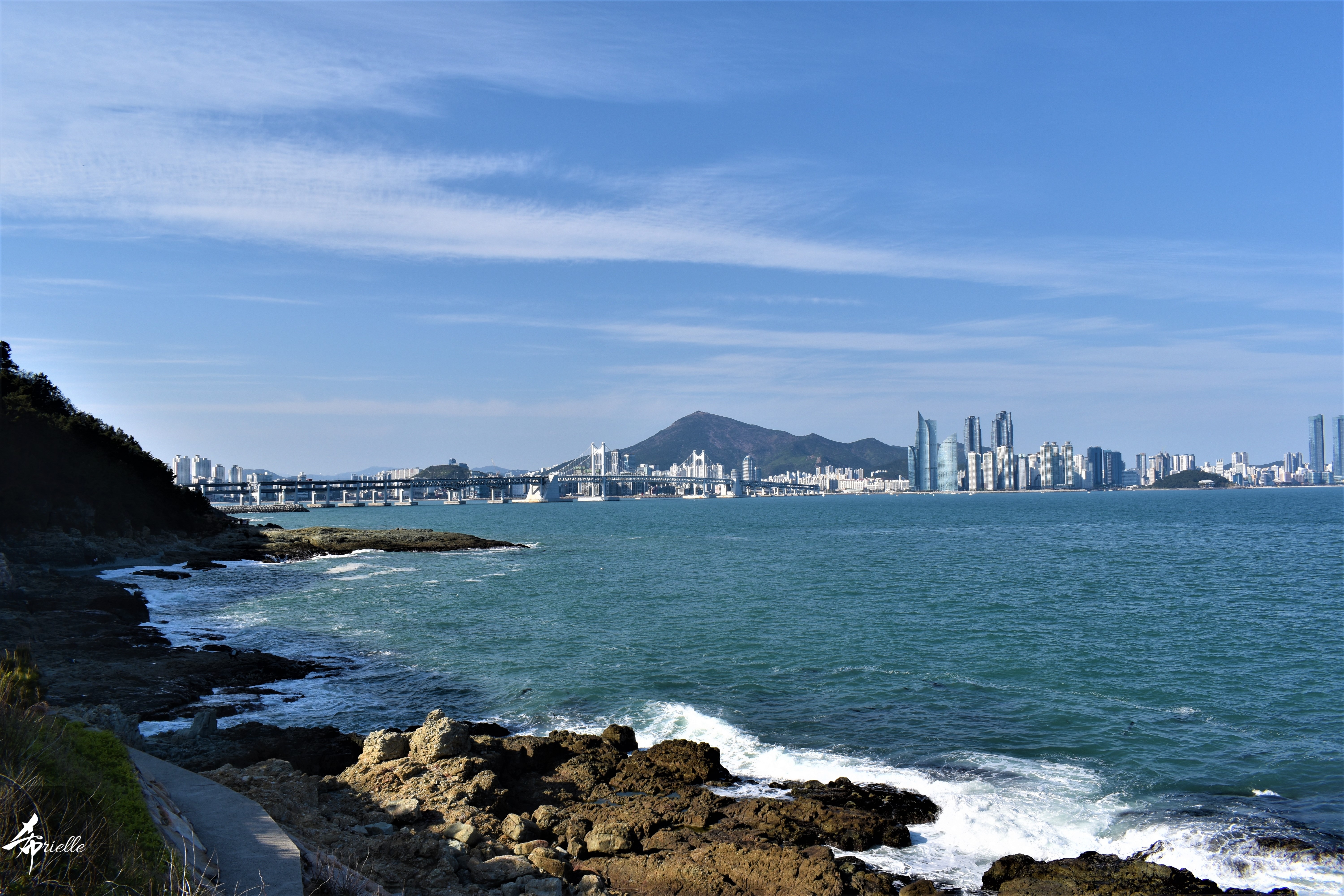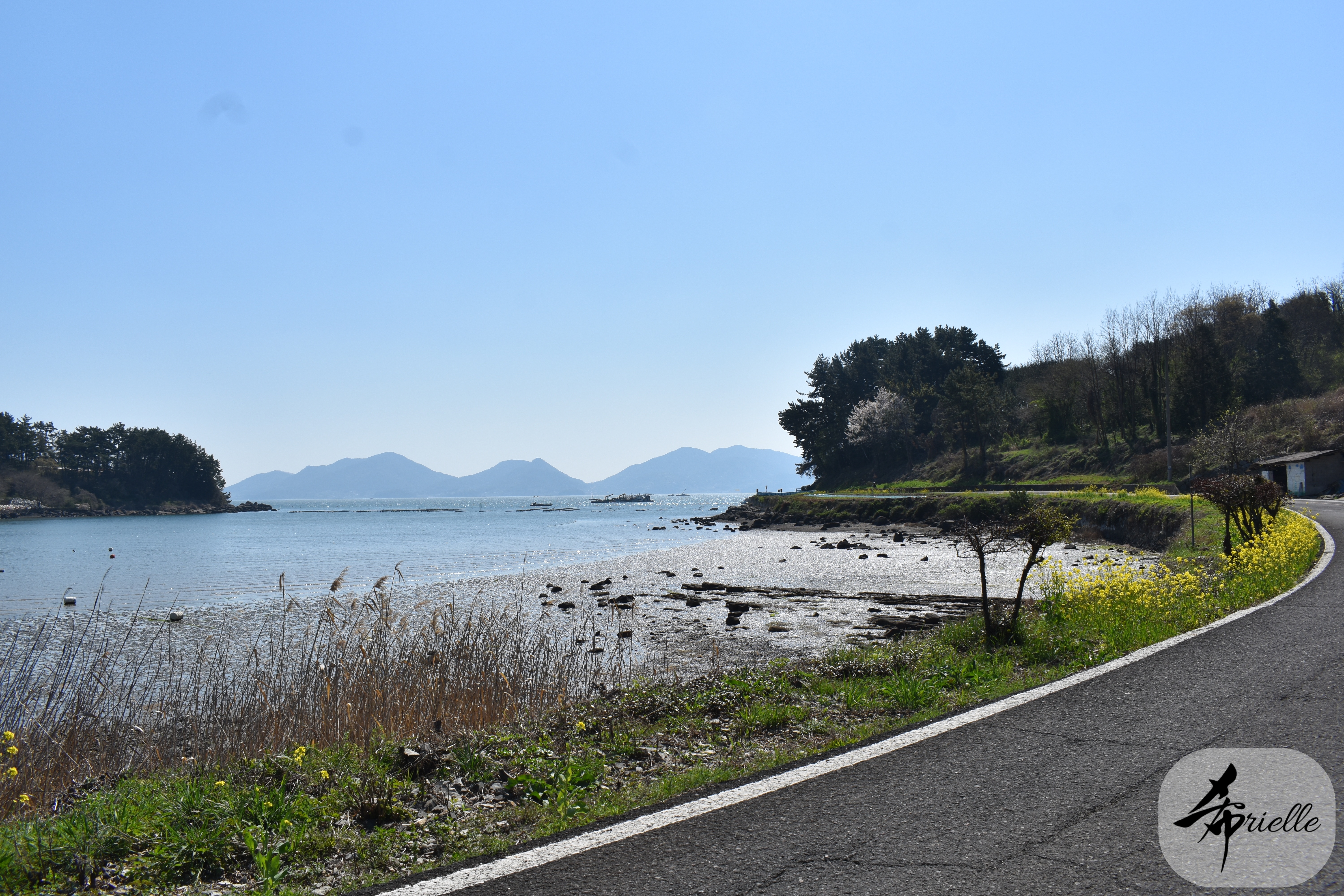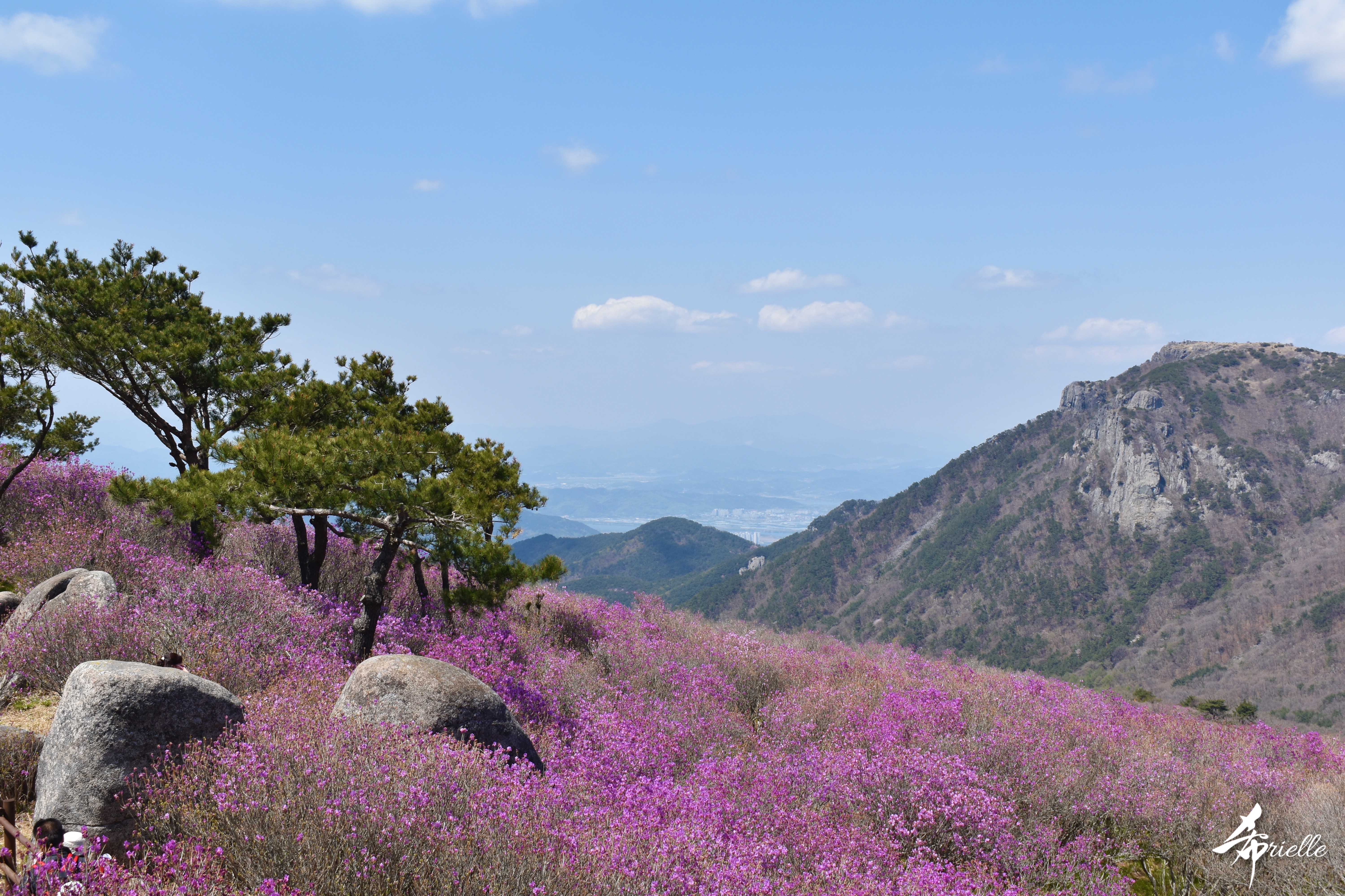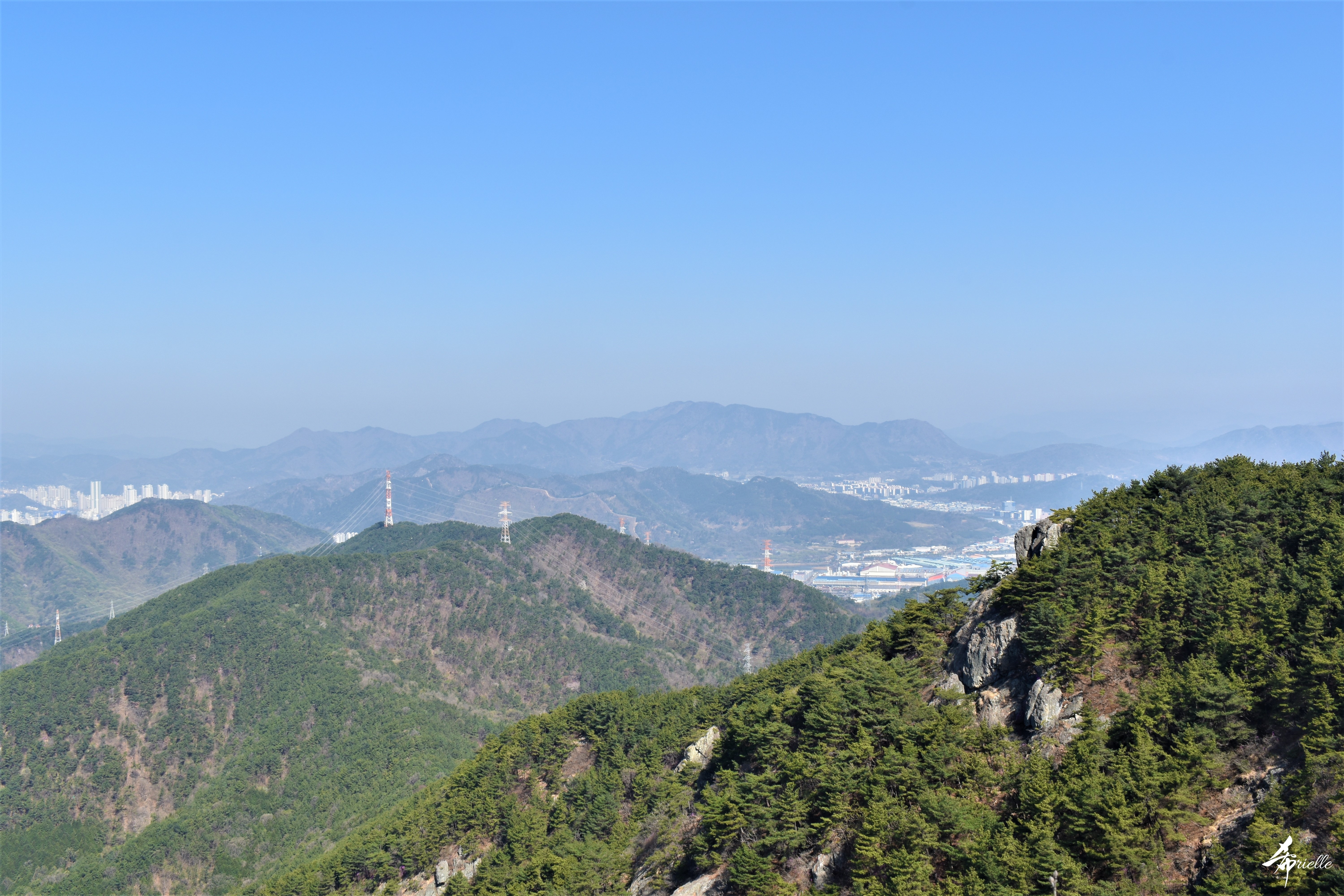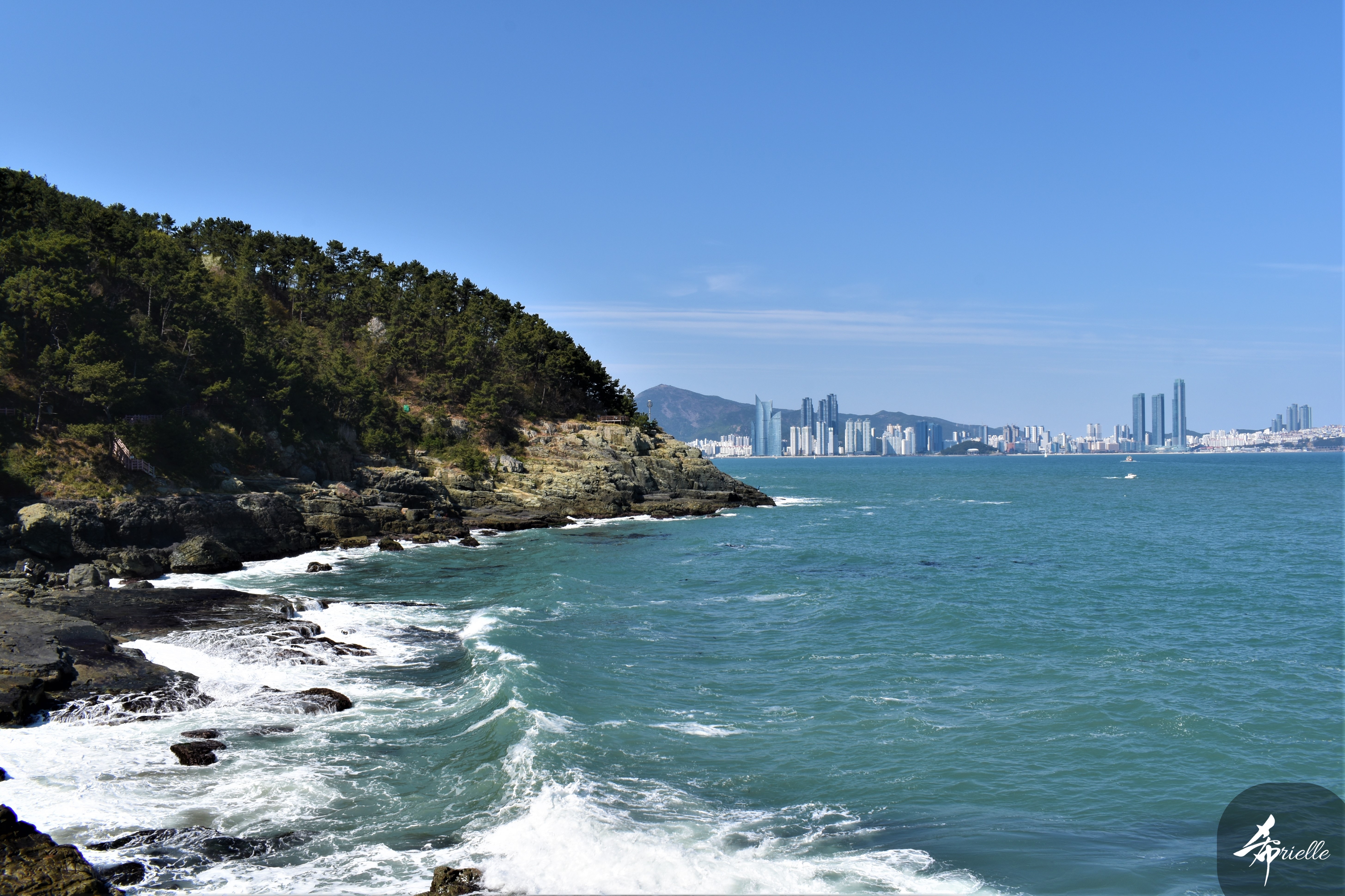Etant donné que je passe la plupart de mon temps libre soit à la montagne, soit au bord de l’océan, on me demande souvent lequel des deux je préfère. Et bien, honnêtement c’est très difficile à dire mais je crois que là où je me sens le mieux, c’est au sommet d’une montagne offrant une vue sur l’océan. Que ce soit après une randonnée à pieds ou en vélo, il n’y a rien que j’aime plus que le fait de pouvoir finir la journée dans l’eau. Ainsi, l’une des villes où j’aime le plus marcher en Corée, est Tongyeong. Cette ville portuaire, montagneuse est constituée de plusieurs îles accessibles par bateau. Ces trois dernières années, j’ai eu l’occasion de faire le tour de la plupart de ces îles : Bijin, Saryang, Maemul, Seomaemul, Yokji, Suu … Les articles viendront si j’arrive à me tenir à la résolution de publier « plus souvent ». Oui, j’avoue ce n’est pas très précis ni très exigeant comme résolution ! Bref, cette année, j’avais donc envie de rejoindre le sommet de la montagne à Tongyeong qui n’est pas sur une île et ne nécessite donc pas de promenade en bateau. Ainsi, fin avril, j’ai pris le bus jusque là-bas puis un taxi pour rejoindre l’un des temples situés au pied du Mont Mireuk et d’où commence un sentier de randonnée. Encore une fois, il faisait tellement beau que la vue était superbe, en tons de bleu sur bleu. J’étais partie seule donc j’ai pris le temps de prendre toutes les photos que je voulais et profiter de la vue au sommet. Ce jour-là je n’ai pas croisé beaucoup d’autres marcheurs et je crois même que c’est le sentier le plus propre sur lequel j’ai jamais marché. Au sommet, comme le veut la tradition, le peu de personnes présentes, faisaient des photos avec la pierre indiquant le nom et l’altitude du pic. J’avais prévu mon trépied pour en prendre une aussi mais un promeneur venu avec un groupe, qui venait de faire plus d’une quinzaine de photos de ses amis, m’a dit qu’il était photographe et a insisté pour prendre la mienne. Je l’ai donc laissé faire et le résultat était plutôt convaincant. C’est agréable de discuter avec les gens en montagne parce qu’en général, ils sont souriants et sympathiques. Il faut dire qu’il est difficile de ne pas être de bonne humeur, face à la beauté des paysages ! Pour ceux qui le souhaitent, une ligne de cabines téléfériques fait aussi l’aller-retour du port au sommet. Pour ma part, j’ai particulièrement apprécié, une oeuvre d’art installée sur un belvédère offrant une vue vers l’est et sur l’île de Geoje. Il s’agissait d’une sculpture en métal du profil d’une femme regardant au loin. Ce n’est pas la première oeuvre de ce genre que je croise dans la région mais à et endroit, je ne m’y attendais vraiment pas et je l’ai trouvée absolument magnifique !