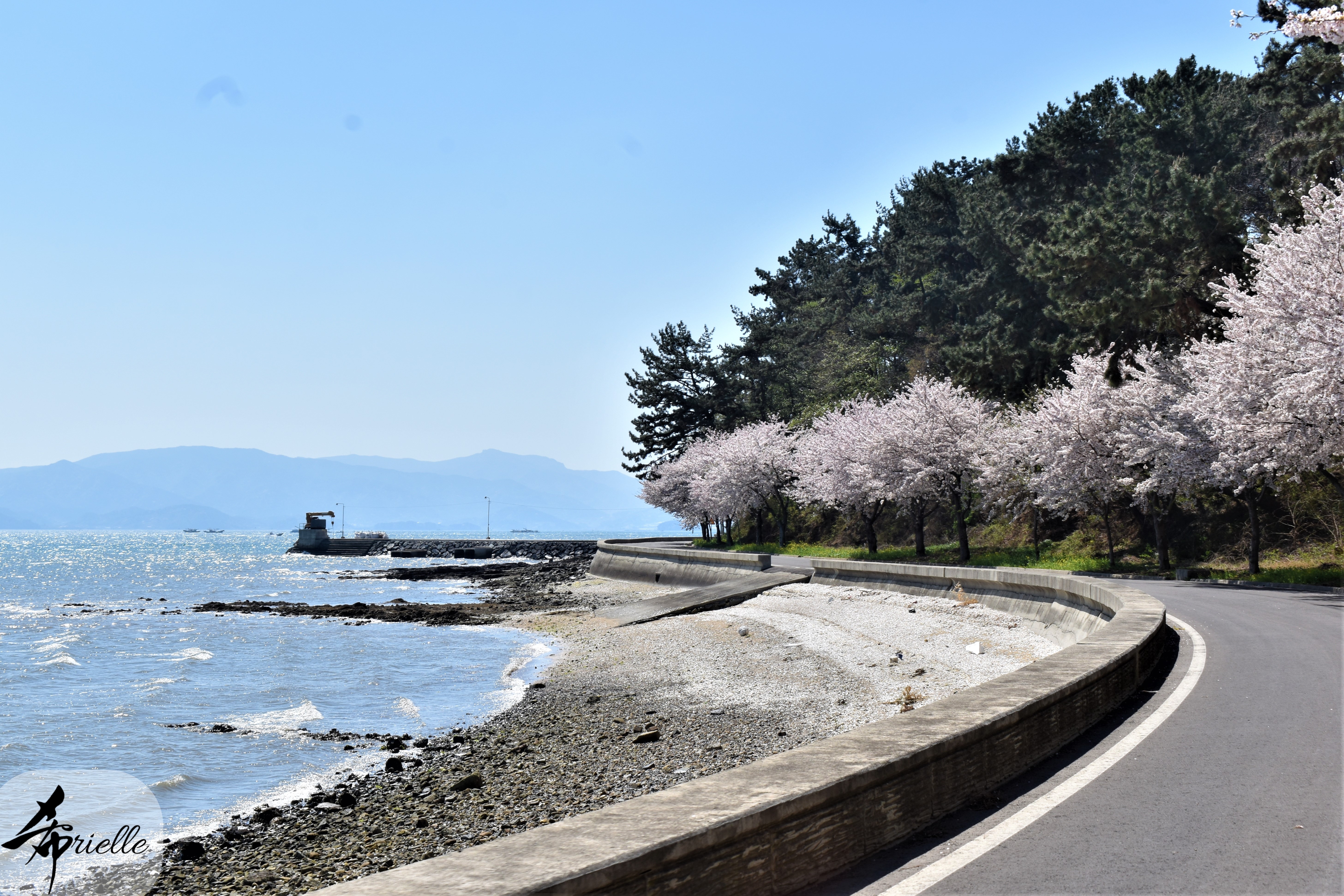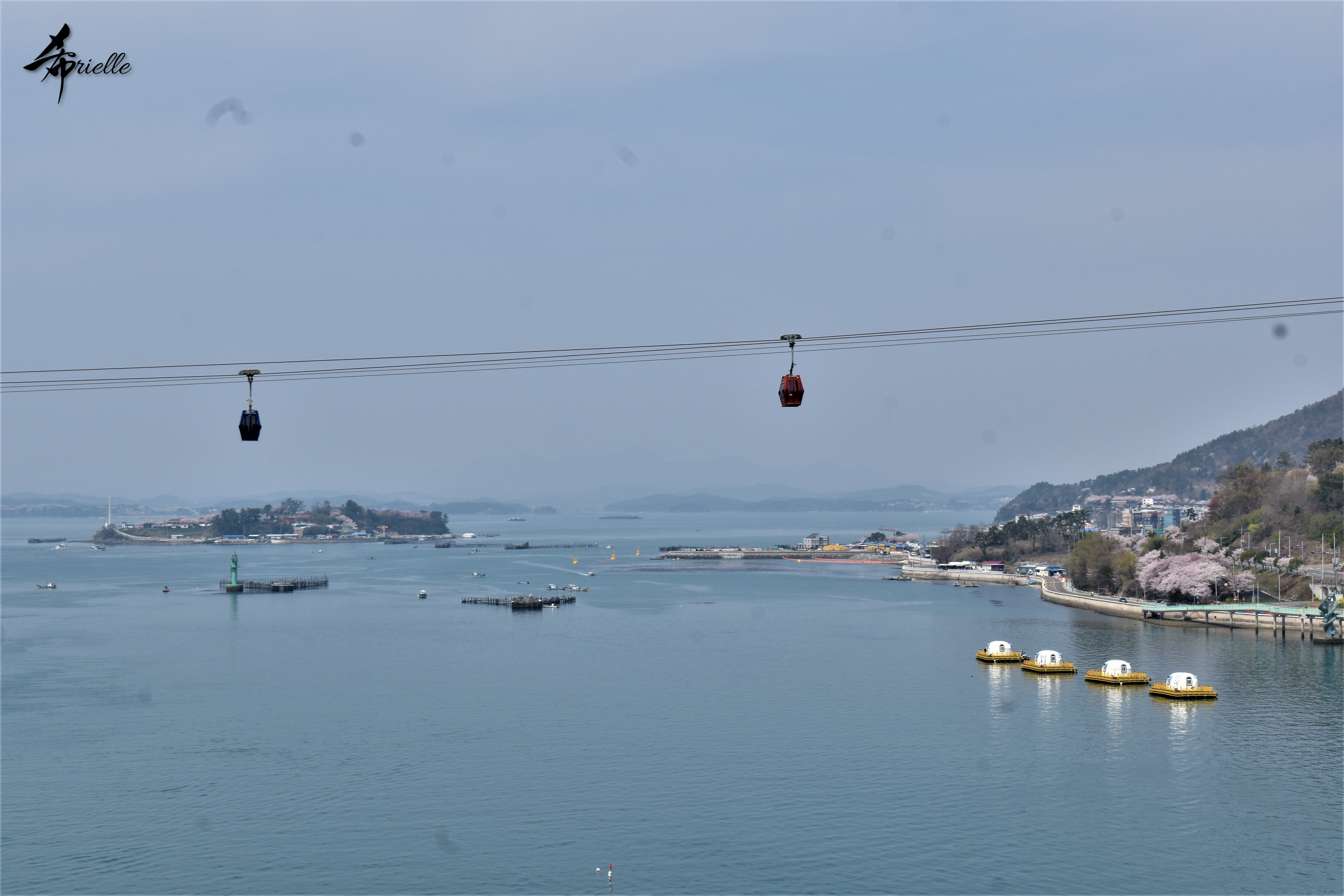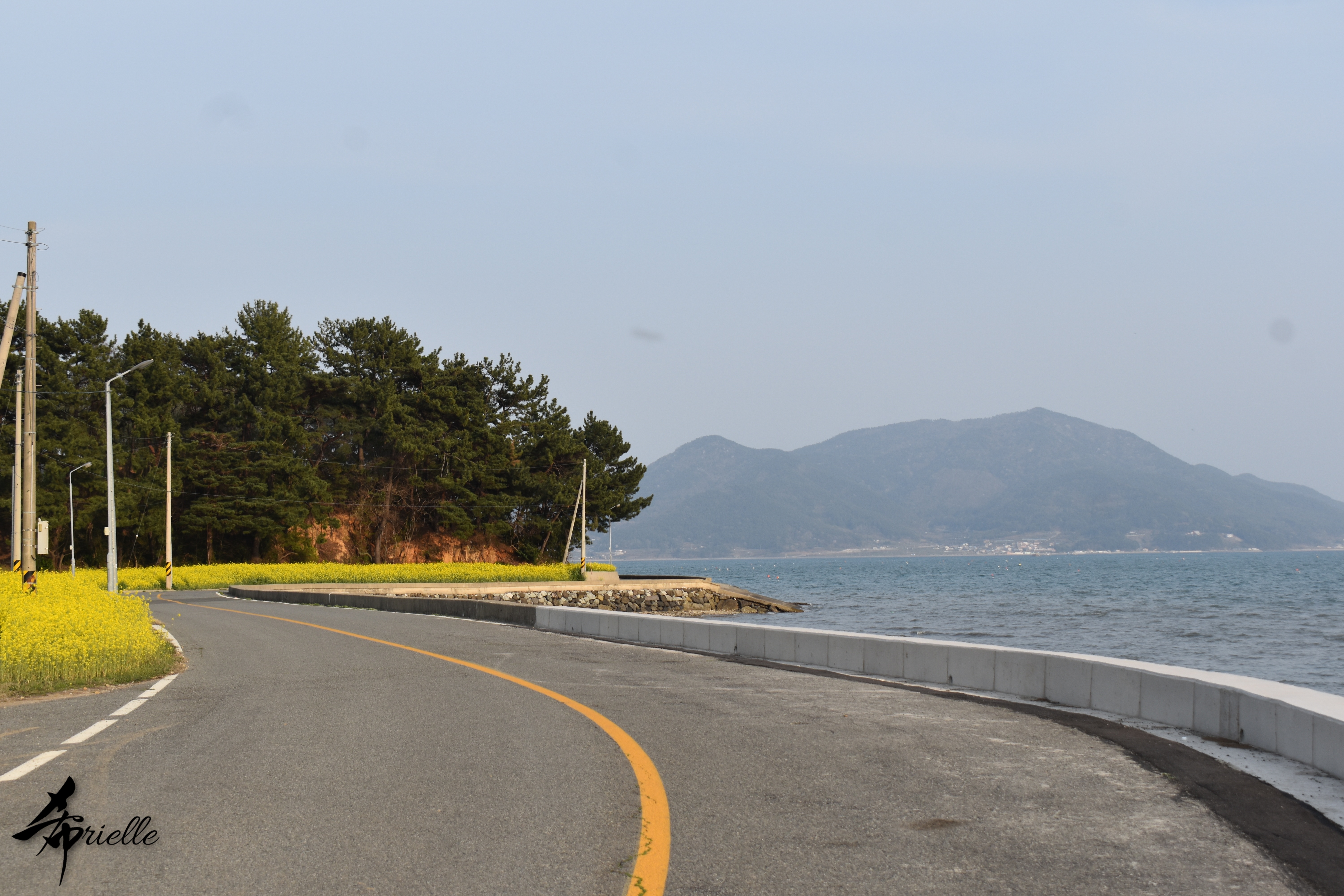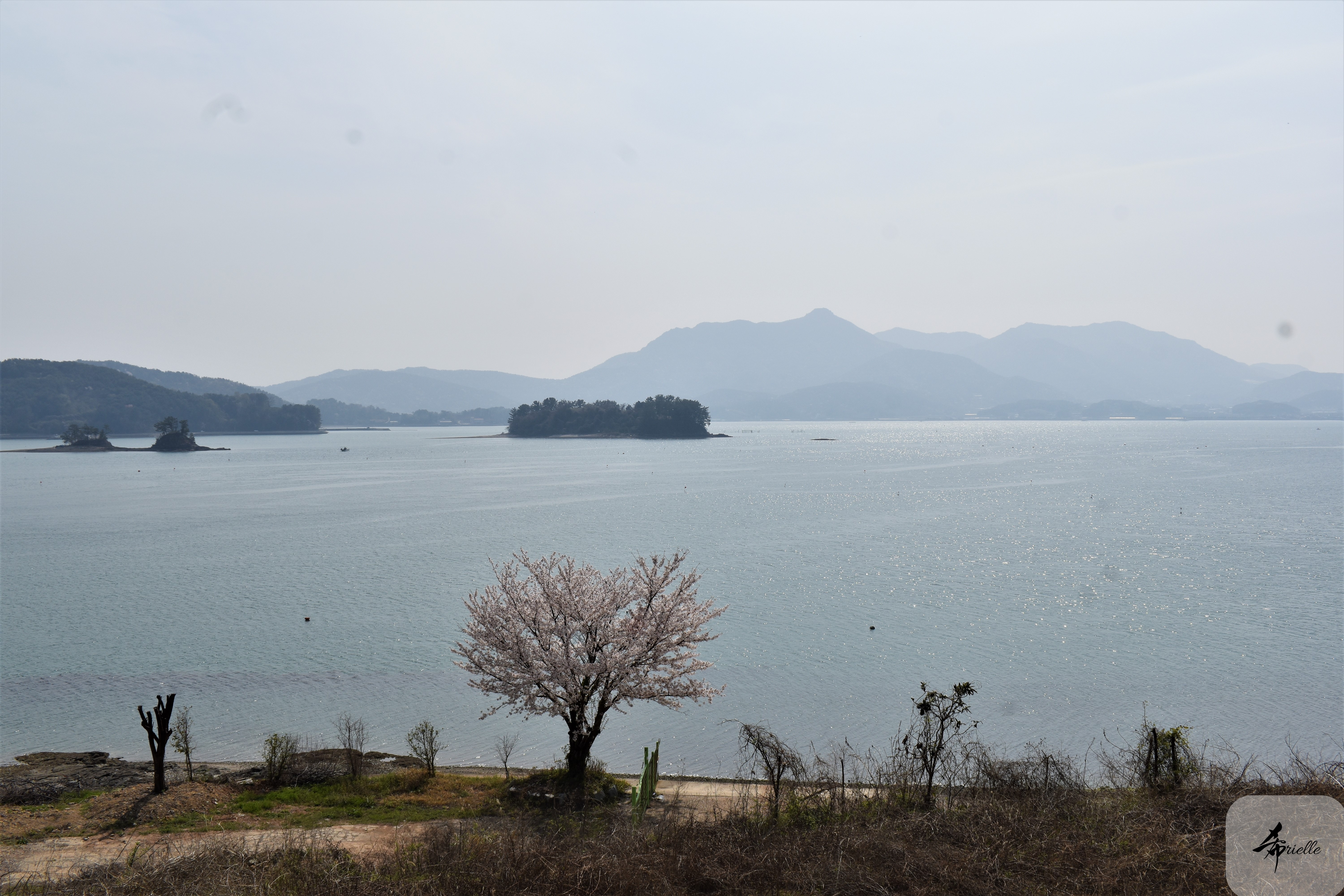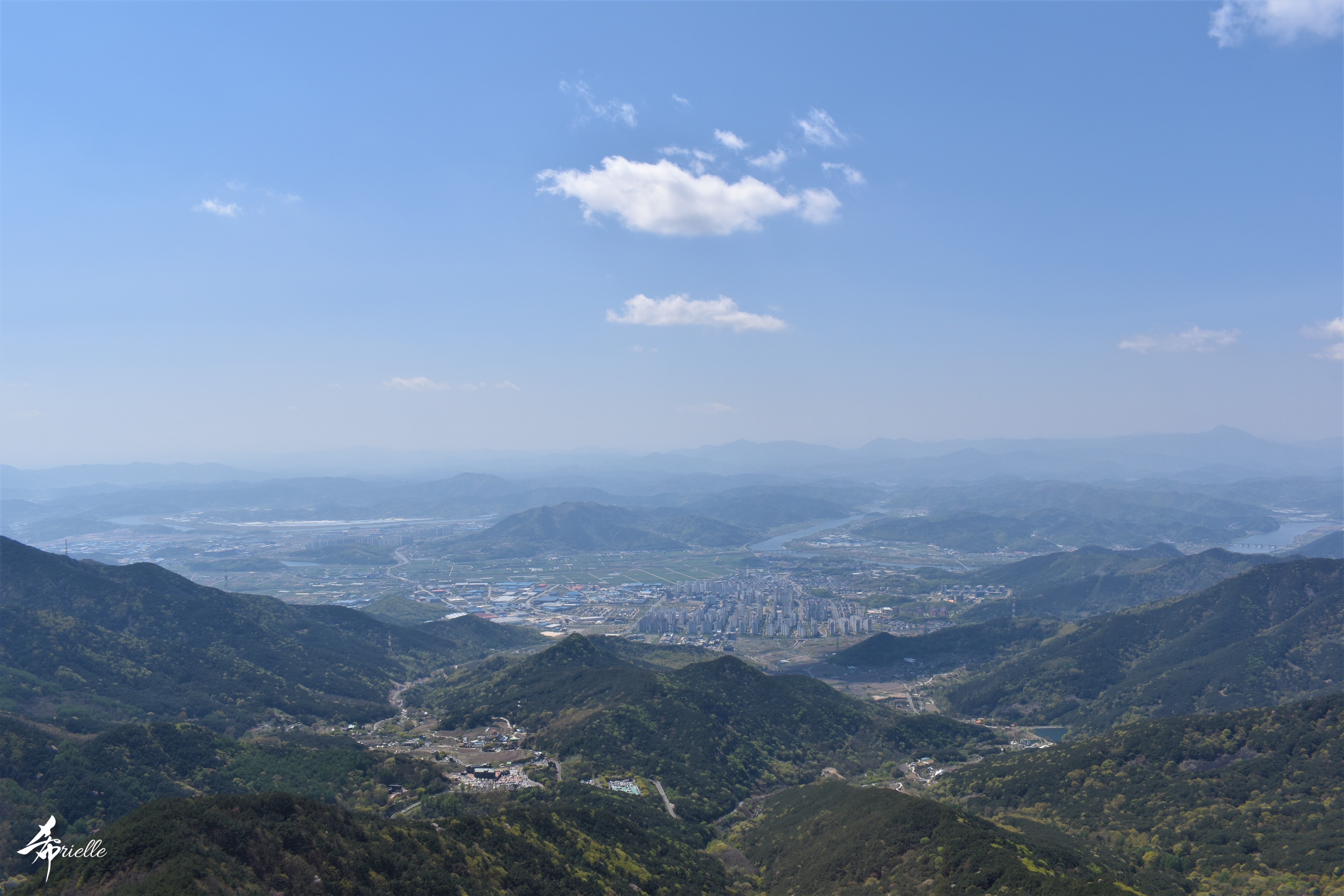 Etant donné que je passe la plupart de mon temps libre soit à la montagne, soit au bord de l’océan, on me demande souvent lequel des deux je préfère. Et bien, honnêtement c’est très difficile à dire mais je crois que là où je me sens le mieux, c’est au sommet d’une montagne offrant une vue sur l’océan. Que ce soit après une randonnée à pieds ou en vélo, il n’y a rien que j’aime plus que le fait de pouvoir finir la journée dans l’eau. Ainsi, l’une des villes où j’aime le plus marcher en Corée, est Tongyeong. Cette ville portuaire, montagneuse est constituée de plusieurs îles accessibles par bateau. Ces trois dernières années, j’ai eu l’occasion de faire le tour de la plupart de ces îles : Bijin, Saryang, Maemul, Seomaemul, Yokji, Suu … Les articles viendront si j’arrive à me tenir à la résolution de publier « plus souvent ». Oui, j’avoue ce n’est pas très précis ni très exigeant comme résolution ! Bref, cette année, j’avais donc envie de rejoindre le sommet de la montagne à Tongyeong qui n’est pas sur une île et ne nécessite donc pas de promenade en bateau. Ainsi, fin avril, j’ai pris le bus jusque là-bas puis un taxi pour rejoindre l’un des temples situés au pied du Mont Mireuk et d’où commence un sentier de randonnée. Encore une fois, il faisait tellement beau que la vue était superbe, en tons de bleu sur bleu. J’étais partie seule donc j’ai pris le temps de prendre toutes les photos que je voulais et profiter de la vue au sommet. Ce jour-là je n’ai pas croisé beaucoup d’autres marcheurs et je crois même que c’est le sentier le plus propre sur lequel j’ai jamais marché. Au sommet, comme le veut la tradition, le peu de personnes présentes, faisaient des photos avec la pierre indiquant le nom et l’altitude du pic. J’avais prévu mon trépied pour en prendre une aussi mais un promeneur venu avec un groupe, qui venait de faire plus d’une quinzaine de photos de ses amis, m’a dit qu’il était photographe et a insisté pour prendre la mienne. Je l’ai donc laissé faire et le résultat était plutôt convaincant. C’est agréable de discuter avec les gens en montagne parce qu’en général, ils sont souriants et sympathiques. Il faut dire qu’il est difficile de ne pas être de bonne humeur, face à la beauté des paysages ! Pour ceux qui le souhaitent, une ligne de cabines téléfériques fait aussi l’aller-retour du port au sommet. Pour ma part, j’ai particulièrement apprécié, une oeuvre d’art installée sur un belvédère offrant une vue vers l’est et sur l’île de Geoje. Il s’agissait d’une sculpture en métal du profil d’une femme regardant au loin. Ce n’est pas la première oeuvre de ce genre que je croise dans la région mais à et endroit, je ne m’y attendais vraiment pas et je l’ai trouvée absolument magnifique !