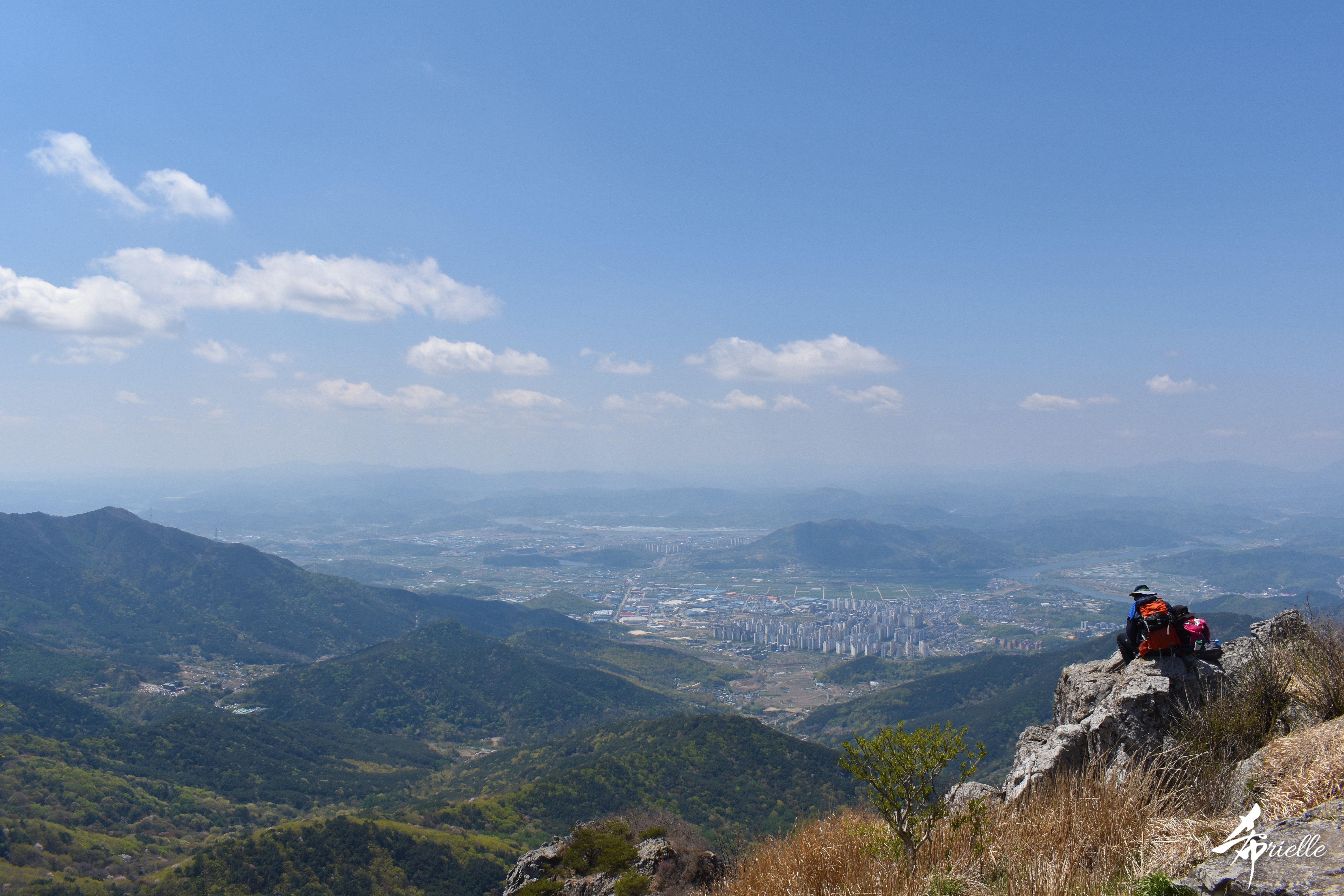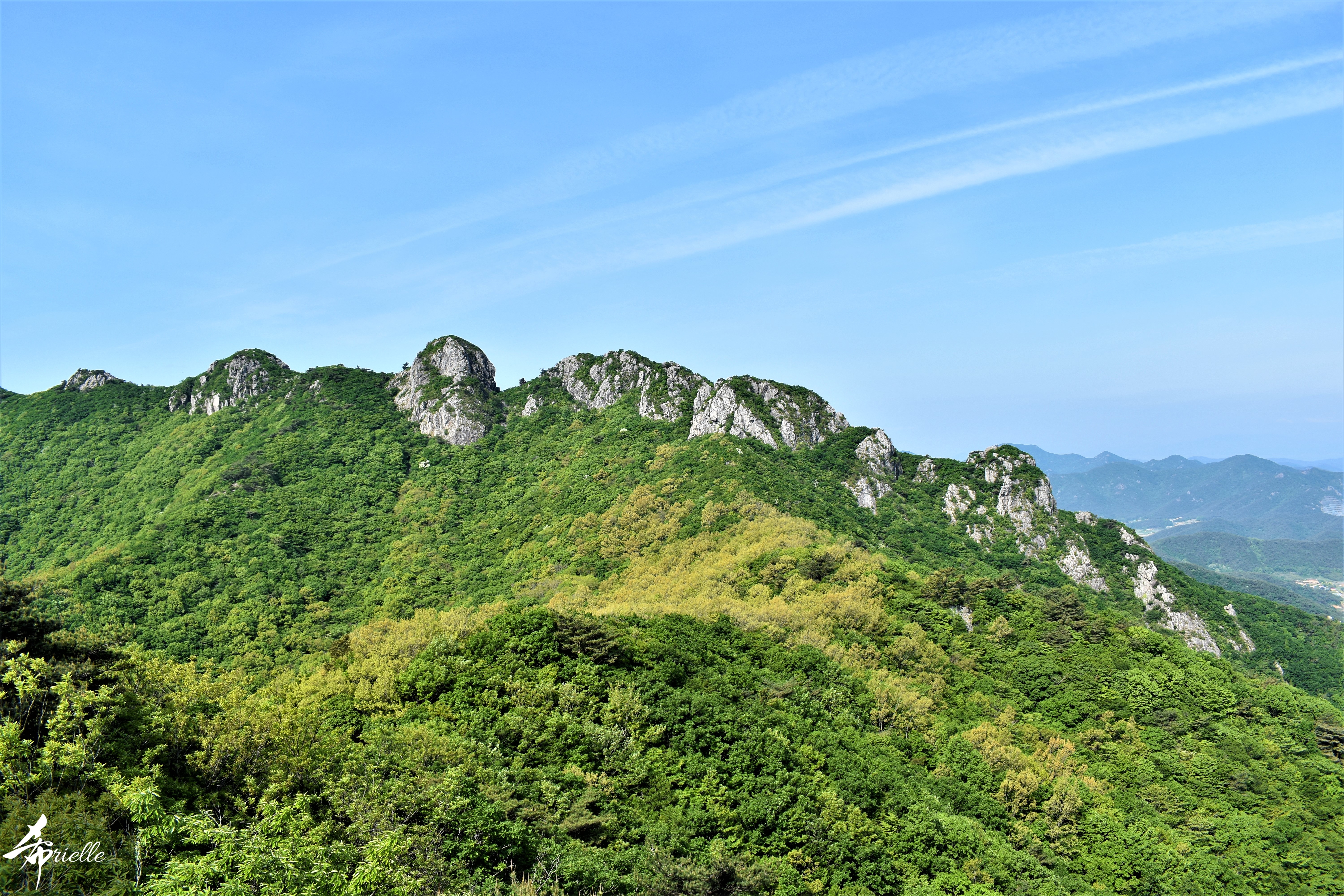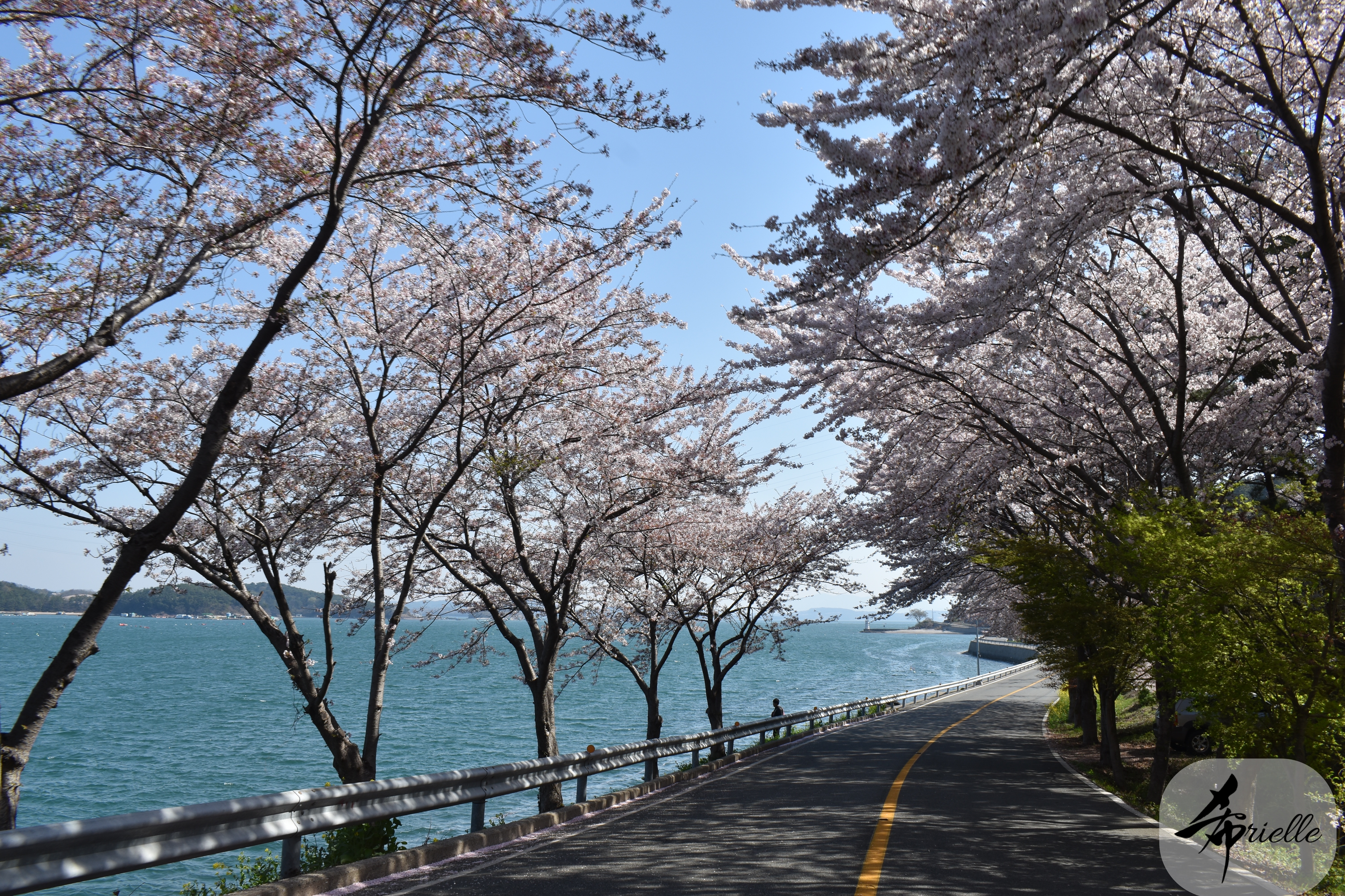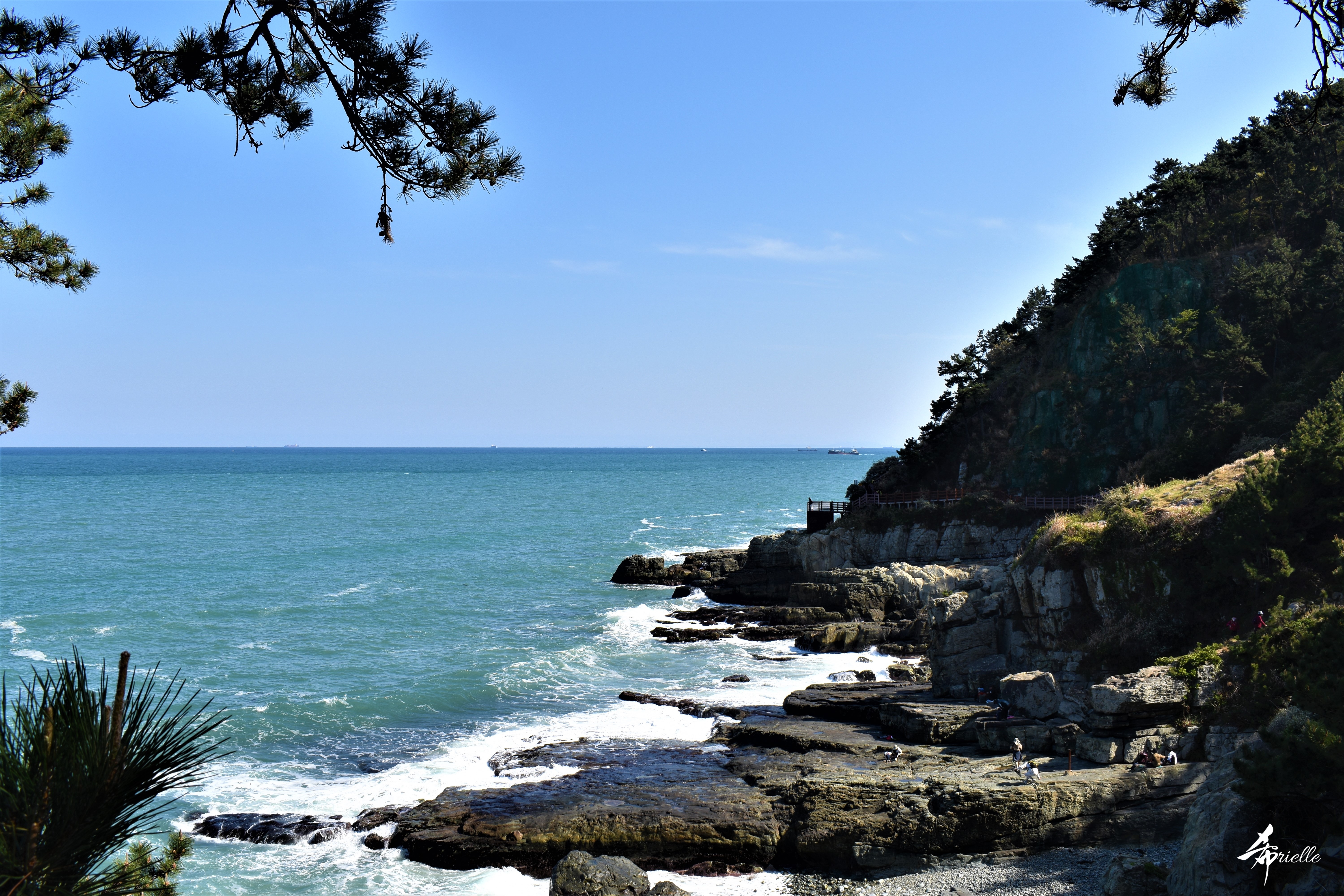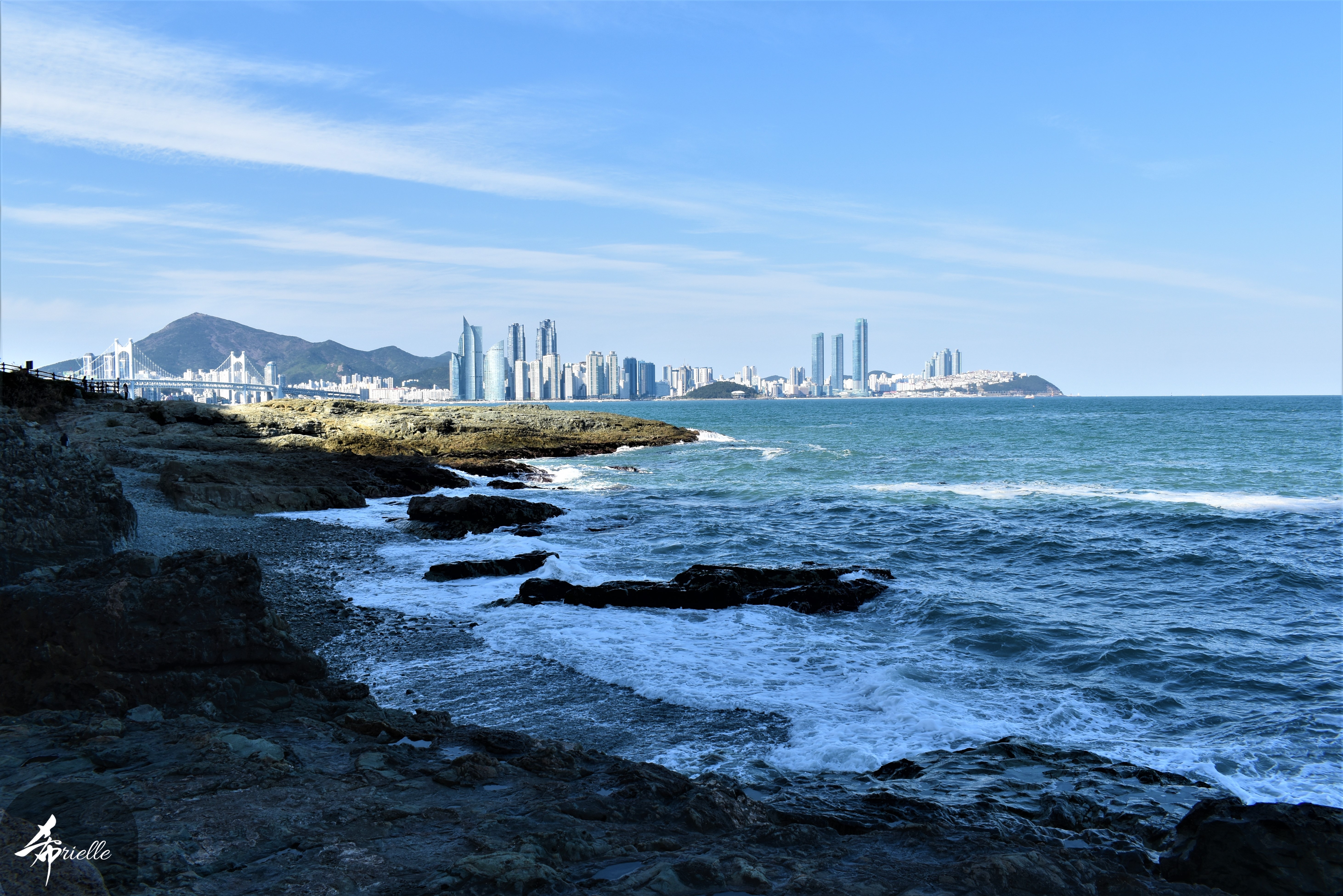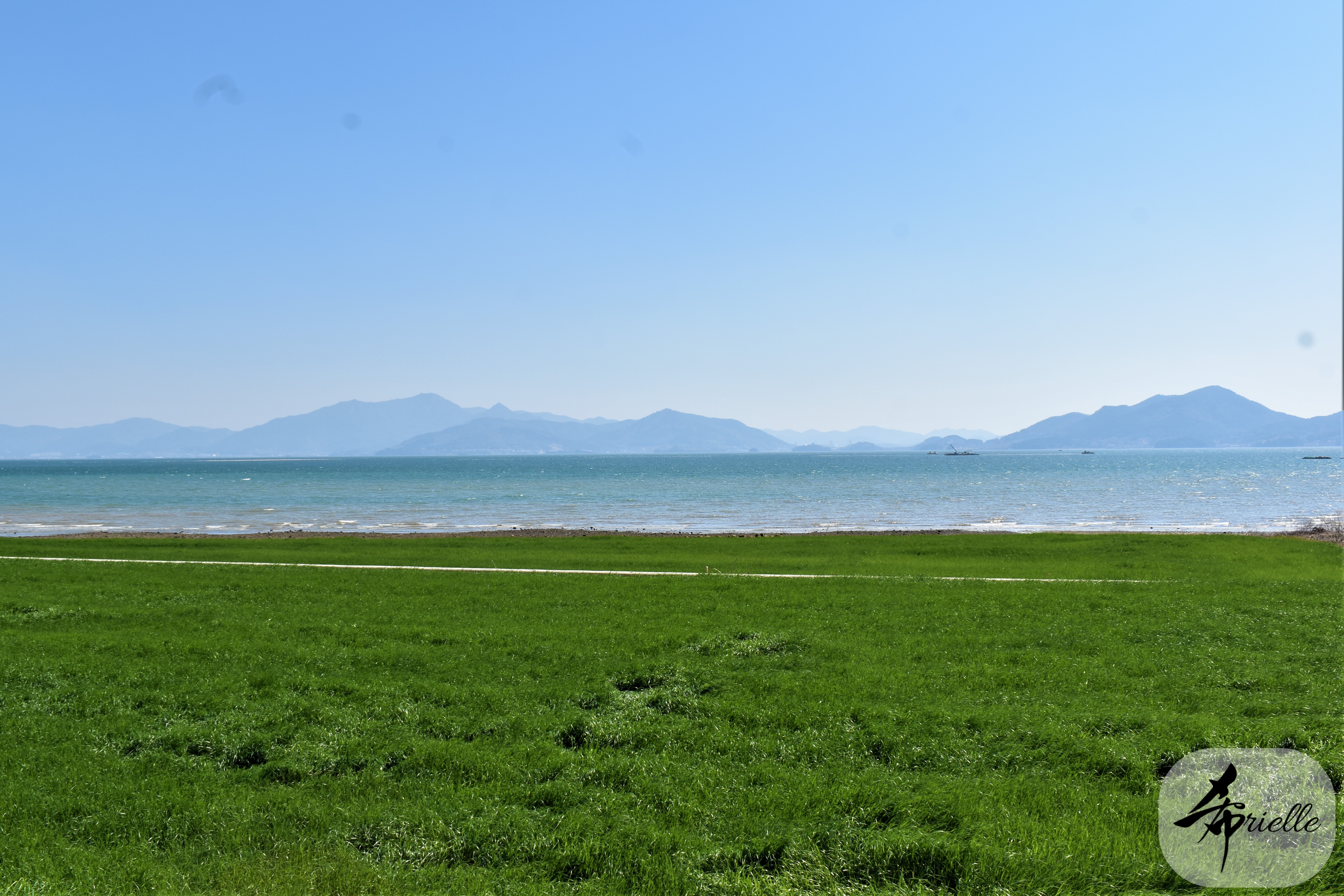 Etant donné que je passe la plupart de mon temps libre soit à la montagne, soit au bord de l’océan, on me demande souvent lequel des deux je préfère. Et bien, honnêtement c’est très difficile à dire mais je crois que là où je me sens le mieux, c’est au sommet d’une montagne offrant une vue sur l’océan. Que ce soit après une randonnée à pieds ou en vélo, il n’y a rien que j’aime plus que le fait de pouvoir finir la journée dans l’eau. Ainsi, l’une des villes où j’aime le plus marcher en Corée, est Tongyeong. Cette ville portuaire, montagneuse est constituée de plusieurs îles accessibles par bateau. Ces trois dernières années, j’ai eu l’occasion de faire le tour de la plupart de ces îles : Bijin, Saryang, Maemul, Seomaemul, Yokji, Suu … Les articles viendront si j’arrive à me tenir à la résolution de publier « plus souvent ». Oui, j’avoue ce n’est pas très précis ni très exigeant comme résolution ! Bref, cette année, j’avais donc envie de rejoindre le sommet de la montagne à Tongyeong qui n’est pas sur une île et ne nécessite donc pas de promenade en bateau. Ainsi, fin avril, j’ai pris le bus jusque là-bas puis un taxi pour rejoindre l’un des temples situés au pied du Mont Mireuk et d’où commence un sentier de randonnée. Encore une fois, il faisait tellement beau que la vue était superbe, en tons de bleu sur bleu. J’étais partie seule donc j’ai pris le temps de prendre toutes les photos que je voulais et profiter de la vue au sommet. Ce jour-là je n’ai pas croisé beaucoup d’autres marcheurs et je crois même que c’est le sentier le plus propre sur lequel j’ai jamais marché. Au sommet, comme le veut la tradition, le peu de personnes présentes, faisaient des photos avec la pierre indiquant le nom et l’altitude du pic. J’avais prévu mon trépied pour en prendre une aussi mais un promeneur venu avec un groupe, qui venait de faire plus d’une quinzaine de photos de ses amis, m’a dit qu’il était photographe et a insisté pour prendre la mienne. Je l’ai donc laissé faire et le résultat était plutôt convaincant. C’est agréable de discuter avec les gens en montagne parce qu’en général, ils sont souriants et sympathiques. Il faut dire qu’il est difficile de ne pas être de bonne humeur, face à la beauté des paysages ! Pour ceux qui le souhaitent, une ligne de cabines téléfériques fait aussi l’aller-retour du port au sommet. Pour ma part, j’ai particulièrement apprécié, une oeuvre d’art installée sur un belvédère offrant une vue vers l’est et sur l’île de Geoje. Il s’agissait d’une sculpture en métal du profil d’une femme regardant au loin. Ce n’est pas la première oeuvre de ce genre que je croise dans la région mais à et endroit, je ne m’y attendais vraiment pas et je l’ai trouvée absolument magnifique !