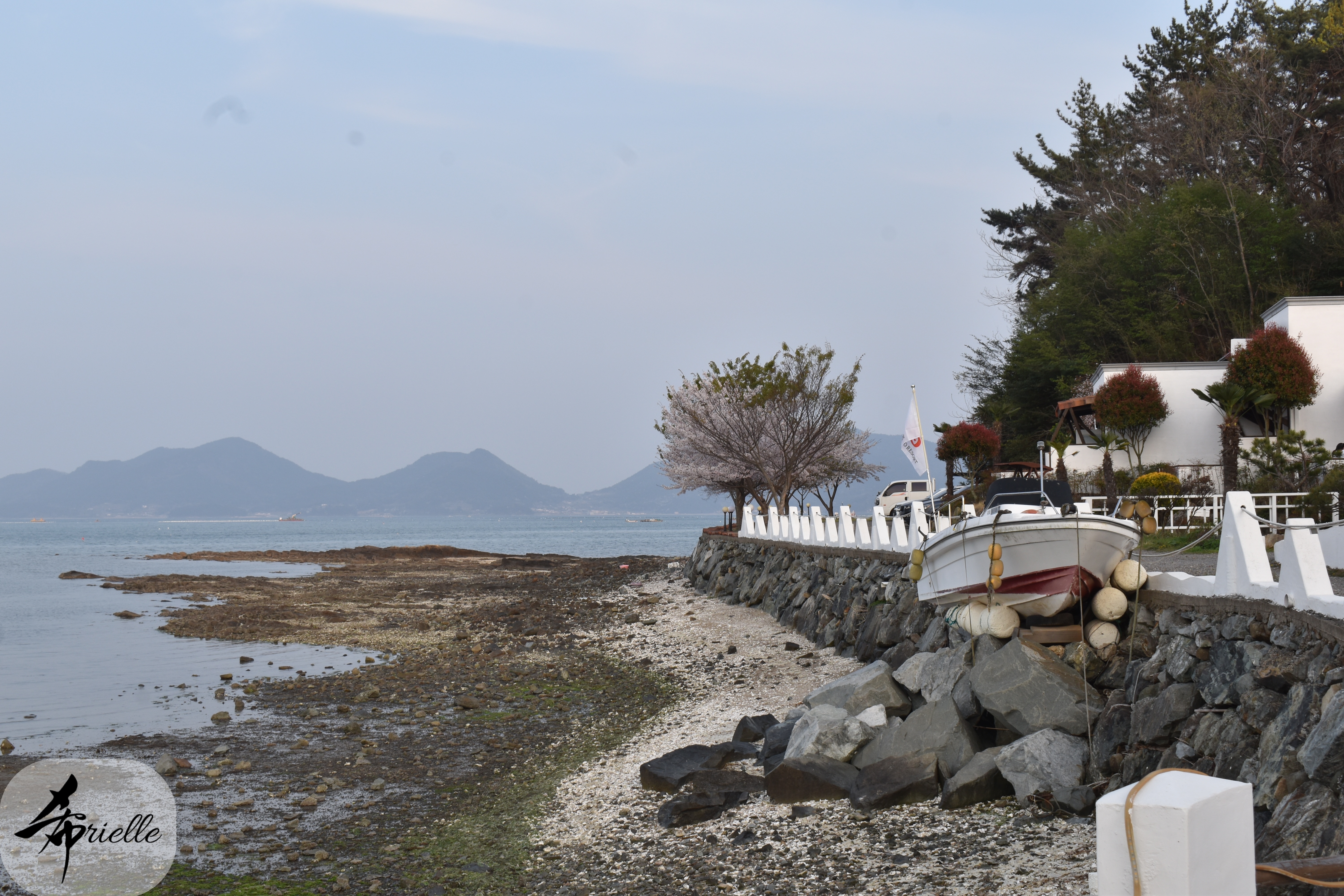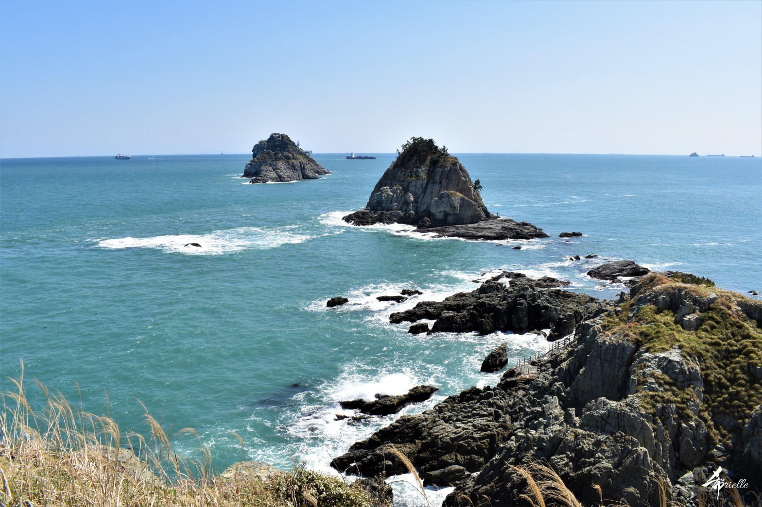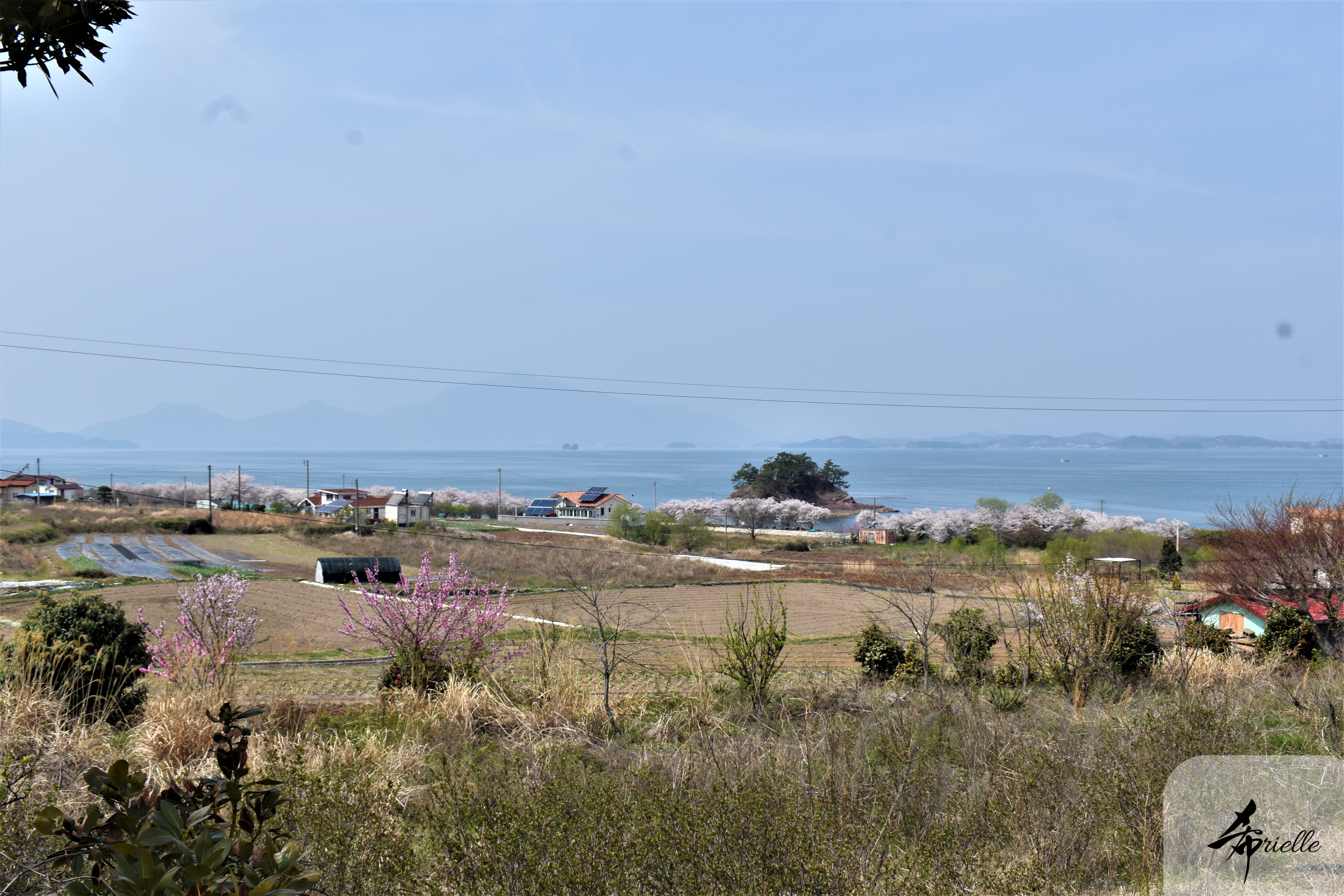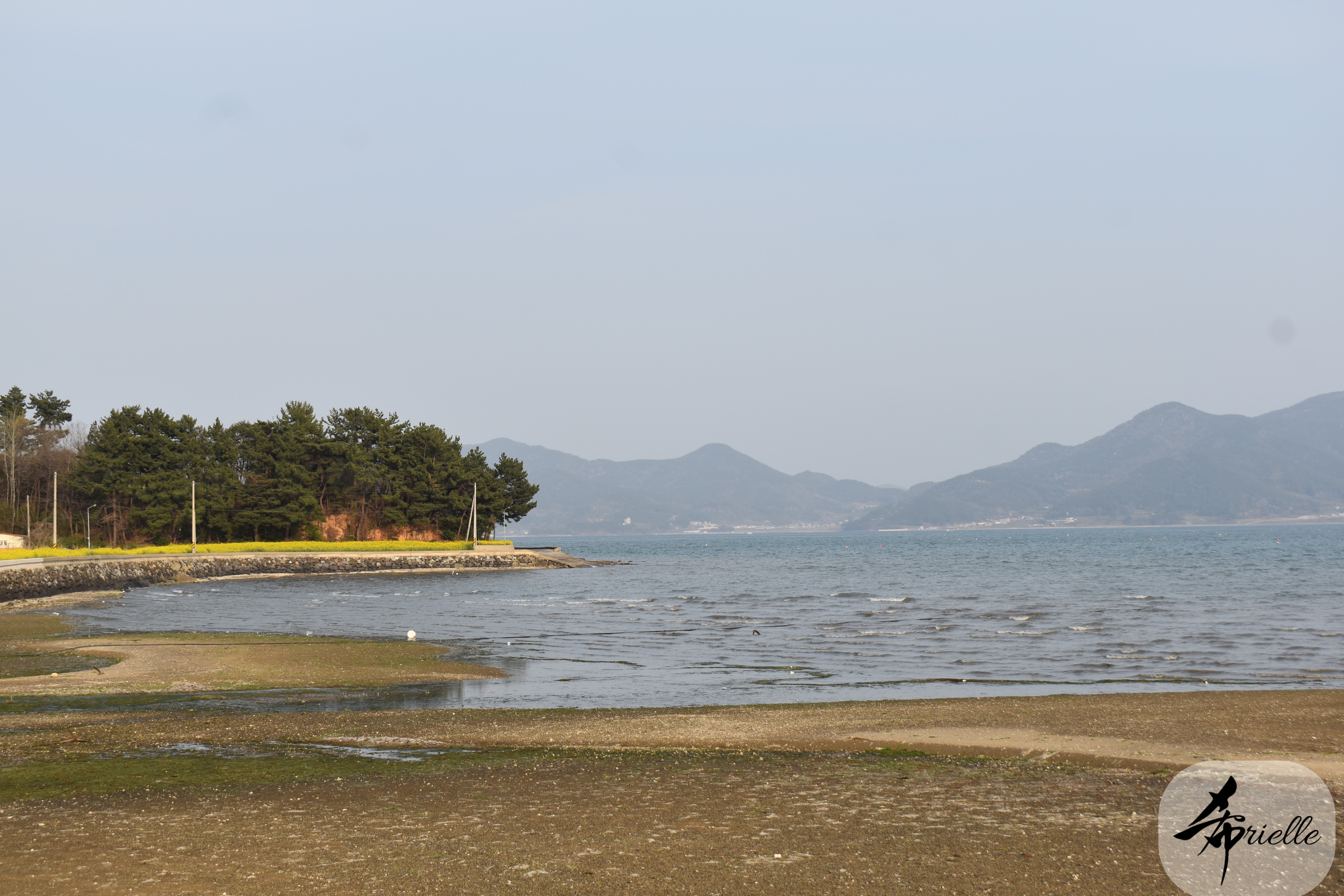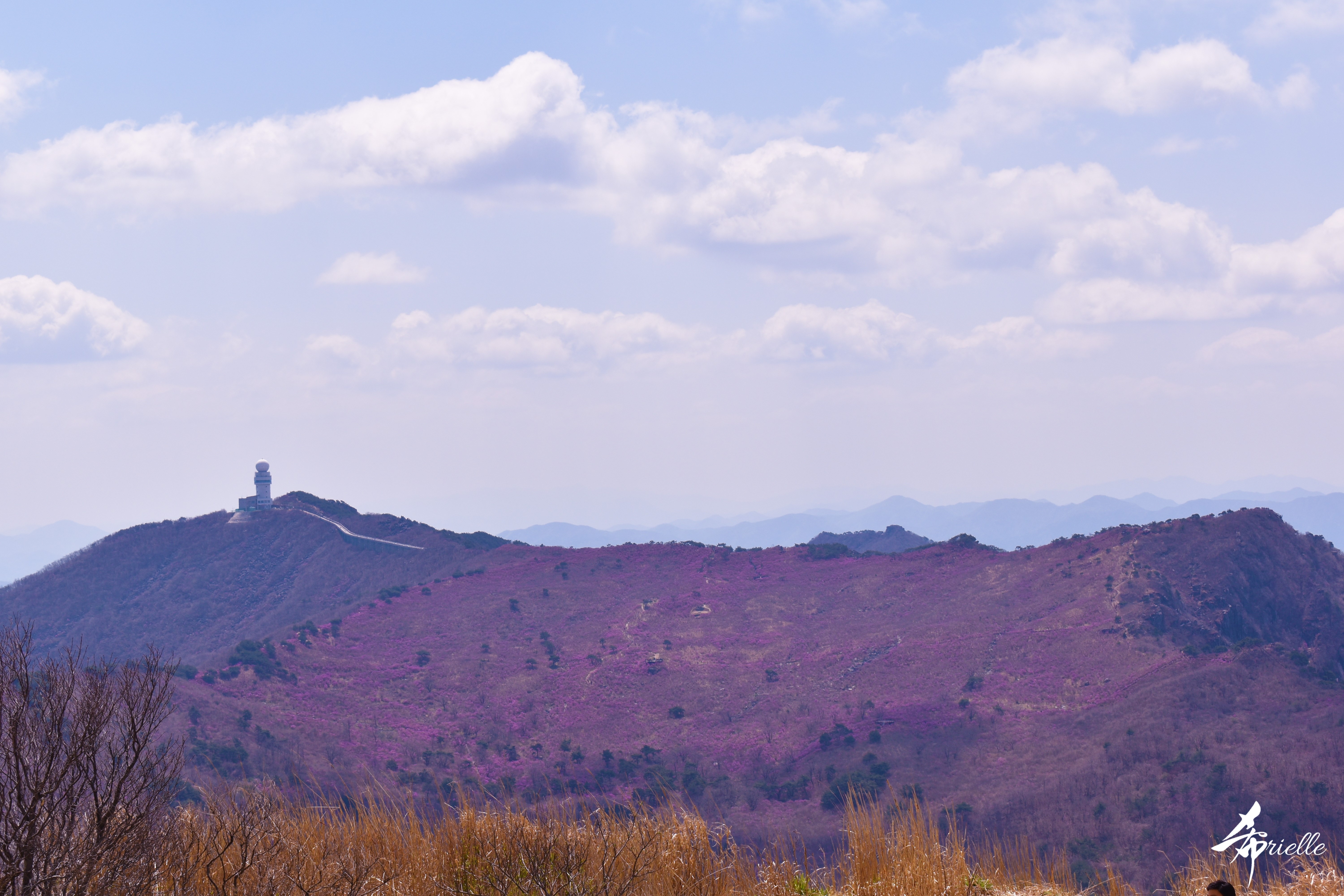 Etant donné que je passe la plupart de mon temps libre soit à la montagne, soit au bord de l’océan, on me demande souvent lequel des deux je préfère. Et bien, honnêtement c’est très difficile à dire mais je crois que là où je me sens le mieux, c’est au sommet d’une montagne offrant une vue sur l’océan. Que ce soit après une randonnée à pieds ou en vélo, il n’y a rien que j’aime plus que le fait de pouvoir finir la journée dans l’eau. Ainsi, l’une des villes où j’aime le plus marcher en Corée, est Tongyeong. Cette ville portuaire, montagneuse est constituée de plusieurs îles accessibles par bateau. Ces trois dernières années, j’ai eu l’occasion de faire le tour de la plupart de ces îles : Bijin, Saryang, Maemul, Seomaemul, Yokji, Suu … Les articles viendront si j’arrive à me tenir à la résolution de publier « plus souvent ». Oui, j’avoue ce n’est pas très précis ni très exigeant comme résolution ! Bref, cette année, j’avais donc envie de rejoindre le sommet de la montagne à Tongyeong qui n’est pas sur une île et ne nécessite donc pas de promenade en bateau. Ainsi, fin avril, j’ai pris le bus jusque là-bas puis un taxi pour rejoindre l’un des temples situés au pied du Mont Mireuk et d’où commence un sentier de randonnée. Encore une fois, il faisait tellement beau que la vue était superbe, en tons de bleu sur bleu. J’étais partie seule donc j’ai pris le temps de prendre toutes les photos que je voulais et profiter de la vue au sommet. Ce jour-là je n’ai pas croisé beaucoup d’autres marcheurs et je crois même que c’est le sentier le plus propre sur lequel j’ai jamais marché. Au sommet, comme le veut la tradition, le peu de personnes présentes, faisaient des photos avec la pierre indiquant le nom et l’altitude du pic. J’avais prévu mon trépied pour en prendre une aussi mais un promeneur venu avec un groupe, qui venait de faire plus d’une quinzaine de photos de ses amis, m’a dit qu’il était photographe et a insisté pour prendre la mienne. Je l’ai donc laissé faire et le résultat était plutôt convaincant. C’est agréable de discuter avec les gens en montagne parce qu’en général, ils sont souriants et sympathiques. Il faut dire qu’il est difficile de ne pas être de bonne humeur, face à la beauté des paysages ! Pour ceux qui le souhaitent, une ligne de cabines téléfériques fait aussi l’aller-retour du port au sommet. Pour ma part, j’ai particulièrement apprécié, une oeuvre d’art installée sur un belvédère offrant une vue vers l’est et sur l’île de Geoje. Il s’agissait d’une sculpture en métal du profil d’une femme regardant au loin. Ce n’est pas la première oeuvre de ce genre que je croise dans la région mais à et endroit, je ne m’y attendais vraiment pas et je l’ai trouvée absolument magnifique !