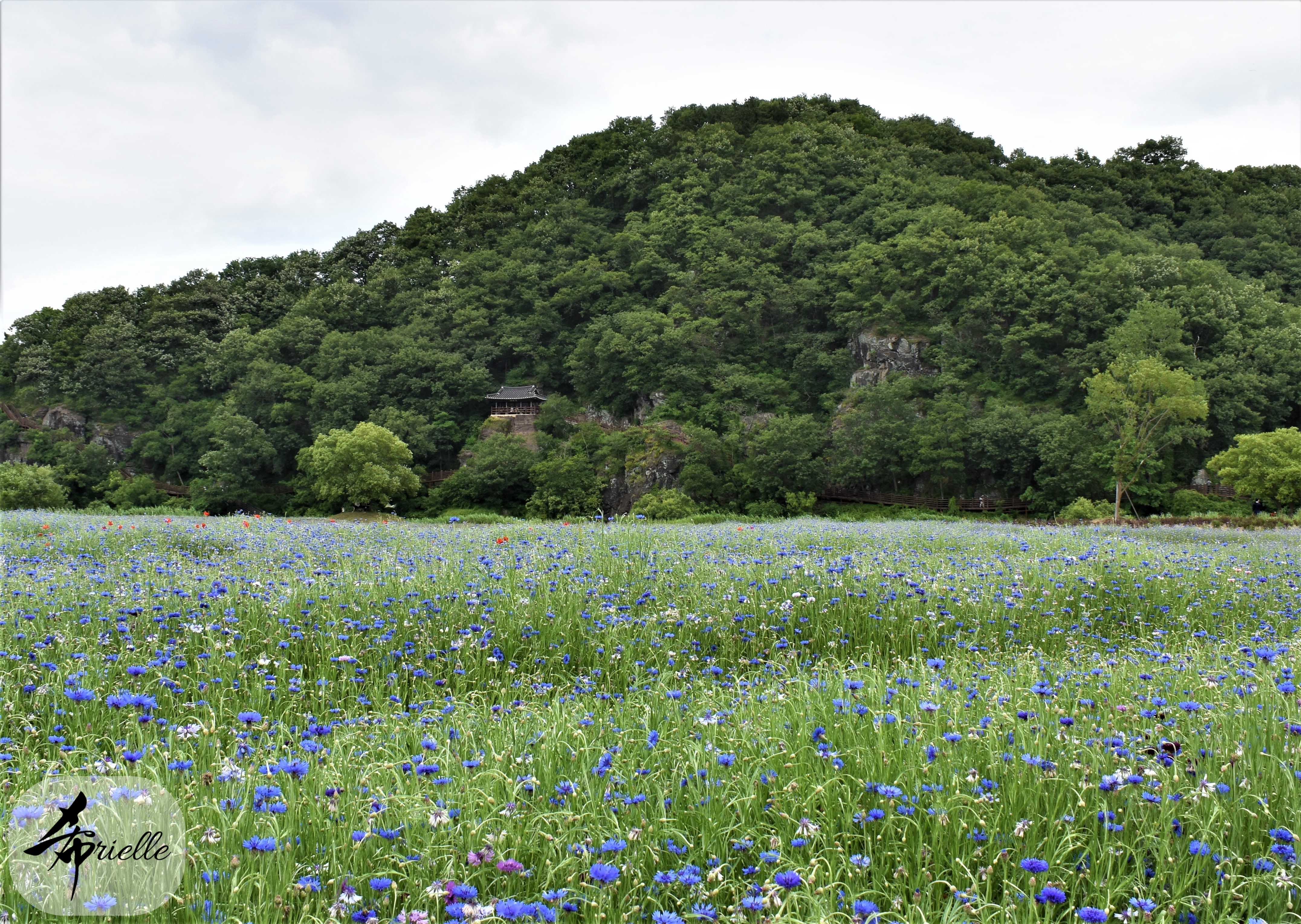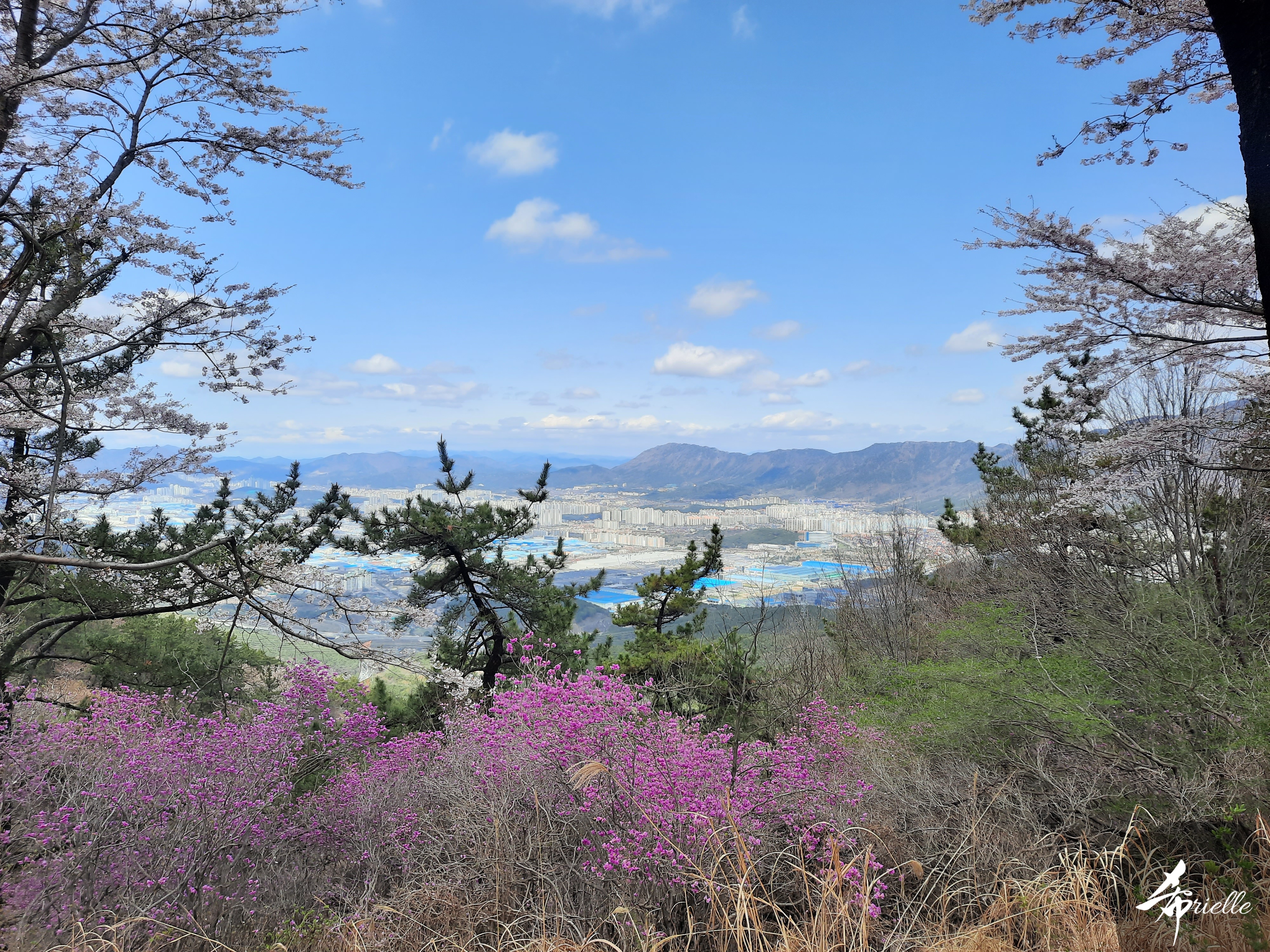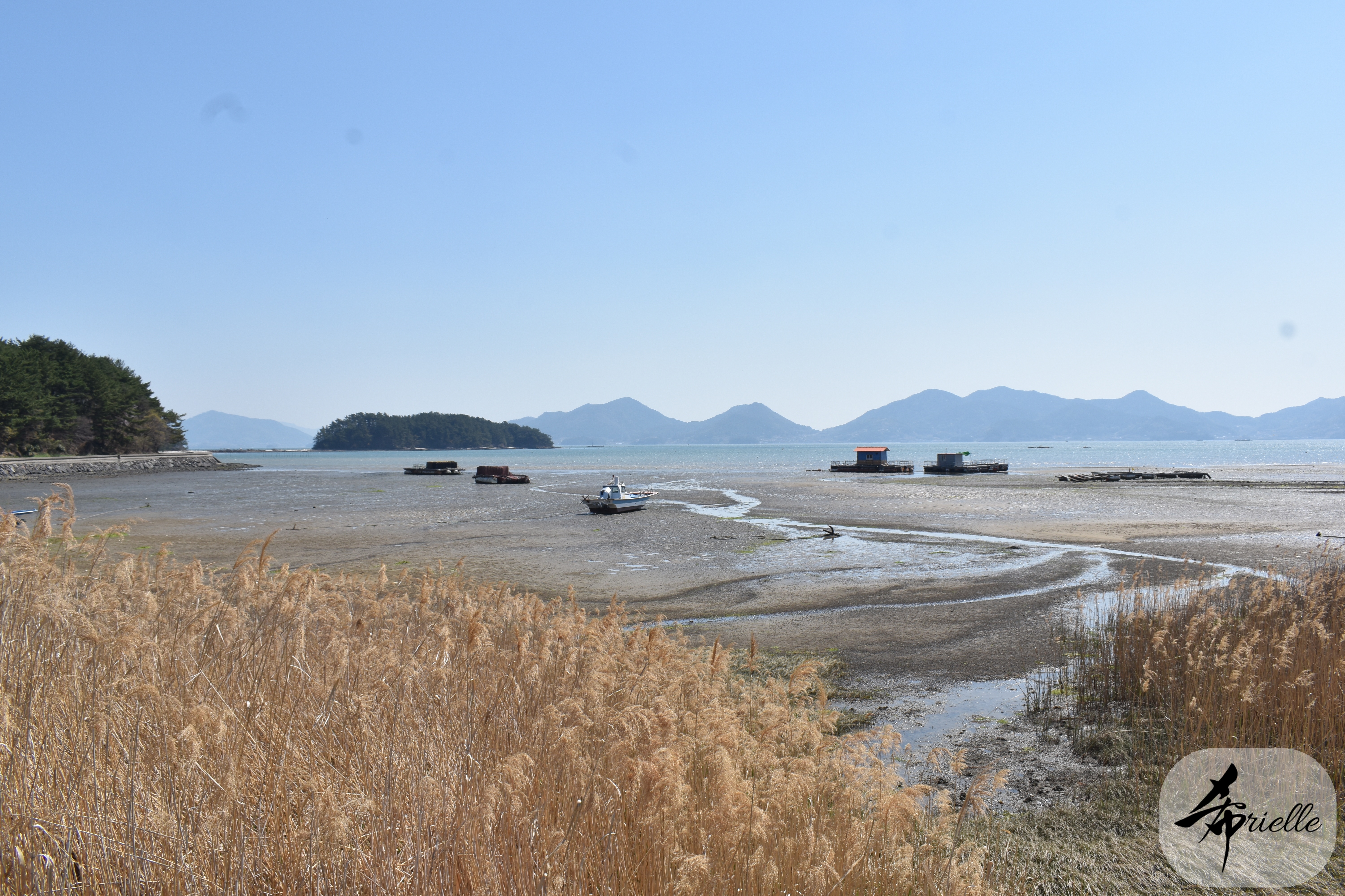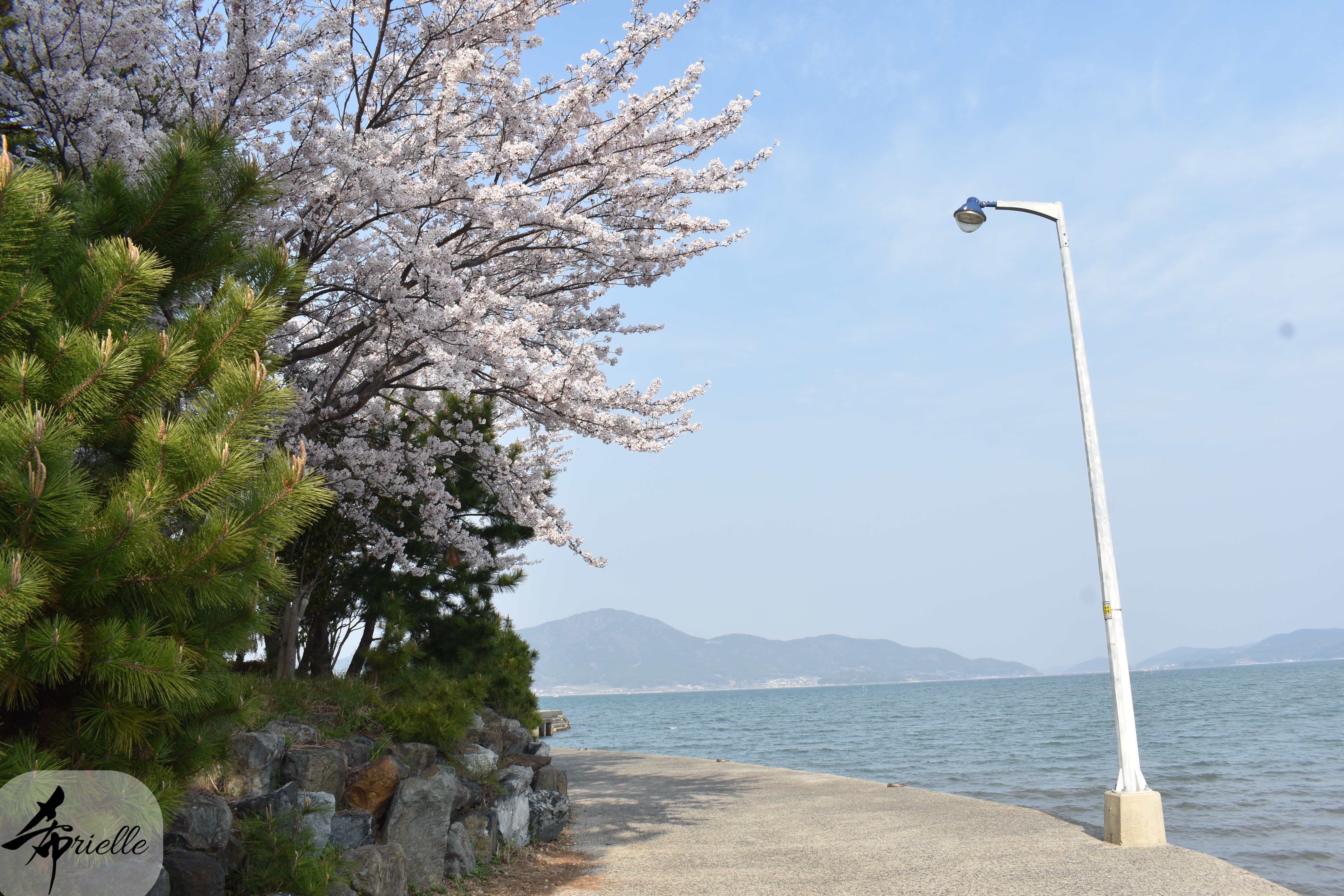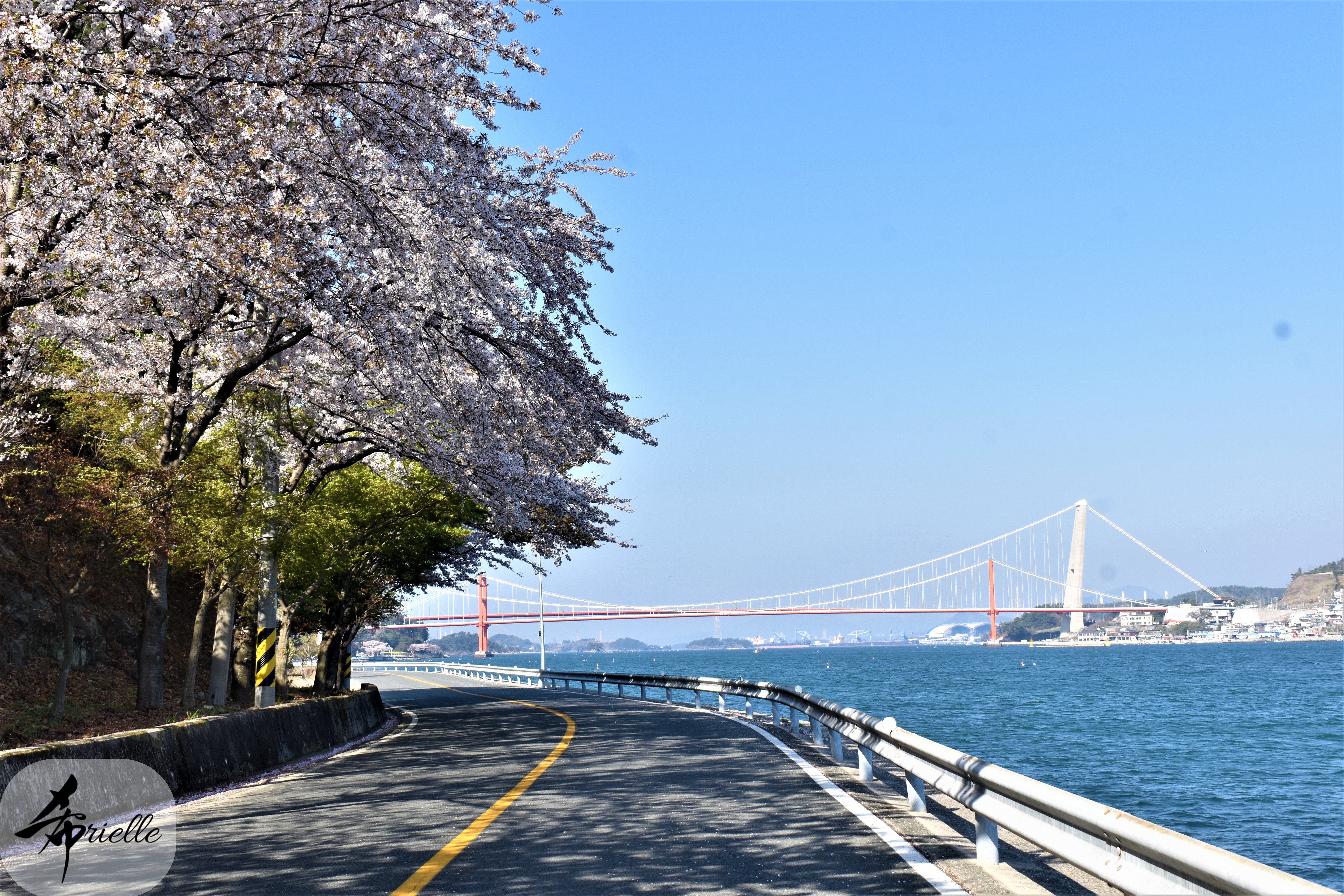Etant donné que je passe la plupart de mon temps libre soit à la montagne, soit au bord de l’océan, on me demande souvent lequel des deux je préfère. Et bien, honnêtement c’est très difficile à dire mais je crois que là où je me sens le mieux, c’est au sommet d’une montagne offrant une vue sur l’océan. Que ce soit après une randonnée à pieds ou en vélo, il n’y a rien que j’aime plus que le fait de pouvoir finir la journée dans l’eau. Ainsi, l’une des villes où j’aime le plus marcher en Corée, est Tongyeong. Cette ville portuaire, montagneuse est constituée de plusieurs îles accessibles par bateau. Ces trois dernières années, j’ai eu l’occasion de faire le tour de la plupart de ces îles : Bijin, Saryang, Maemul, Seomaemul, Yokji, Suu … Les articles viendront si j’arrive à me tenir à la résolution de publier « plus souvent ». Oui, j’avoue ce n’est pas très précis ni très exigeant comme résolution ! Bref, cette année, j’avais donc envie de rejoindre le sommet de la montagne à Tongyeong qui n’est pas sur une île et ne nécessite donc pas de promenade en bateau. Ainsi, fin avril, j’ai pris le bus jusque là-bas puis un taxi pour rejoindre l’un des temples situés au pied du Mont Mireuk et d’où commence un sentier de randonnée. Encore une fois, il faisait tellement beau que la vue était superbe, en tons de bleu sur bleu. J’étais partie seule donc j’ai pris le temps de prendre toutes les photos que je voulais et profiter de la vue au sommet. Ce jour-là je n’ai pas croisé beaucoup d’autres marcheurs et je crois même que c’est le sentier le plus propre sur lequel j’ai jamais marché. Au sommet, comme le veut la tradition, le peu de personnes présentes, faisaient des photos avec la pierre indiquant le nom et l’altitude du pic. J’avais prévu mon trépied pour en prendre une aussi mais un promeneur venu avec un groupe, qui venait de faire plus d’une quinzaine de photos de ses amis, m’a dit qu’il était photographe et a insisté pour prendre la mienne. Je l’ai donc laissé faire et le résultat était plutôt convaincant. C’est agréable de discuter avec les gens en montagne parce qu’en général, ils sont souriants et sympathiques. Il faut dire qu’il est difficile de ne pas être de bonne humeur, face à la beauté des paysages ! Pour ceux qui le souhaitent, une ligne de cabines téléfériques fait aussi l’aller-retour du port au sommet. Pour ma part, j’ai particulièrement apprécié, une oeuvre d’art installée sur un belvédère offrant une vue vers l’est et sur l’île de Geoje. Il s’agissait d’une sculpture en métal du profil d’une femme regardant au loin. Ce n’est pas la première oeuvre de ce genre que je croise dans la région mais à et endroit, je ne m’y attendais vraiment pas et je l’ai trouvée absolument magnifique !