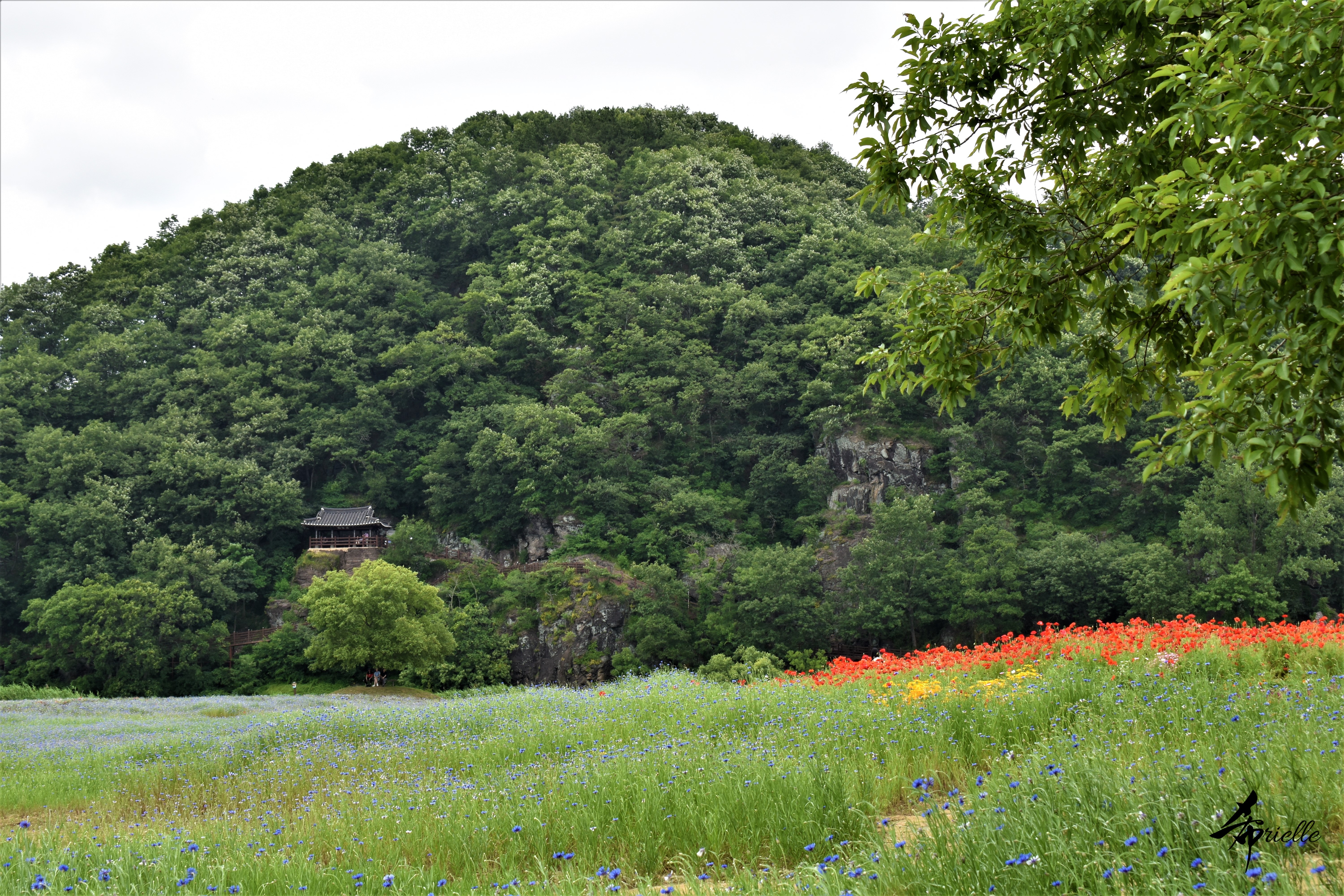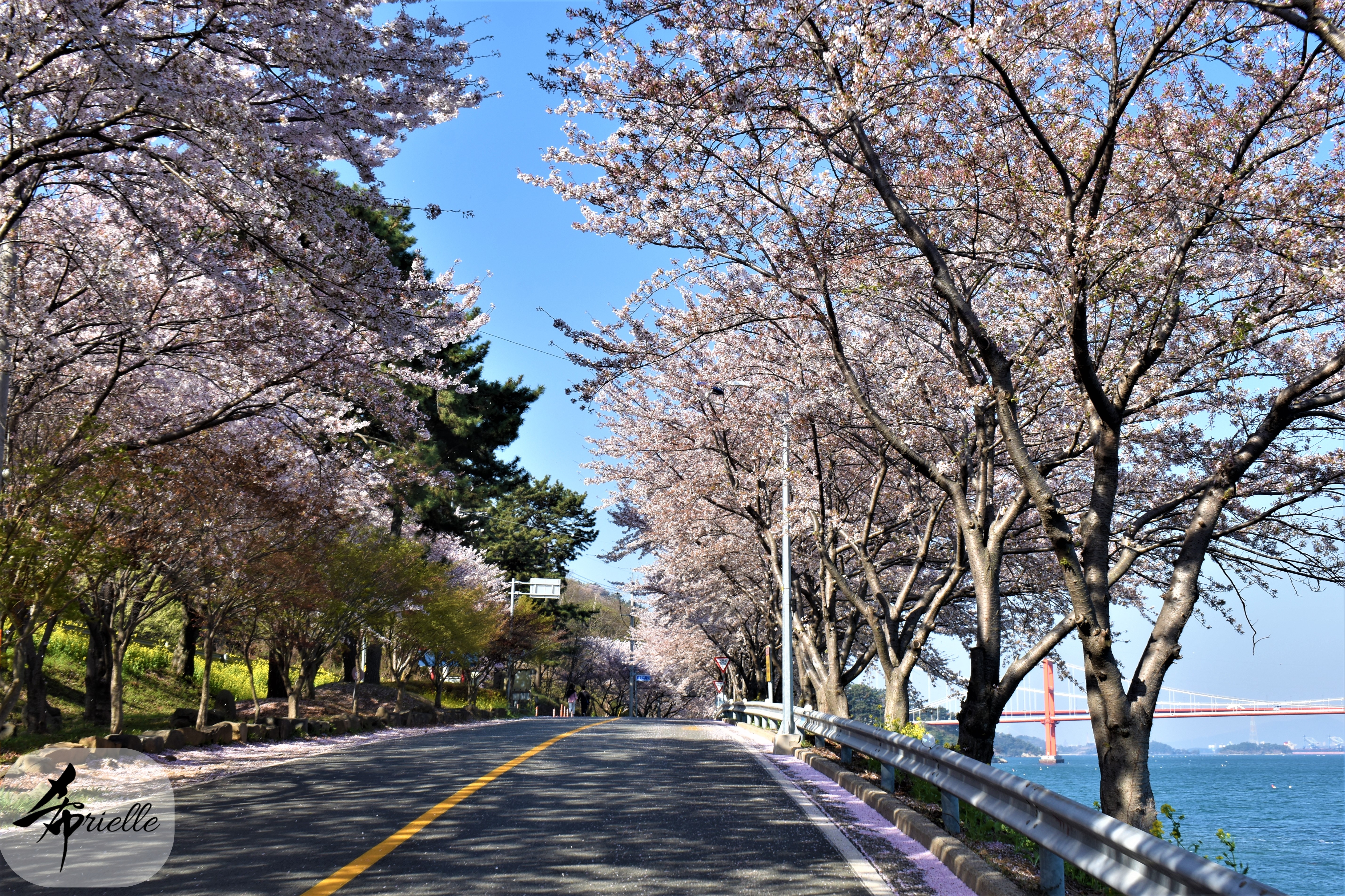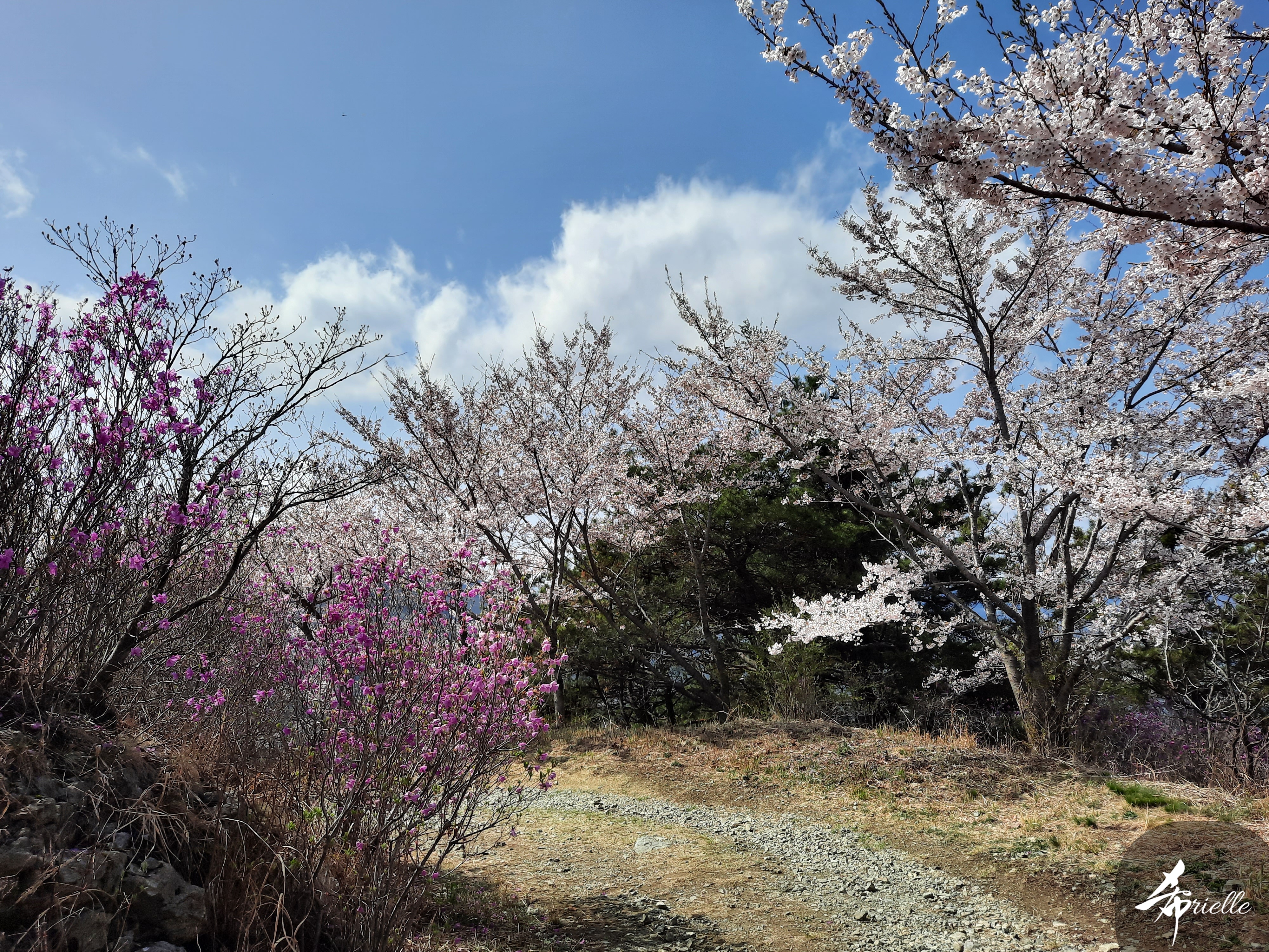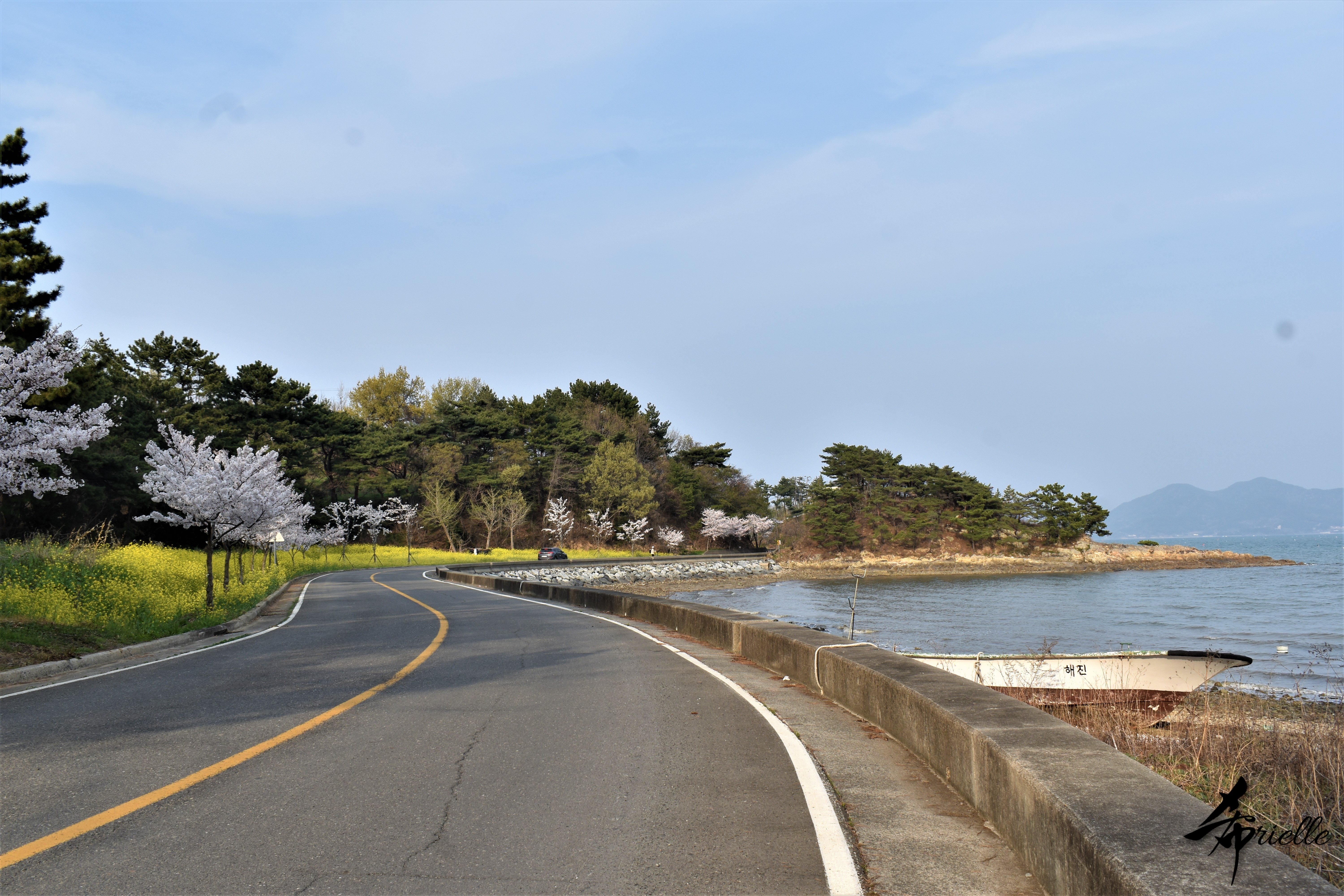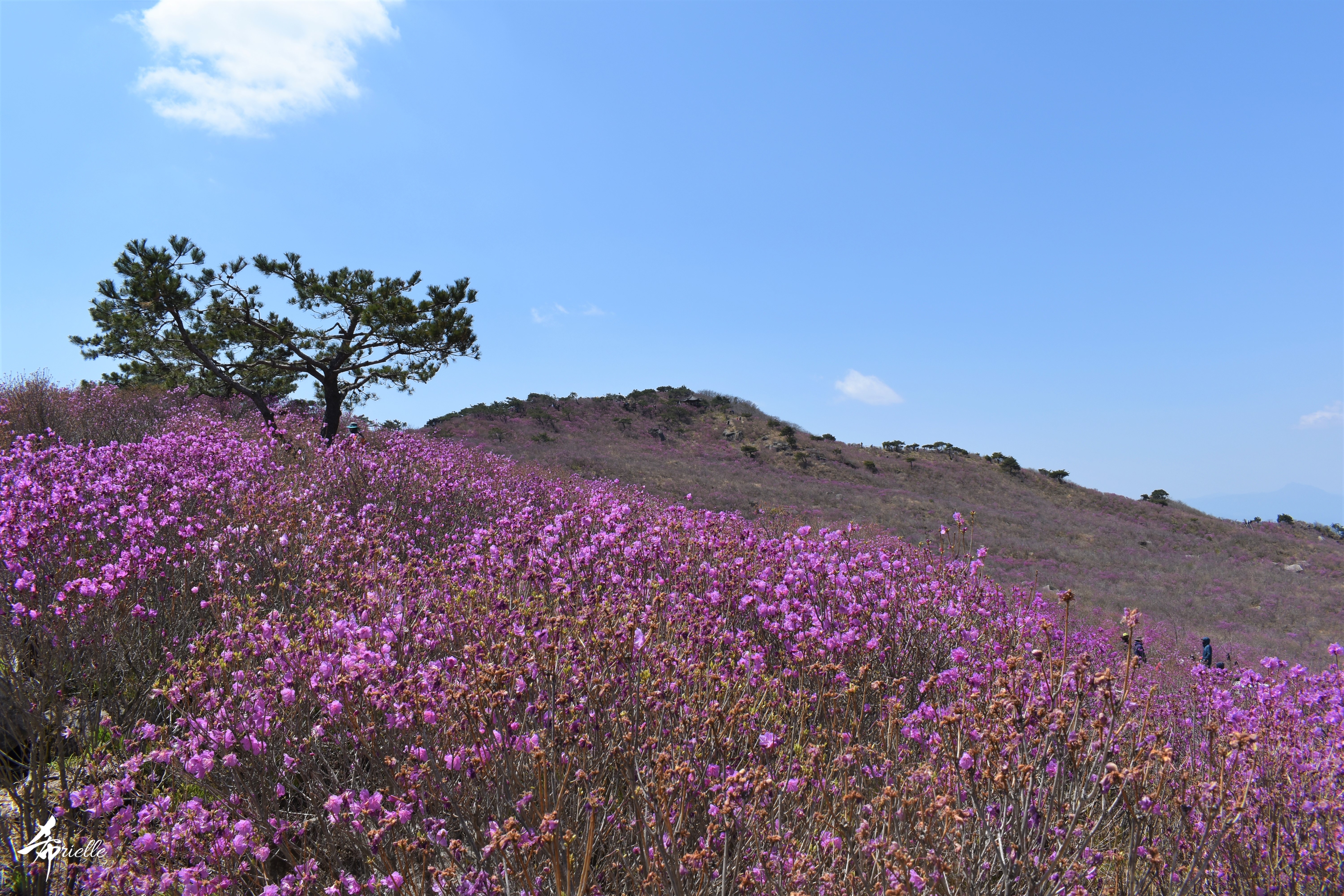Etant donné que je passe la plupart de mon temps libre soit à la montagne, soit au bord de l’océan, on me demande souvent lequel des deux je préfère. Et bien, honnêtement c’est très difficile à dire mais je crois que là où je me sens le mieux, c’est au sommet d’une montagne offrant une vue sur l’océan. Que ce soit après une randonnée à pieds ou en vélo, il n’y a rien que j’aime plus que le fait de pouvoir finir la journée dans l’eau. Ainsi, l’une des villes où j’aime le plus marcher en Corée, est Tongyeong. Cette ville portuaire, montagneuse est constituée de plusieurs îles accessibles par bateau. Ces trois dernières années, j’ai eu l’occasion de faire le tour de la plupart de ces îles : Bijin, Saryang, Maemul, Seomaemul, Yokji, Suu … Les articles viendront si j’arrive à me tenir à la résolution de publier « plus souvent ». Oui, j’avoue ce n’est pas très précis ni très exigeant comme résolution ! Bref, cette année, j’avais donc envie de rejoindre le sommet de la montagne à Tongyeong qui n’est pas sur une île et ne nécessite donc pas de promenade en bateau. Ainsi, fin avril, j’ai pris le bus jusque là-bas puis un taxi pour rejoindre l’un des temples situés au pied du Mont Mireuk et d’où commence un sentier de randonnée. Encore une fois, il faisait tellement beau que la vue était superbe, en tons de bleu sur bleu. J’étais partie seule donc j’ai pris le temps de prendre toutes les photos que je voulais et profiter de la vue au sommet. Ce jour-là je n’ai pas croisé beaucoup d’autres marcheurs et je crois même que c’est le sentier le plus propre sur lequel j’ai jamais marché. Au sommet, comme le veut la tradition, le peu de personnes présentes, faisaient des photos avec la pierre indiquant le nom et l’altitude du pic. J’avais prévu mon trépied pour en prendre une aussi mais un promeneur venu avec un groupe, qui venait de faire plus d’une quinzaine de photos de ses amis, m’a dit qu’il était photographe et a insisté pour prendre la mienne. Je l’ai donc laissé faire et le résultat était plutôt convaincant. C’est agréable de discuter avec les gens en montagne parce qu’en général, ils sont souriants et sympathiques. Il faut dire qu’il est difficile de ne pas être de bonne humeur, face à la beauté des paysages ! Pour ceux qui le souhaitent, une ligne de cabines téléfériques fait aussi l’aller-retour du port au sommet. Pour ma part, j’ai particulièrement apprécié, une oeuvre d’art installée sur un belvédère offrant une vue vers l’est et sur l’île de Geoje. Il s’agissait d’une sculpture en métal du profil d’une femme regardant au loin. Ce n’est pas la première oeuvre de ce genre que je croise dans la région mais à et endroit, je ne m’y attendais vraiment pas et je l’ai trouvée absolument magnifique !
