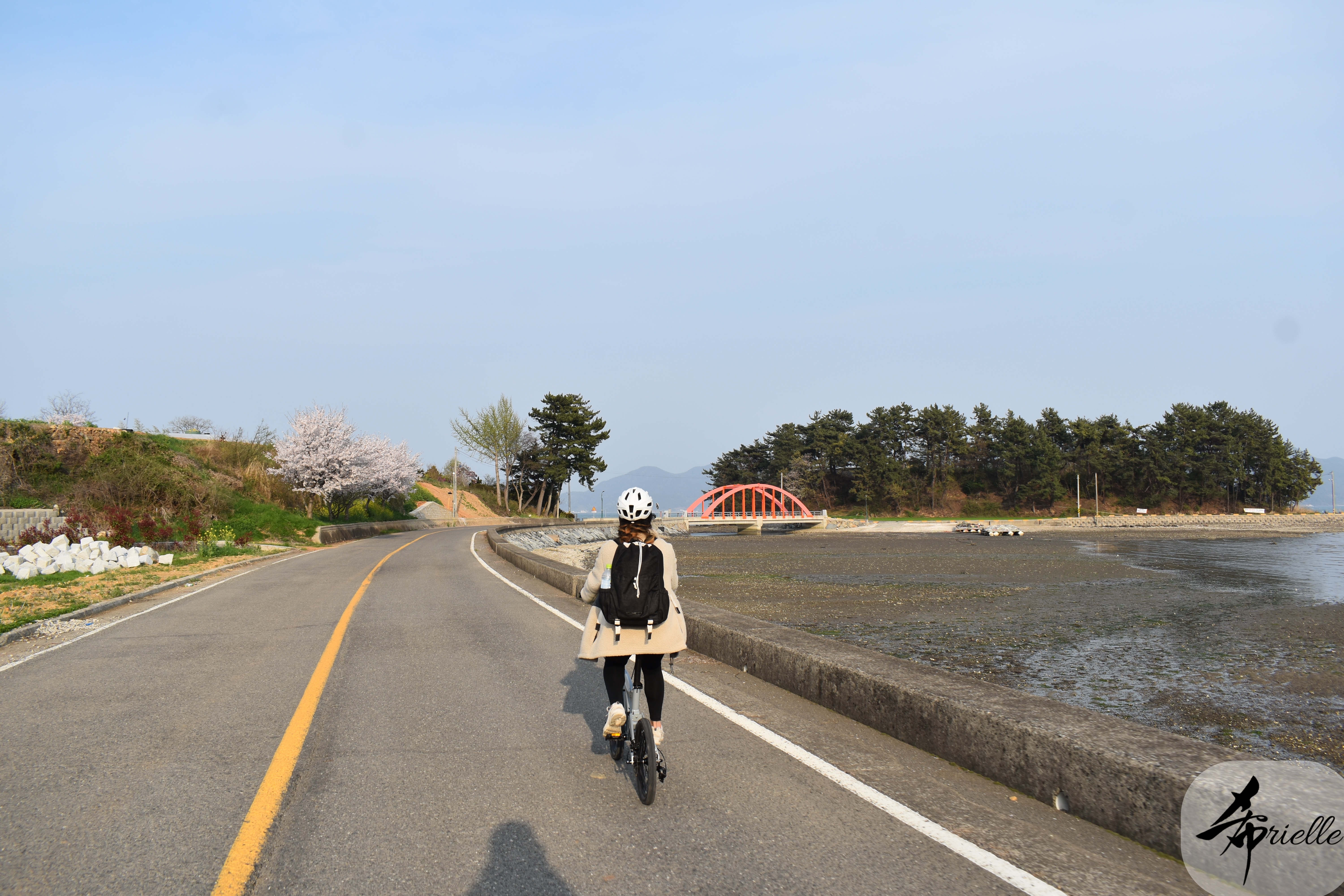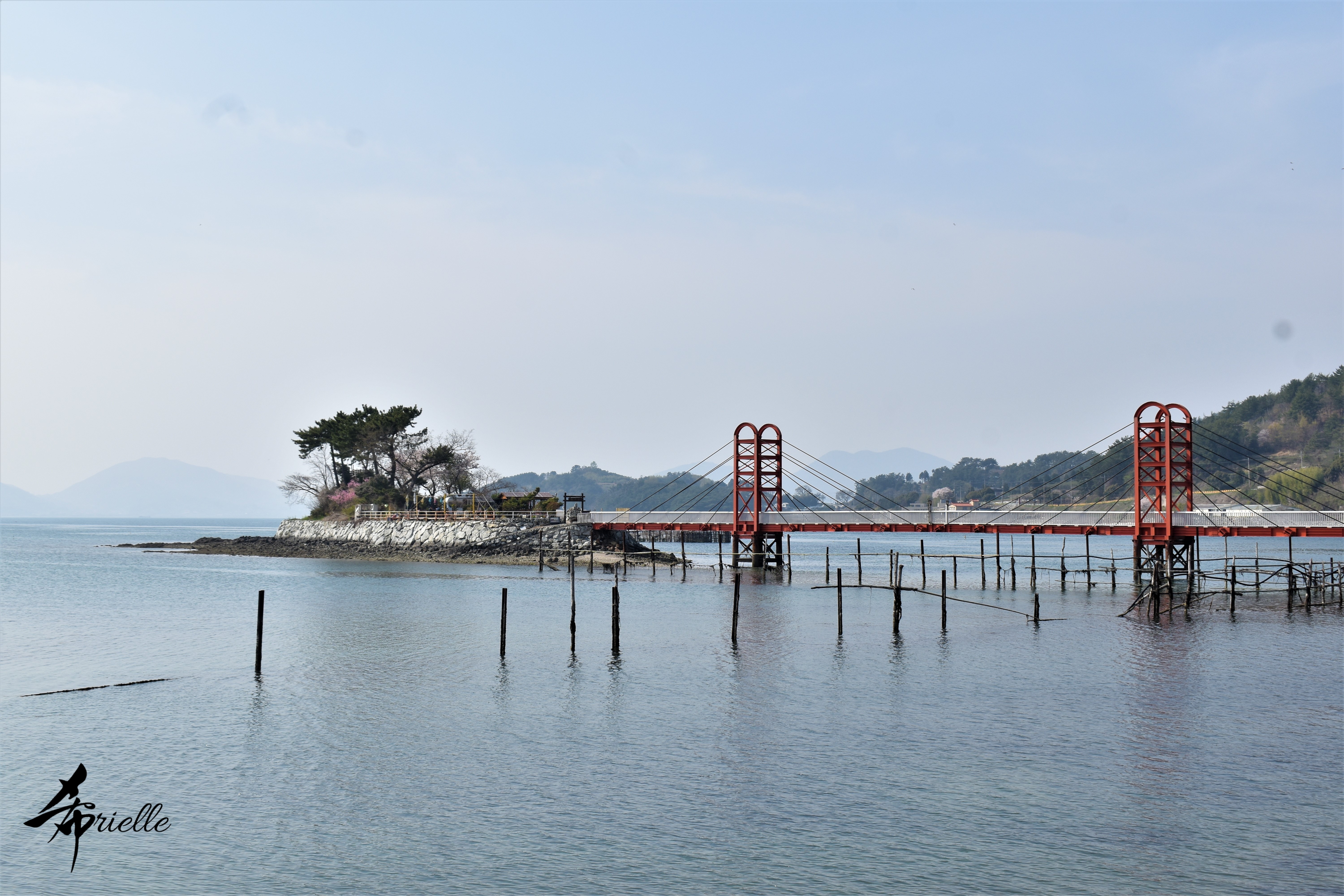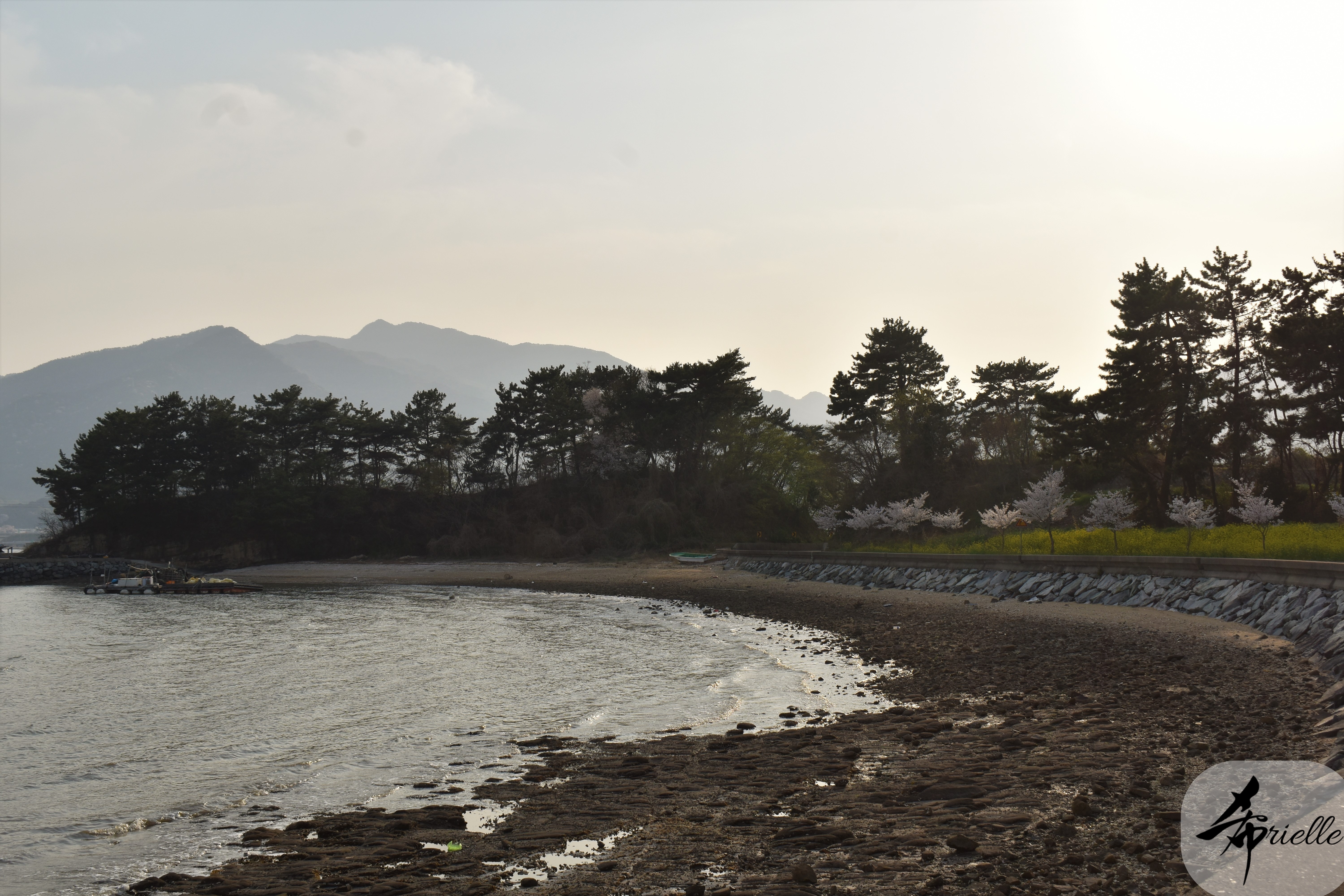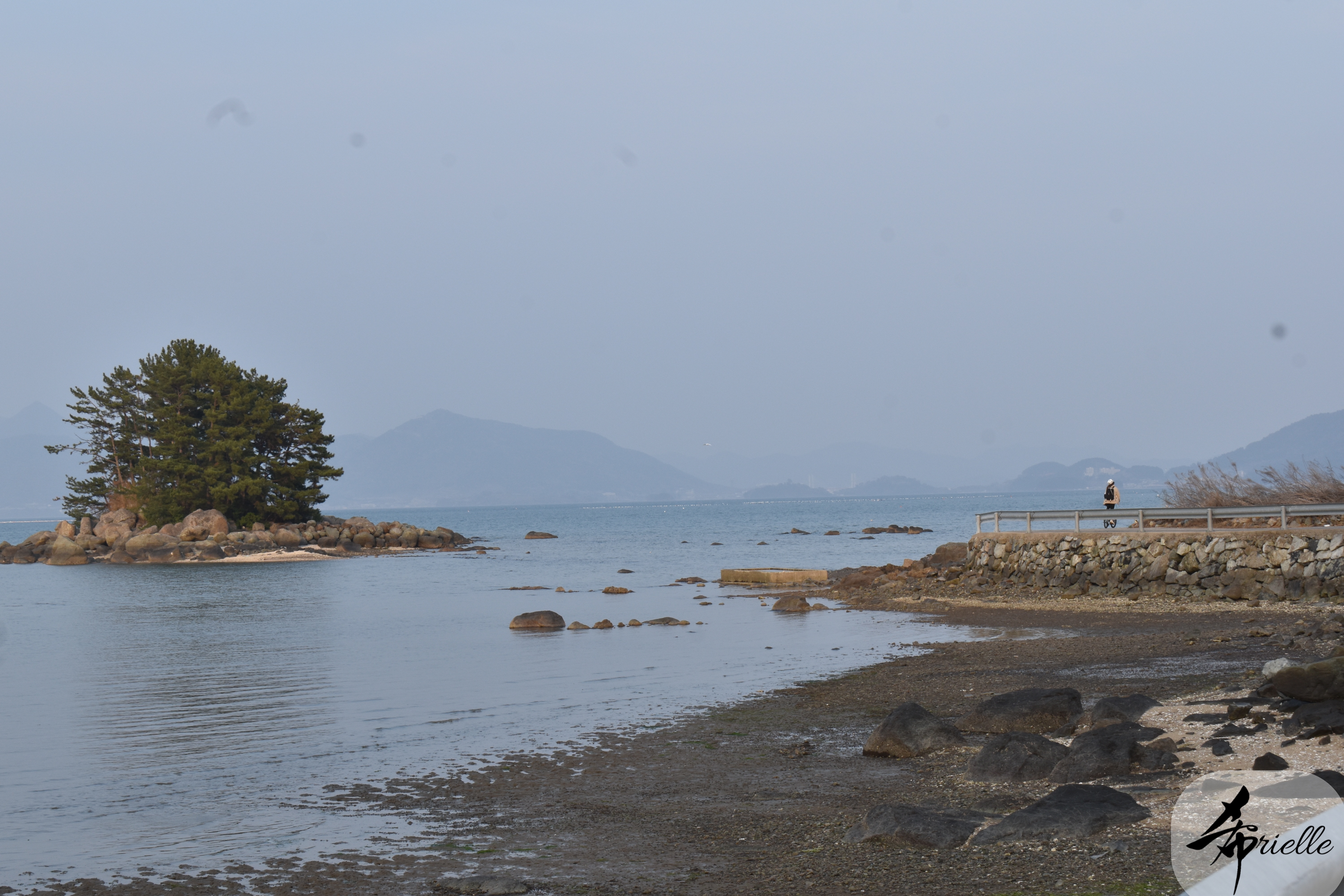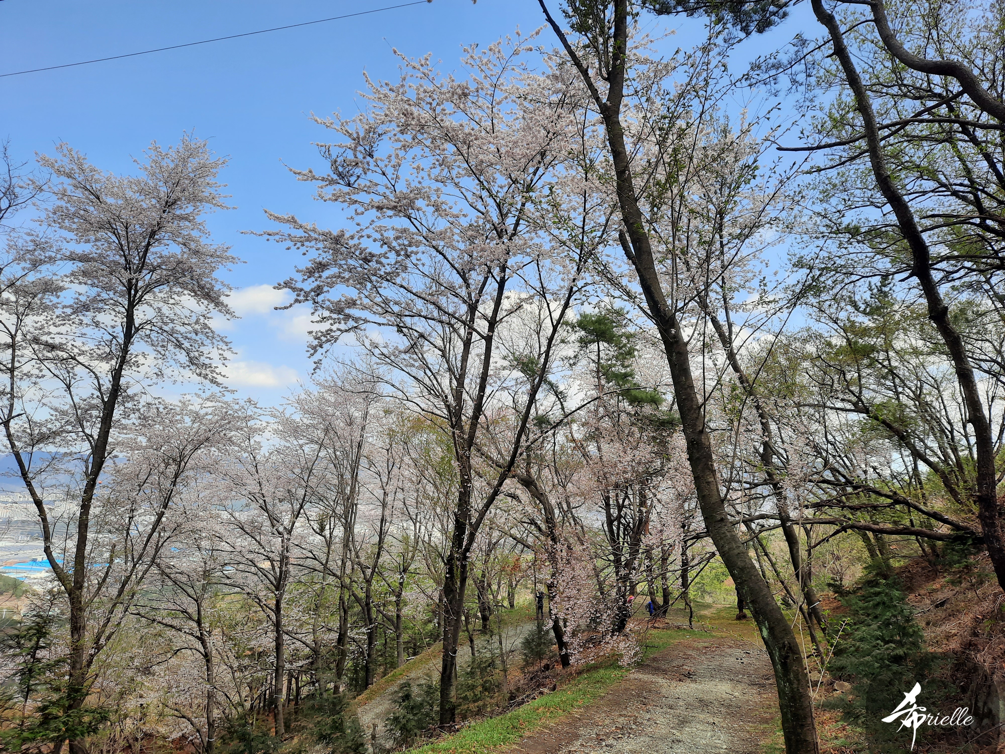Etant donné que je passe la plupart de mon temps libre soit à la montagne, soit au bord de l’océan, on me demande souvent lequel des deux je préfère. Et bien, honnêtement c’est très difficile à dire mais je crois que là où je me sens le mieux, c’est au sommet d’une montagne offrant une vue sur l’océan. Que ce soit après une randonnée à pieds ou en vélo, il n’y a rien que j’aime plus que le fait de pouvoir finir la journée dans l’eau. Ainsi, l’une des villes où j’aime le plus marcher en Corée, est Tongyeong. Cette ville portuaire, montagneuse est constituée de plusieurs îles accessibles par bateau. Ces trois dernières années, j’ai eu l’occasion de faire le tour de la plupart de ces îles : Bijin, Saryang, Maemul, Seomaemul, Yokji, Suu … Les articles viendront si j’arrive à me tenir à la résolution de publier « plus souvent ». Oui, j’avoue ce n’est pas très précis ni très exigeant comme résolution ! Bref, cette année, j’avais donc envie de rejoindre le sommet de la montagne à Tongyeong qui n’est pas sur une île et ne nécessite donc pas de promenade en bateau. Ainsi, fin avril, j’ai pris le bus jusque là-bas puis un taxi pour rejoindre l’un des temples situés au pied du Mont Mireuk et d’où commence un sentier de randonnée. Encore une fois, il faisait tellement beau que la vue était superbe, en tons de bleu sur bleu. J’étais partie seule donc j’ai pris le temps de prendre toutes les photos que je voulais et profiter de la vue au sommet. Ce jour-là je n’ai pas croisé beaucoup d’autres marcheurs et je crois même que c’est le sentier le plus propre sur lequel j’ai jamais marché. Au sommet, comme le veut la tradition, le peu de personnes présentes, faisaient des photos avec la pierre indiquant le nom et l’altitude du pic. J’avais prévu mon trépied pour en prendre une aussi mais un promeneur venu avec un groupe, qui venait de faire plus d’une quinzaine de photos de ses amis, m’a dit qu’il était photographe et a insisté pour prendre la mienne. Je l’ai donc laissé faire et le résultat était plutôt convaincant. C’est agréable de discuter avec les gens en montagne parce qu’en général, ils sont souriants et sympathiques. Il faut dire qu’il est difficile de ne pas être de bonne humeur, face à la beauté des paysages ! Pour ceux qui le souhaitent, une ligne de cabines téléfériques fait aussi l’aller-retour du port au sommet. Pour ma part, j’ai particulièrement apprécié, une oeuvre d’art installée sur un belvédère offrant une vue vers l’est et sur l’île de Geoje. Il s’agissait d’une sculpture en métal du profil d’une femme regardant au loin. Ce n’est pas la première oeuvre de ce genre que je croise dans la région mais à et endroit, je ne m’y attendais vraiment pas et je l’ai trouvée absolument magnifique !