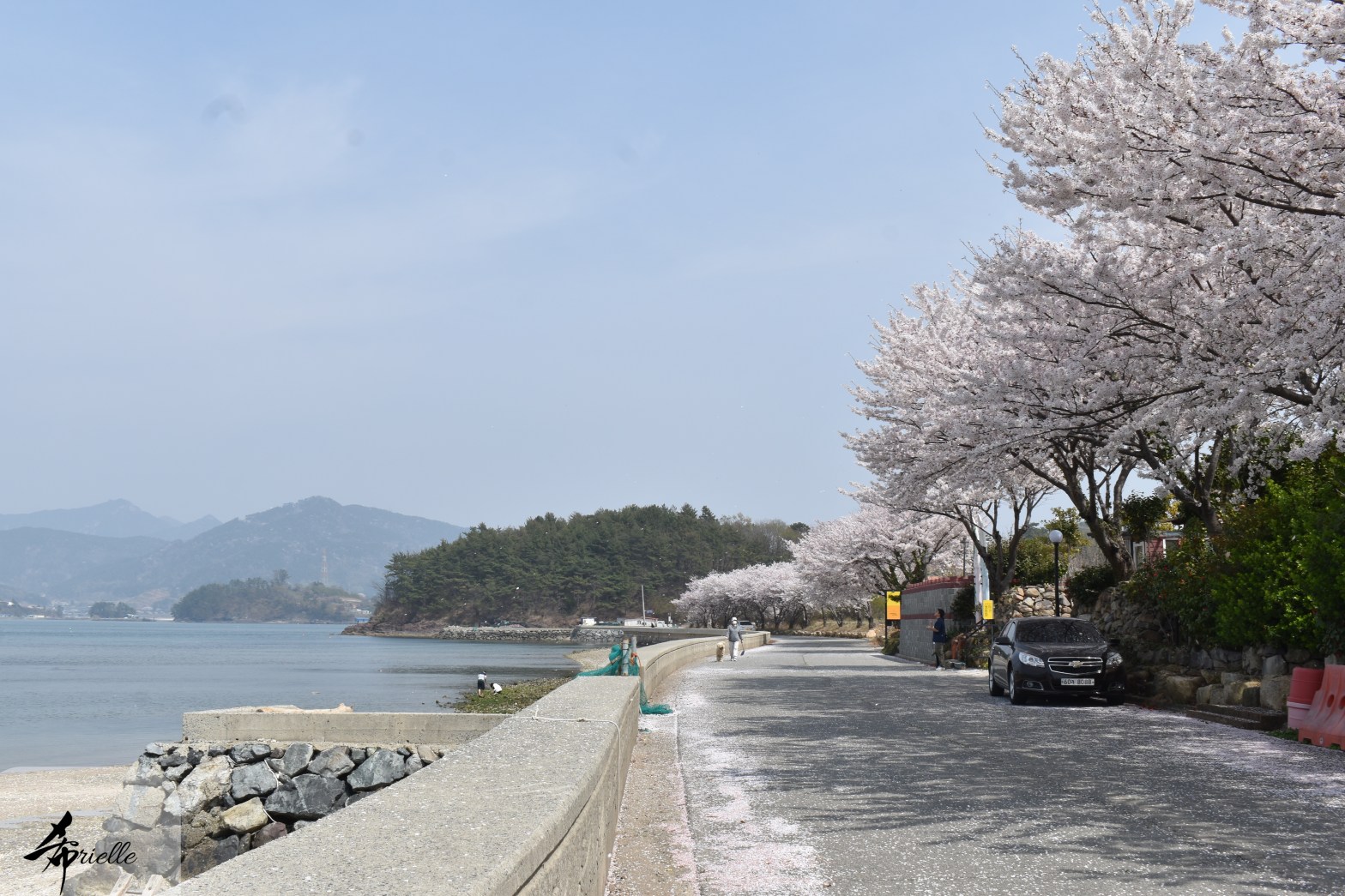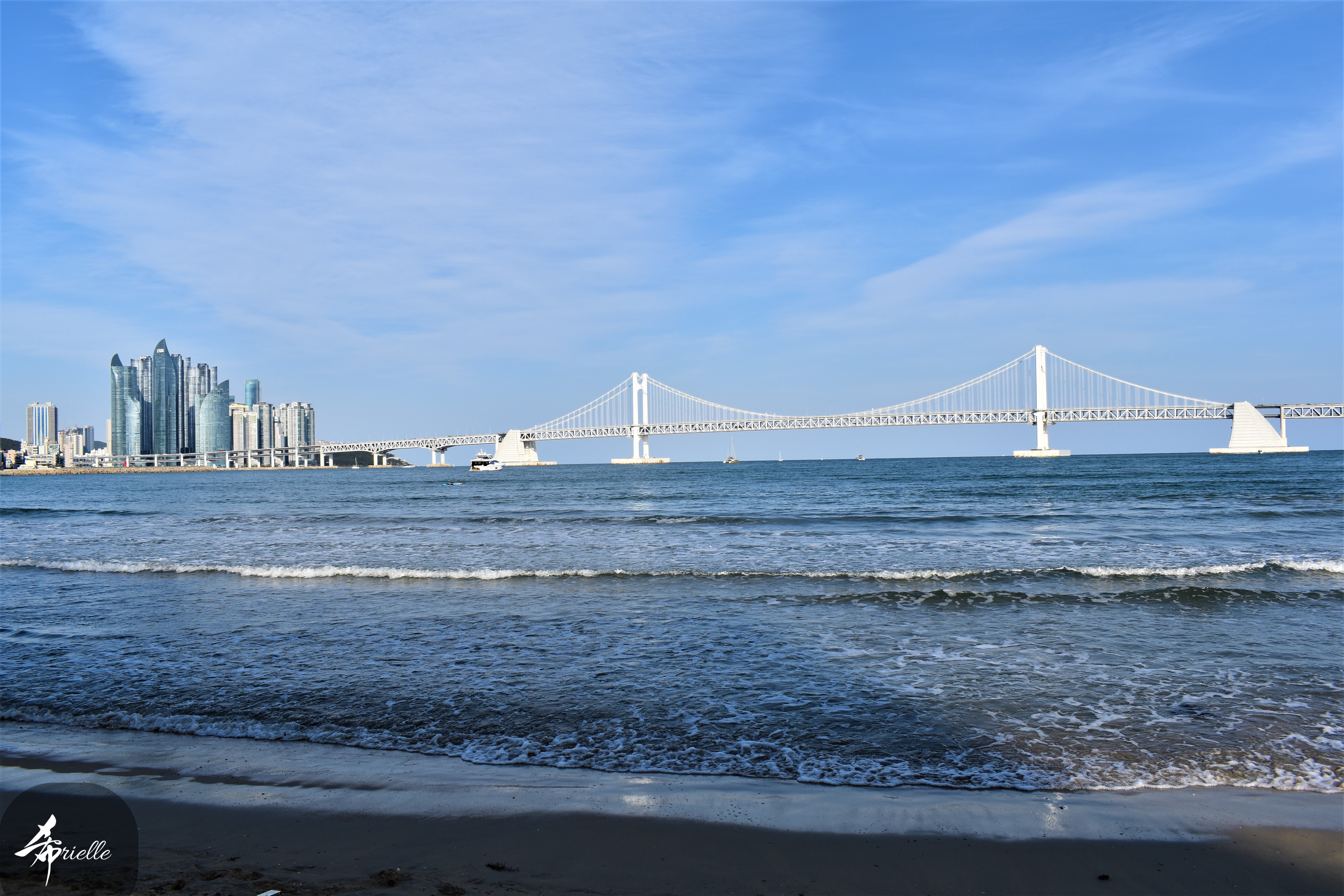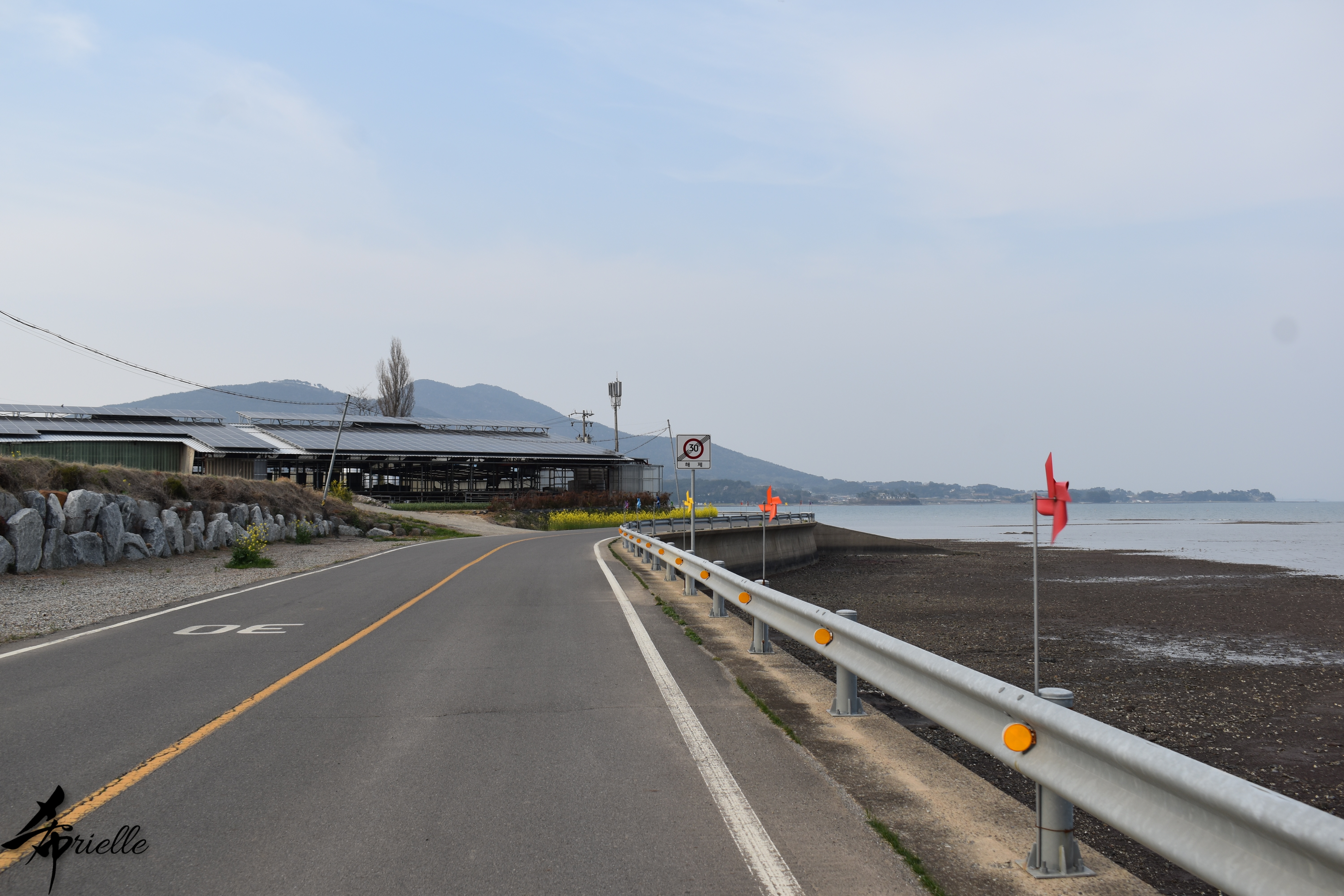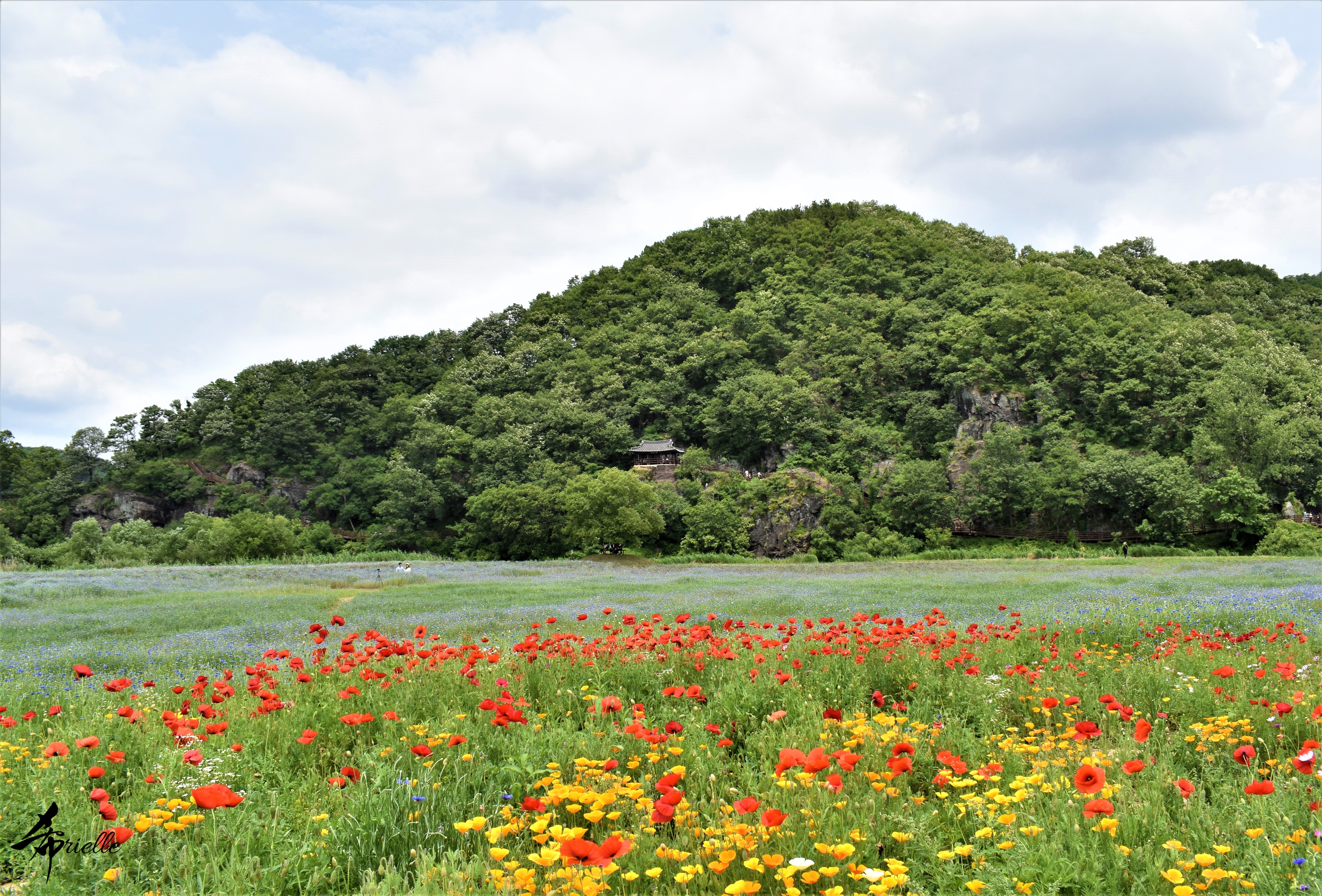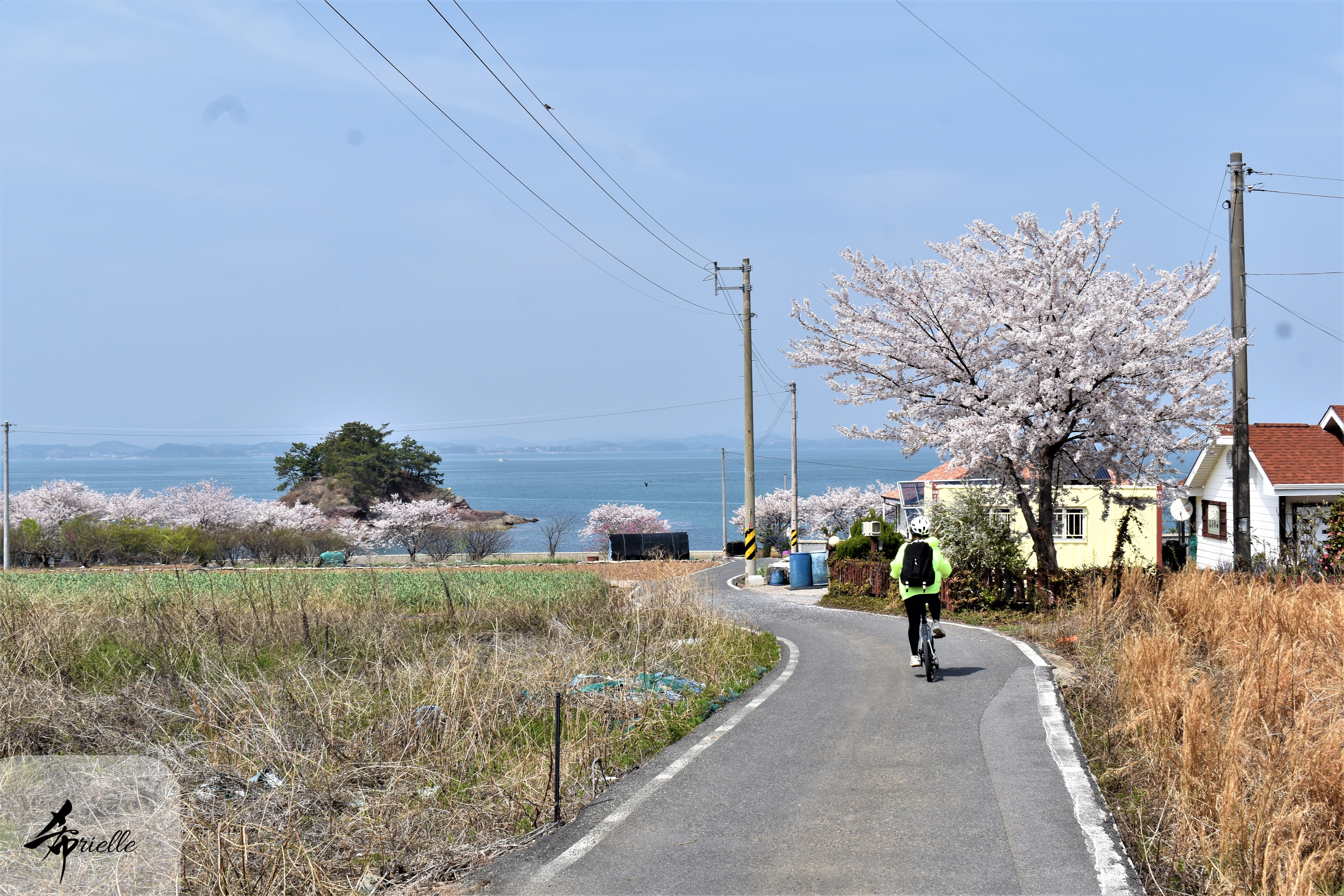 Etant donné que je passe la plupart de mon temps libre soit à la montagne, soit au bord de l’océan, on me demande souvent lequel des deux je préfère. Et bien, honnêtement c’est très difficile à dire mais je crois que là où je me sens le mieux, c’est au sommet d’une montagne offrant une vue sur l’océan. Que ce soit après une randonnée à pieds ou en vélo, il n’y a rien que j’aime plus que le fait de pouvoir finir la journée dans l’eau. Ainsi, l’une des villes où j’aime le plus marcher en Corée, est Tongyeong. Cette ville portuaire, montagneuse est constituée de plusieurs îles accessibles par bateau. Ces trois dernières années, j’ai eu l’occasion de faire le tour de la plupart de ces îles : Bijin, Saryang, Maemul, Seomaemul, Yokji, Suu … Les articles viendront si j’arrive à me tenir à la résolution de publier « plus souvent ». Oui, j’avoue ce n’est pas très précis ni très exigeant comme résolution ! Bref, cette année, j’avais donc envie de rejoindre le sommet de la montagne à Tongyeong qui n’est pas sur une île et ne nécessite donc pas de promenade en bateau. Ainsi, fin avril, j’ai pris le bus jusque là-bas puis un taxi pour rejoindre l’un des temples situés au pied du Mont Mireuk et d’où commence un sentier de randonnée. Encore une fois, il faisait tellement beau que la vue était superbe, en tons de bleu sur bleu. J’étais partie seule donc j’ai pris le temps de prendre toutes les photos que je voulais et profiter de la vue au sommet. Ce jour-là je n’ai pas croisé beaucoup d’autres marcheurs et je crois même que c’est le sentier le plus propre sur lequel j’ai jamais marché. Au sommet, comme le veut la tradition, le peu de personnes présentes, faisaient des photos avec la pierre indiquant le nom et l’altitude du pic. J’avais prévu mon trépied pour en prendre une aussi mais un promeneur venu avec un groupe, qui venait de faire plus d’une quinzaine de photos de ses amis, m’a dit qu’il était photographe et a insisté pour prendre la mienne. Je l’ai donc laissé faire et le résultat était plutôt convaincant. C’est agréable de discuter avec les gens en montagne parce qu’en général, ils sont souriants et sympathiques. Il faut dire qu’il est difficile de ne pas être de bonne humeur, face à la beauté des paysages ! Pour ceux qui le souhaitent, une ligne de cabines téléfériques fait aussi l’aller-retour du port au sommet. Pour ma part, j’ai particulièrement apprécié, une oeuvre d’art installée sur un belvédère offrant une vue vers l’est et sur l’île de Geoje. Il s’agissait d’une sculpture en métal du profil d’une femme regardant au loin. Ce n’est pas la première oeuvre de ce genre que je croise dans la région mais à et endroit, je ne m’y attendais vraiment pas et je l’ai trouvée absolument magnifique !