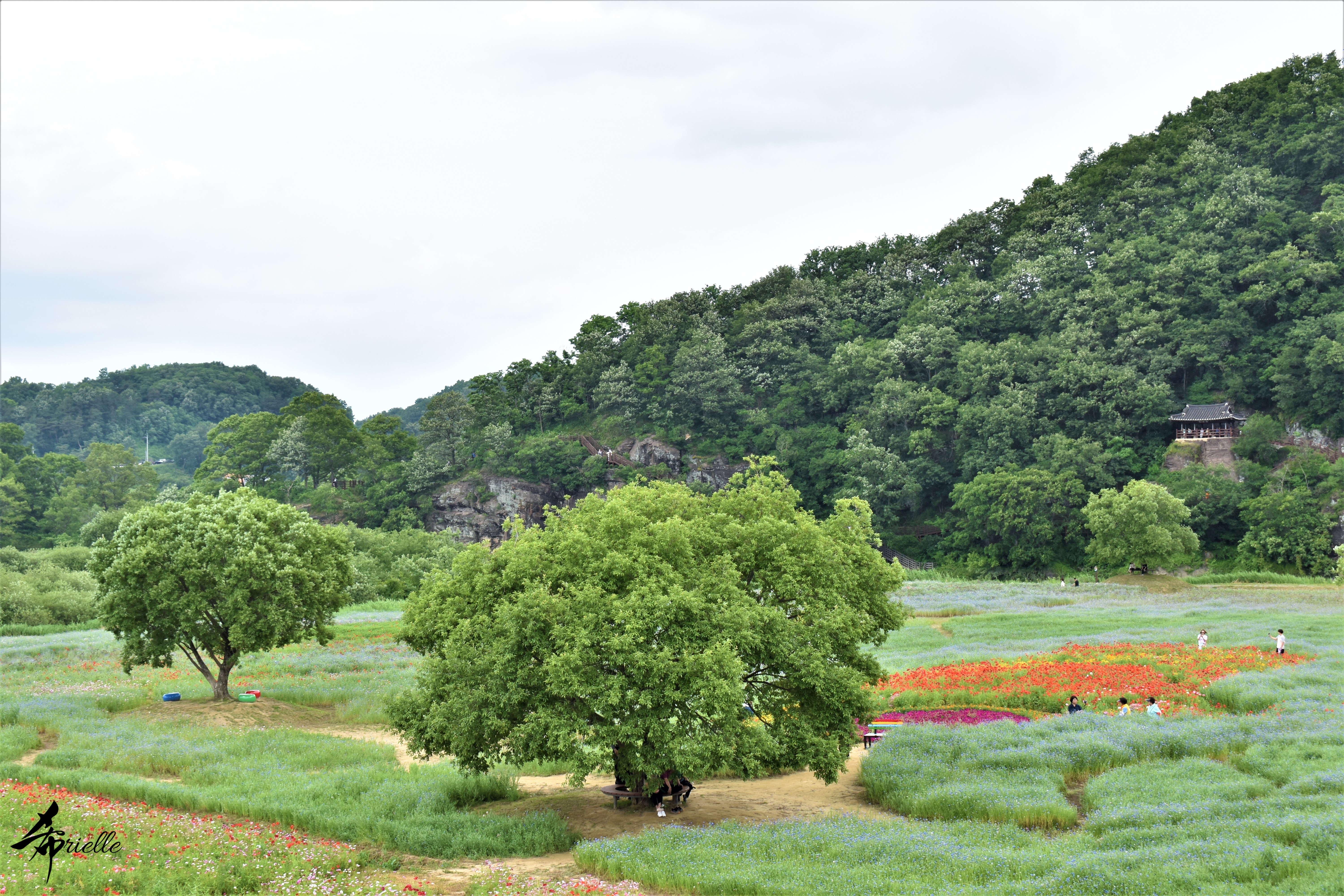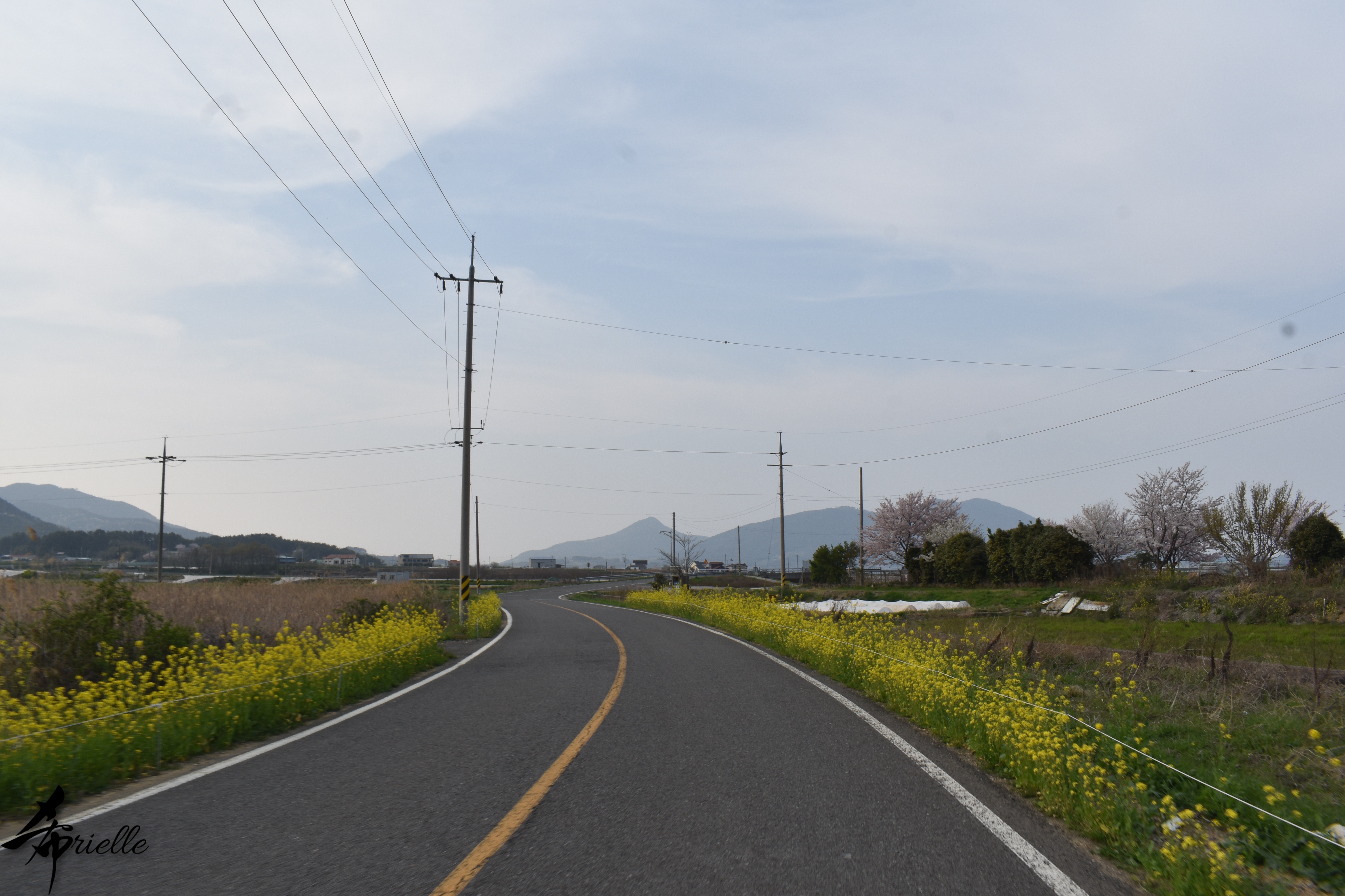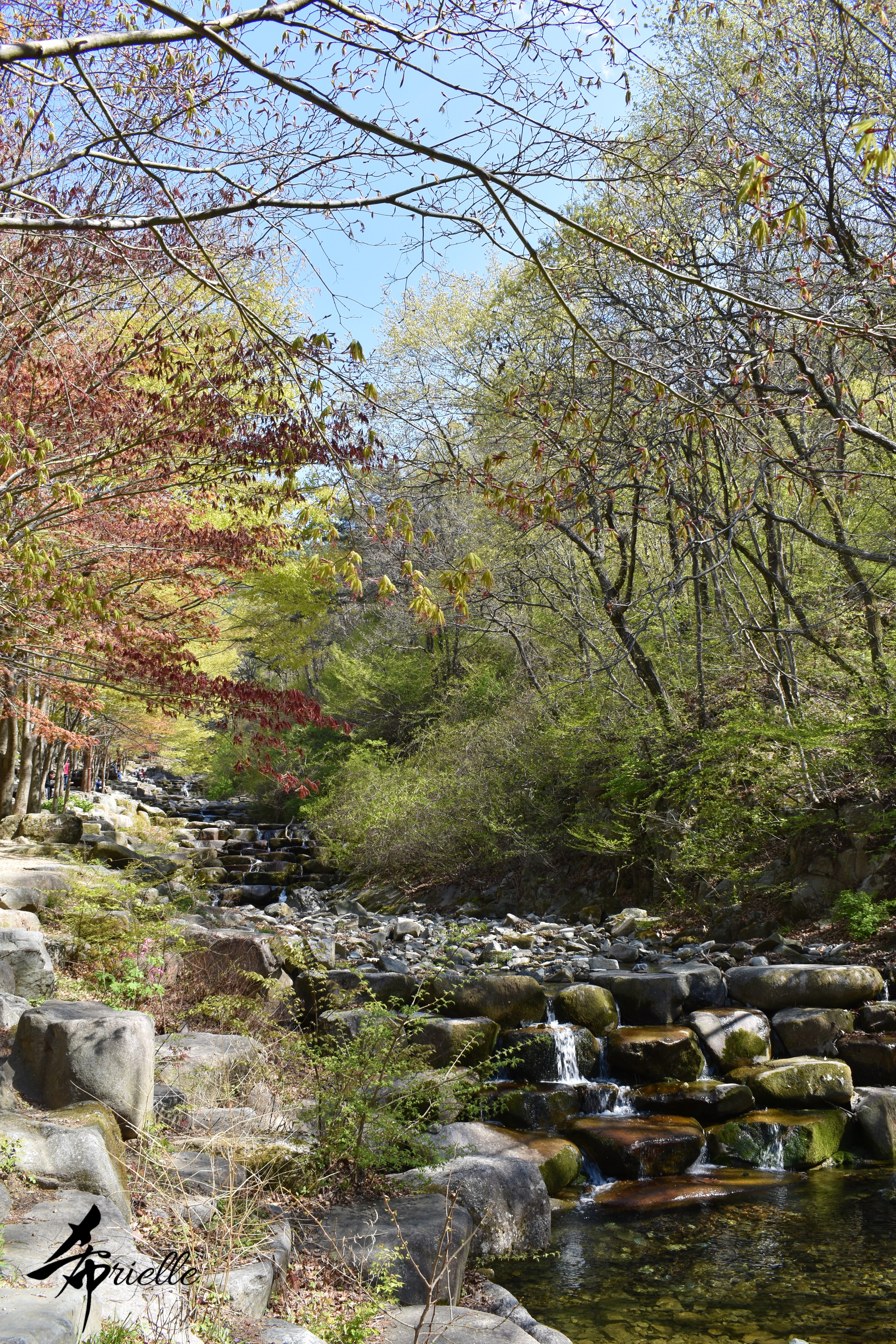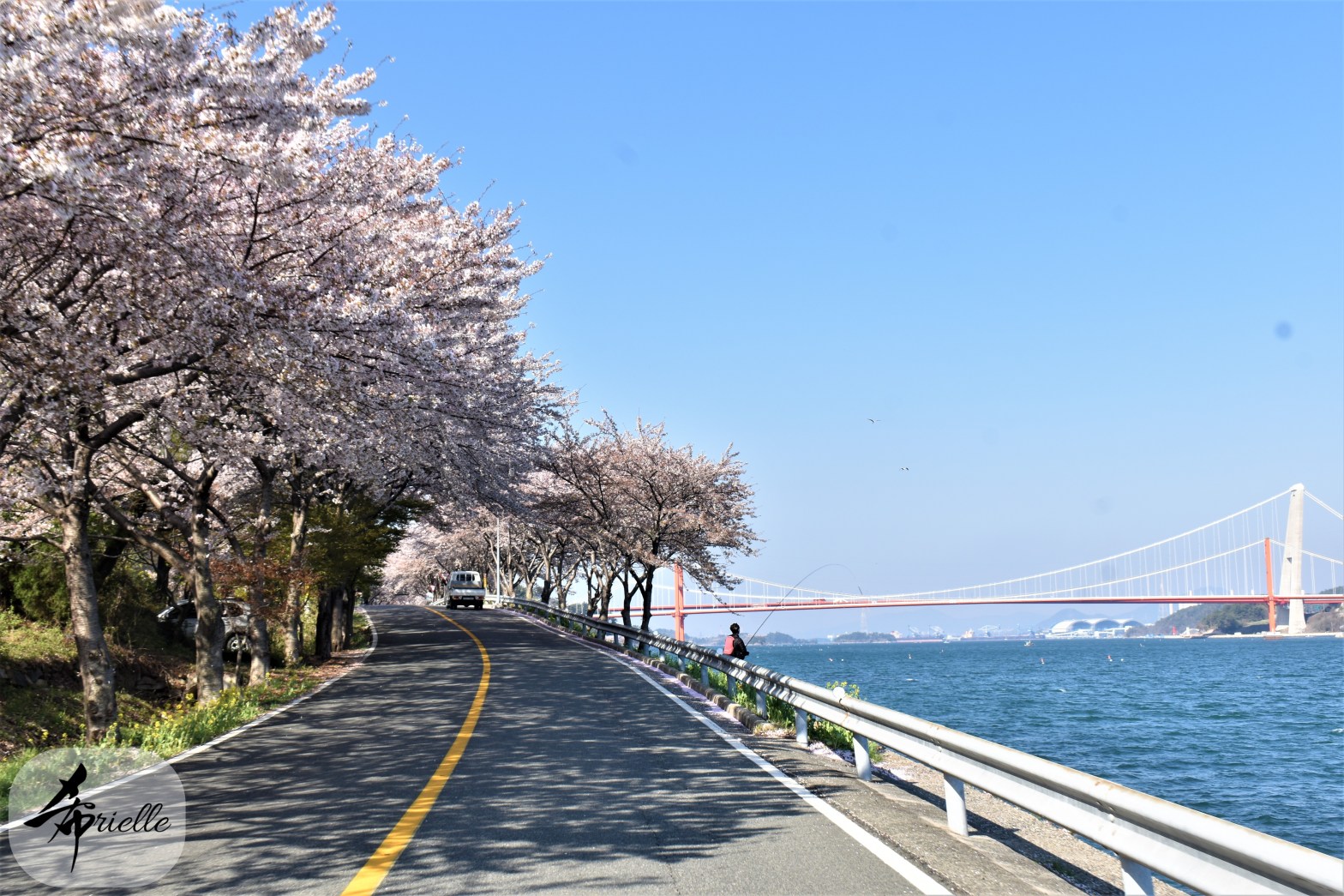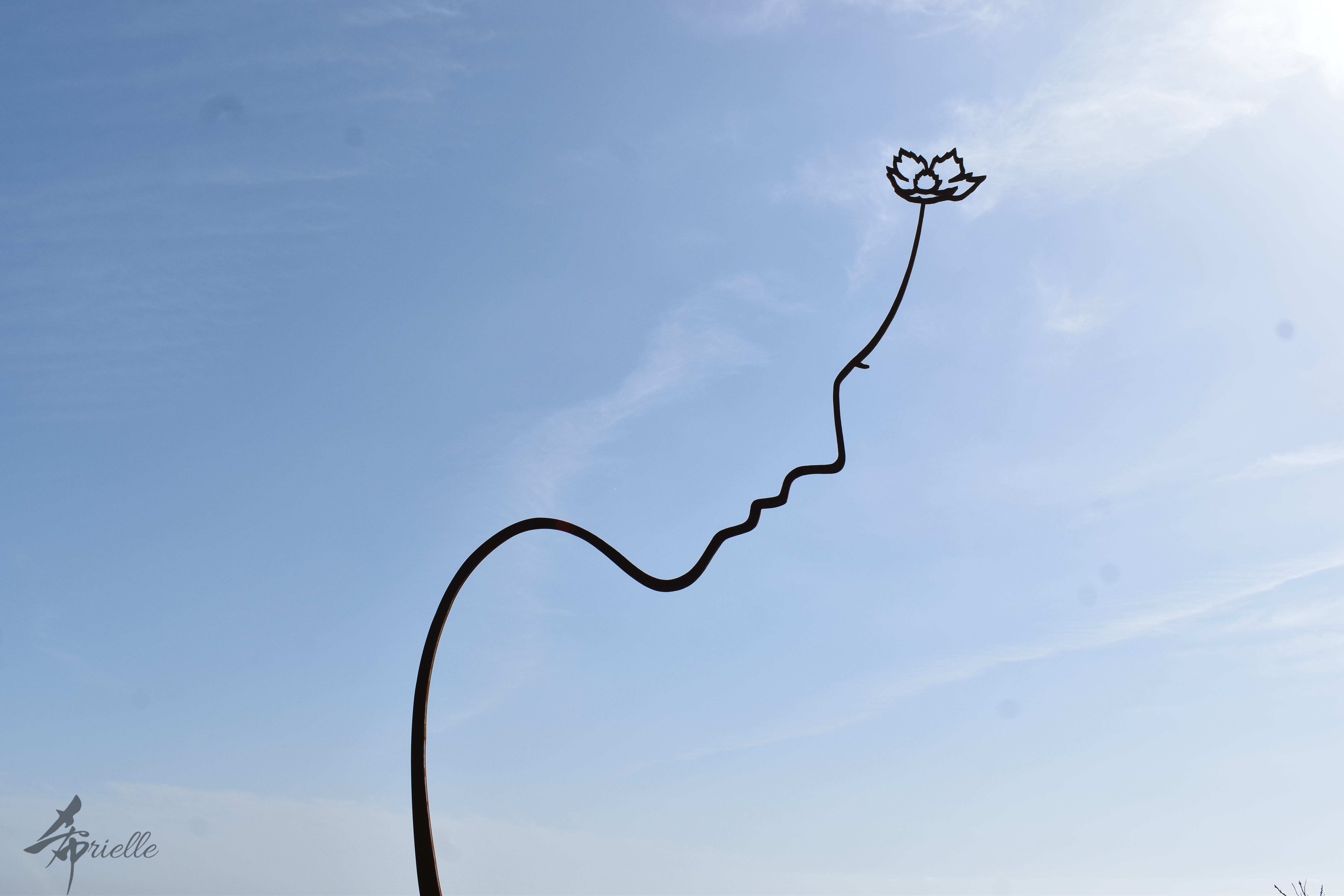 Etant donné que je passe la plupart de mon temps libre soit à la montagne, soit au bord de l’océan, on me demande souvent lequel des deux je préfère. Et bien, honnêtement c’est très difficile à dire mais je crois que là où je me sens le mieux, c’est au sommet d’une montagne offrant une vue sur l’océan. Que ce soit après une randonnée à pieds ou en vélo, il n’y a rien que j’aime plus que le fait de pouvoir finir la journée dans l’eau. Ainsi, l’une des villes où j’aime le plus marcher en Corée, est Tongyeong. Cette ville portuaire, montagneuse est constituée de plusieurs îles accessibles par bateau. Ces trois dernières années, j’ai eu l’occasion de faire le tour de la plupart de ces îles : Bijin, Saryang, Maemul, Seomaemul, Yokji, Suu … Les articles viendront si j’arrive à me tenir à la résolution de publier « plus souvent ». Oui, j’avoue ce n’est pas très précis ni très exigeant comme résolution ! Bref, cette année, j’avais donc envie de rejoindre le sommet de la montagne à Tongyeong qui n’est pas sur une île et ne nécessite donc pas de promenade en bateau. Ainsi, fin avril, j’ai pris le bus jusque là-bas puis un taxi pour rejoindre l’un des temples situés au pied du Mont Mireuk et d’où commence un sentier de randonnée. Encore une fois, il faisait tellement beau que la vue était superbe, en tons de bleu sur bleu. J’étais partie seule donc j’ai pris le temps de prendre toutes les photos que je voulais et profiter de la vue au sommet. Ce jour-là je n’ai pas croisé beaucoup d’autres marcheurs et je crois même que c’est le sentier le plus propre sur lequel j’ai jamais marché. Au sommet, comme le veut la tradition, le peu de personnes présentes, faisaient des photos avec la pierre indiquant le nom et l’altitude du pic. J’avais prévu mon trépied pour en prendre une aussi mais un promeneur venu avec un groupe, qui venait de faire plus d’une quinzaine de photos de ses amis, m’a dit qu’il était photographe et a insisté pour prendre la mienne. Je l’ai donc laissé faire et le résultat était plutôt convaincant. C’est agréable de discuter avec les gens en montagne parce qu’en général, ils sont souriants et sympathiques. Il faut dire qu’il est difficile de ne pas être de bonne humeur, face à la beauté des paysages ! Pour ceux qui le souhaitent, une ligne de cabines téléfériques fait aussi l’aller-retour du port au sommet. Pour ma part, j’ai particulièrement apprécié, une oeuvre d’art installée sur un belvédère offrant une vue vers l’est et sur l’île de Geoje. Il s’agissait d’une sculpture en métal du profil d’une femme regardant au loin. Ce n’est pas la première oeuvre de ce genre que je croise dans la région mais à et endroit, je ne m’y attendais vraiment pas et je l’ai trouvée absolument magnifique !